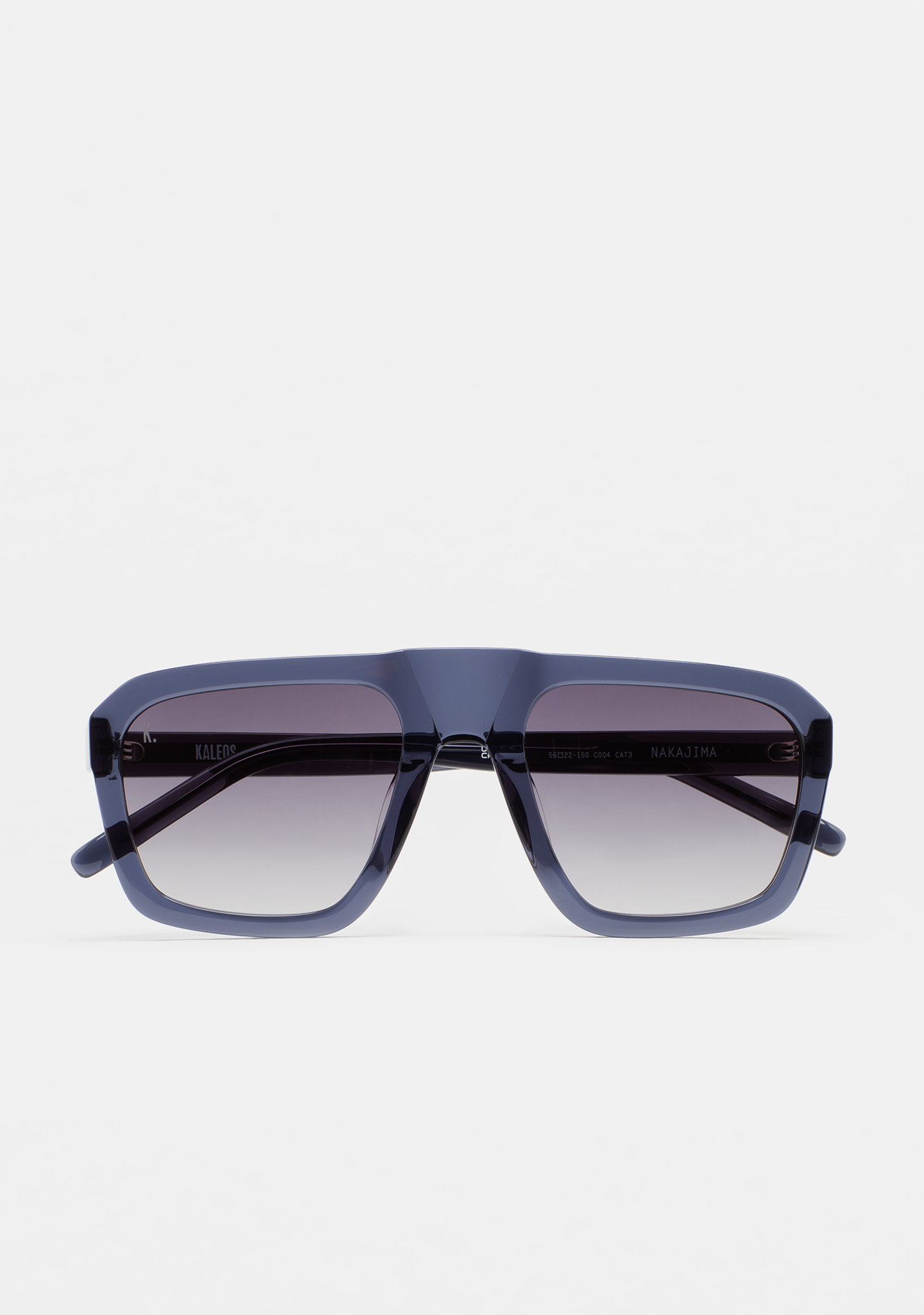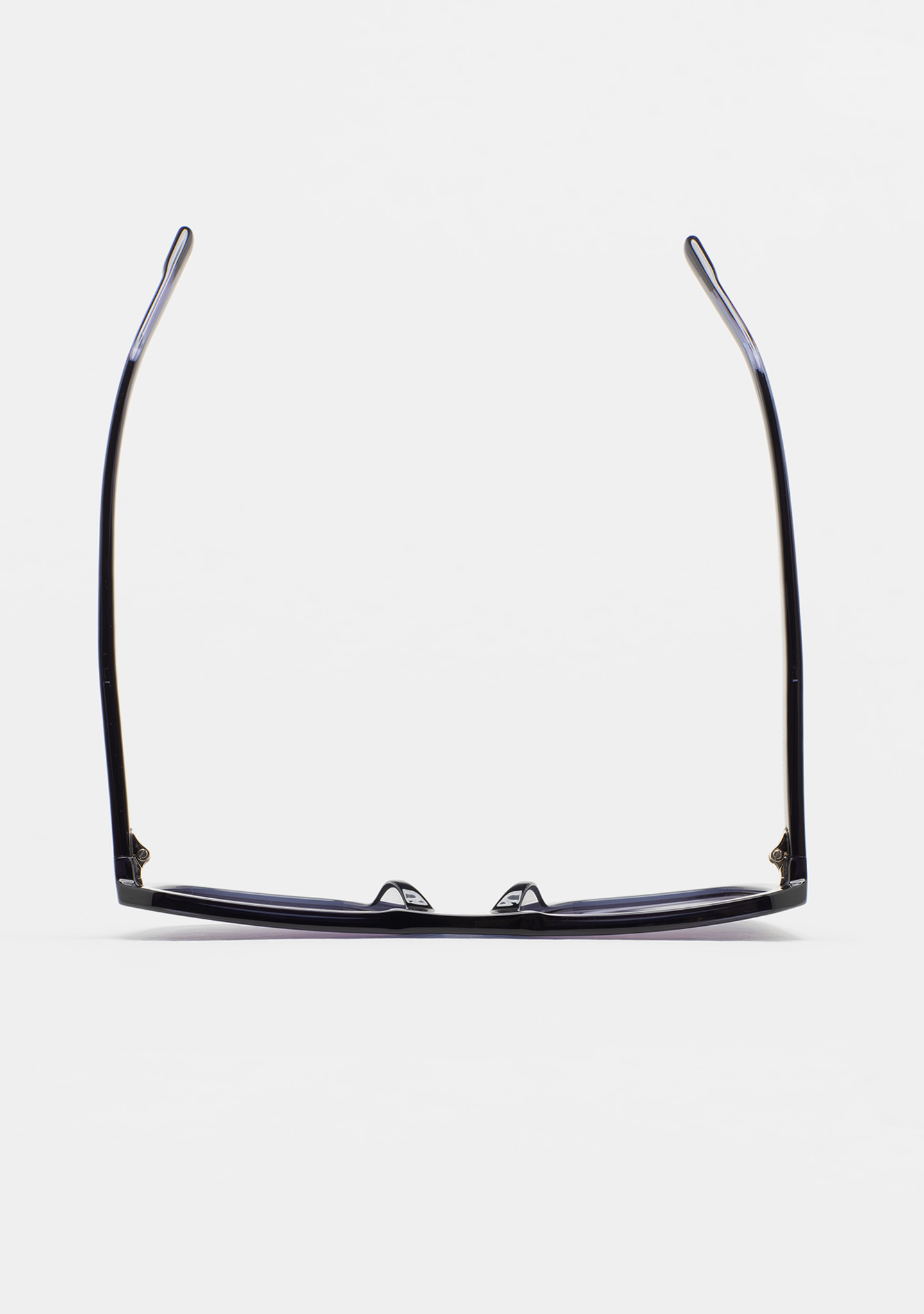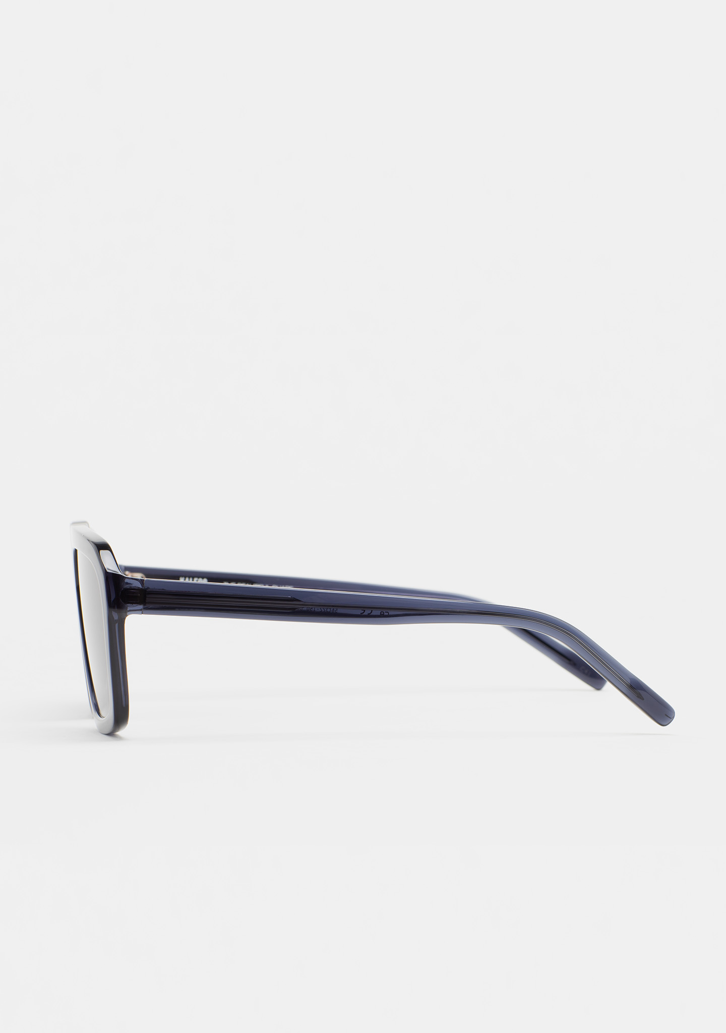 Lunettes de soleil de forme carrée avec pont plat. Monture et branches en acétate bleu gris transparent. Verre noir dégradé base 2 avec protection UV à 100 % et traitement antireflet. Verre catégorie 3. Plaquettes en acétate intégrées. Fait main.