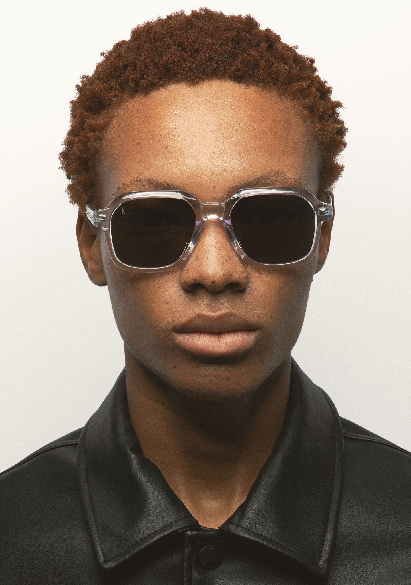 Lunettes de soleil de forme carrée avec fraisage autour de la lentille. Devant et branches en acétate cristal transparent. Lentille verte minérale base 2 avec protection UV 100% et traitement antireflet. Lentille catégorie 3. Plaquettes en acétate intégrées. Fait main.