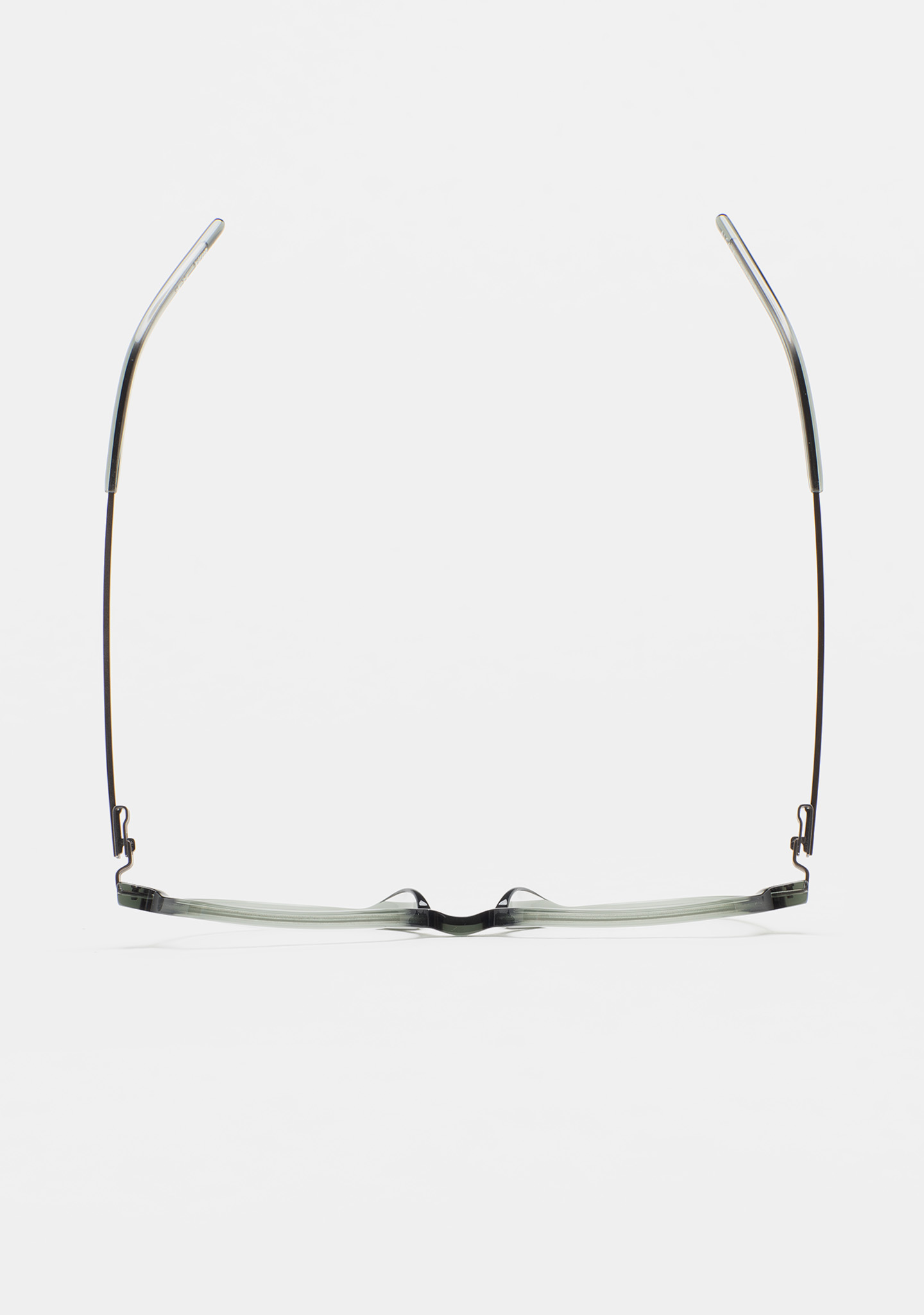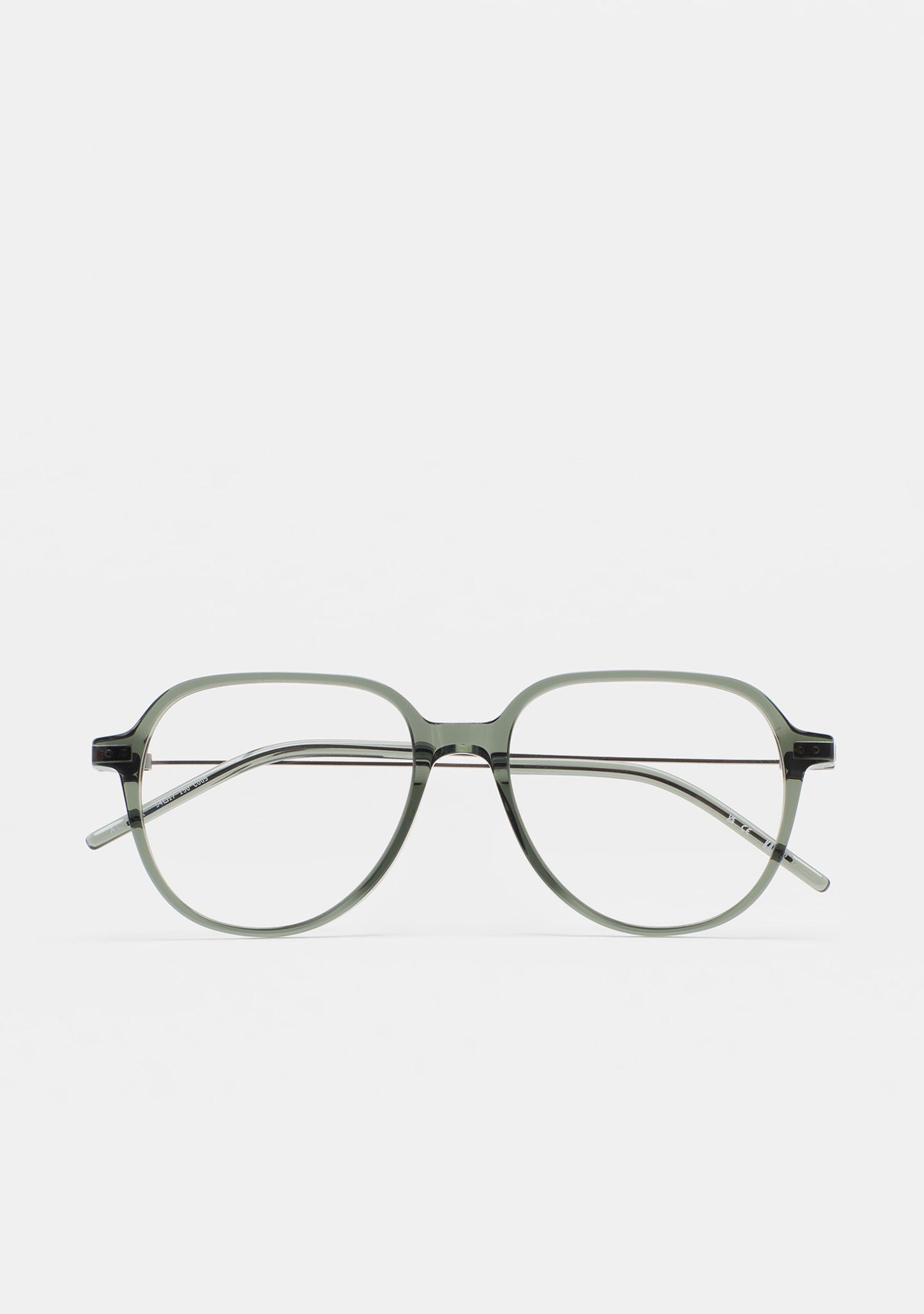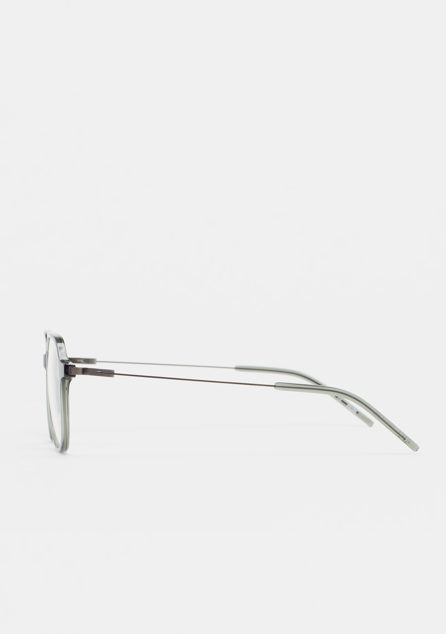 Lunettes de vue de forme aviateur. Face en acétate haute densité vert transparent. Branches en acier inoxydable gris foncé mat avec embouts en acétate vert transparent. Branches avec nouvelle charnière sans vis. Plaquettes en acétate intégrées. Fait main.