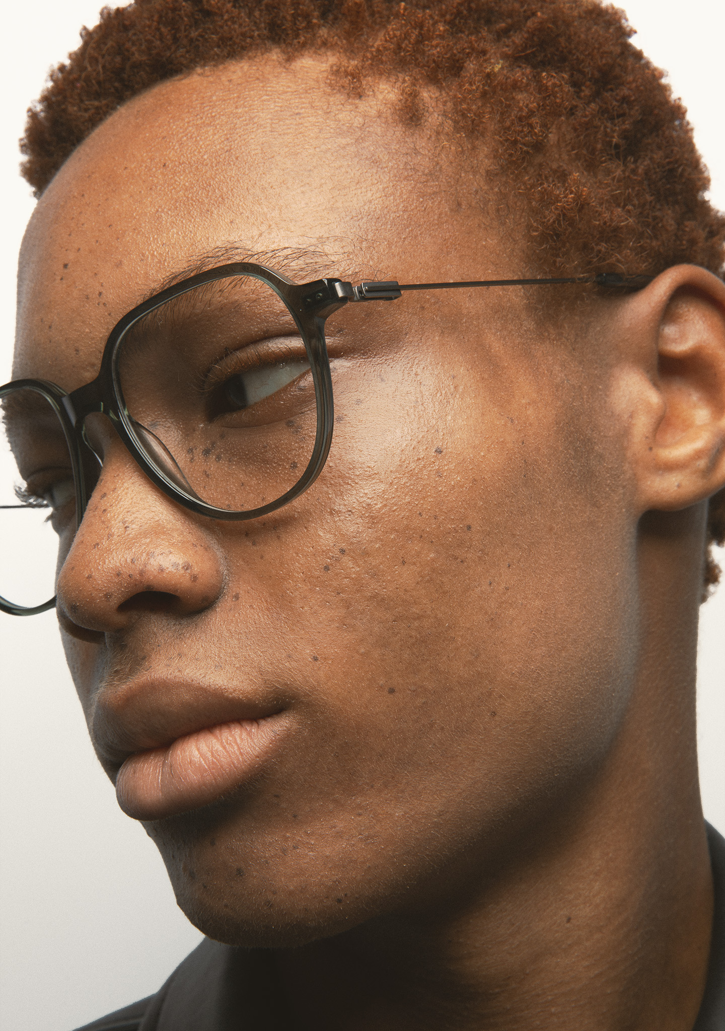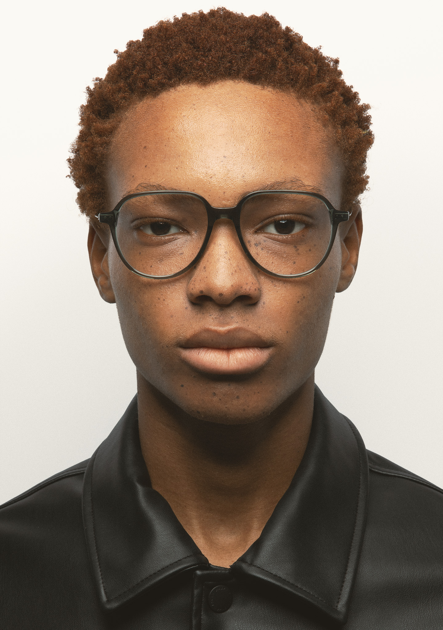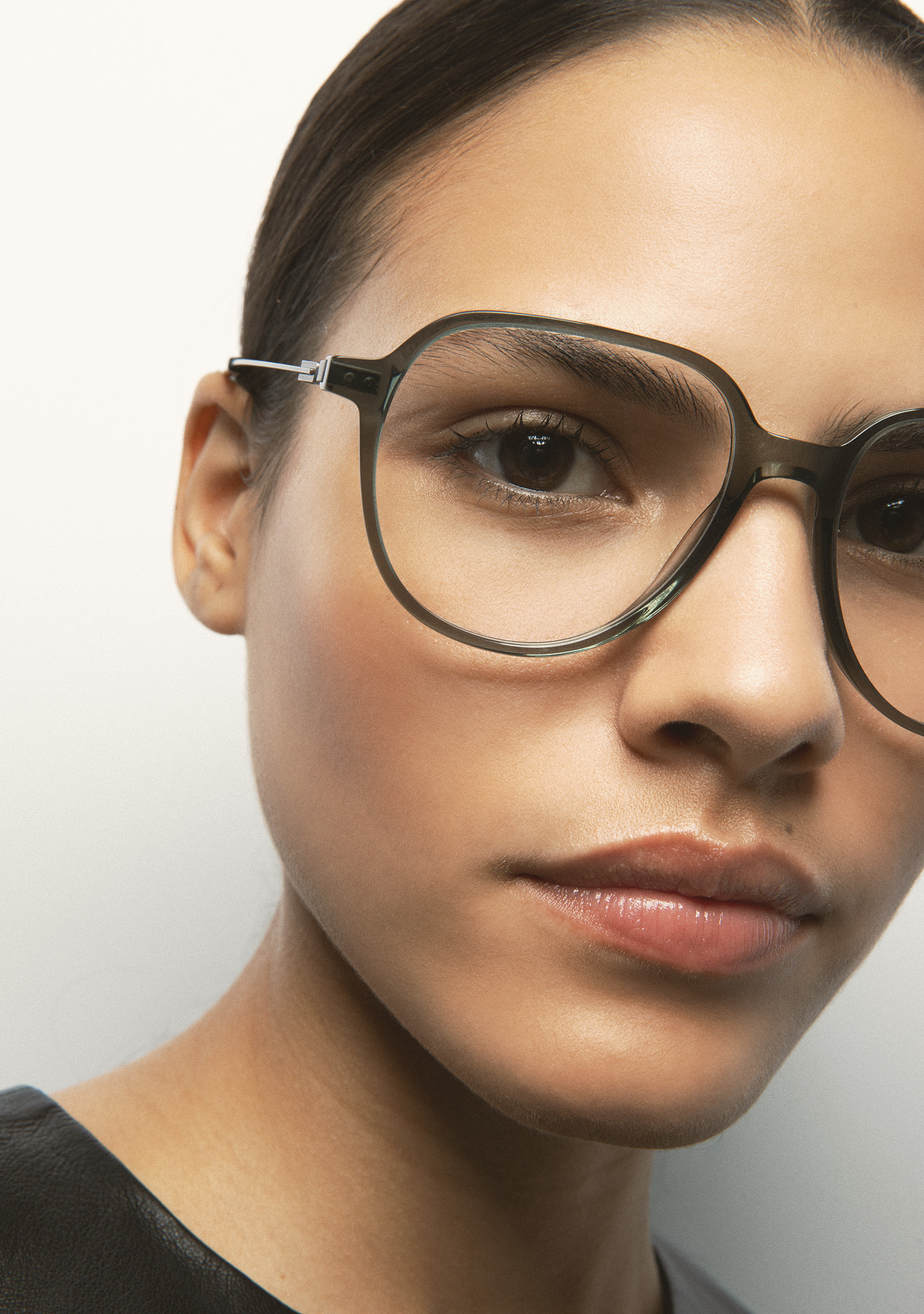 Lunettes de vue de forme aviateur. Face en acétate haute densité vert transparent. Branches en acier inoxydable gris foncé mat avec embouts en acétate vert transparent. Branches avec nouvelle charnière sans vis. Plaquettes en acétate intégrées. Fait main.