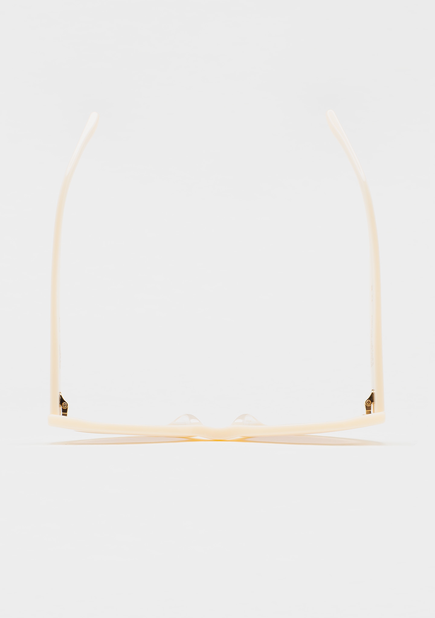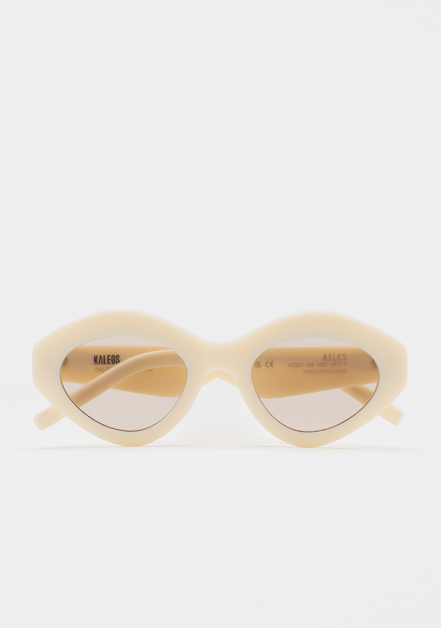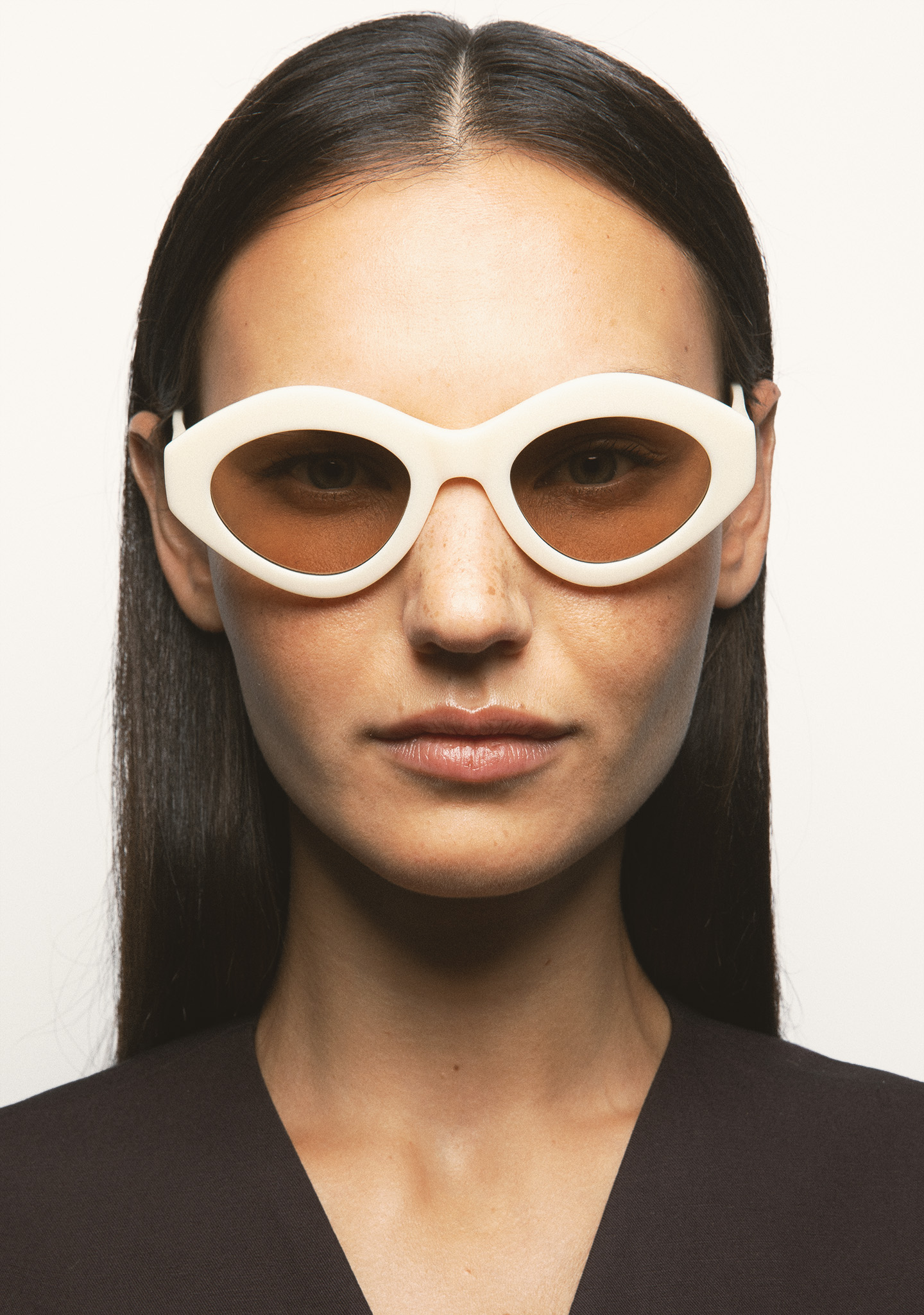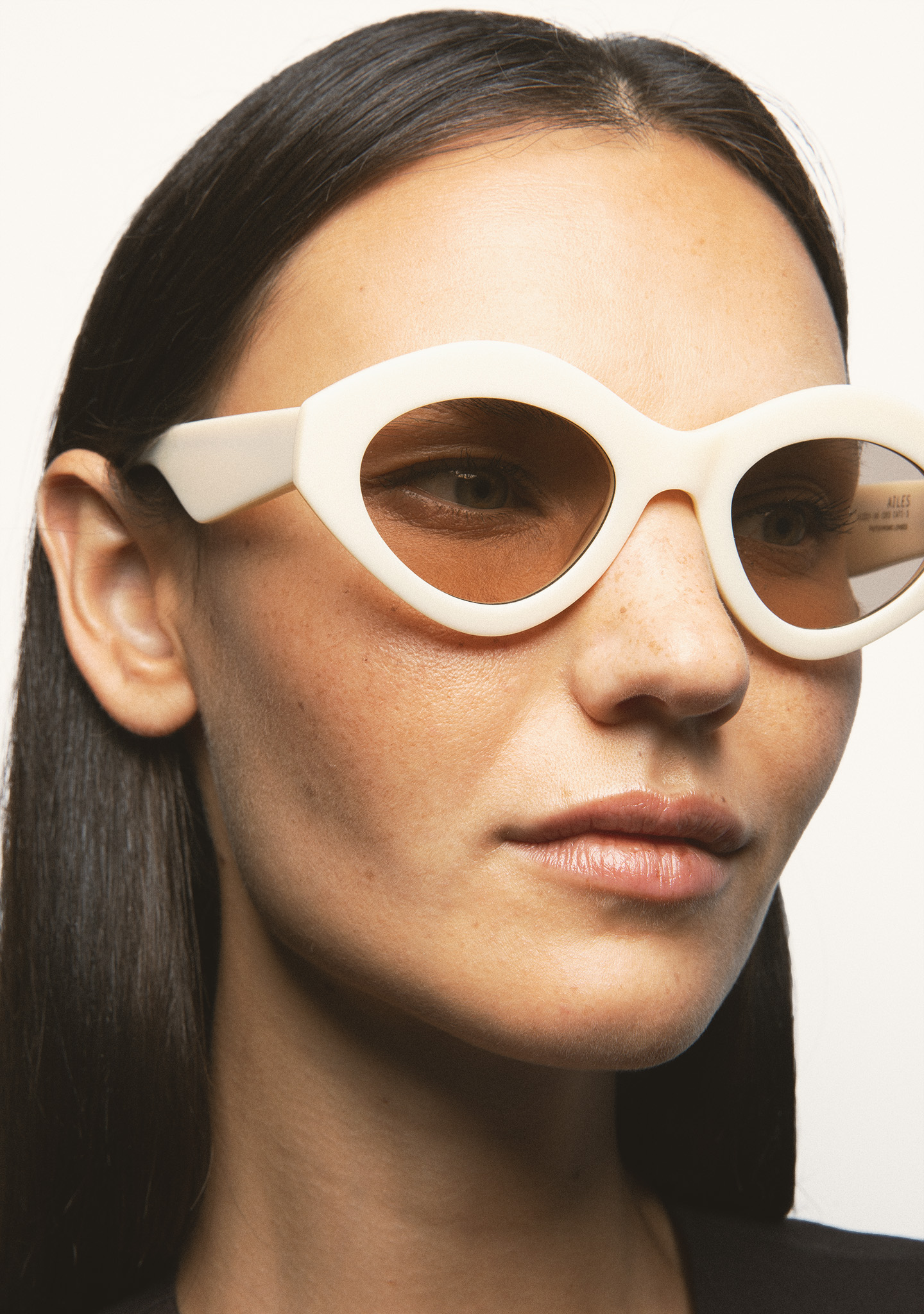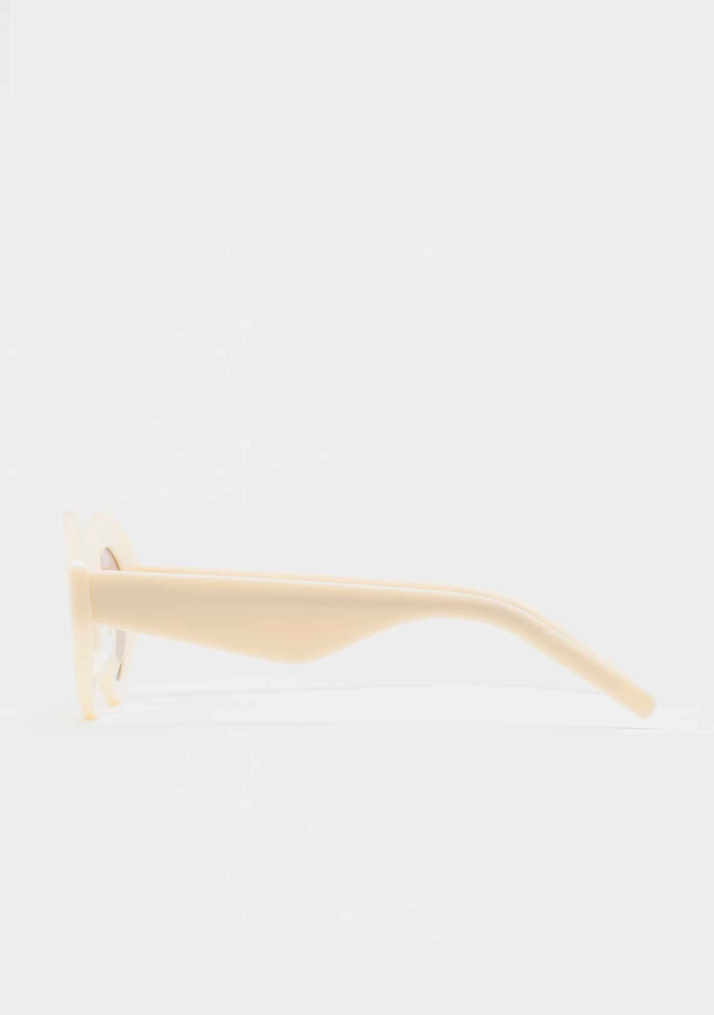Lunettes de soleil de forme pentagonale. Monture frontale et branches en acétate blanc. Verre photochromique marron de base 2 avec protection UV et traitement antireflet. Verre catégorie 1-3. Plaquettes en acétate intégrées. Fabriquées à la main.