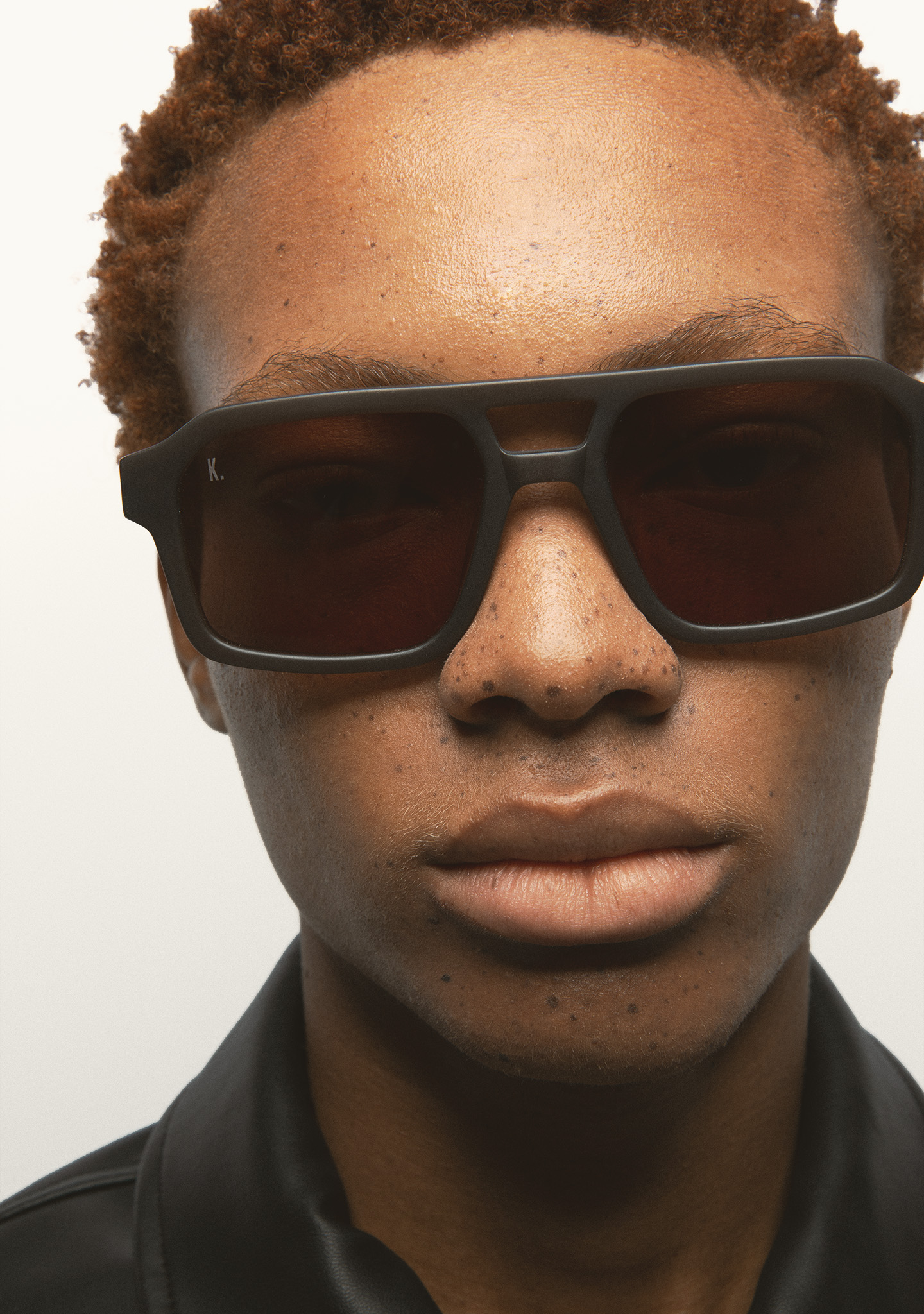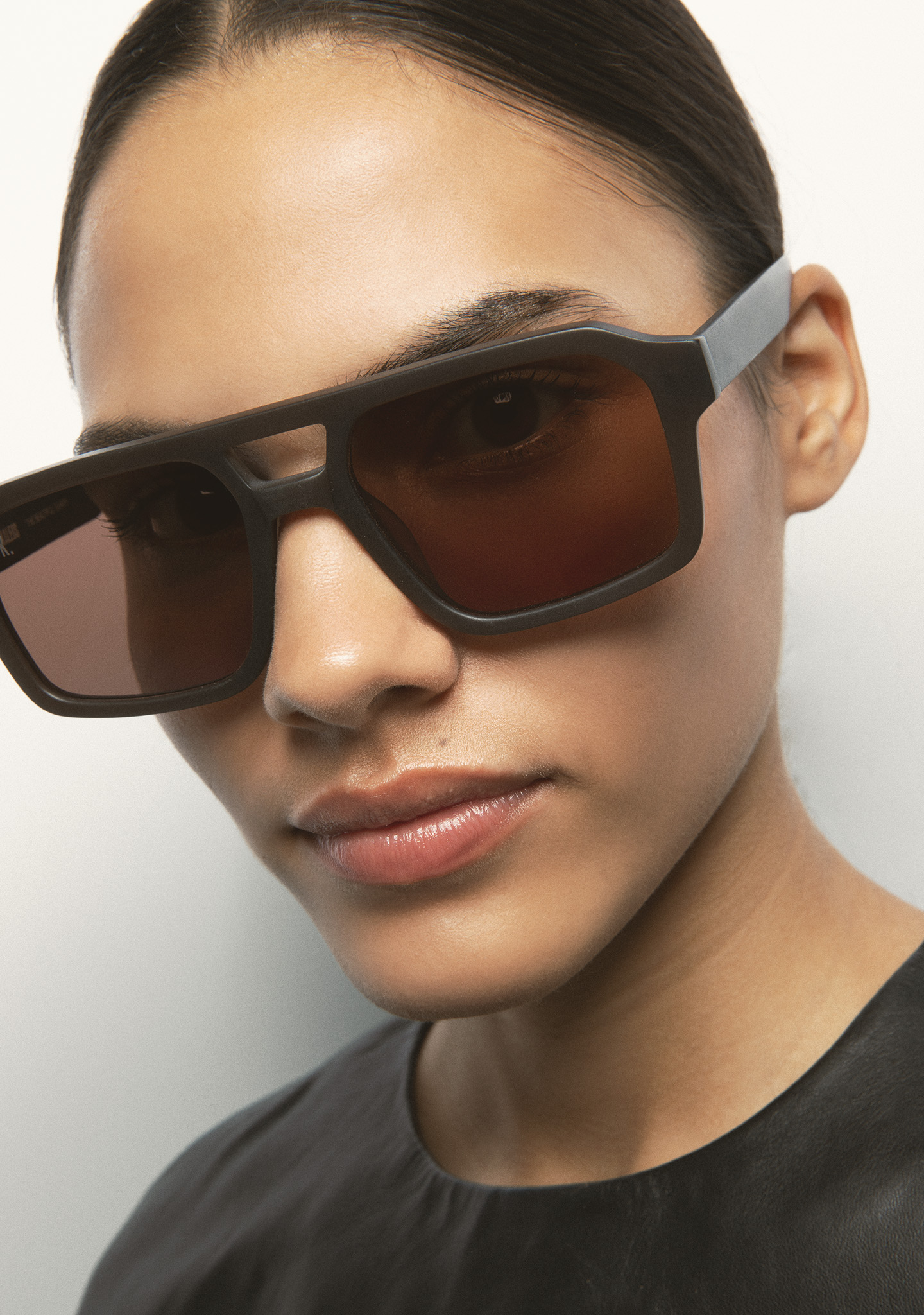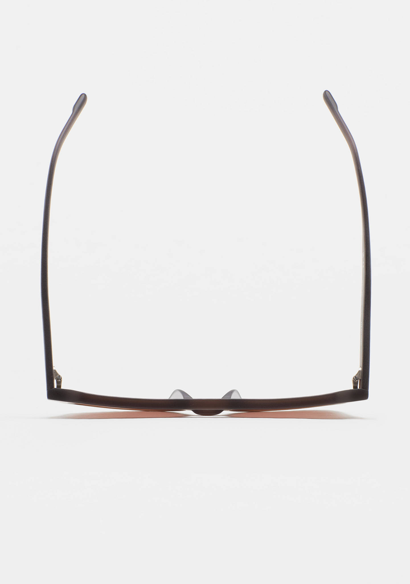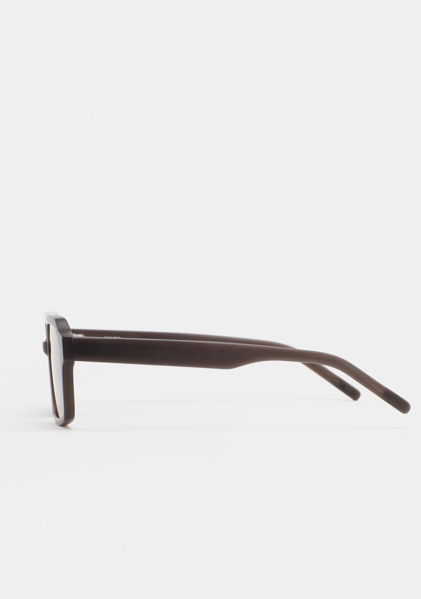 Lunettes de soleil de forme rectangulaire avec double pont. Monture et branches en acétate marron mat translucide. Verre marron base 2 avec protection UV à 100 % et traitement antireflet. Verre catégorie 3. Plaquettes en acétate intégrées. Fait main.