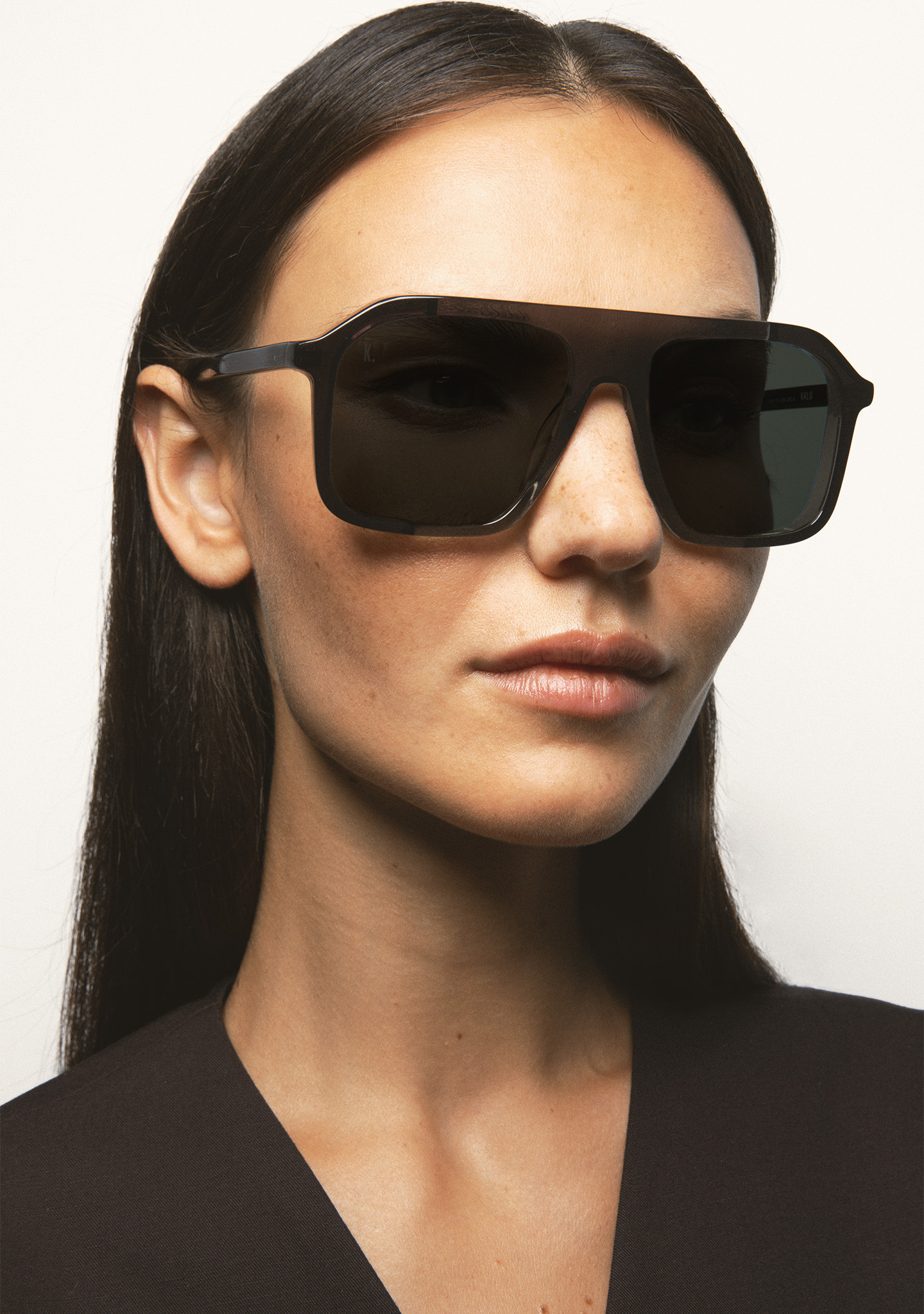 Lunettes de soleil carrées avec pont plat et ailettes latérales. Front en acétate gris transparent avec laminé gris foncé transparent. Branches fines en acétate gris foncé transparent. Verres verts foncés base 6 avec 100% de protection UV et traitement antireflet. Verres catégorie 3. Plaquettes en acétate intégrées. Fabriqué à la main.