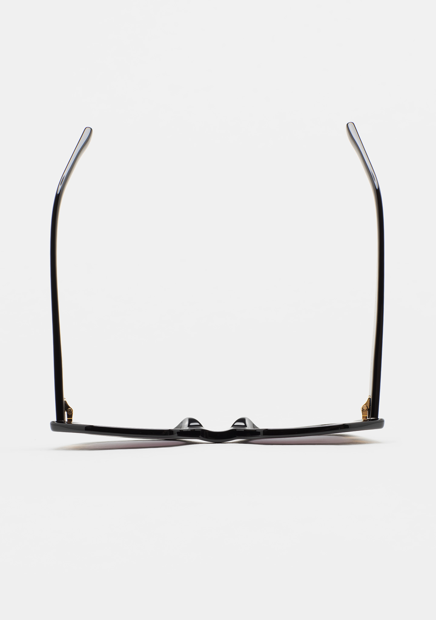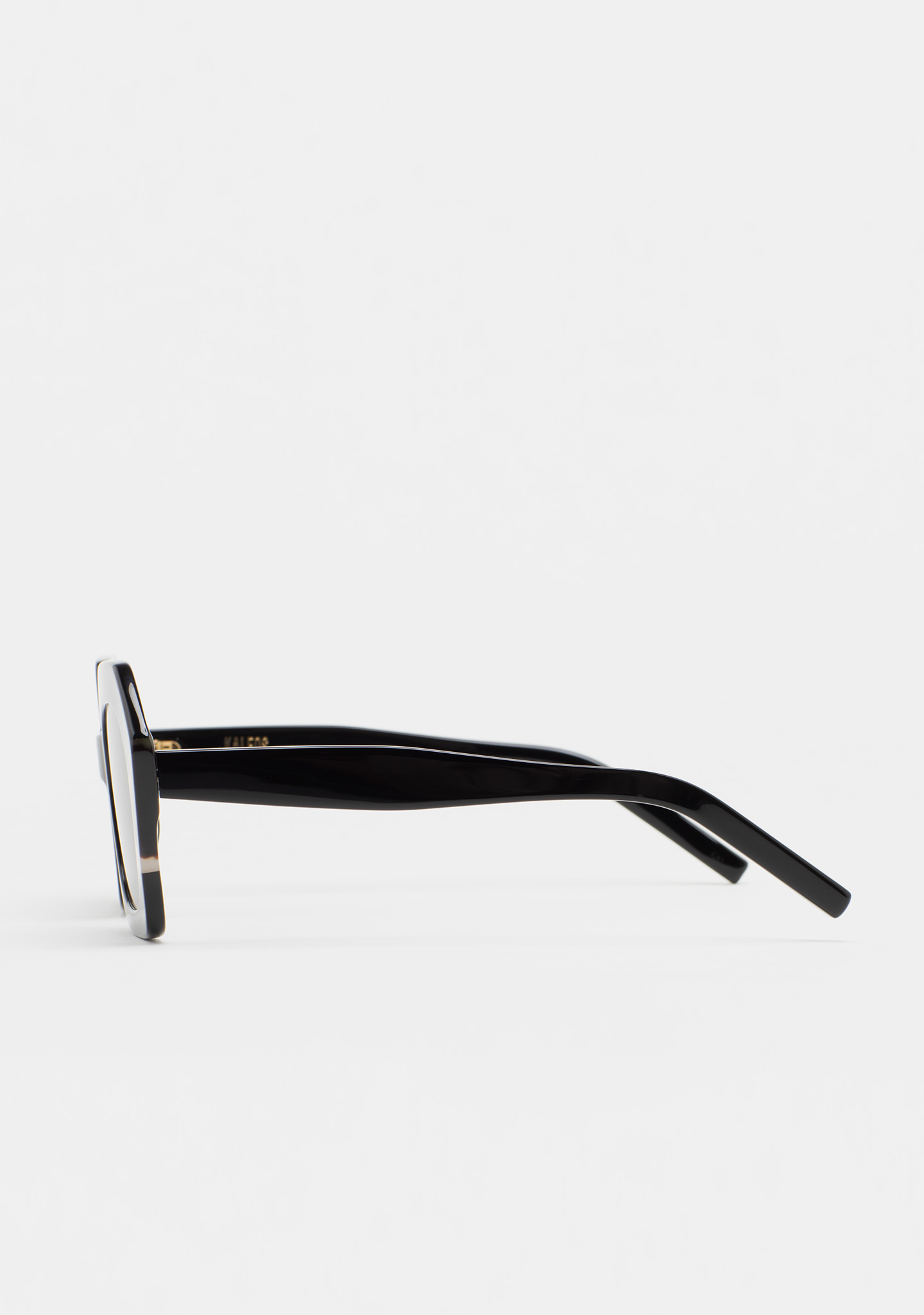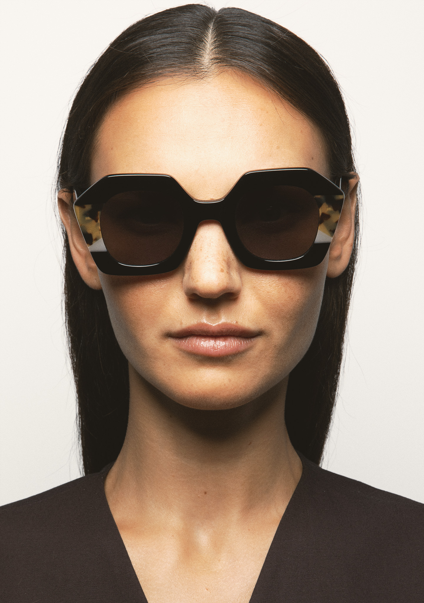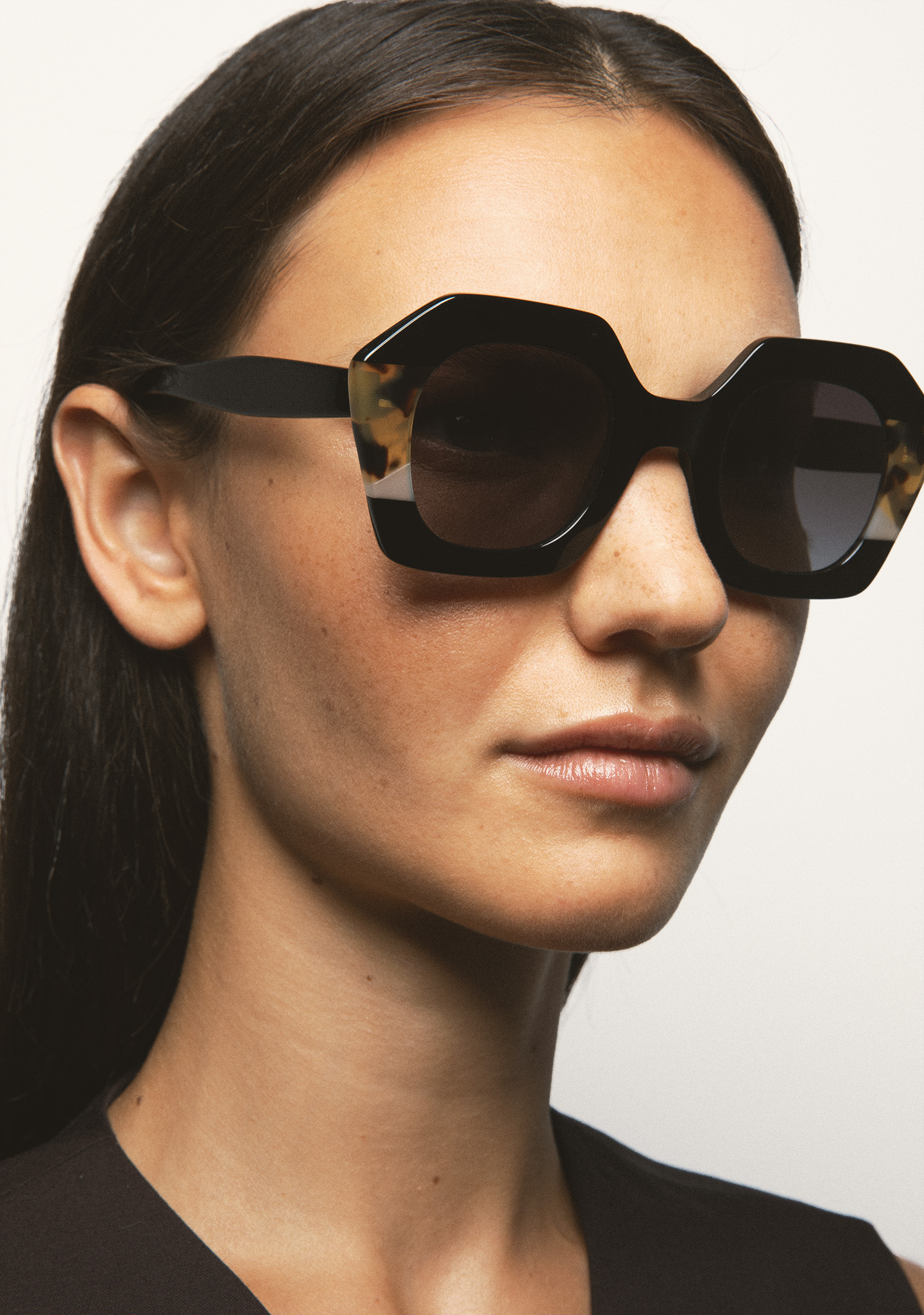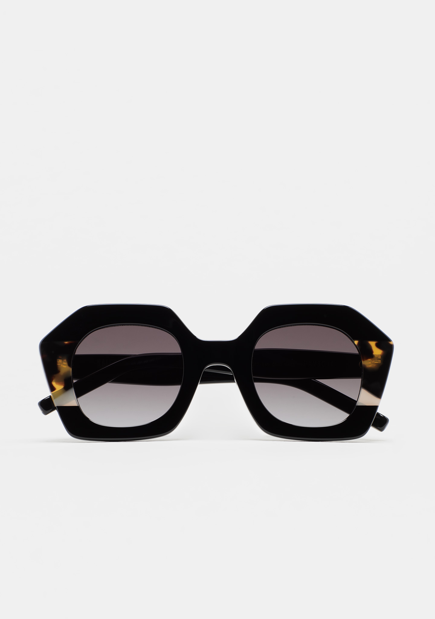 Lunettes de soleil de forme hexagonale. Face en acétate noir avec double stratification havane marron et beige translucide. Verre gris dégradé base 2 avec protection UV 100 % et traitement antireflet. Verre catégorie 3. Plaquettes en acétate intégrées. Fait main.