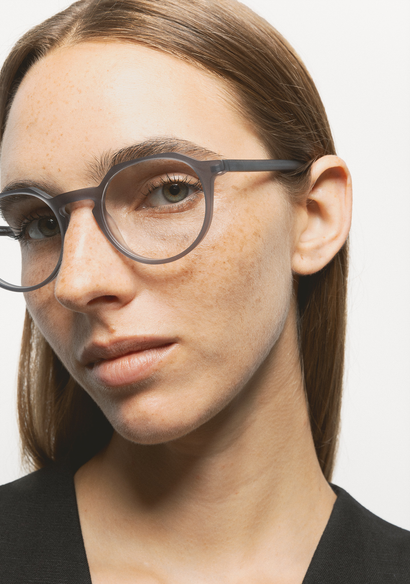 Lunettes optiques de forme pantos avec ligne de sourcils plate et pont en trou de serrure. Une silhouette qui équilibre modernité et élégance. Face avant et branches en acétate gris transparent mat. Plaquettes en acétate intégrées. Fabriquées à la main. Disponibles en deux tailles : moyenne (M) et grande (L).