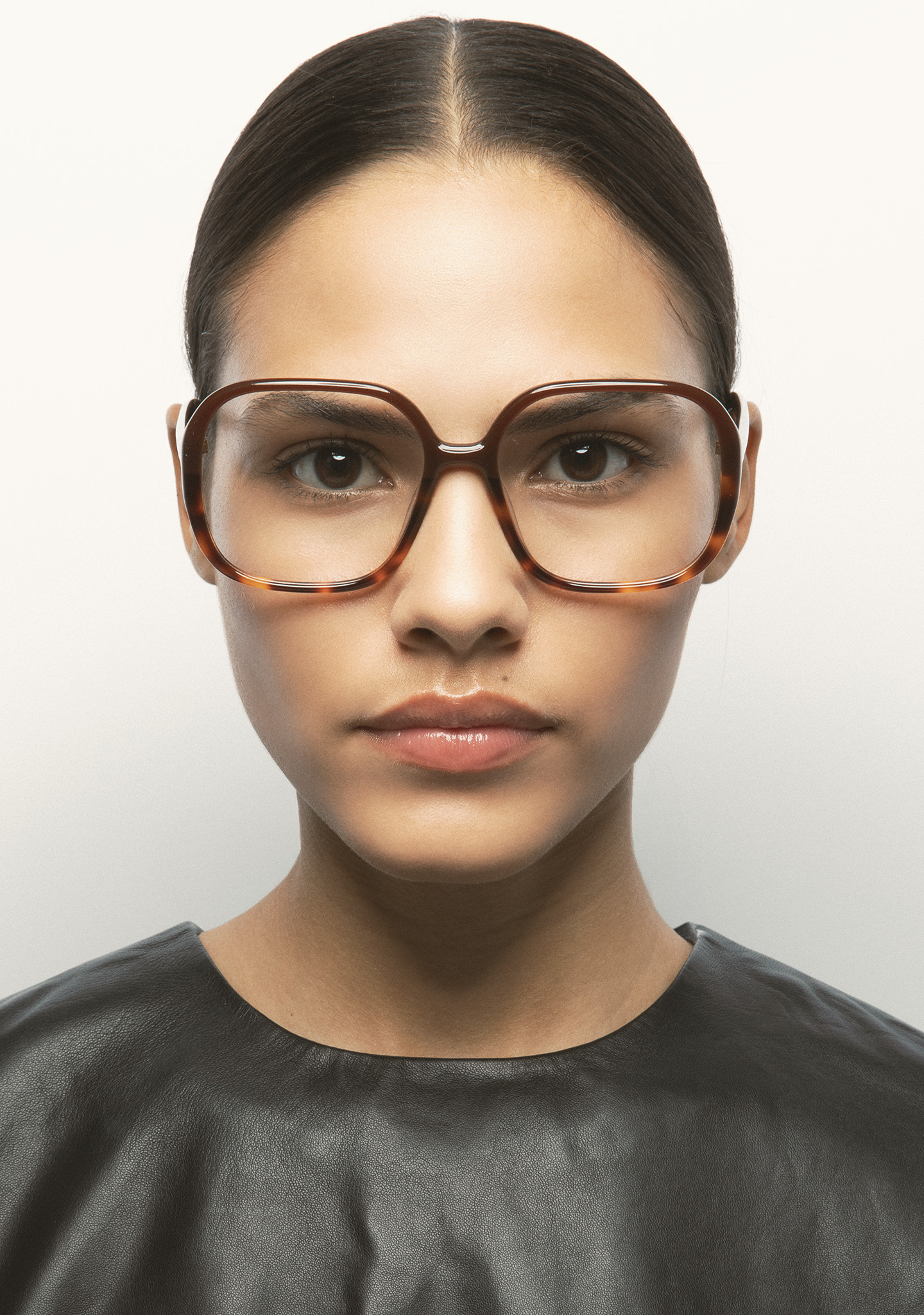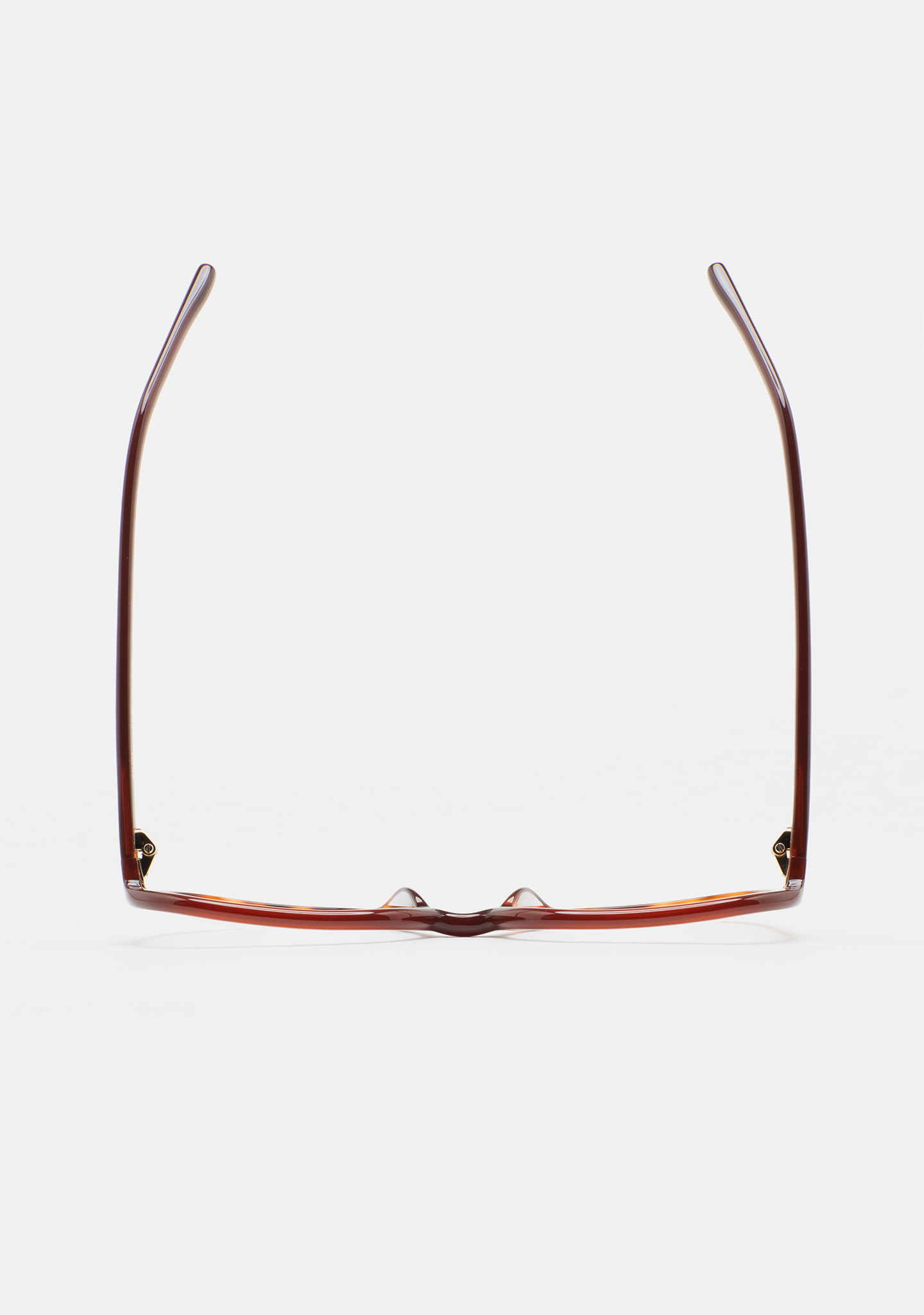 Lunettes de vue de forme carrée. Monture en acétate marron translucide avec laminé havane marron. Branches en acétate marron translucide. Plaquettes en acétate intégrées. Fait main.
