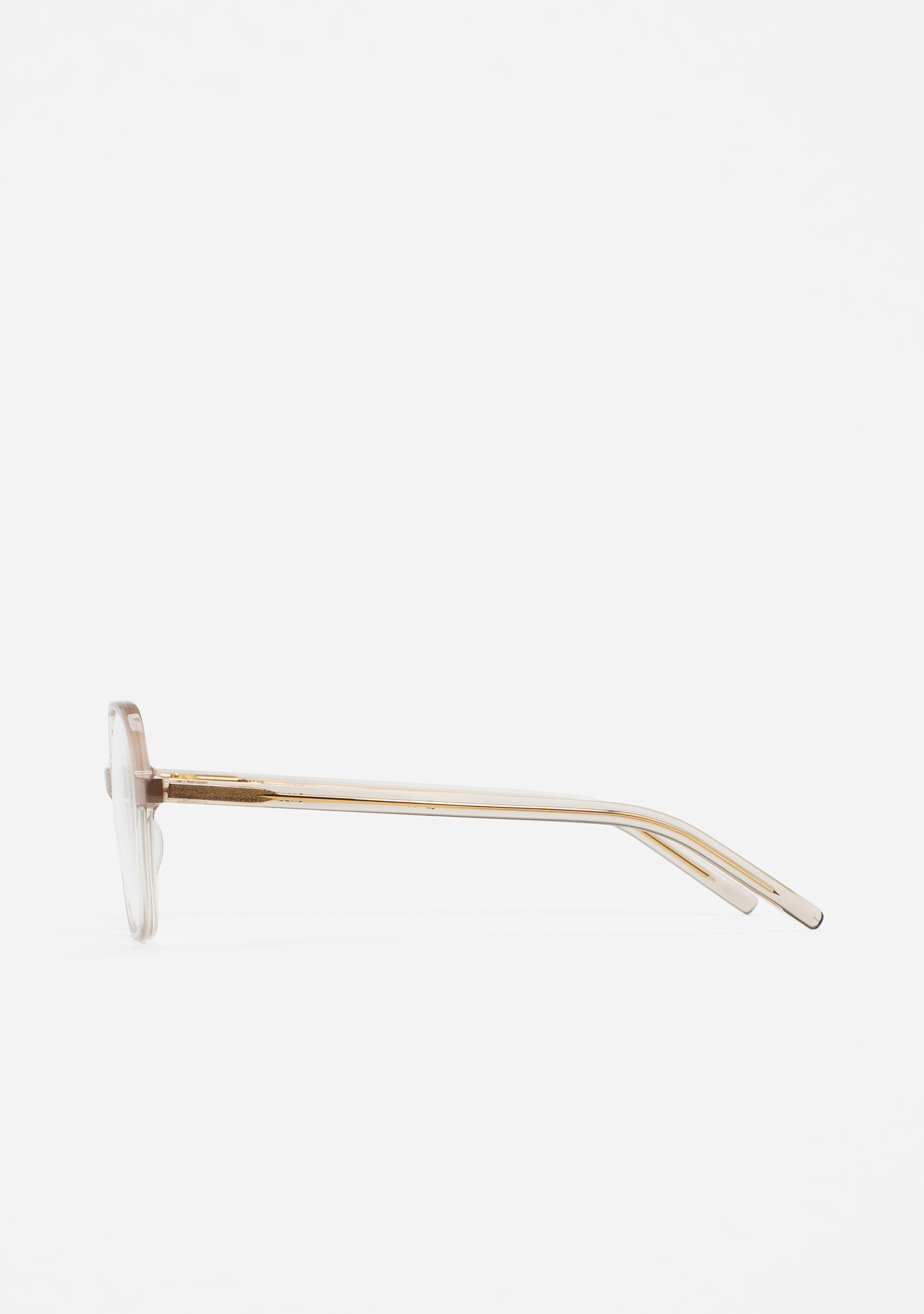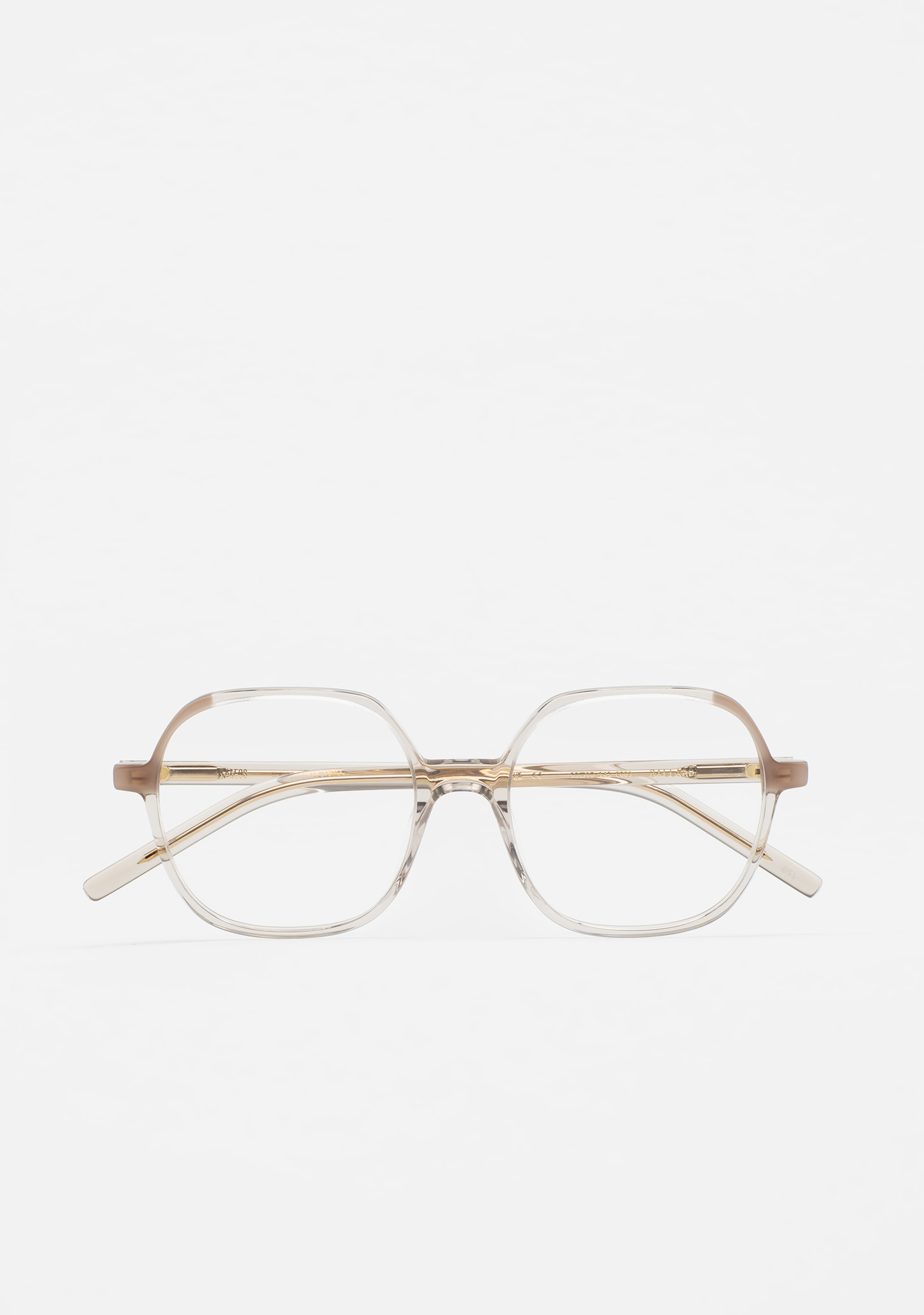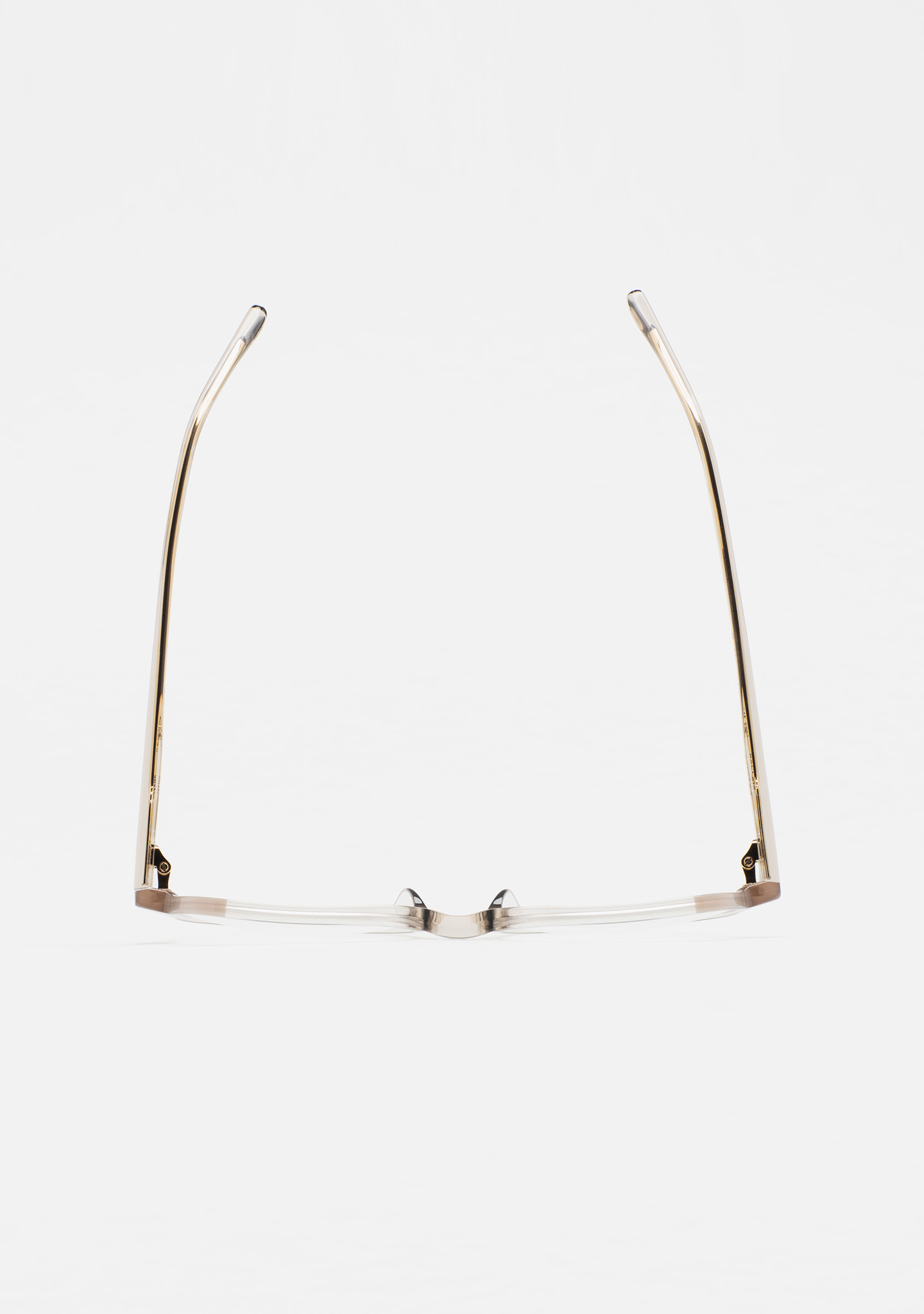 Lunettes de vue de forme carrée. Monture en acétate haute densité cristal transparent avec laminage marron clair translucide. Branches en acétate haute densité cristal transparent. Plaquettes en acétate fixes. Fait main.