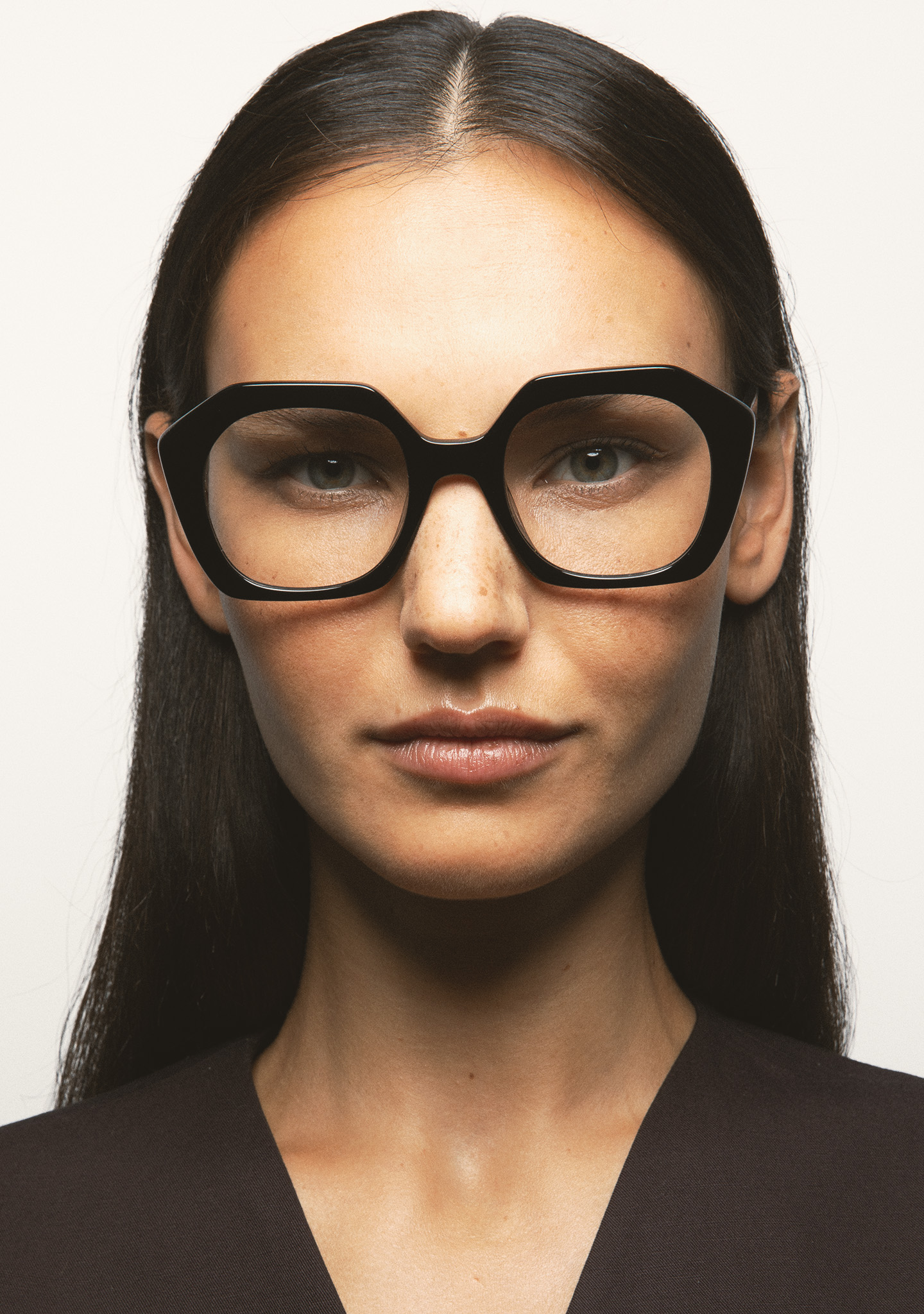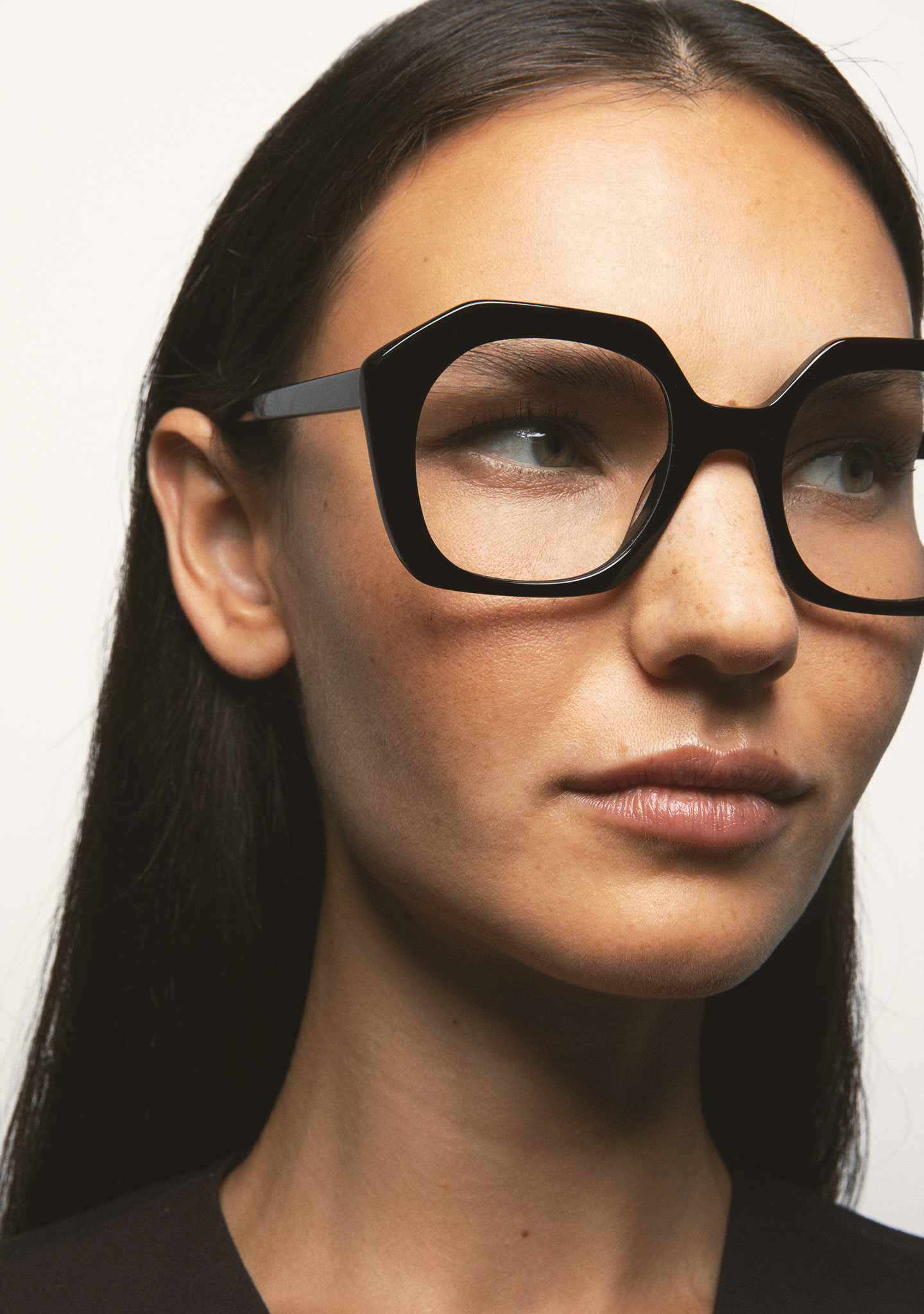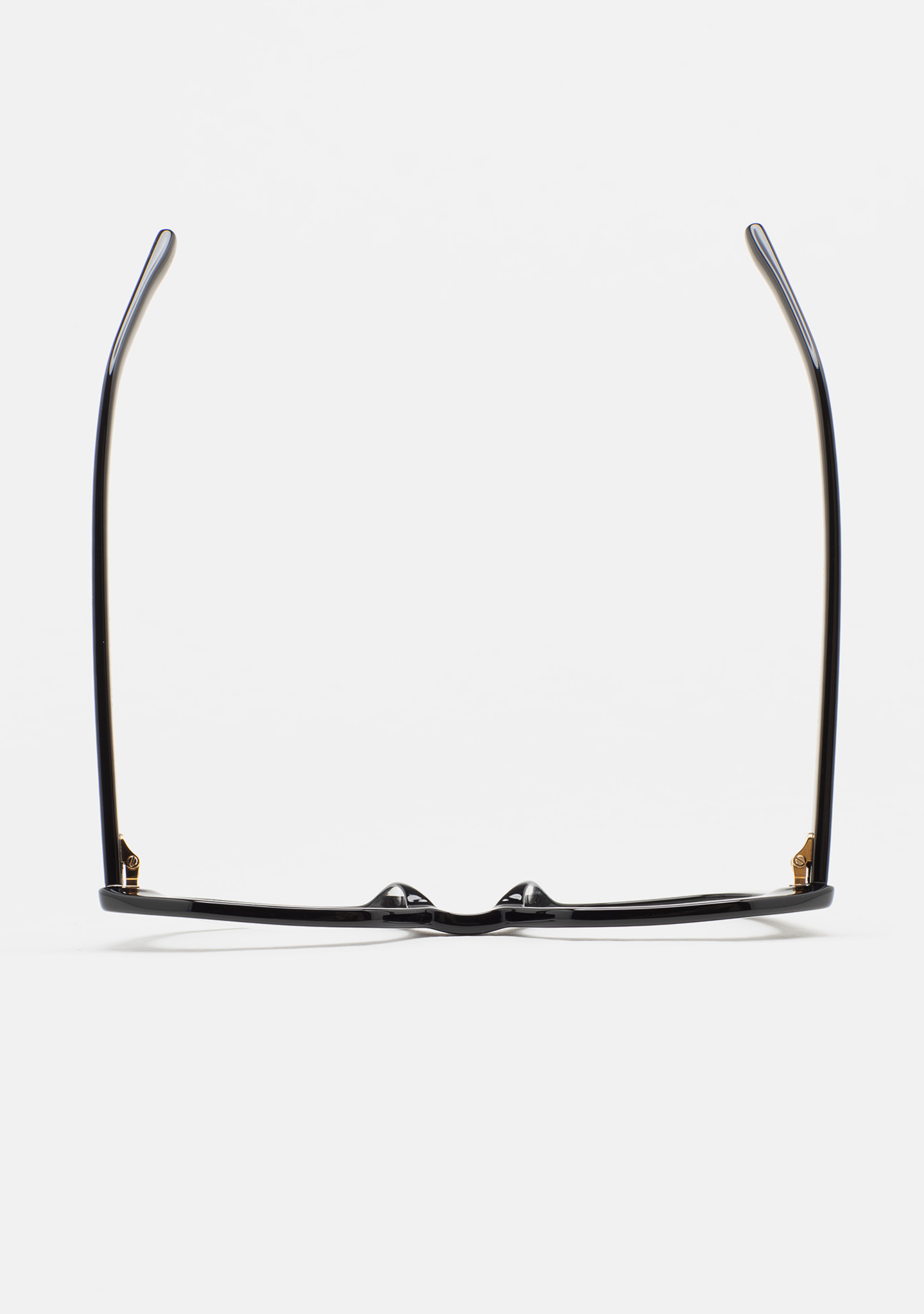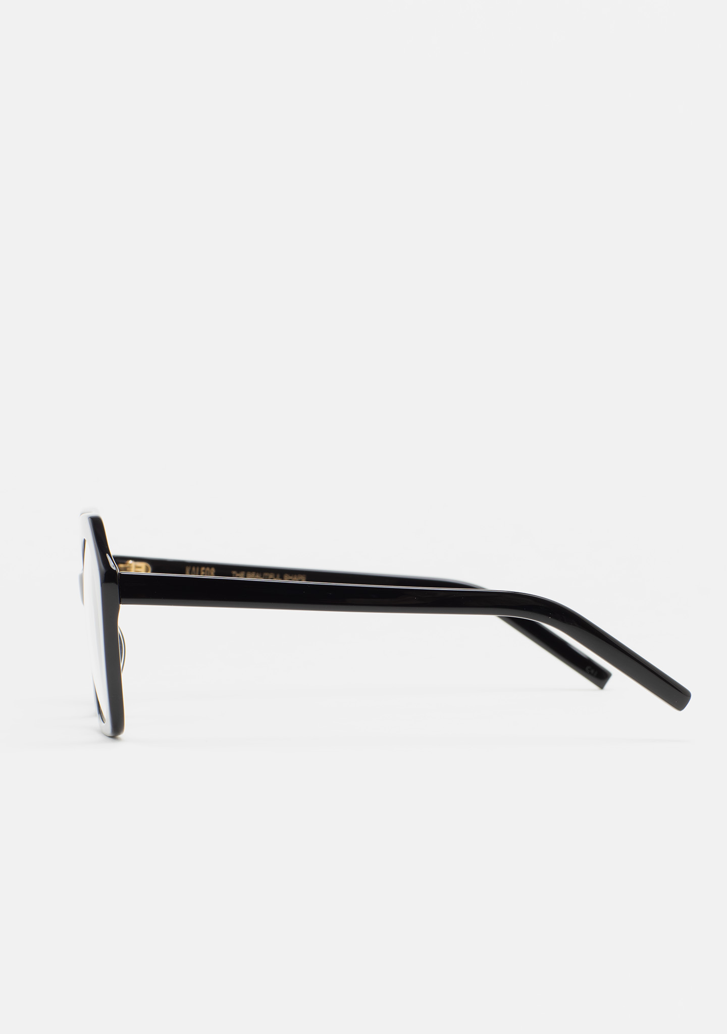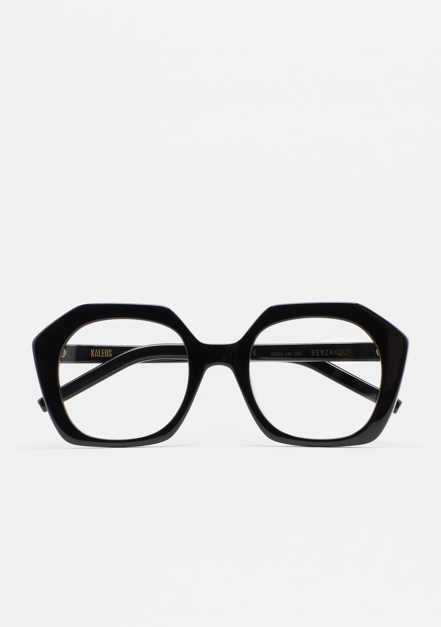 Lunettes de vue de forme hexagonale. Monture et branches en acétate noir. Plaquettes en acétate intégrées. Fait main.