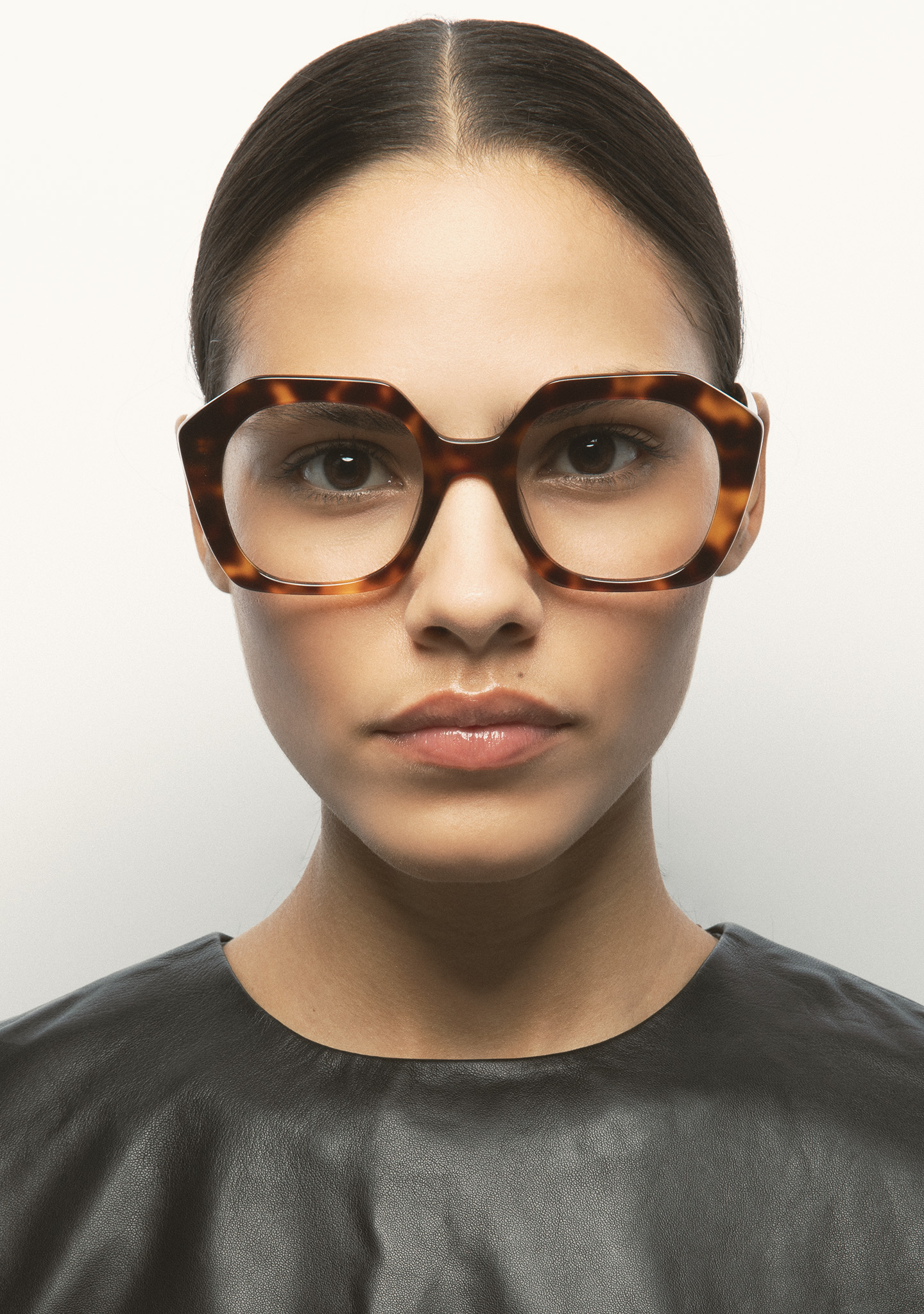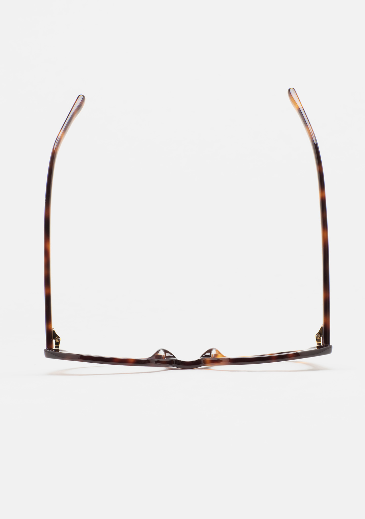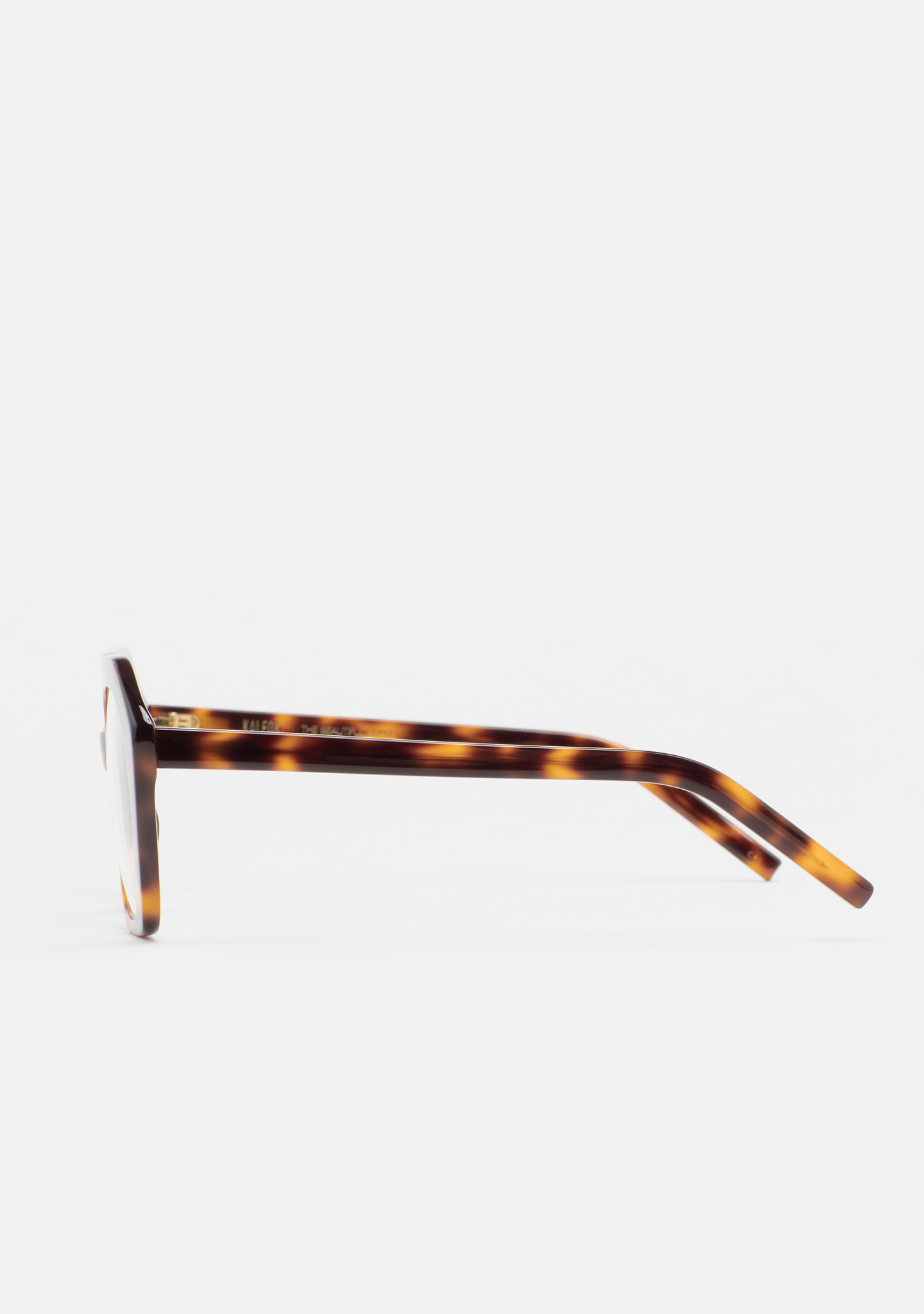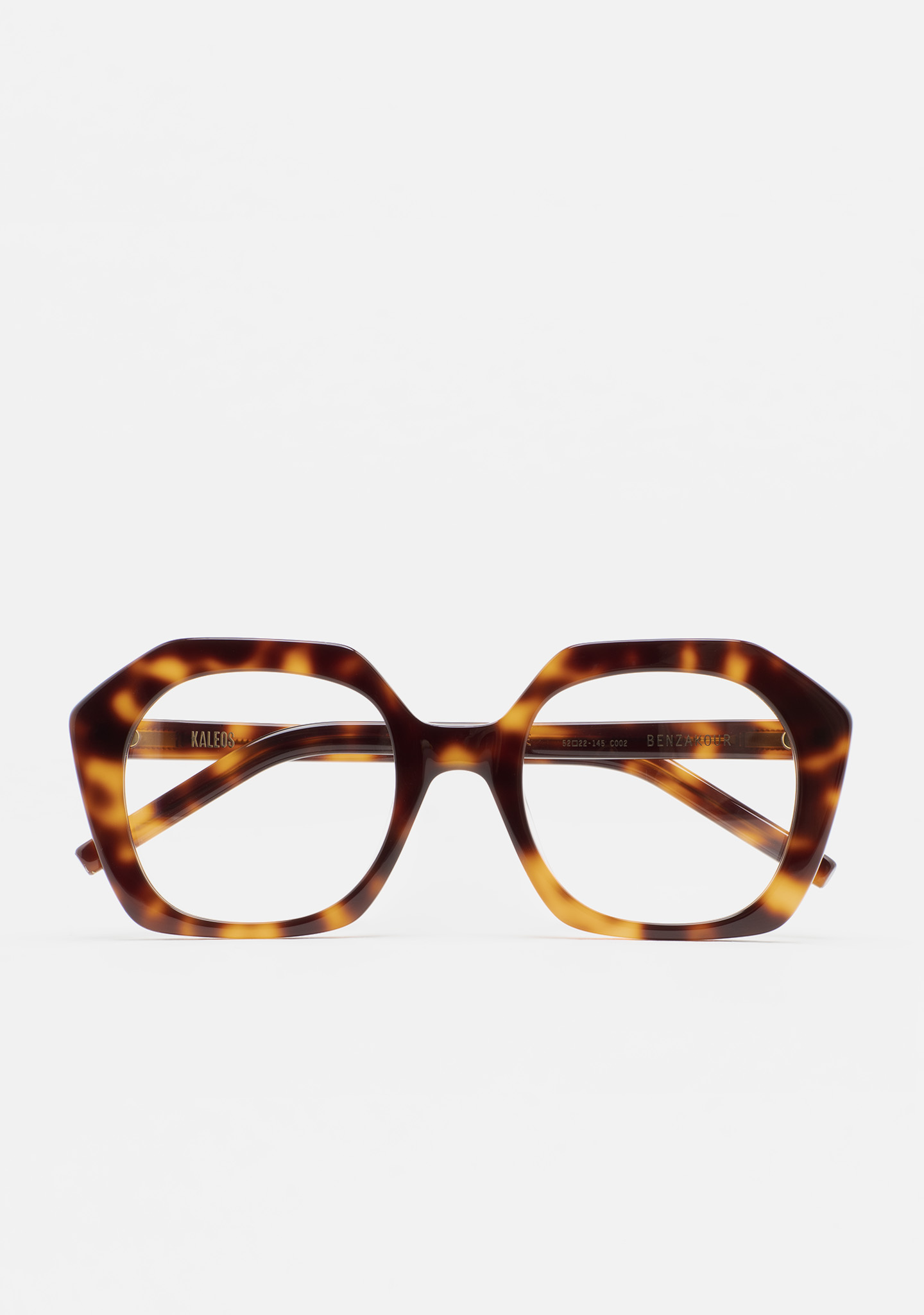 Lunettes de vue de forme hexagonale. Monture et branches en acétate havane marron. Plaquettes en acétate intégrées. Fait main.