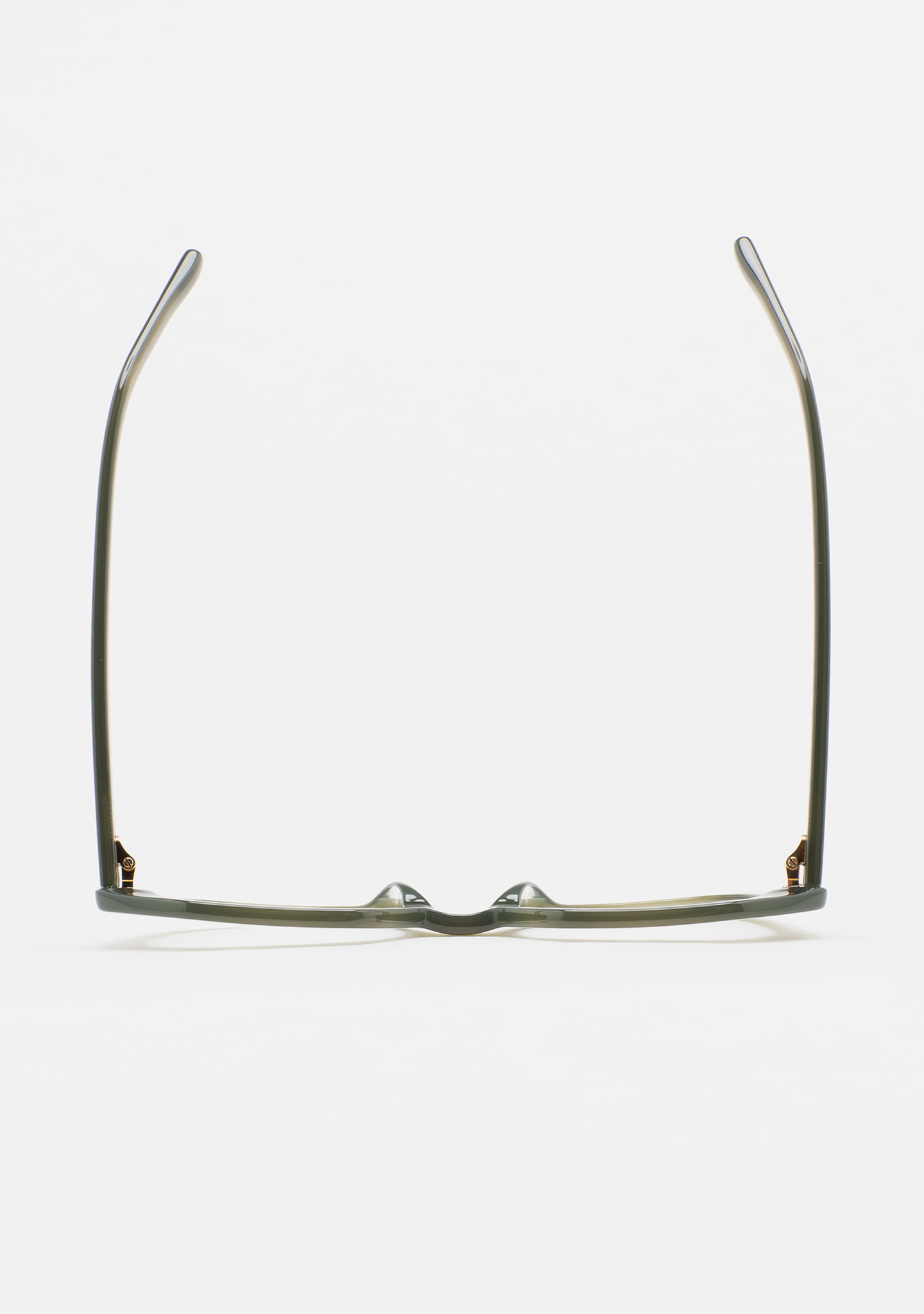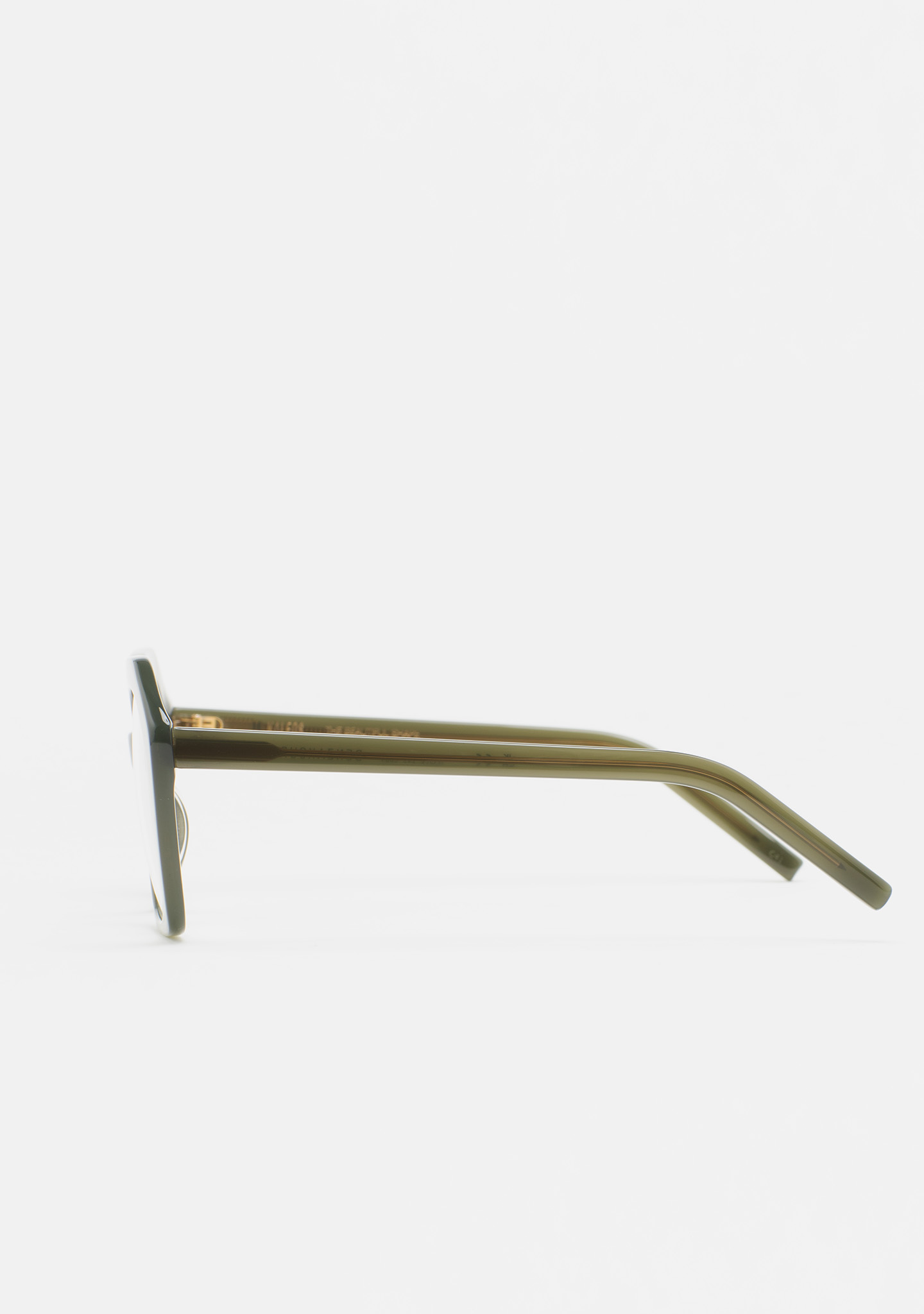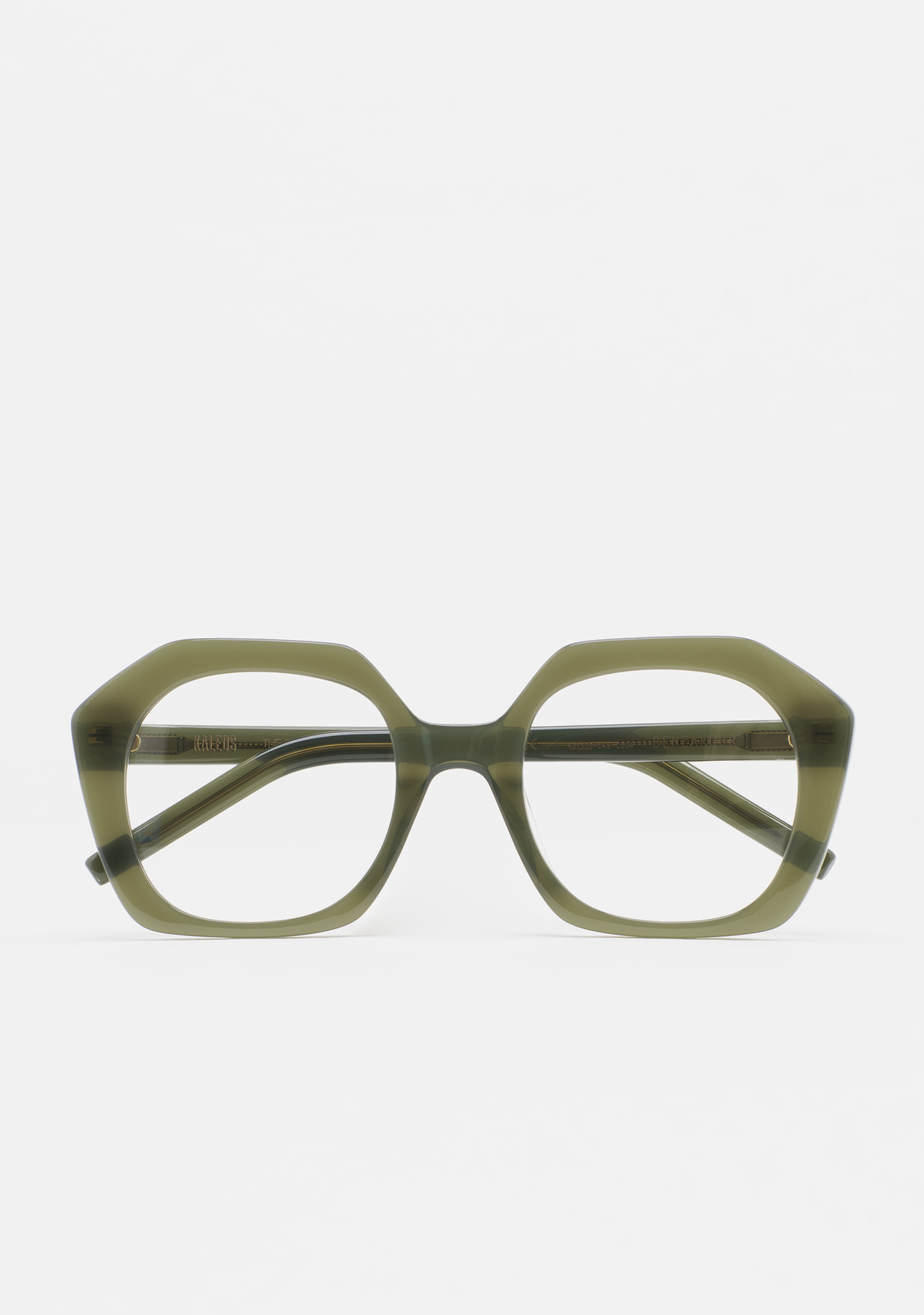 Lunettes de vue de forme hexagonale. Monture et branches en acétate vert translucide. Plaquettes en acétate intégrées. Fait main.