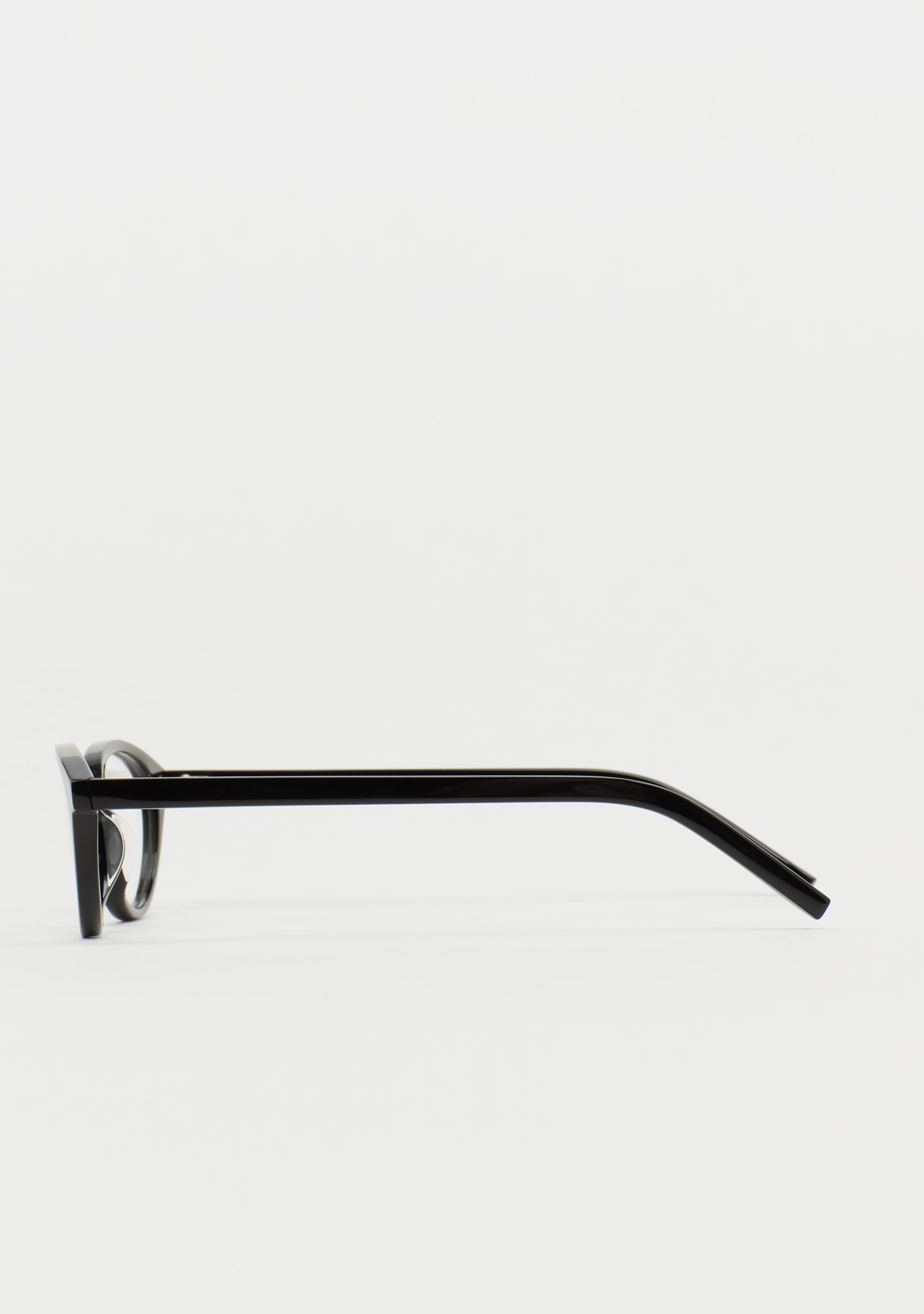 Lunettes de vue de forme ovale. Une géométrie qui transforme le regard. Face et branches en acétate noir. Plaquettes en acétate intégrées. Fabriquées à la main.