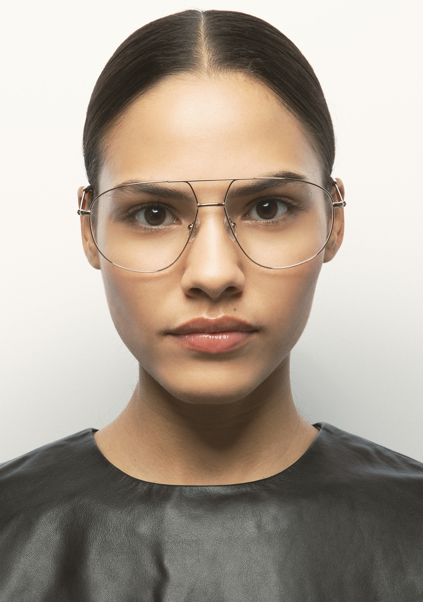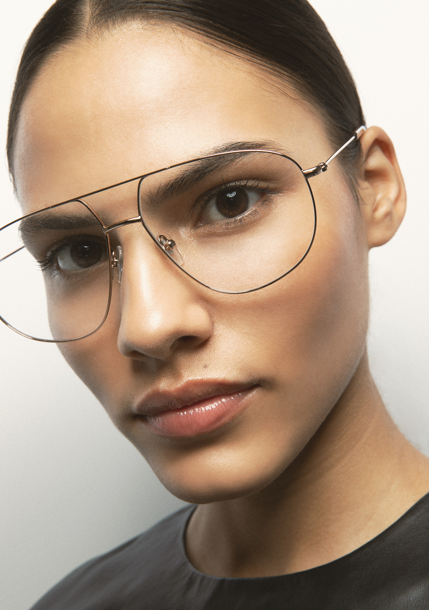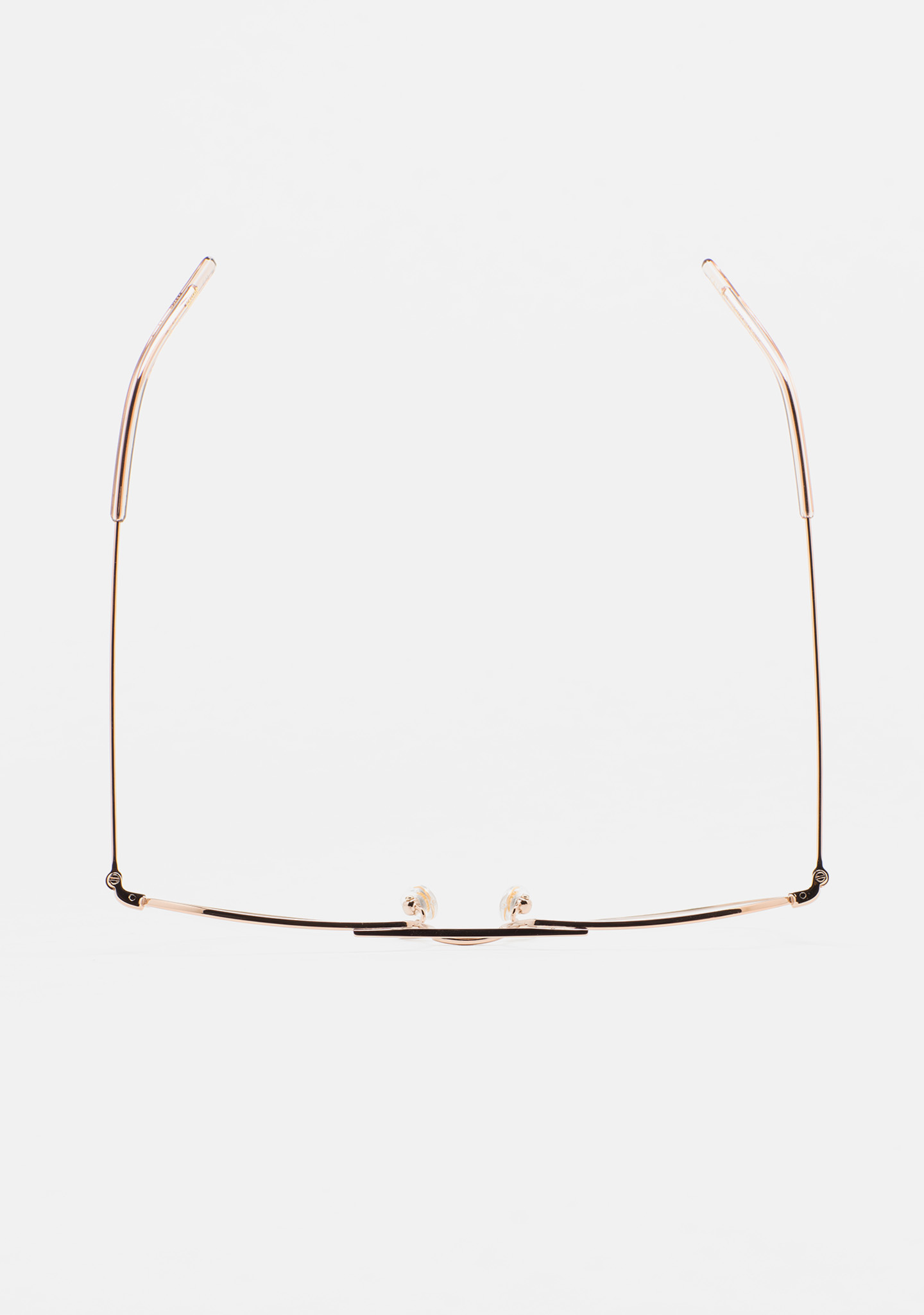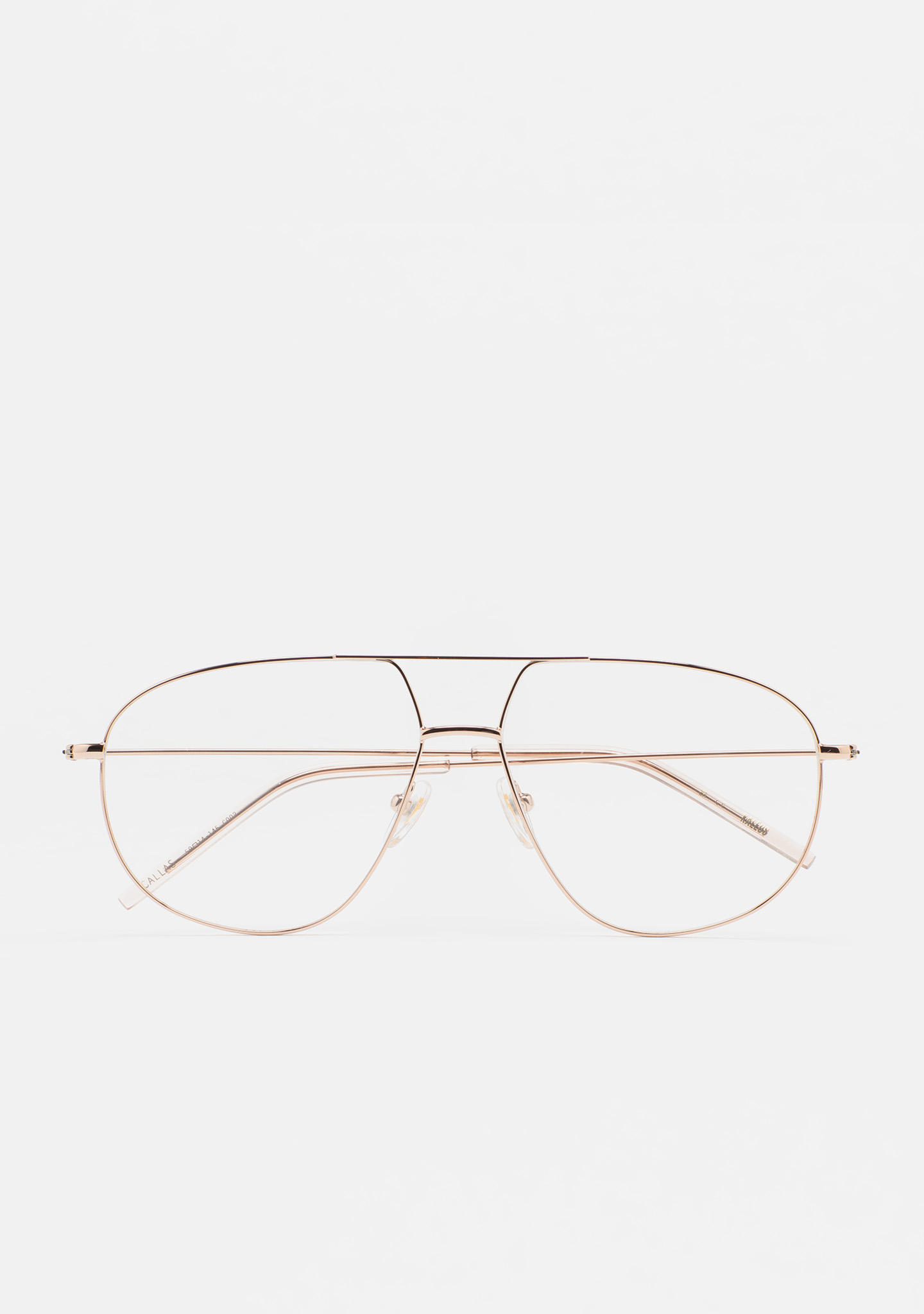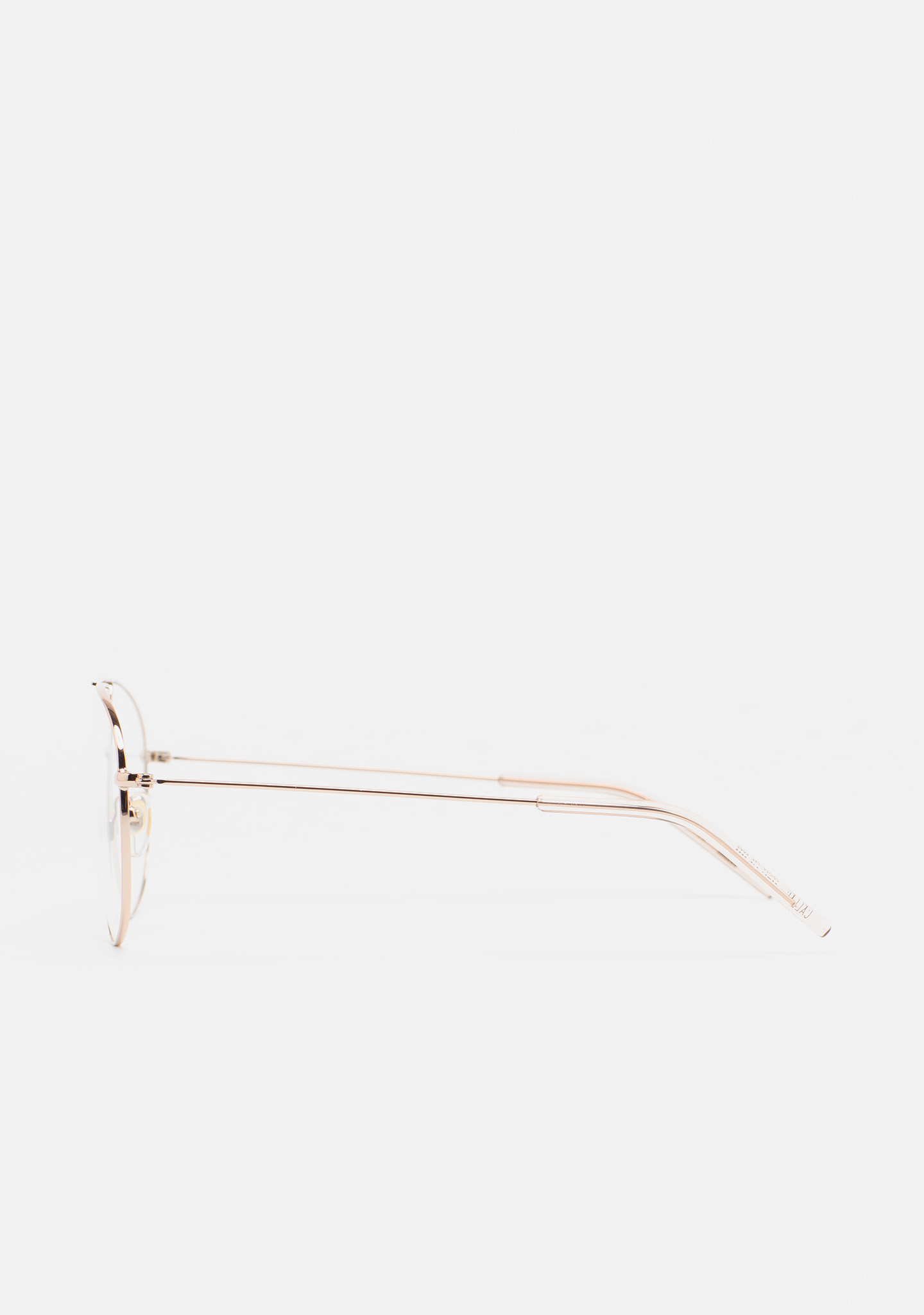Lunettes de vue de forme aviateur avec double pont. Monture et branches en acier inoxydable rose doré. Branches avec embouts en acétate rose clair transparent. Plaquettes en acier inoxydable intégrées. Fait main.