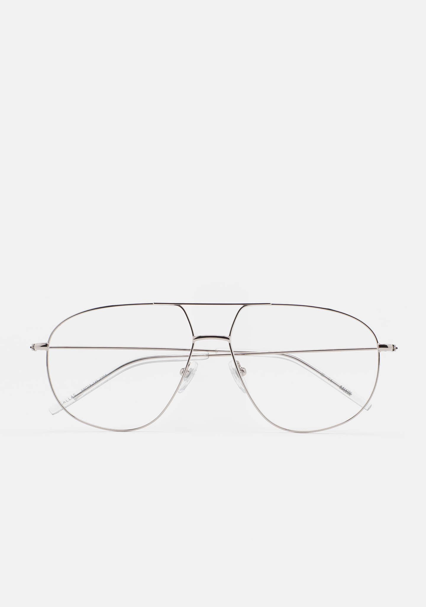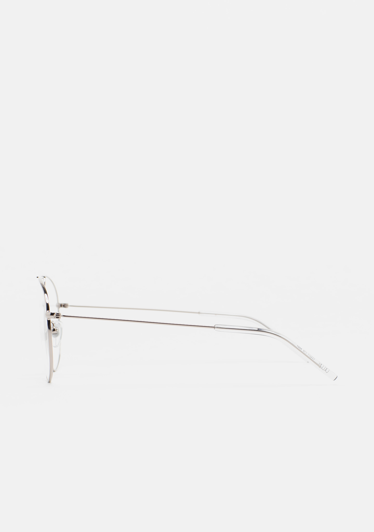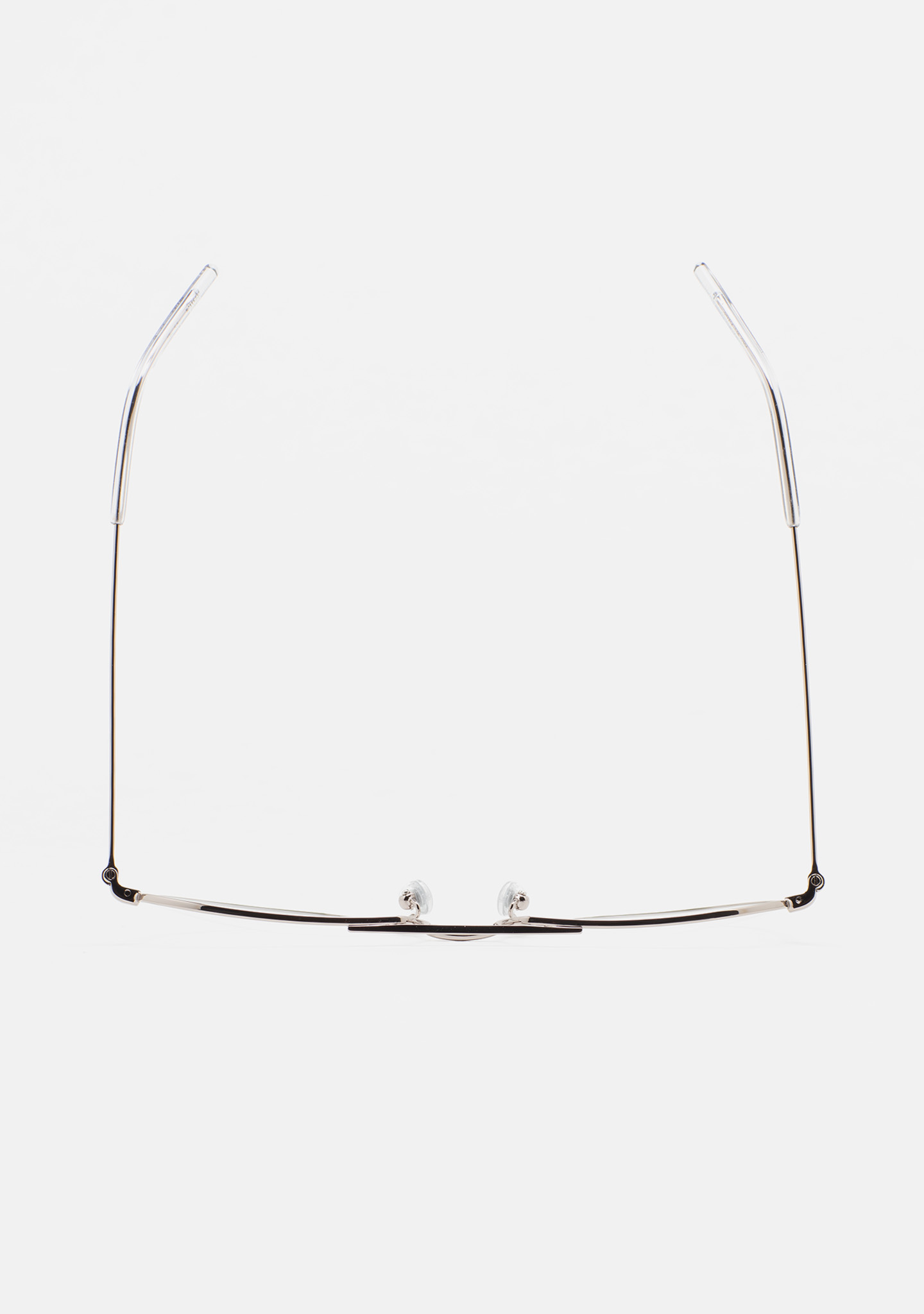 Lunettes de vue de forme aviateur avec double pont. Monture et branches en acier inoxydable argenté foncé. Branches avec embouts en acétate gris transparent. Plaquettes en acier inoxydable intégrées. Fait main.