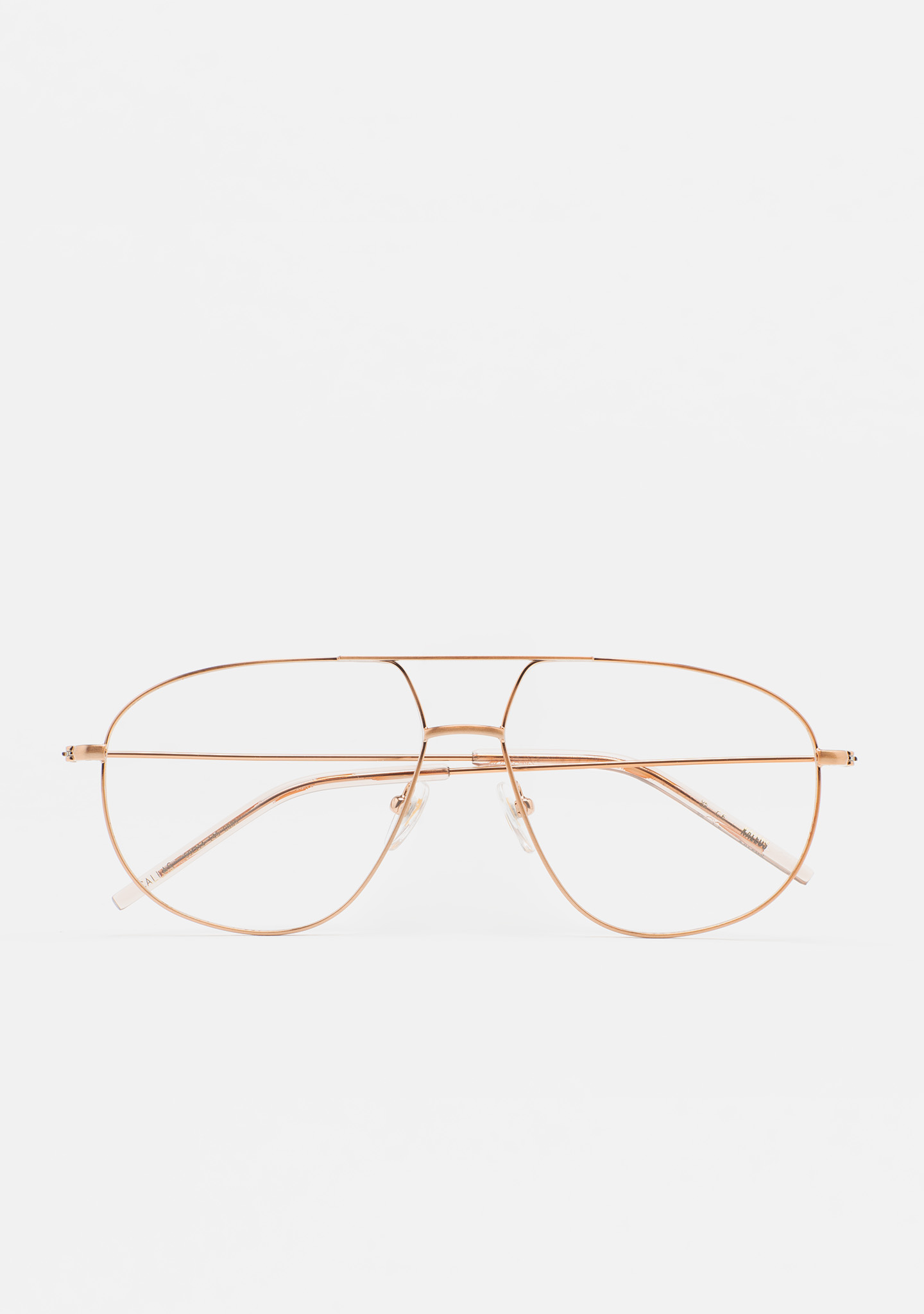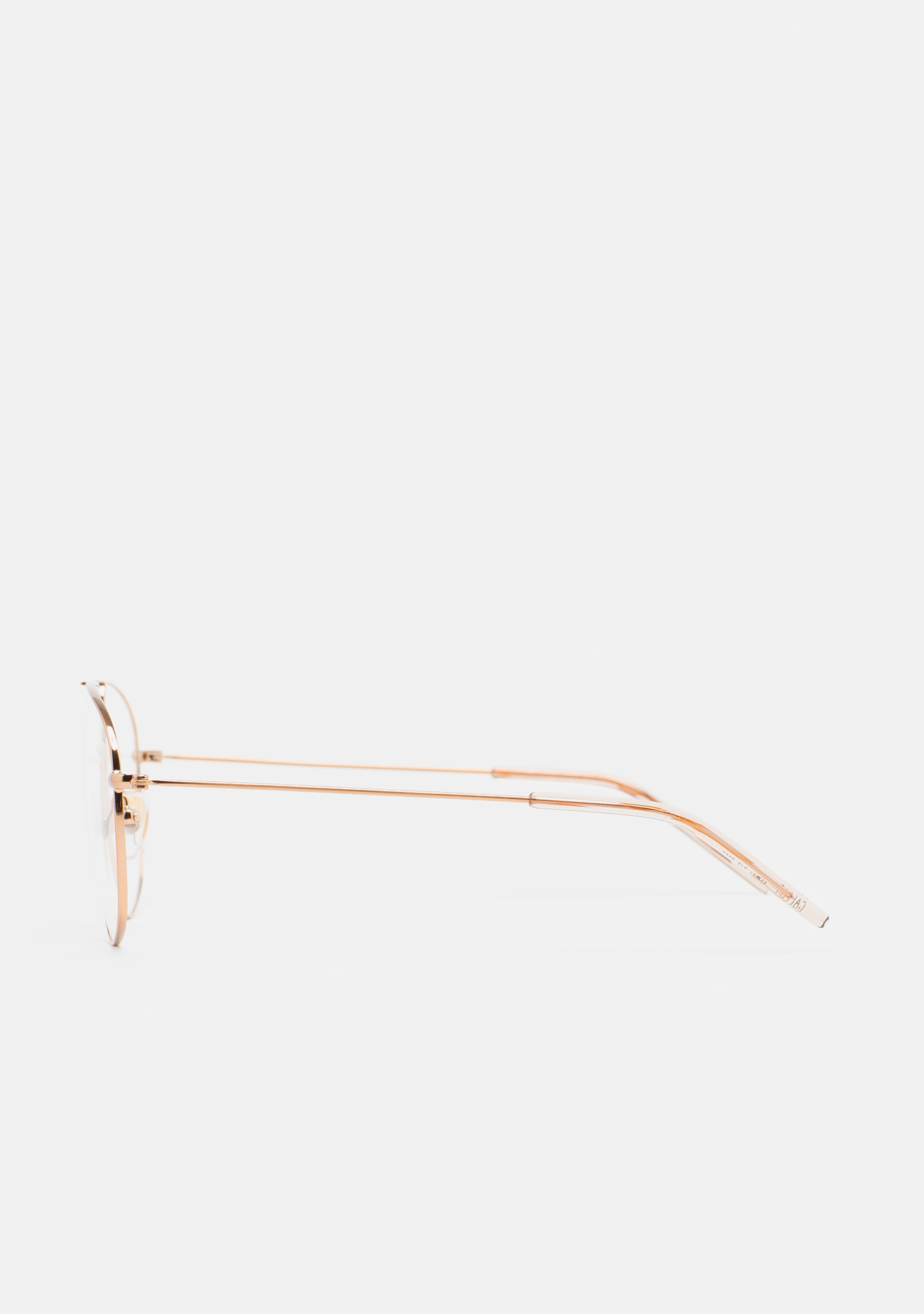 Lunettes de vue de forme aviateur avec double pont. Monture et branches en acier inoxydable rose doré. Branches avec embouts en acétate marron clair transparent. Plaquettes en acier inoxydable intégrées. Fait main.