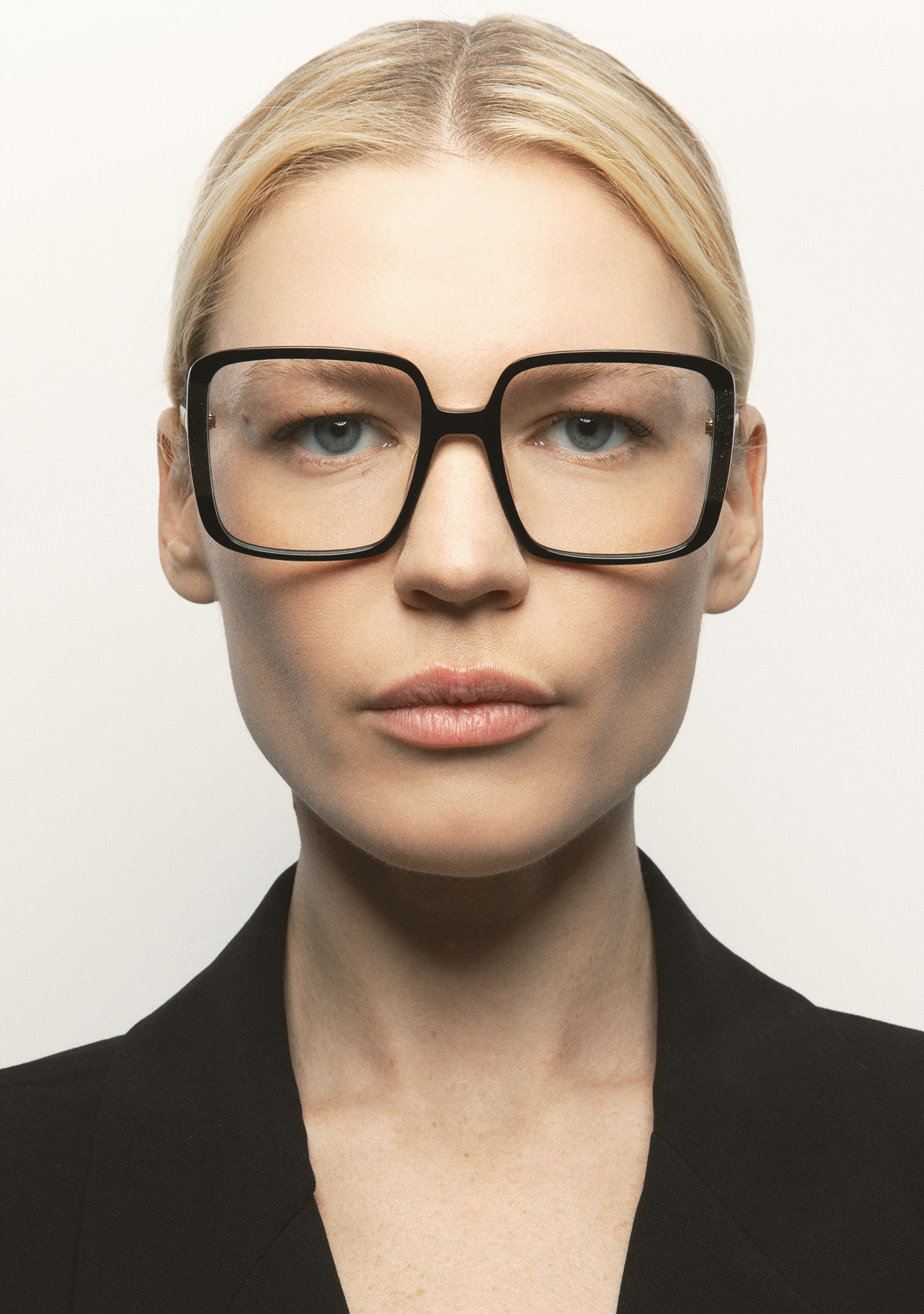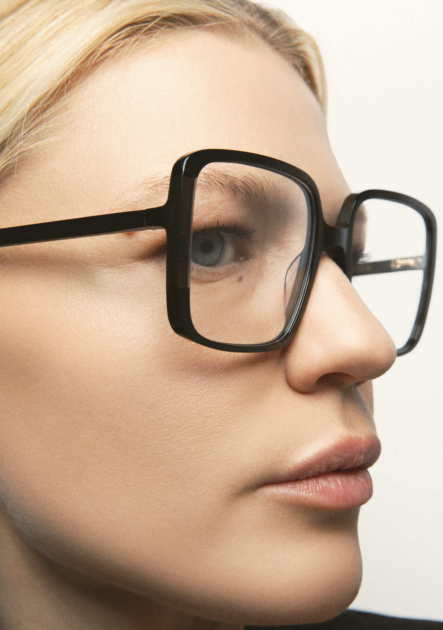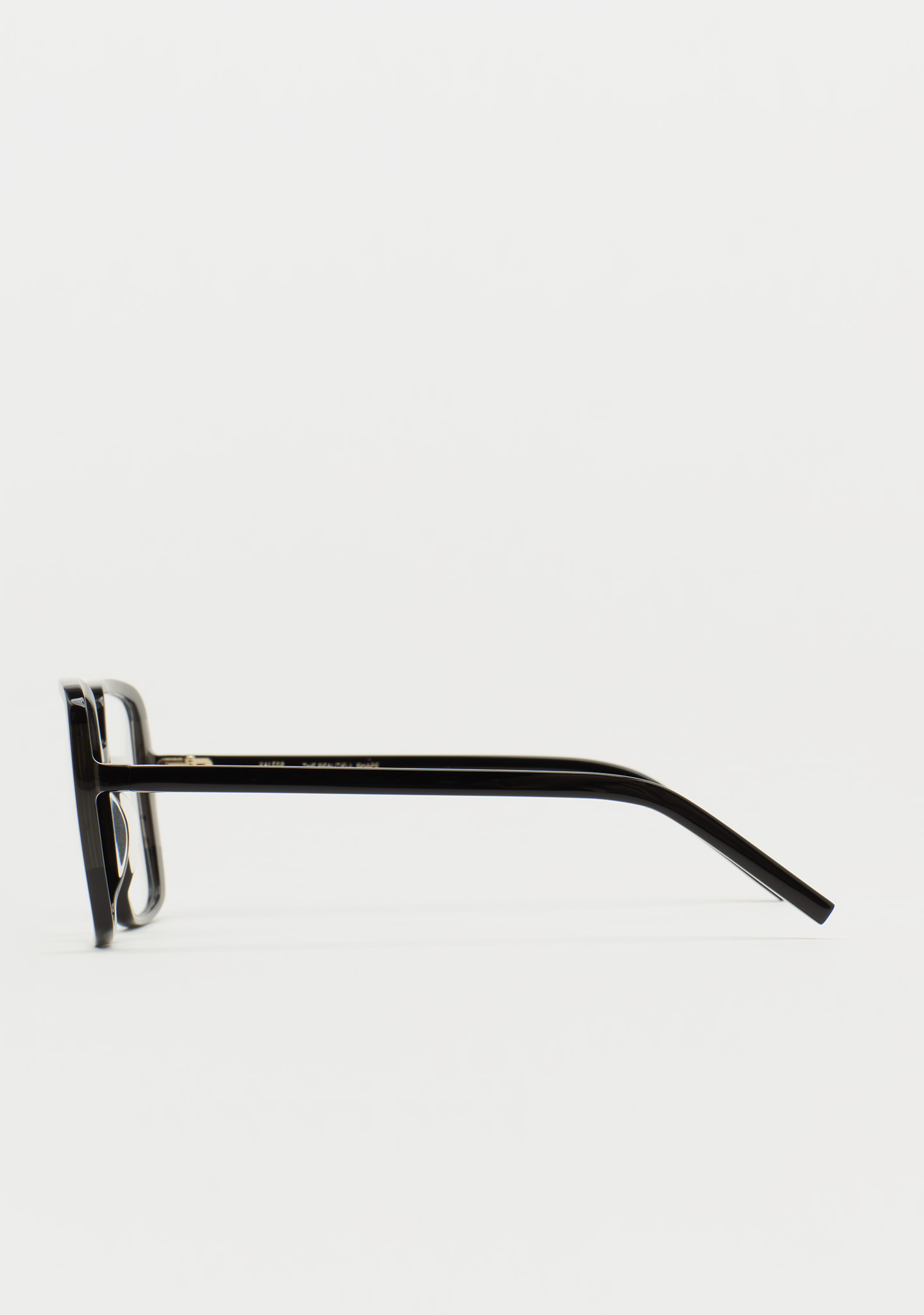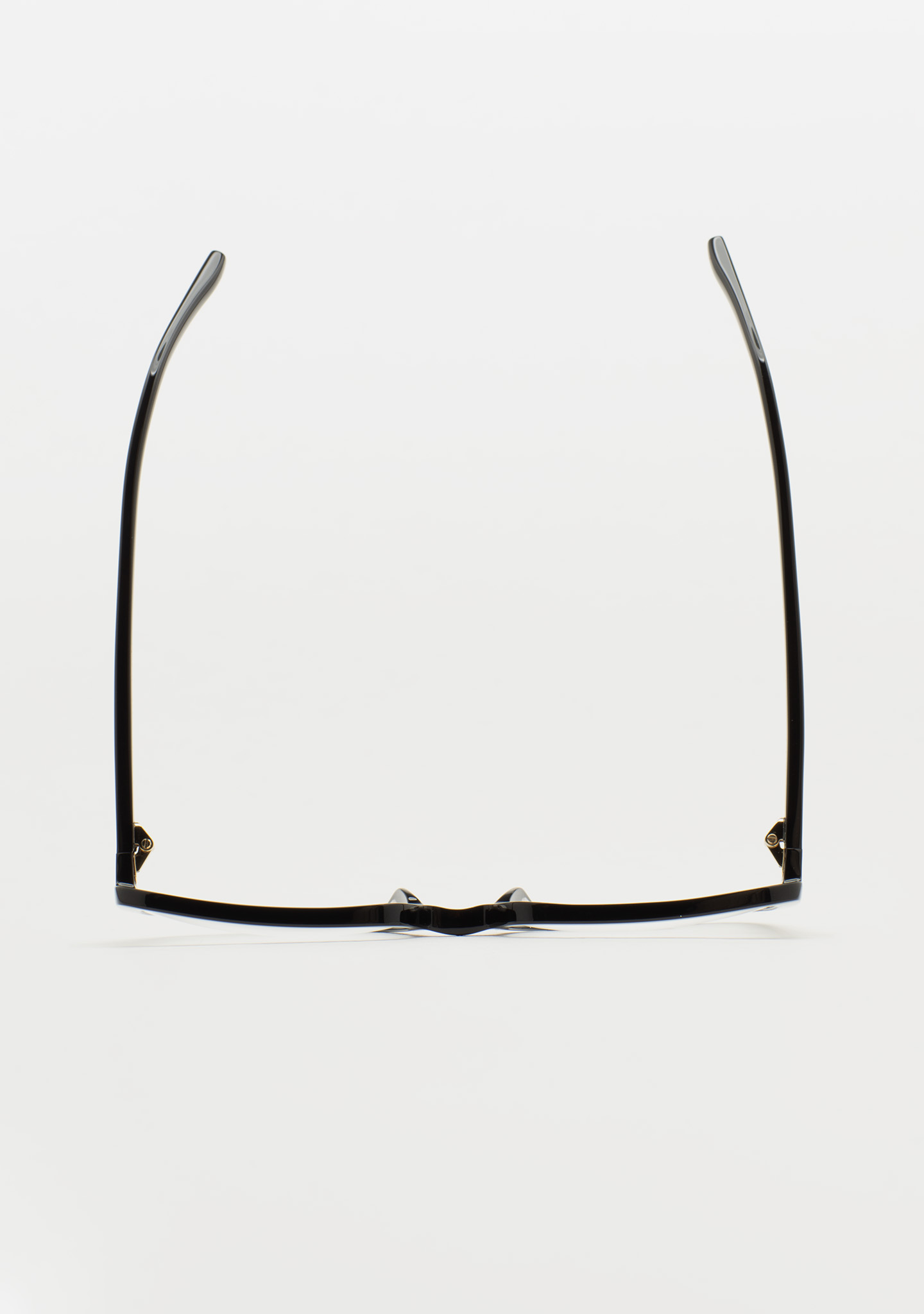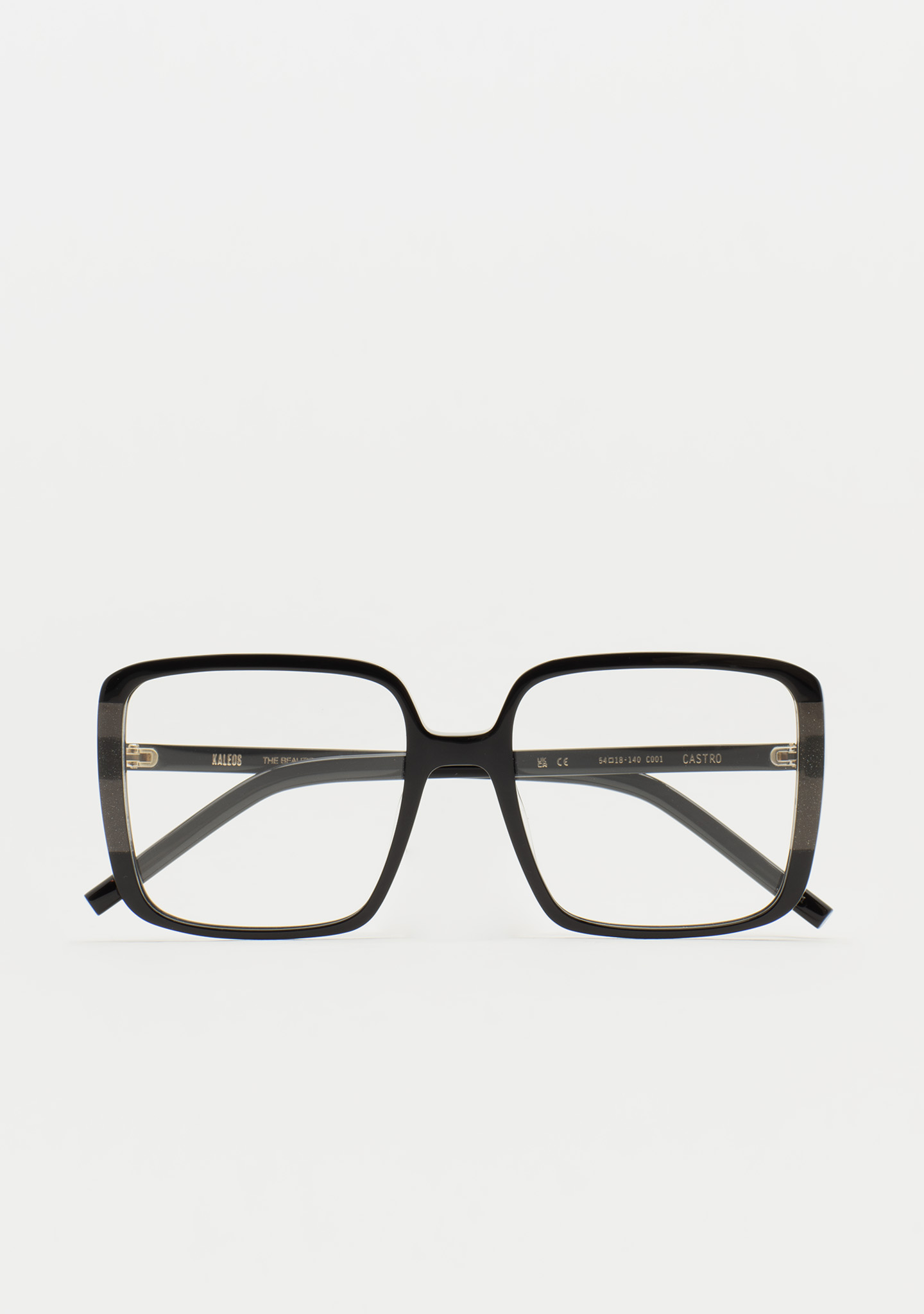 Lunettes de vue carrées. Géométrie qui transforme le regard. Face avant en acétate noir avec laminage glitter noir. Branches en acétate noir. Plaquettes de nez en acétate intégrées. Fabriquées à la main.