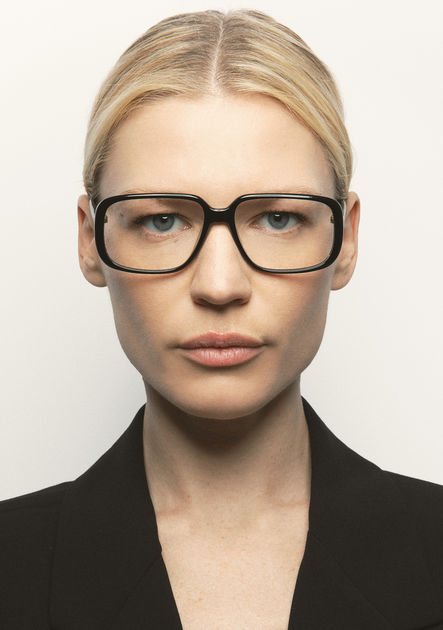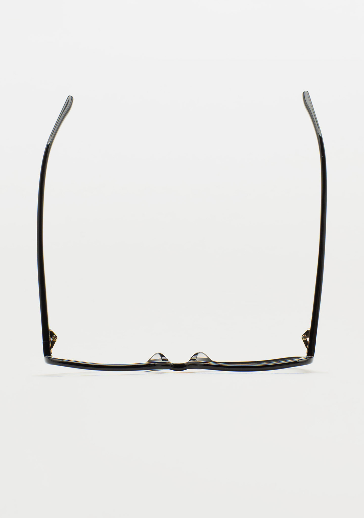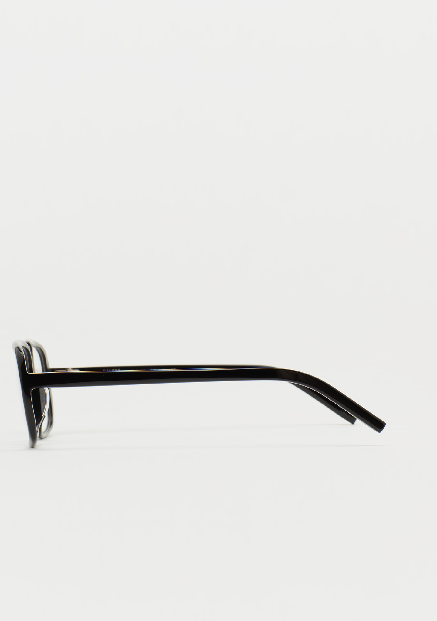 Lunettes de vue de forme rectangulaire. Subtilité au caractère affirmé. Face et branches en acétate noir. Plaquettes en acétate intégrées. Fabriquées à la main.