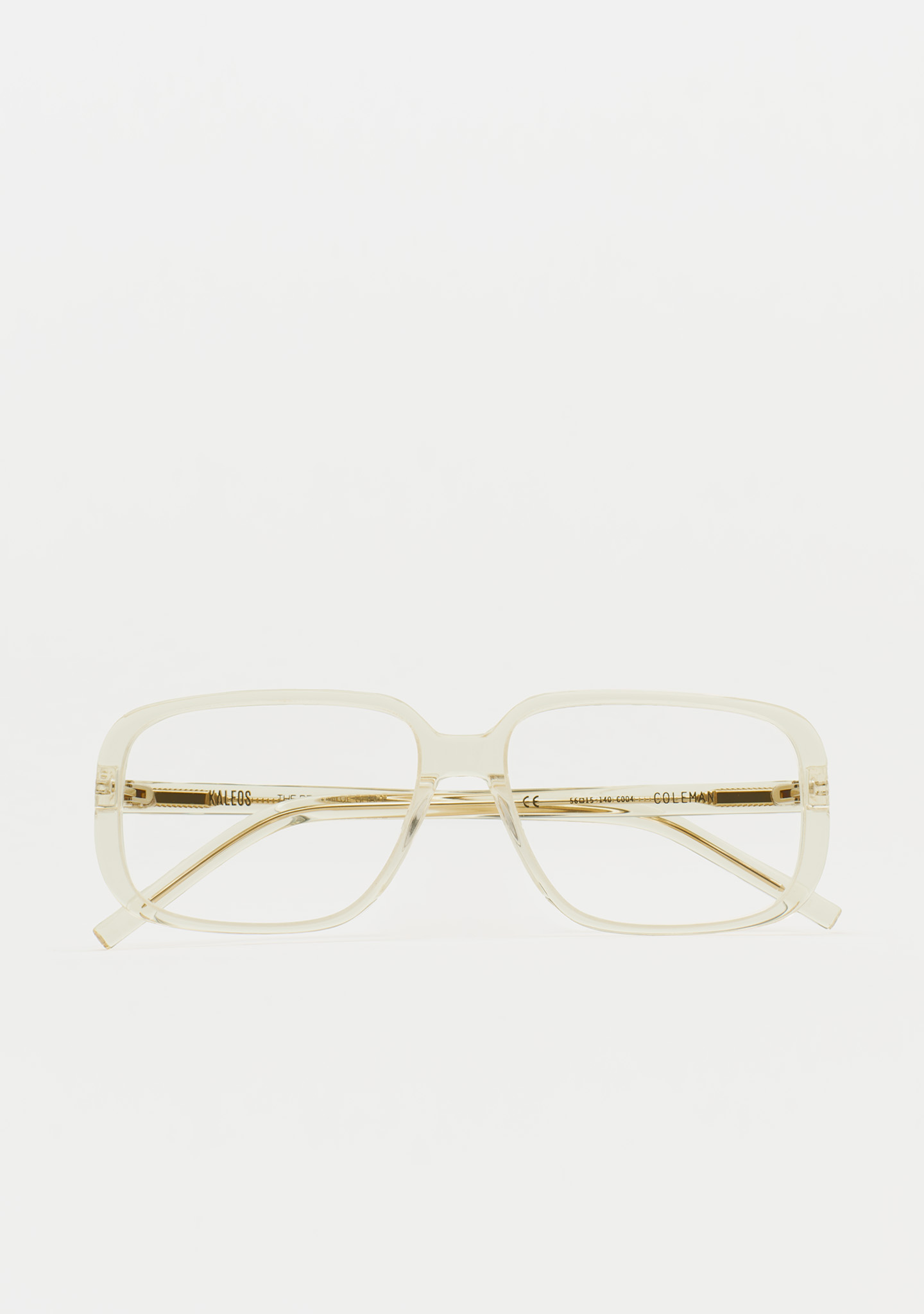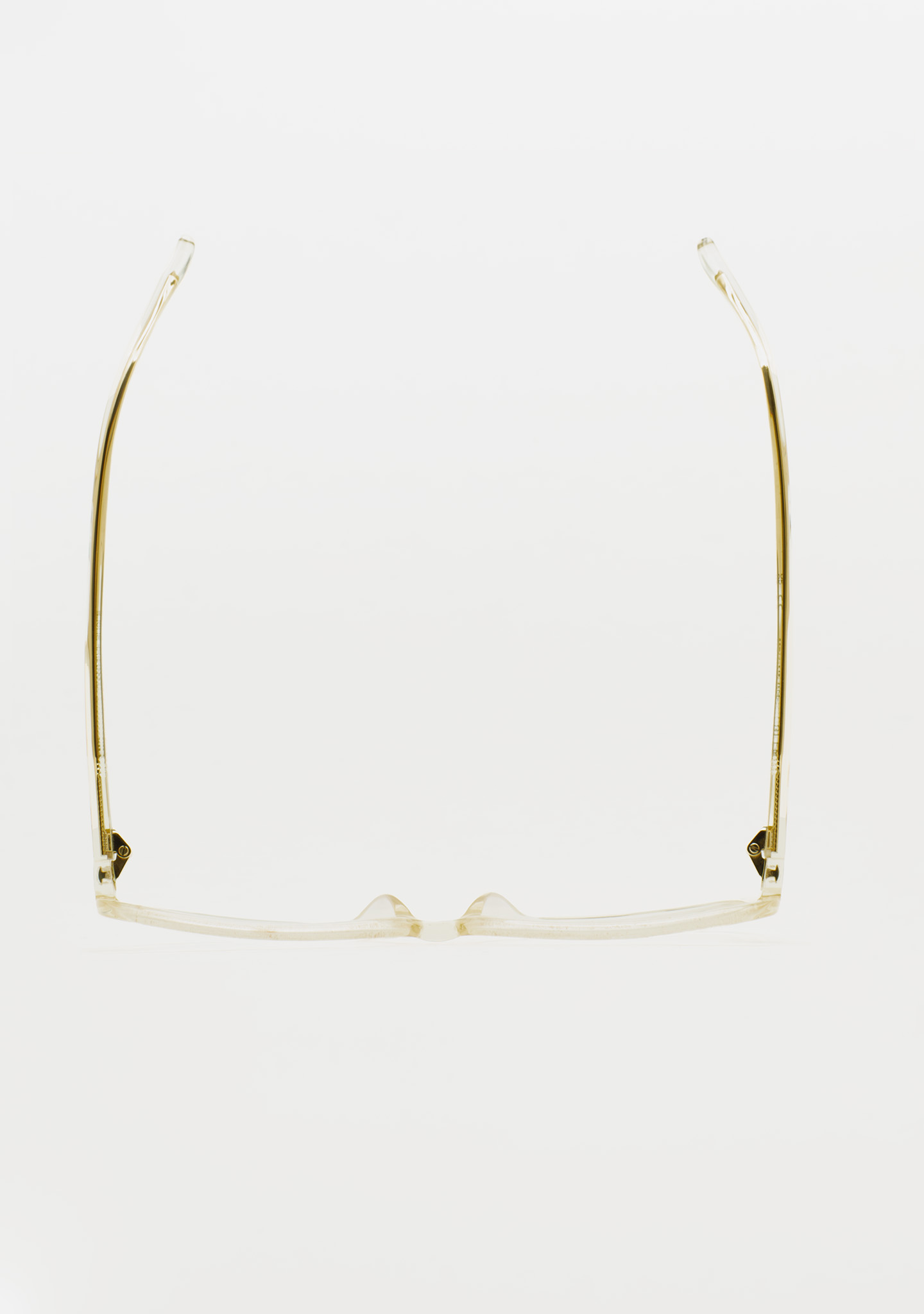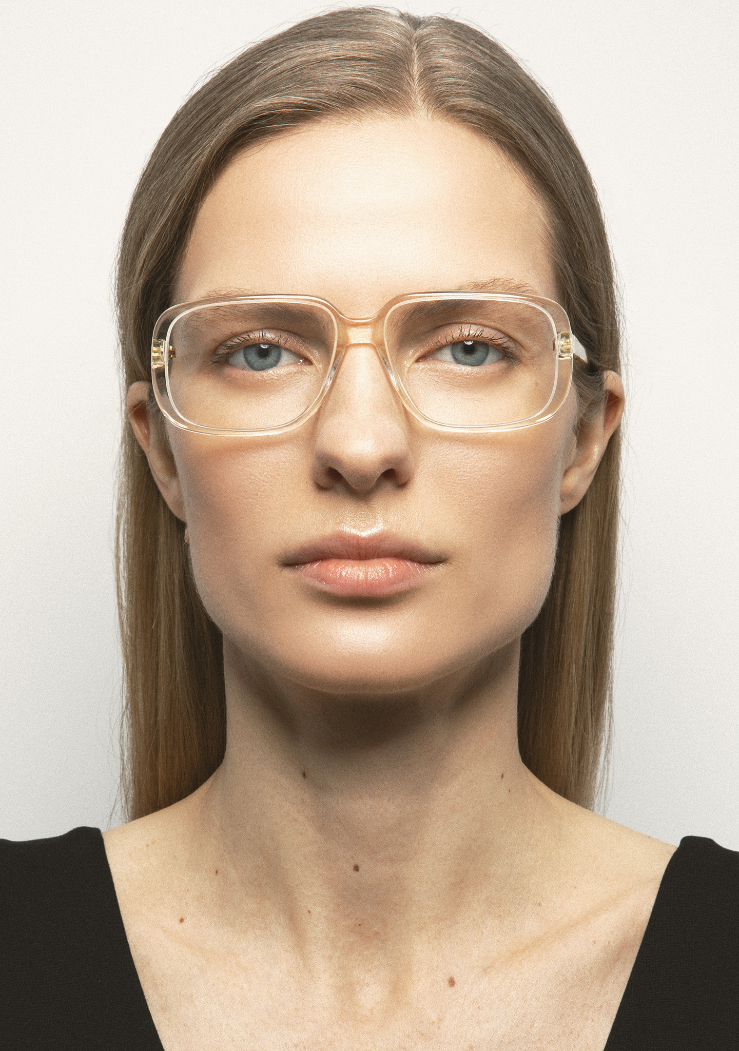 Lunettes de vue de forme rectangulaire. Subtilité au caractère affirmé. Face et branches en acétate cristal transparent. Plaquettes en acétate intégrées. Fabriquées à la main.