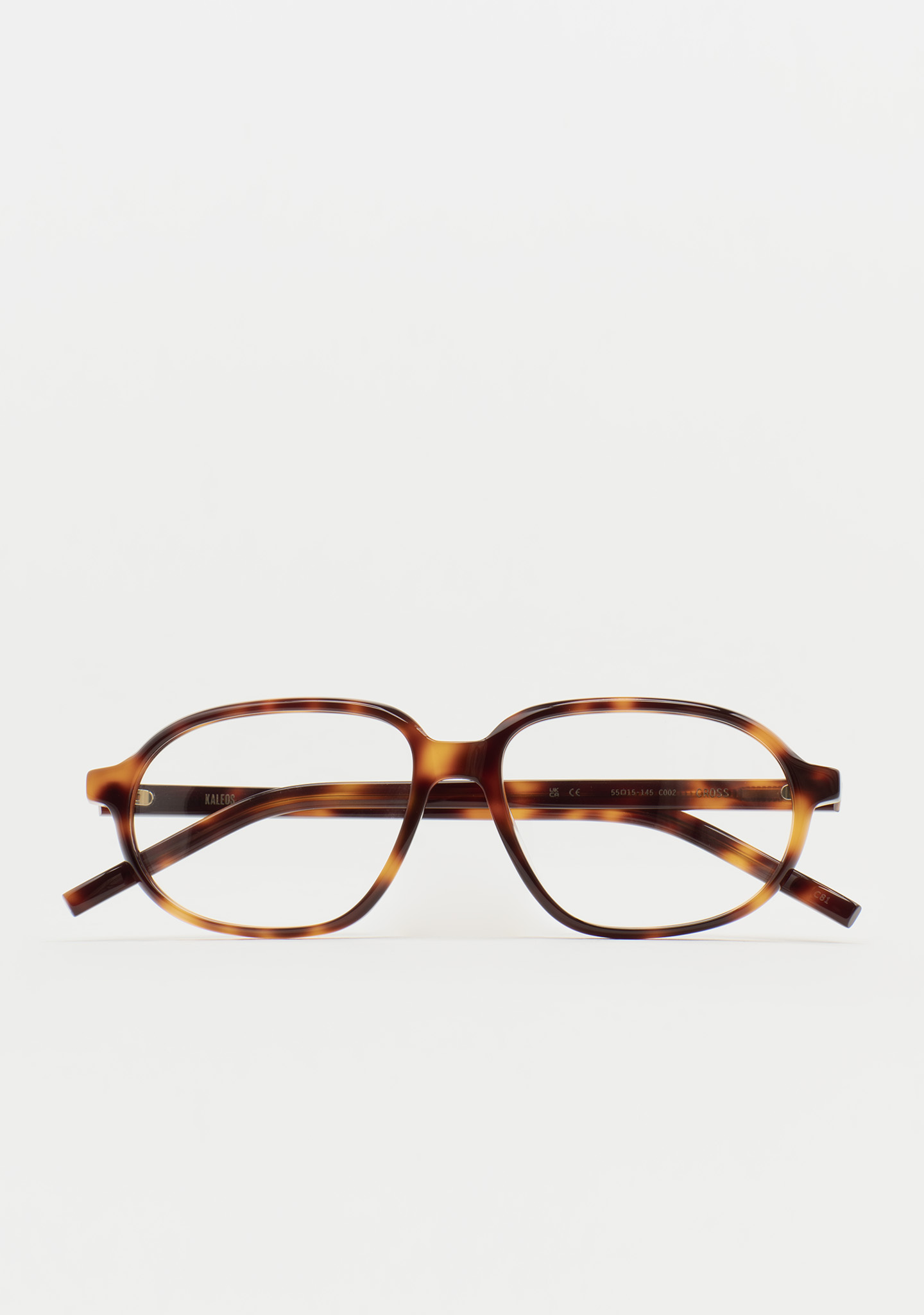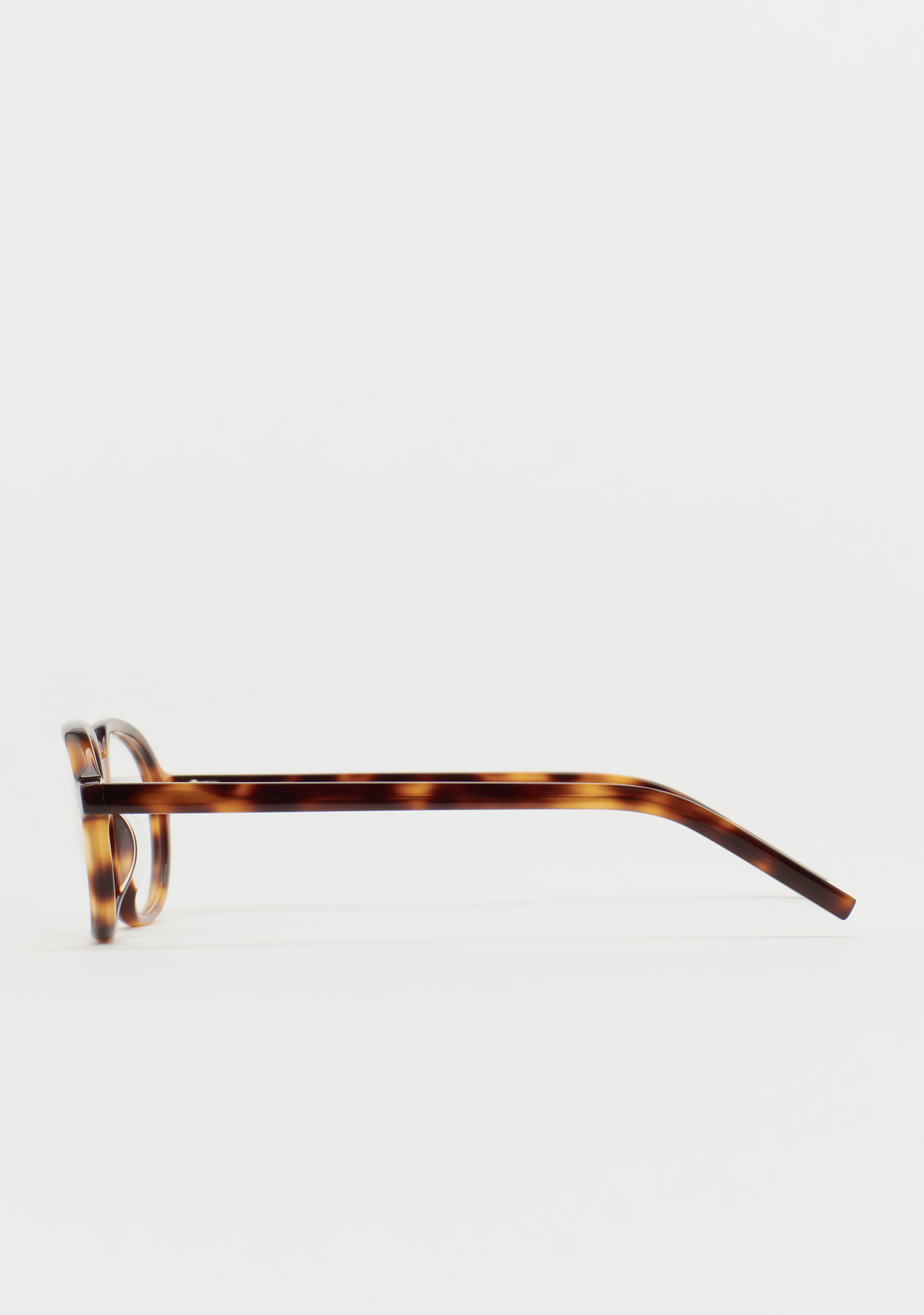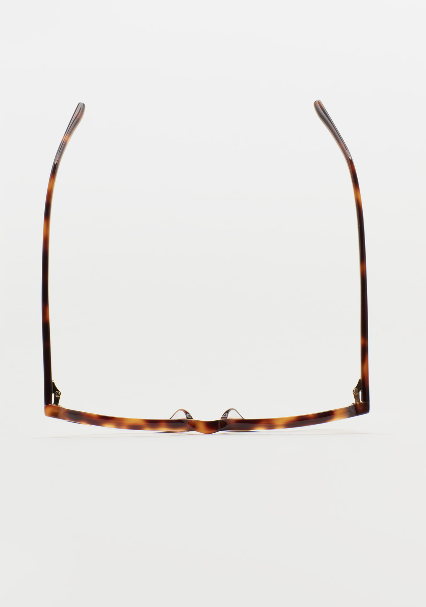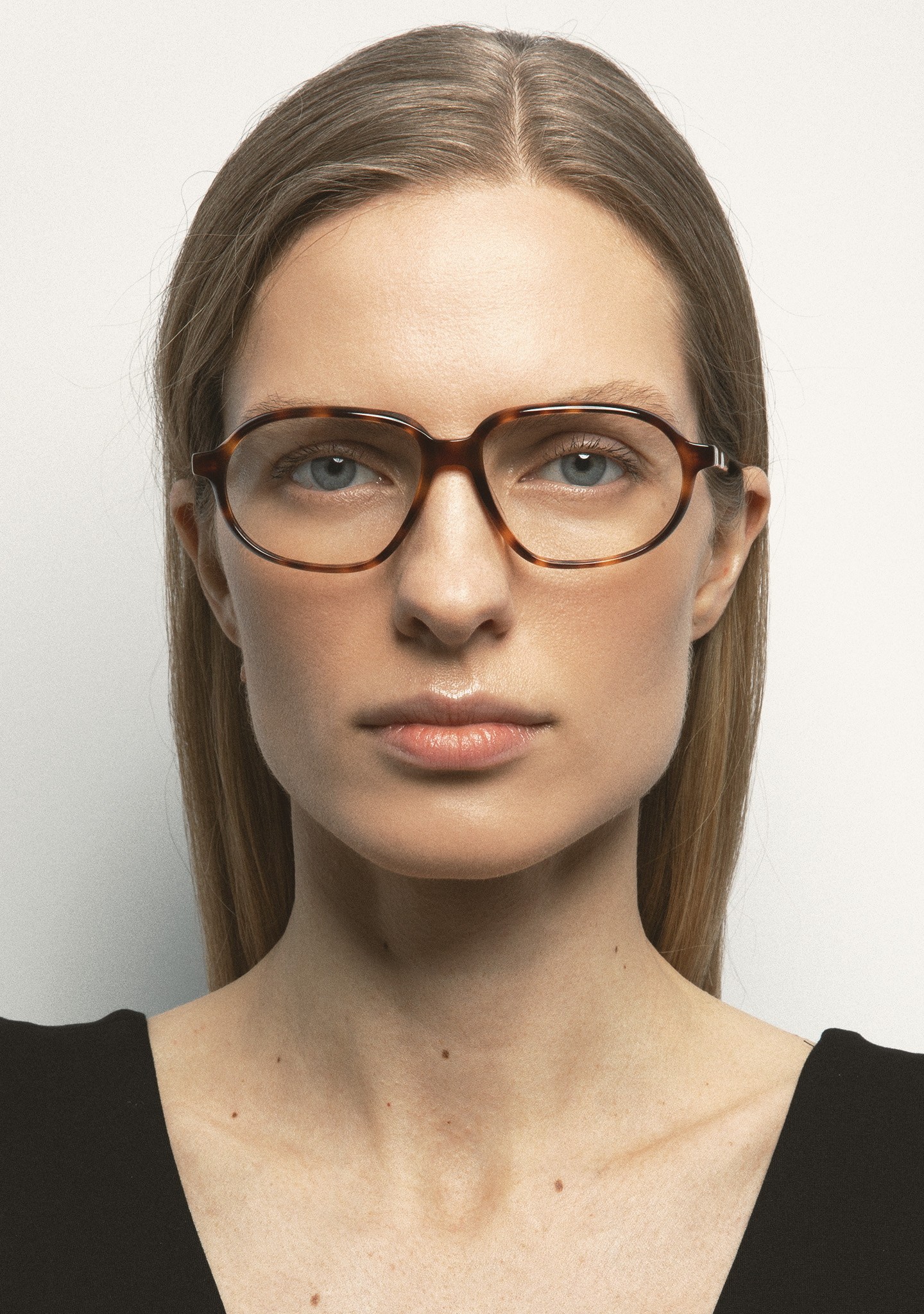 Lunettes de vue de forme aviateur. Un minimalisme qui marque les esprits. Face et branches en acétate havane marron foncé. Plaquettes en acétate intégrées. Fabriquées à la main.
