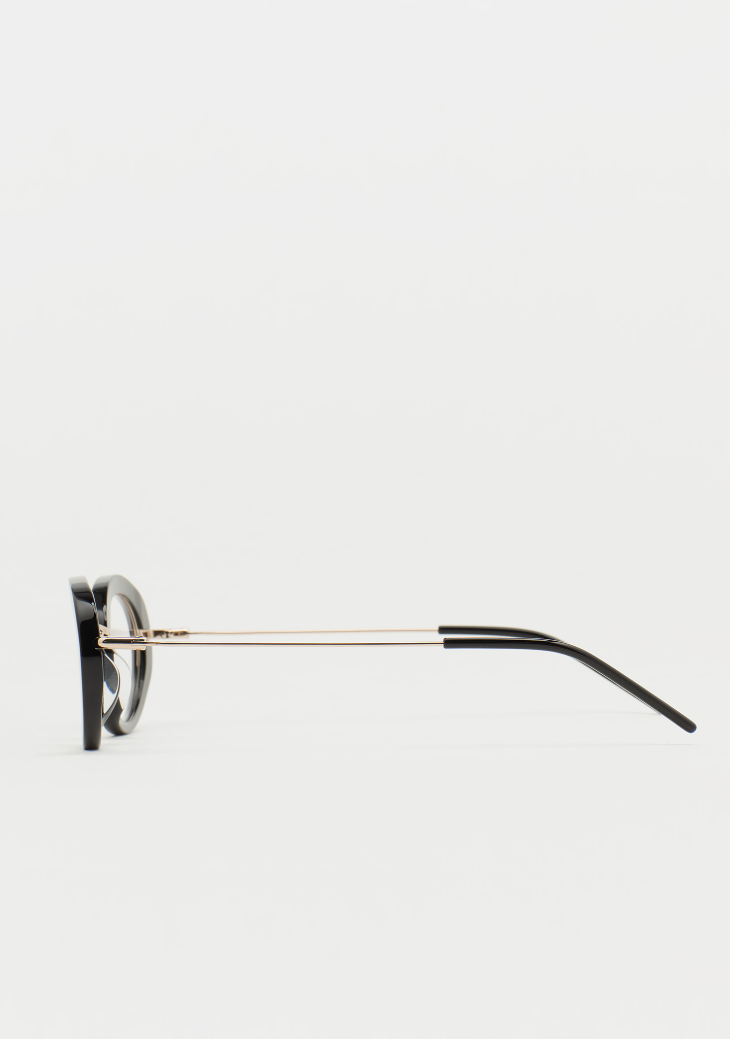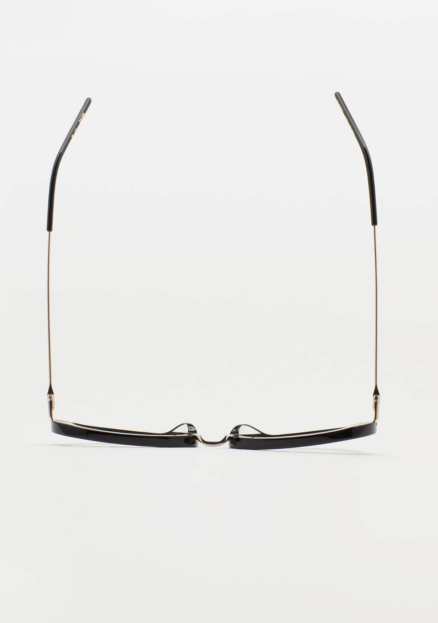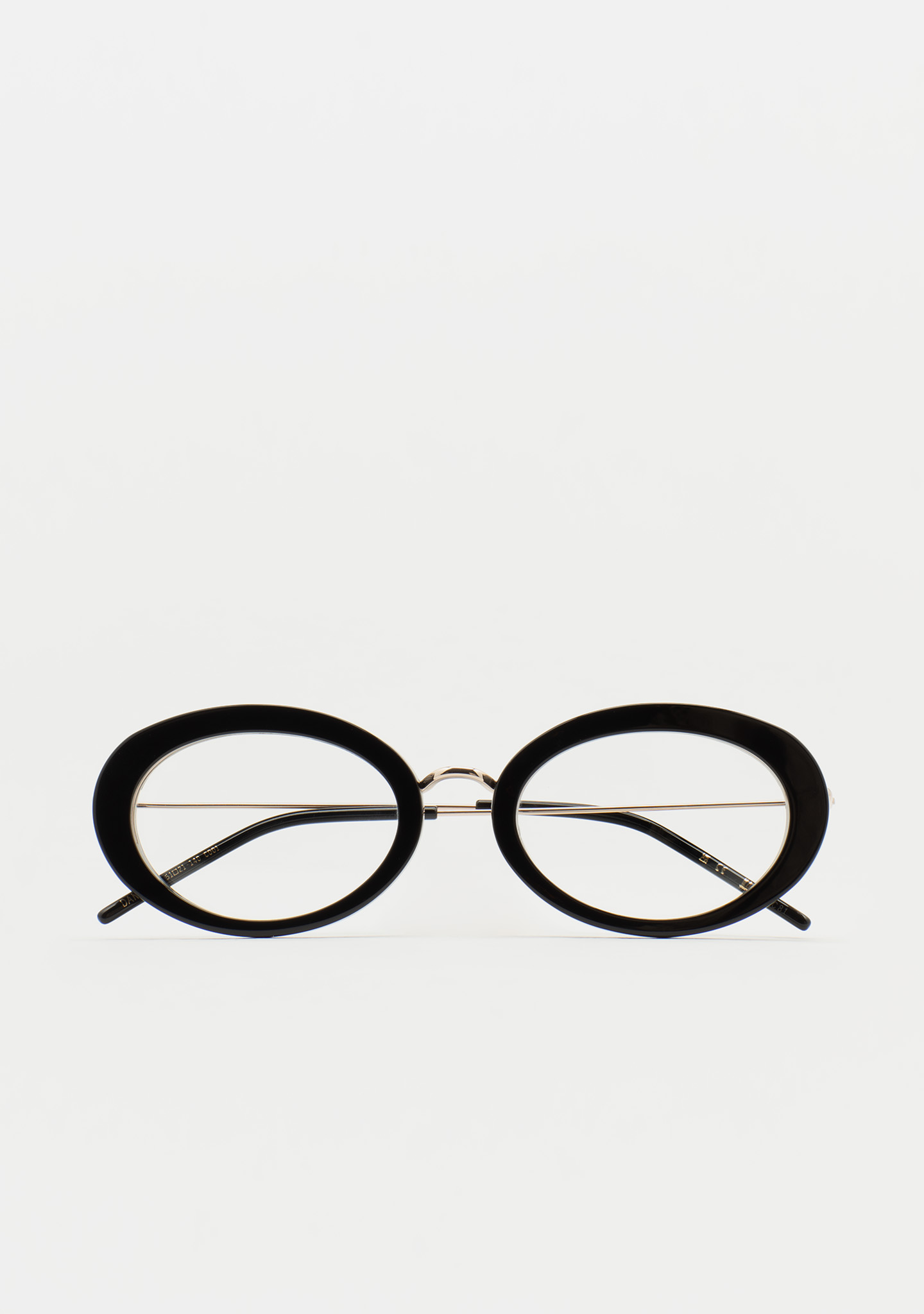 Lunettes de vue de forme ovale. Artisanales et contemporaines. Face en acétate noir. Structure et pont en acier inoxydable doré. Branches en acier inoxydable avec embouts en acétate noir. Plaquettes en acétate intégrées. Fabriquées à la main.