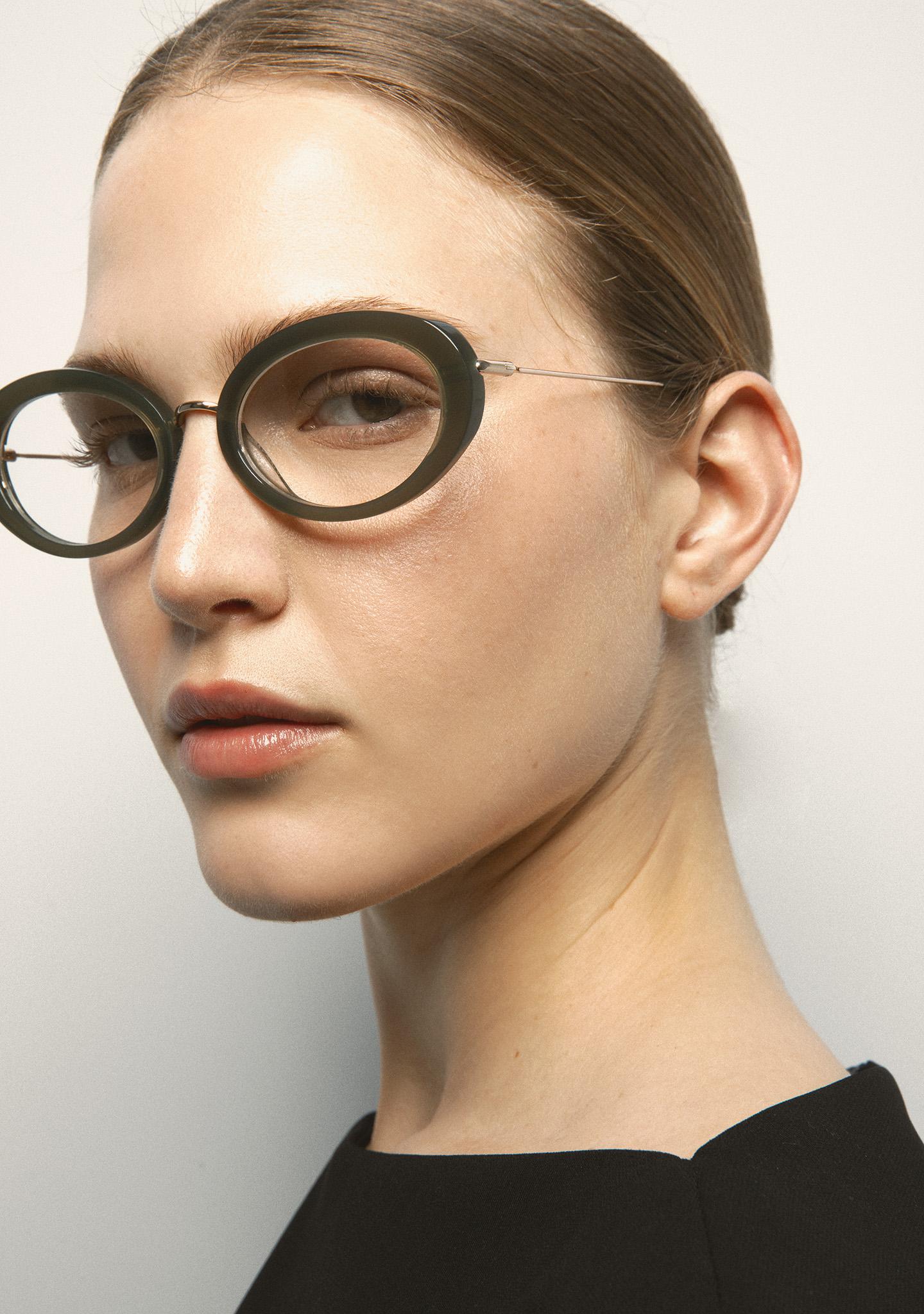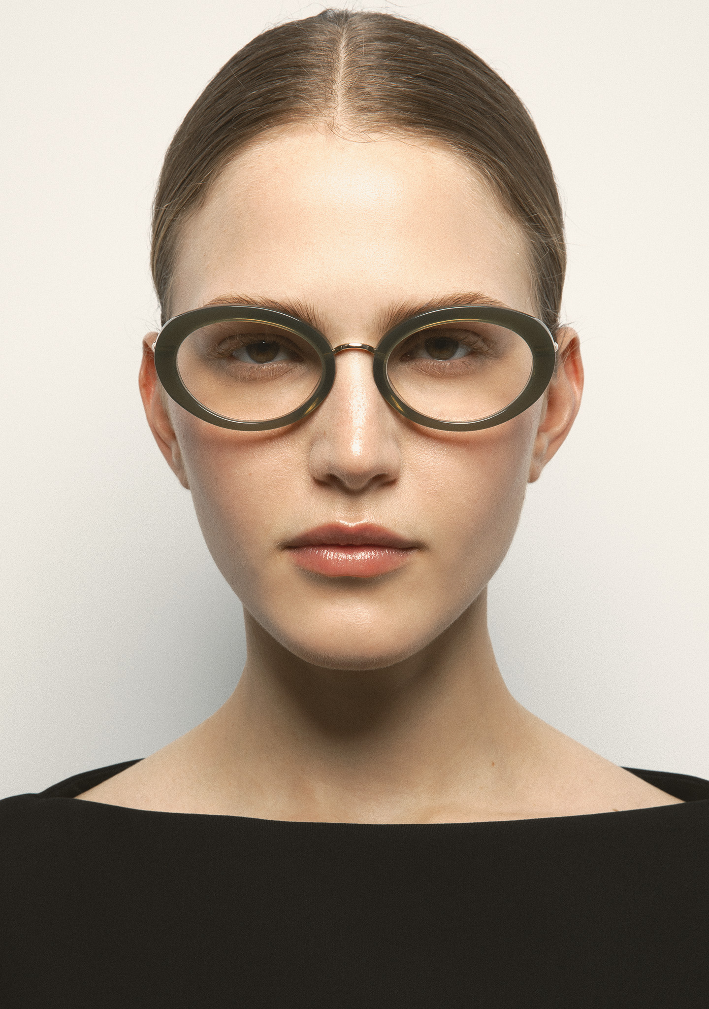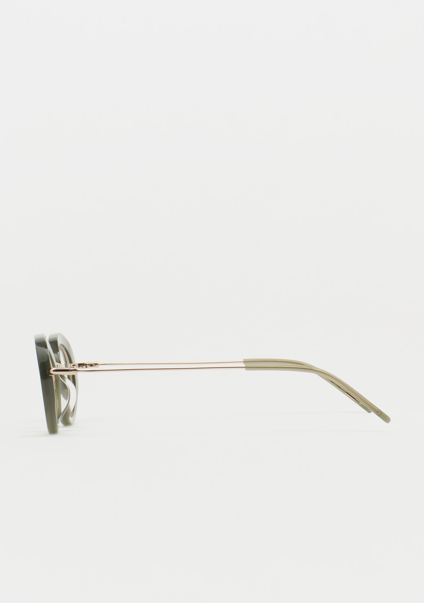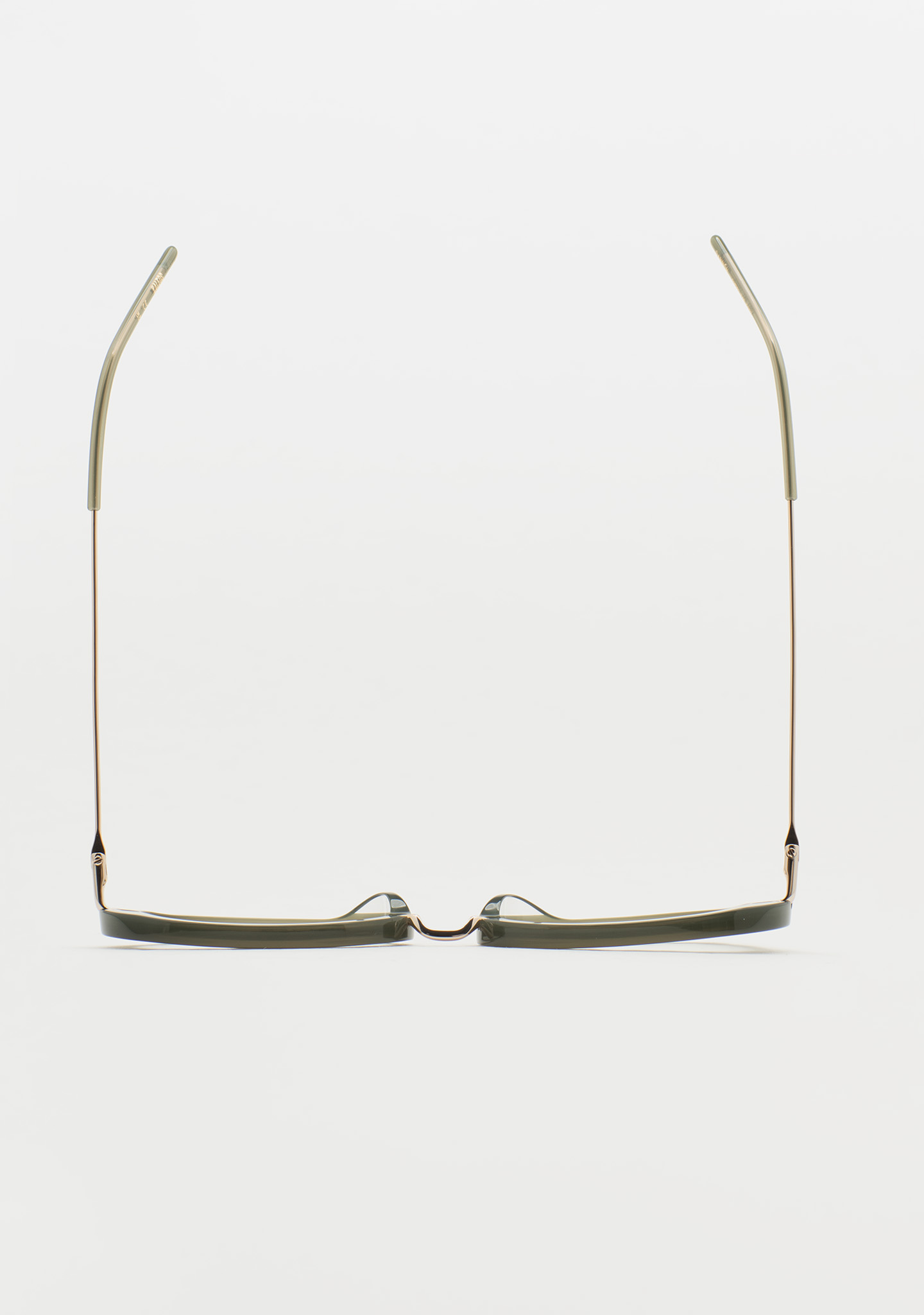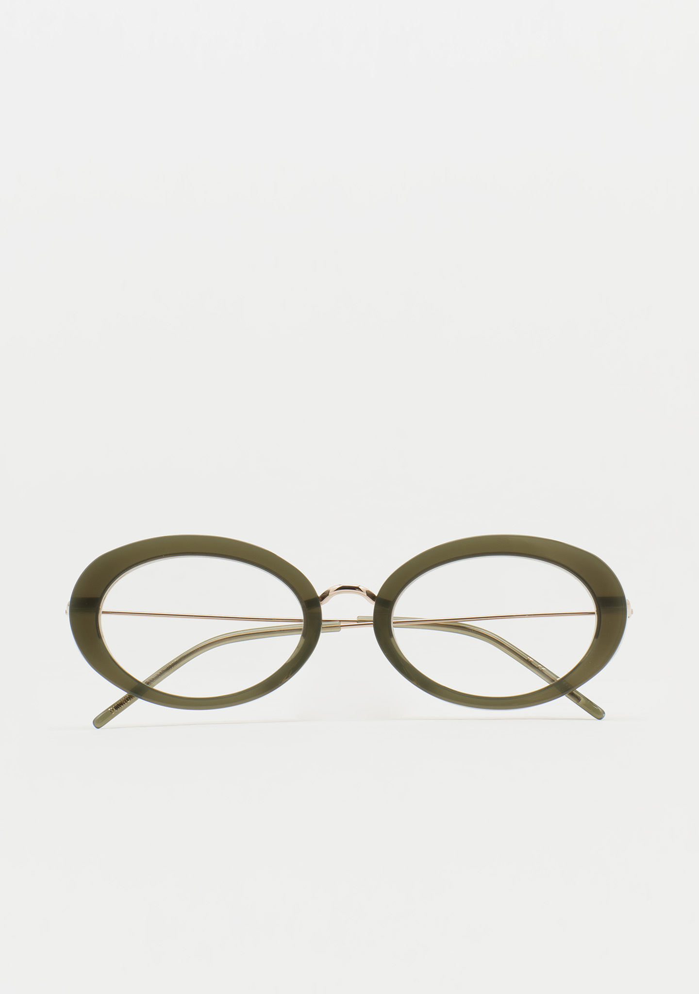 Lunettes de vue de forme ovale. Artisanales et contemporaines. Face en acétate vert translucide. Structure et pont en acier inoxydable doré. Branches en acier inoxydable avec embouts en acétate vert foncé translucide. Plaquettes en acétate intégrées. Fabriquées à la main.