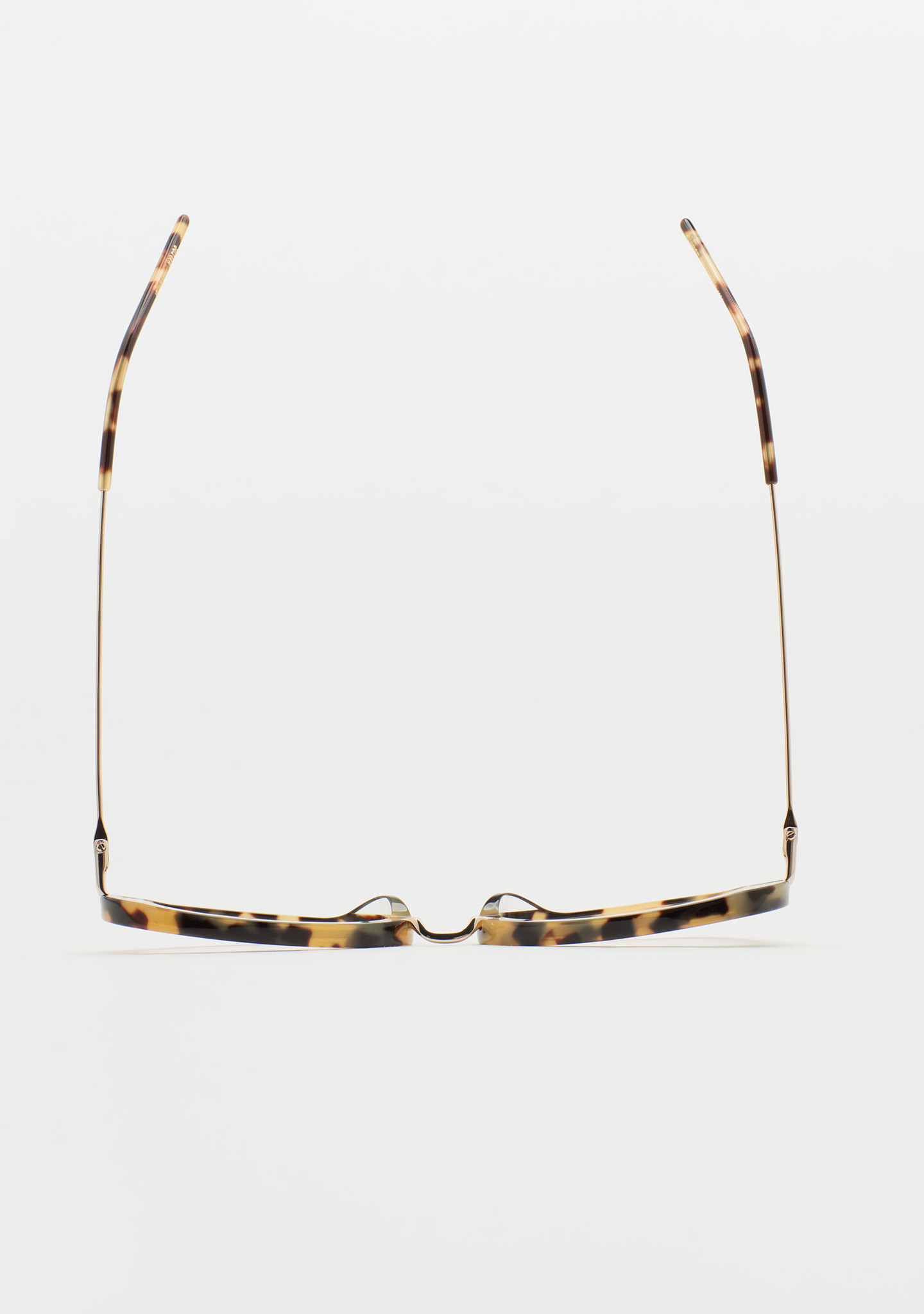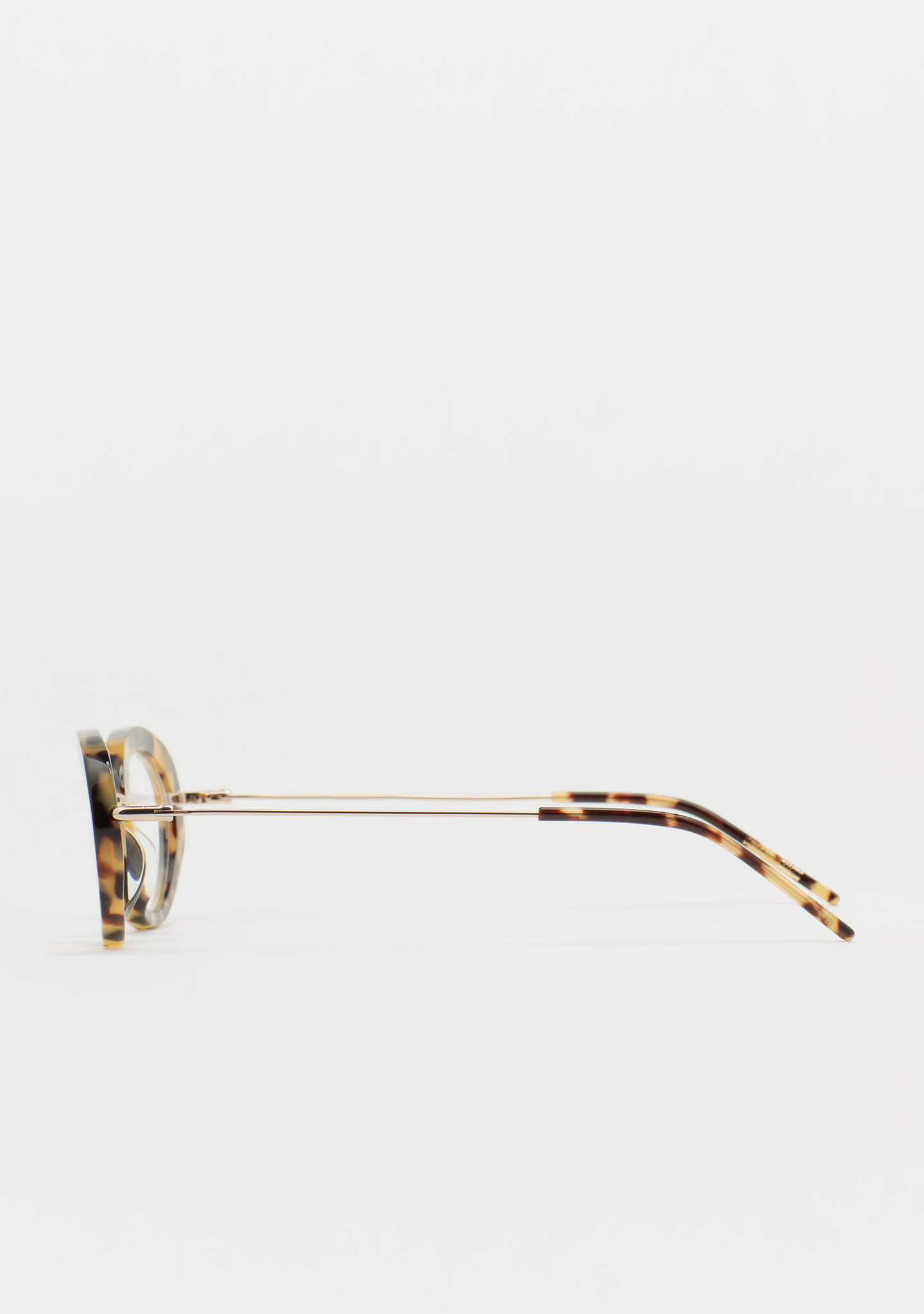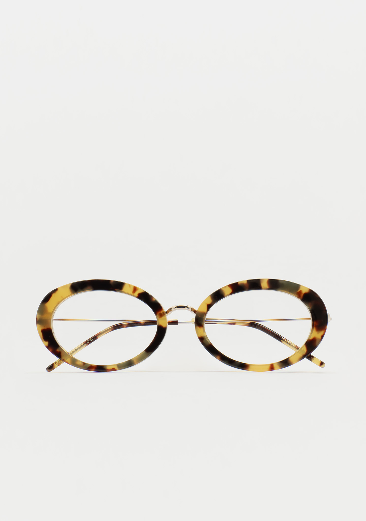 Lunettes de vue de forme ovale. Artisanales et contemporaines. Face en acétate havane marron. Structure et pont en acier inoxydable doré. Branches en acier inoxydable avec embouts en acétate havane marron. Plaquettes en acétate intégrées. Fabriquées à la main.