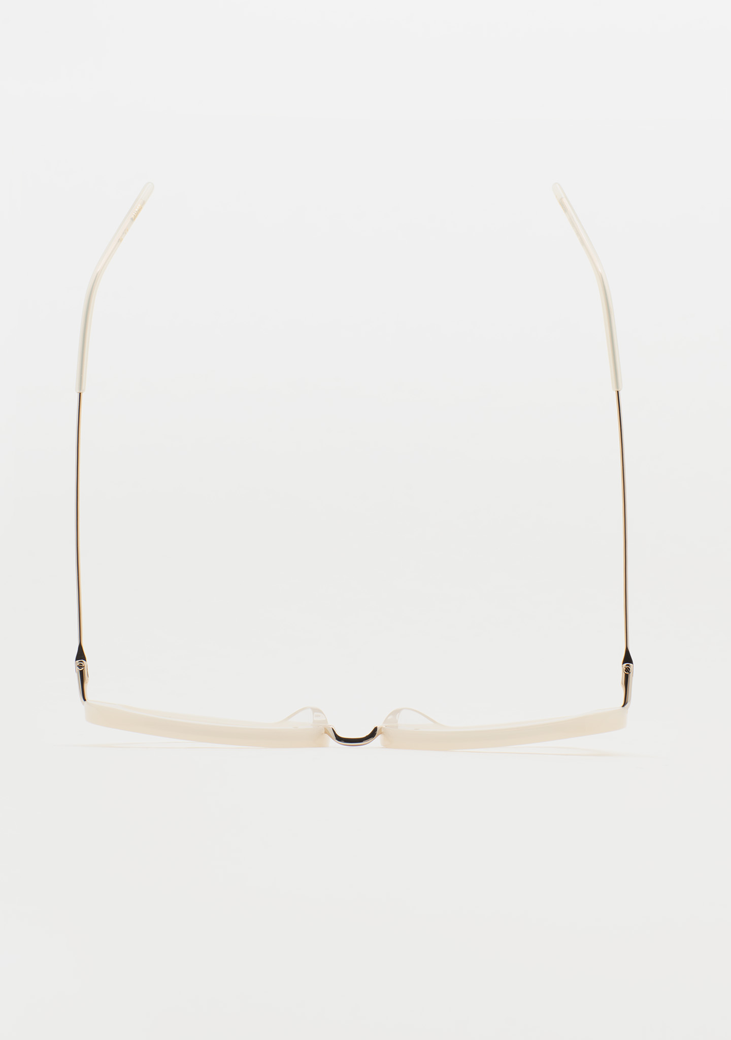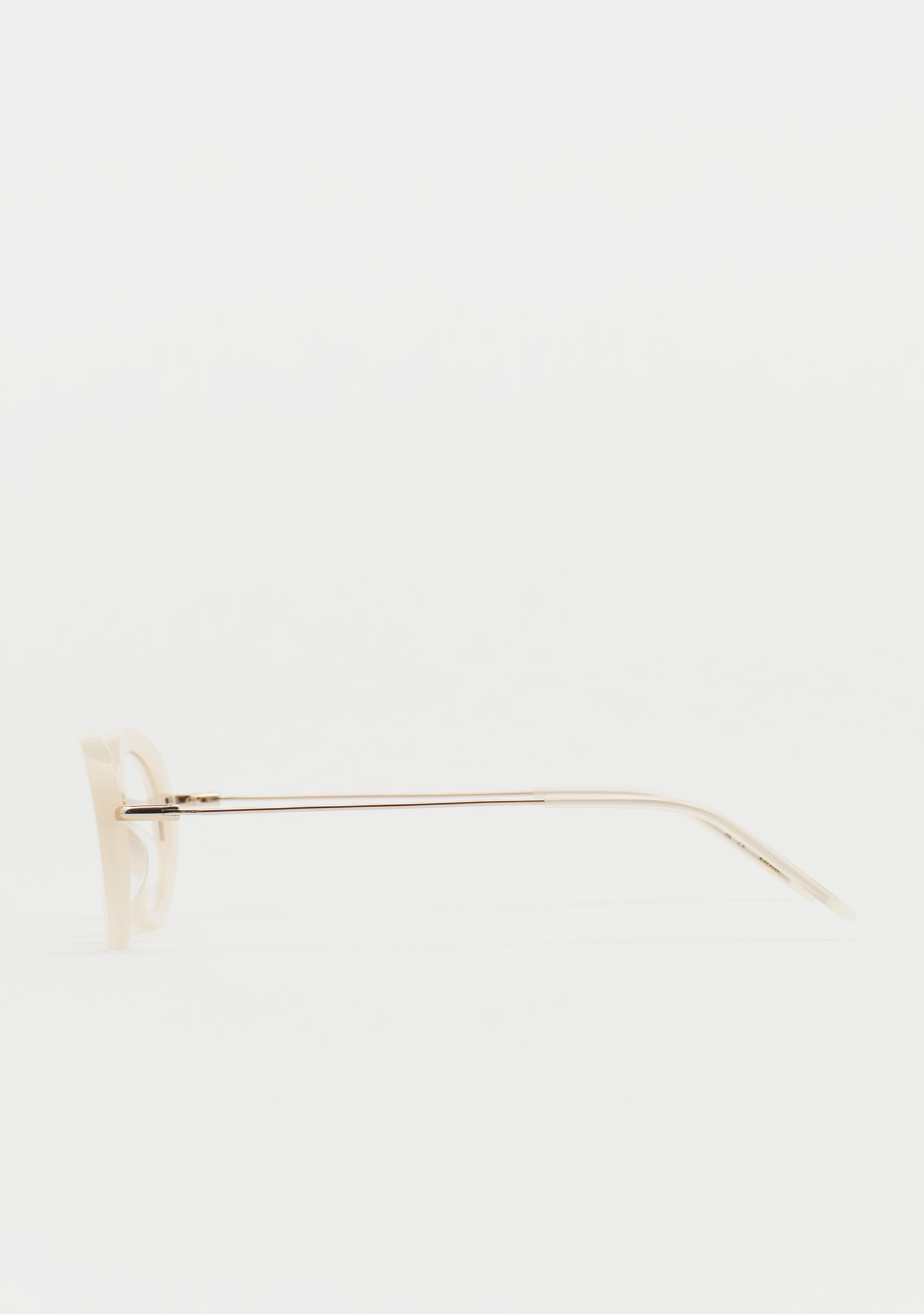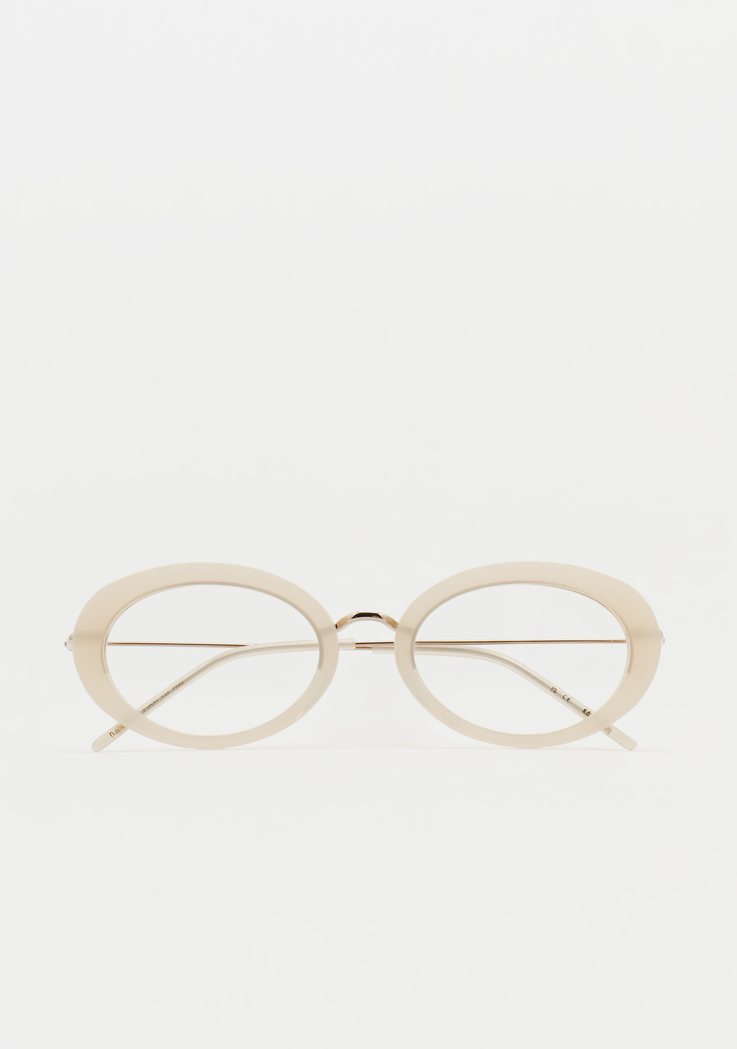 Lunettes de vue de forme ovale. Artisanales et contemporaines. Face en acétate beige clair translucide. Structure et pont en acier inoxydable doré. Branches en acier inoxydable avec embouts en acétate beige translucide. Plaquettes en acétate intégrées. Fabriquées à la main.