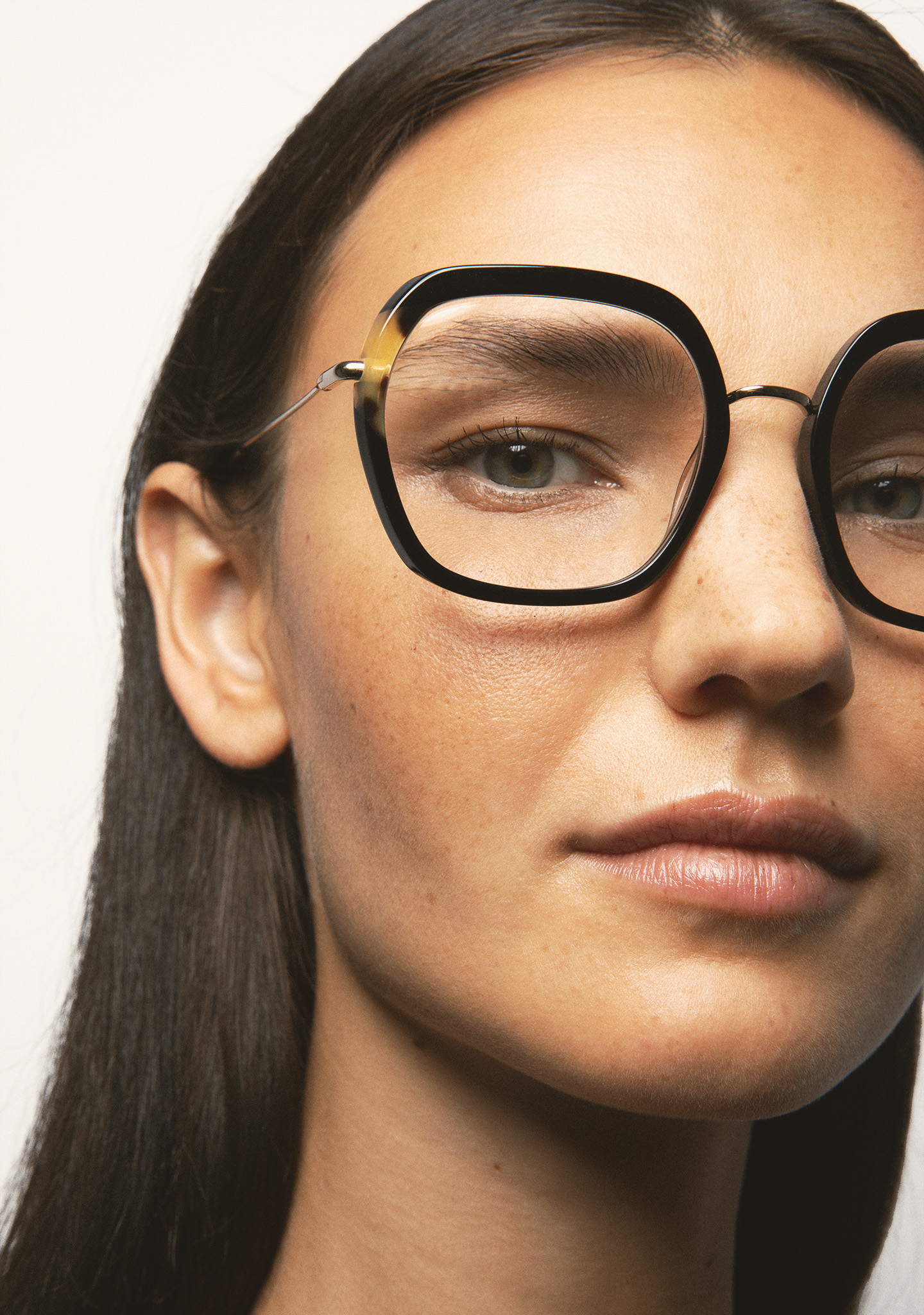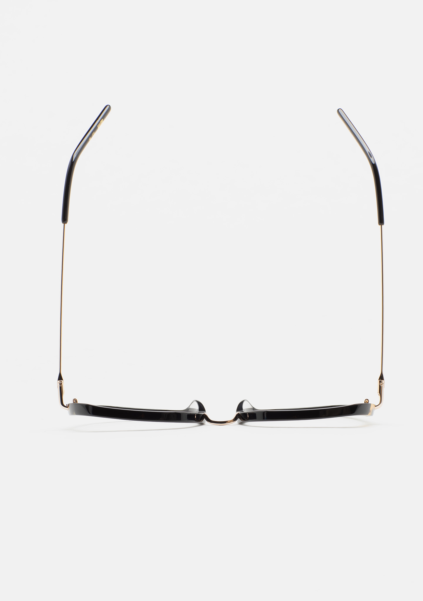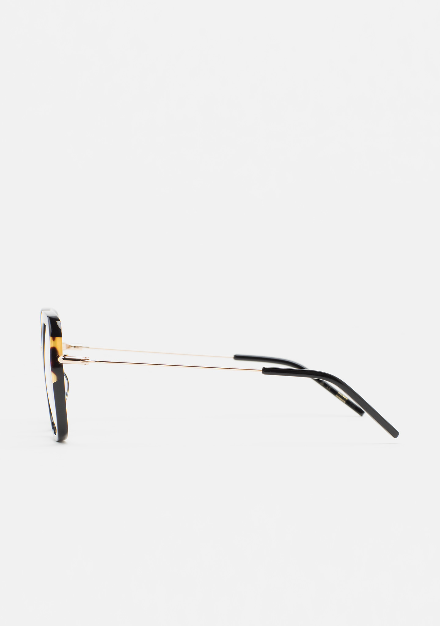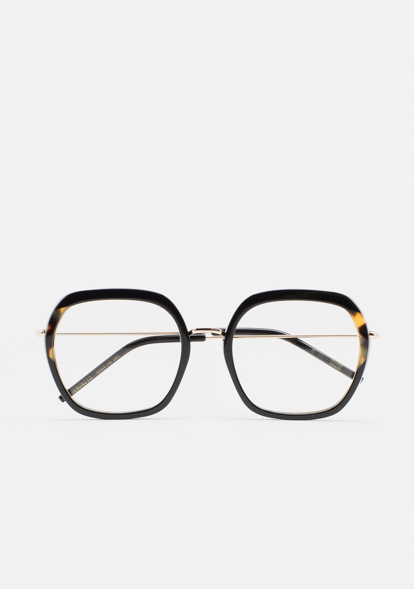Lunettes de vue de forme carrée. Monture en acétate noir avec laminage havane marron. Structure et pont en acier inoxydable doré. Branches en acier inoxydable avec embouts en acétate noir. Plaquettes en acétate intégrées. Fait main.