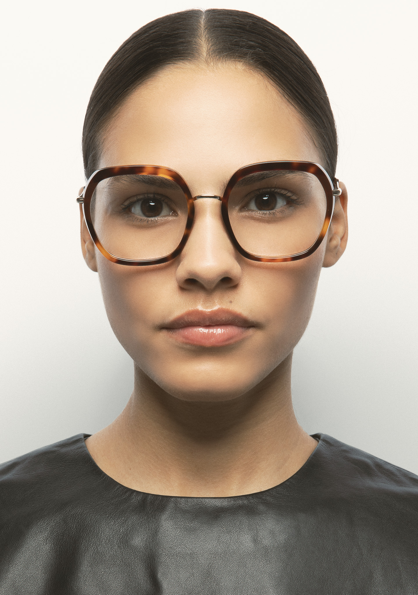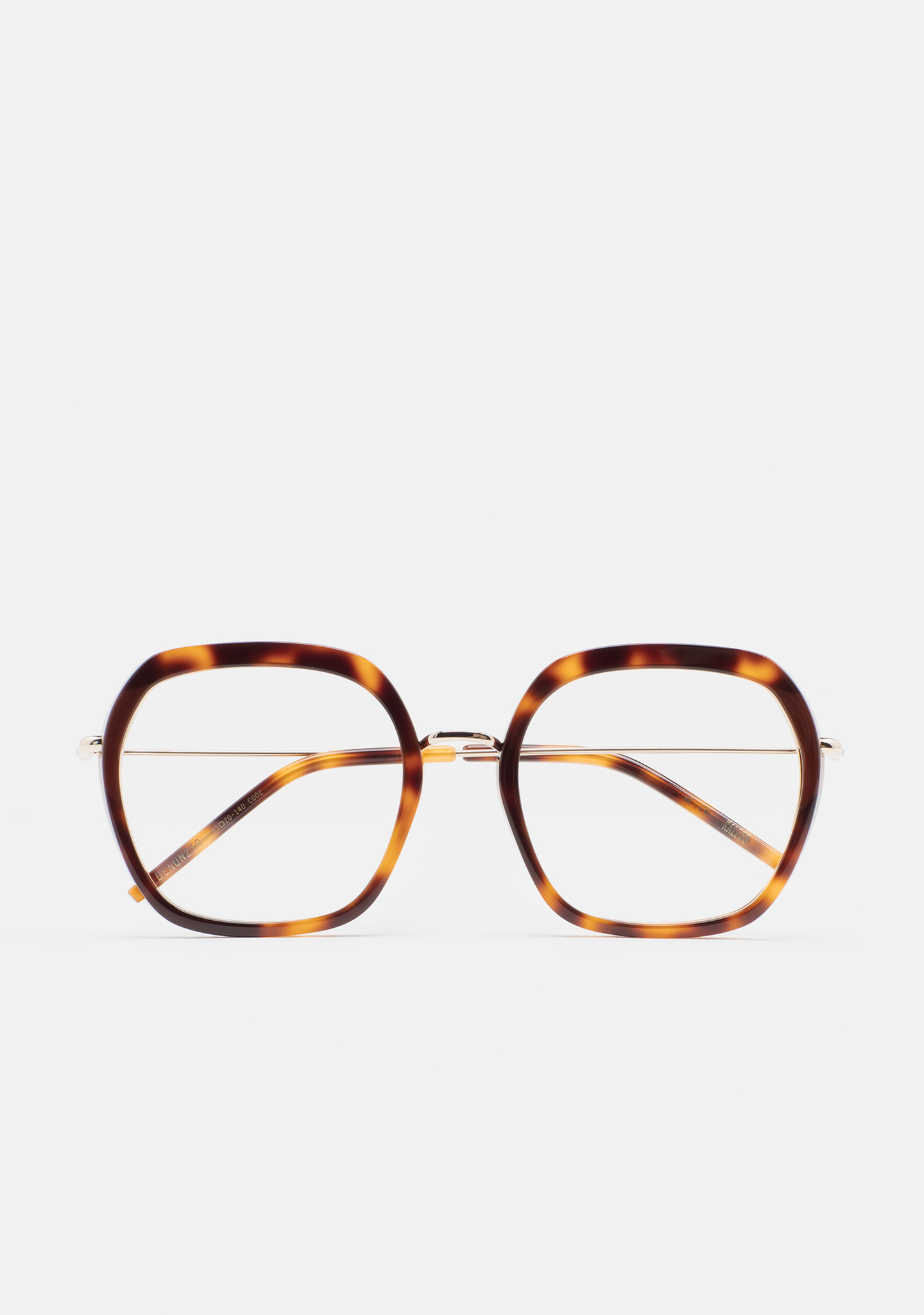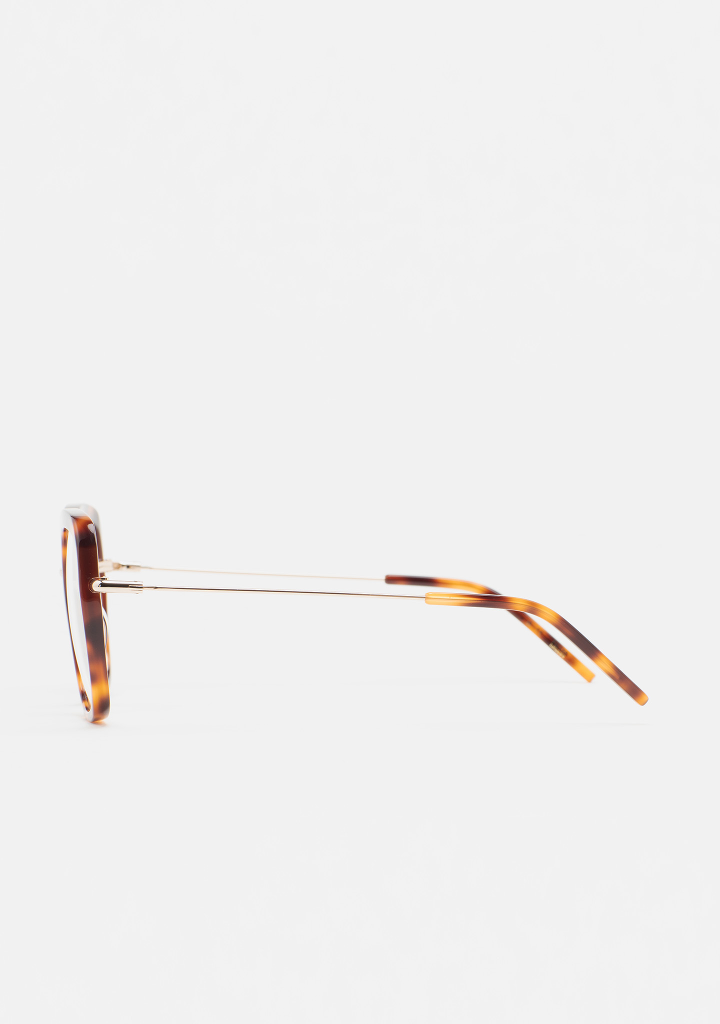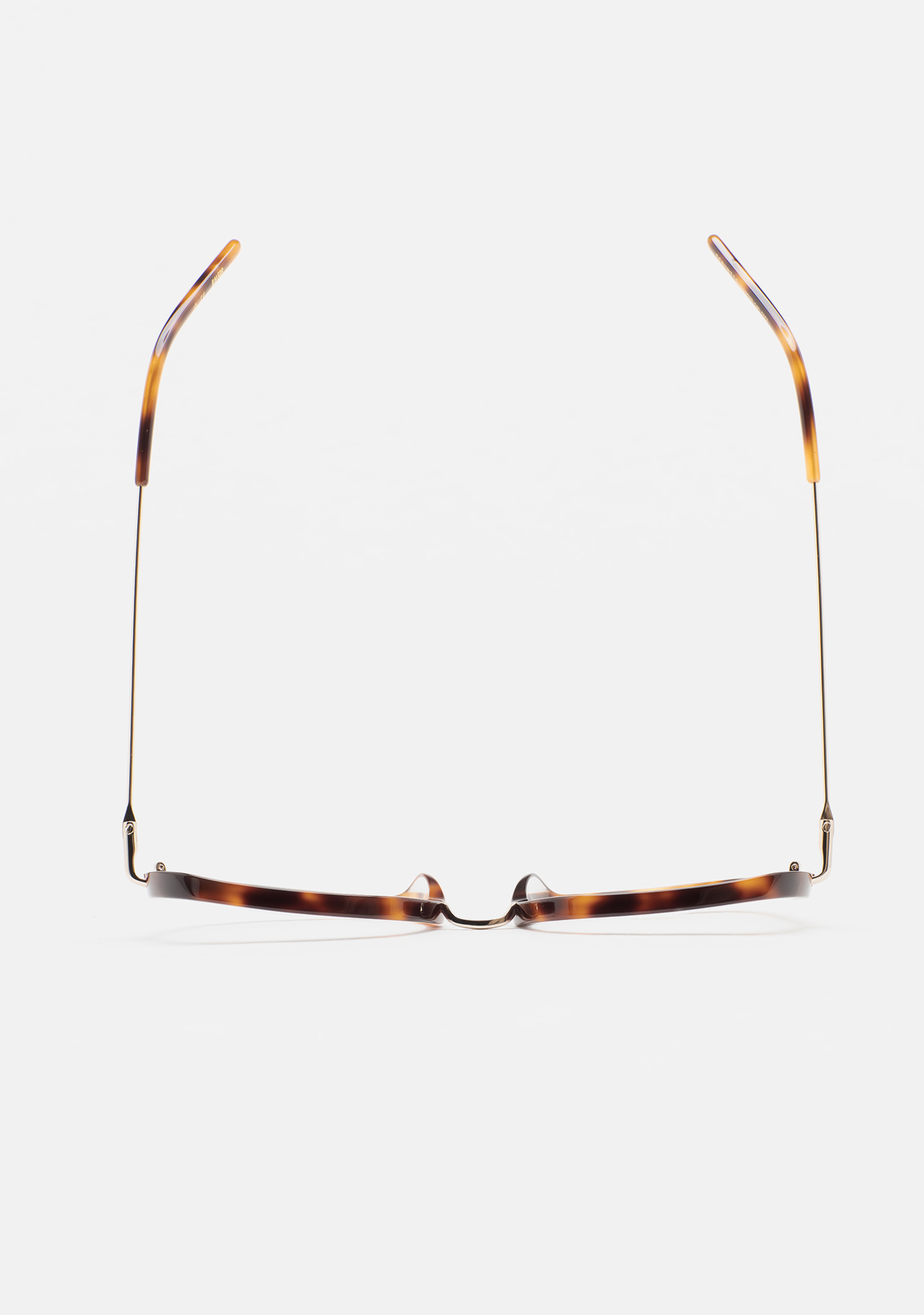 Lunettes de vue de forme carrée. Monture en acétate havane marron avec laminage marron translucide. Structure et pont en acier inoxydable doré. Branches en acier inoxydable avec embouts en acétate havane marron. Plaquettes en acétate intégrées. Fait main.