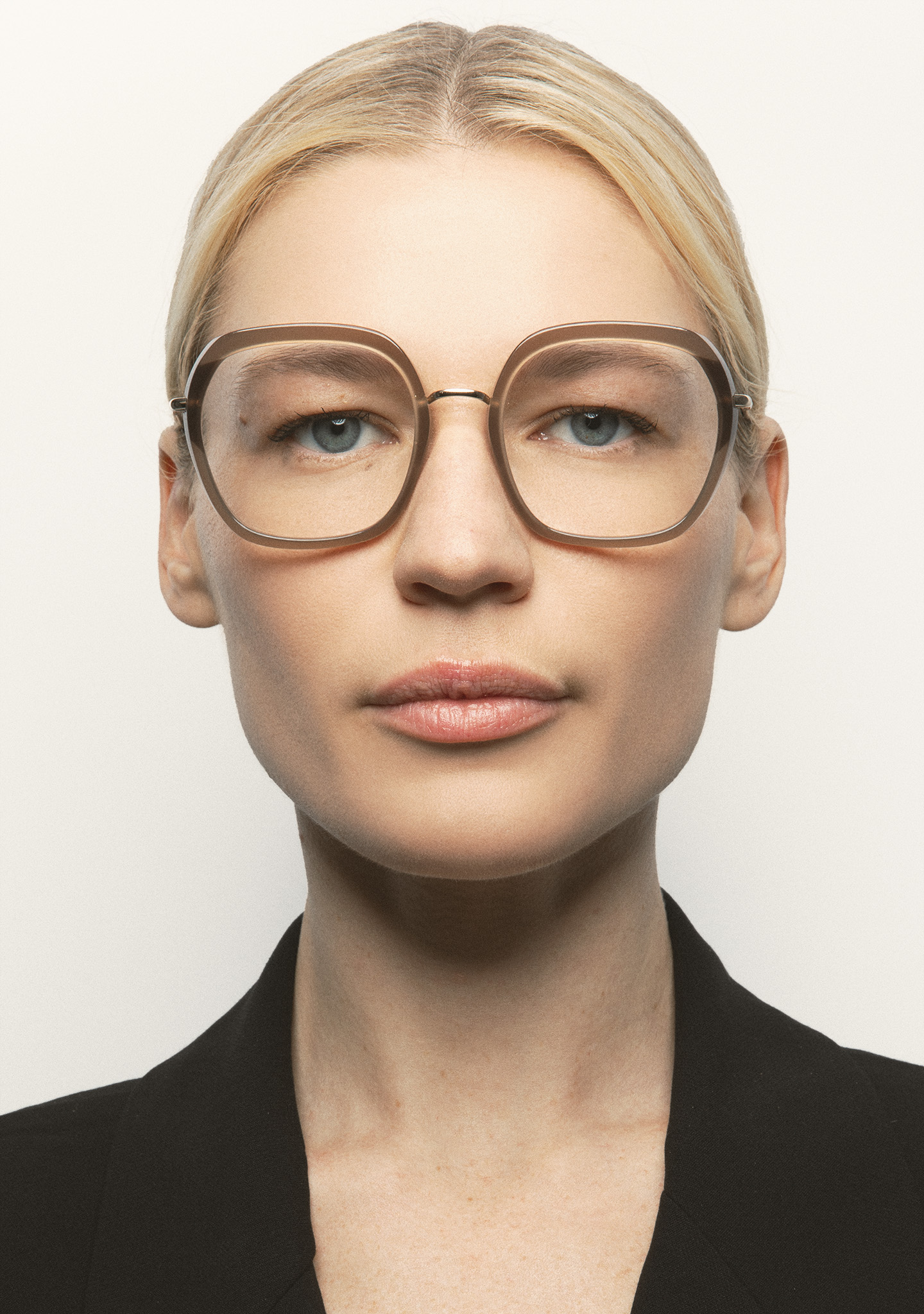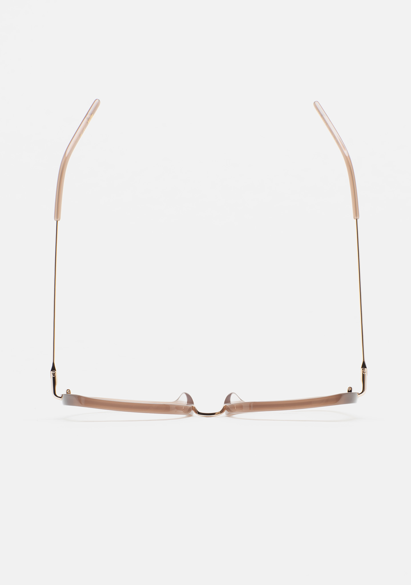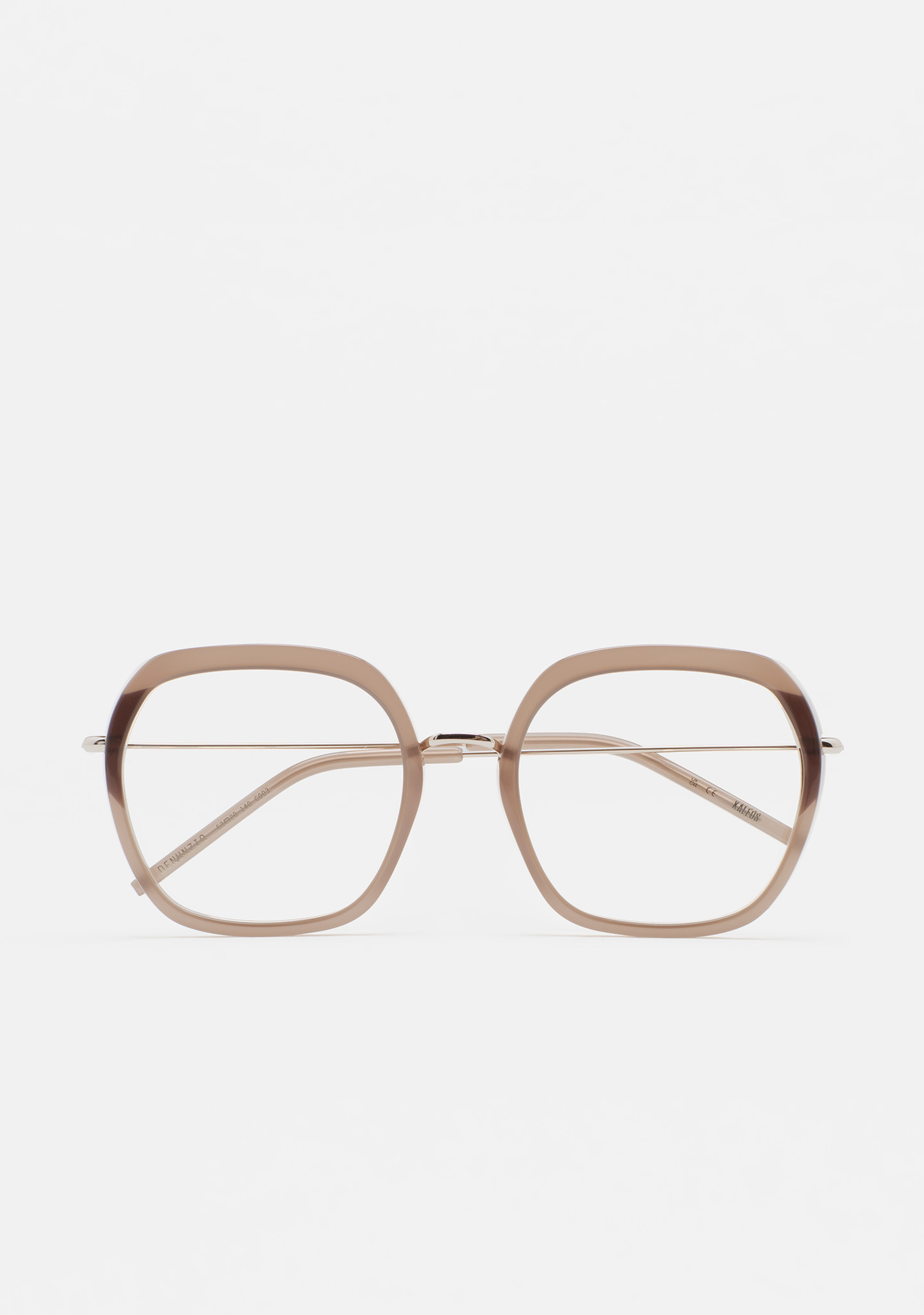 Lunettes de vue de forme carrée. Monture en acétate marron clair transparent avec laminage marron translucide. Structure et pont en acier inoxydable doré. Branches en acier inoxydable avec embouts en acétate marron clair transparent. Plaquettes en acétate intégrées. Fait main.