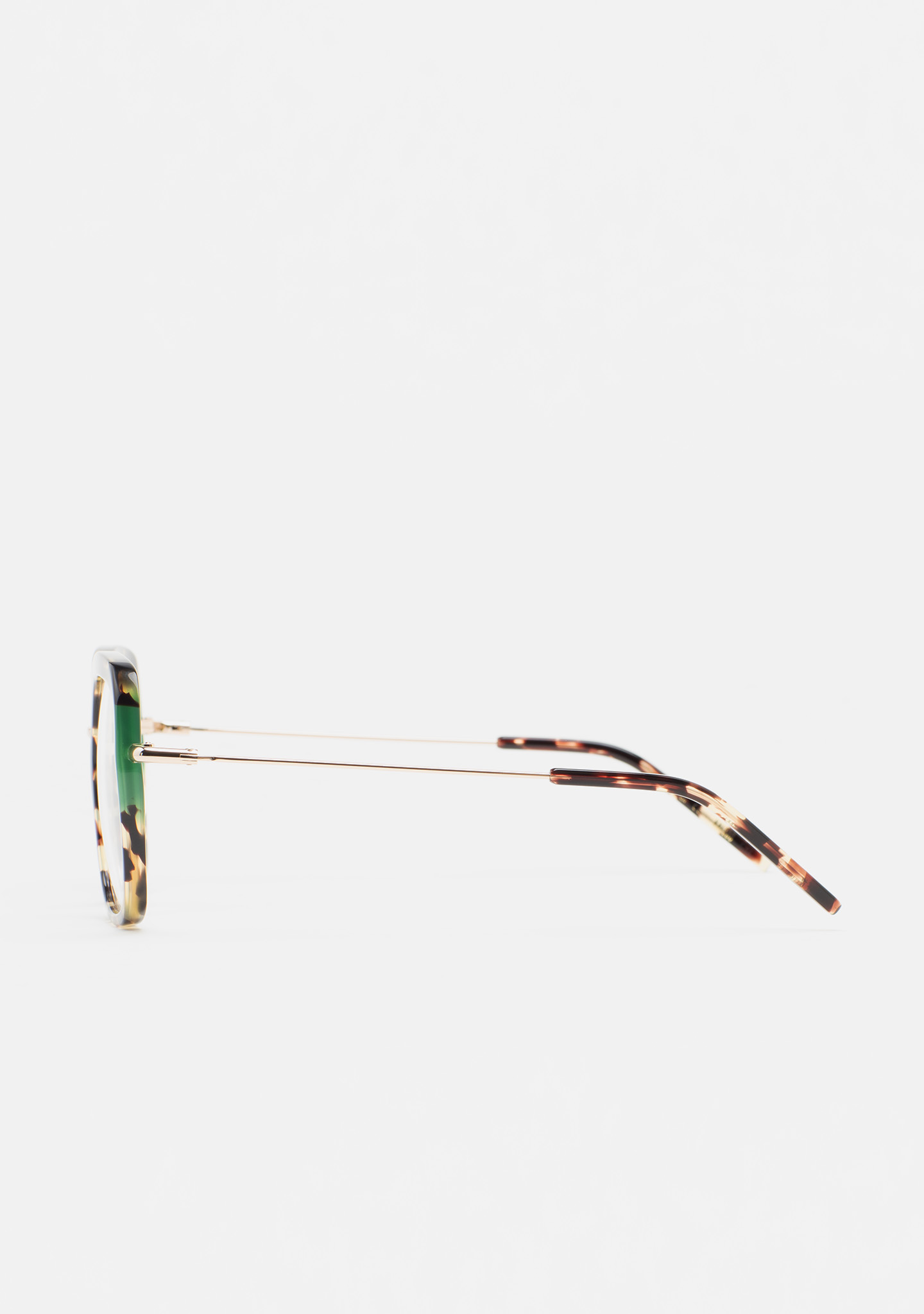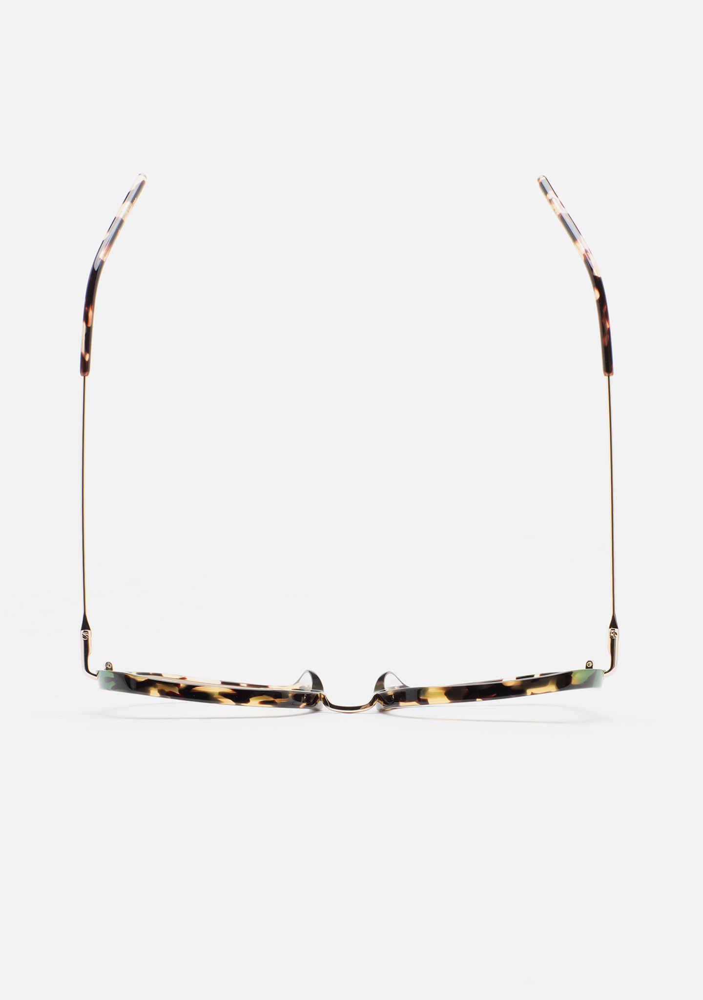 Lunettes de vue de forme carrée. Monture en acétate havane marron avec laminage vert translucide. Structure et pont en acier inoxydable doré. Branches en acier inoxydable avec embouts en acétate havane marron. Plaquettes en acétate intégrées. Fait main.