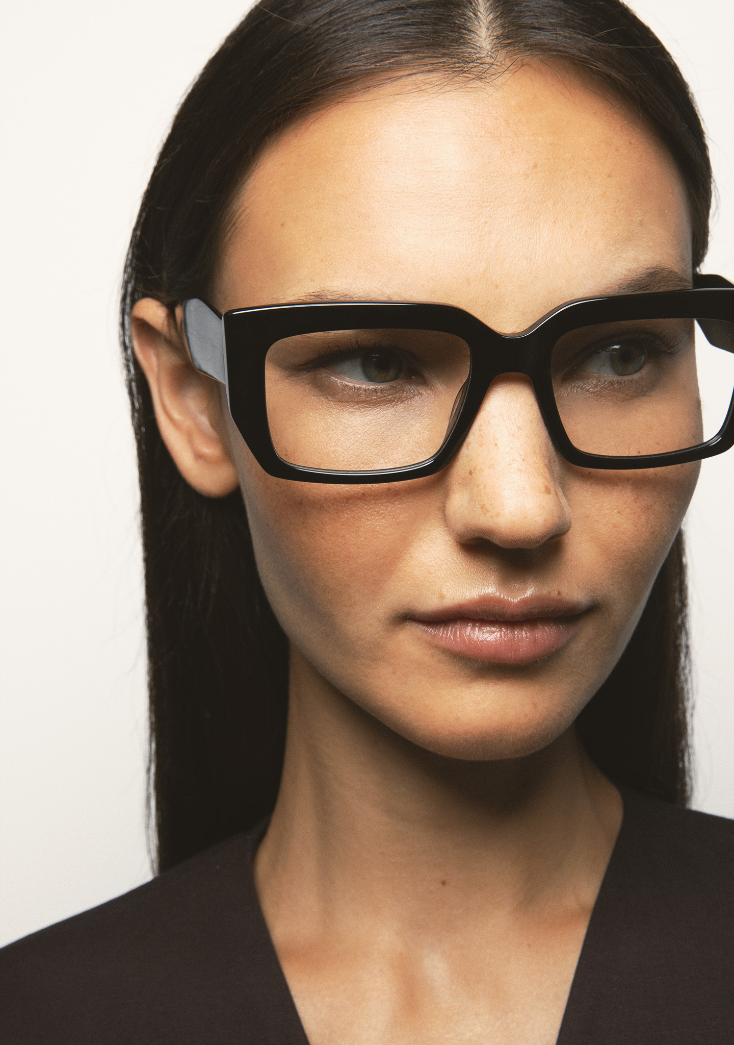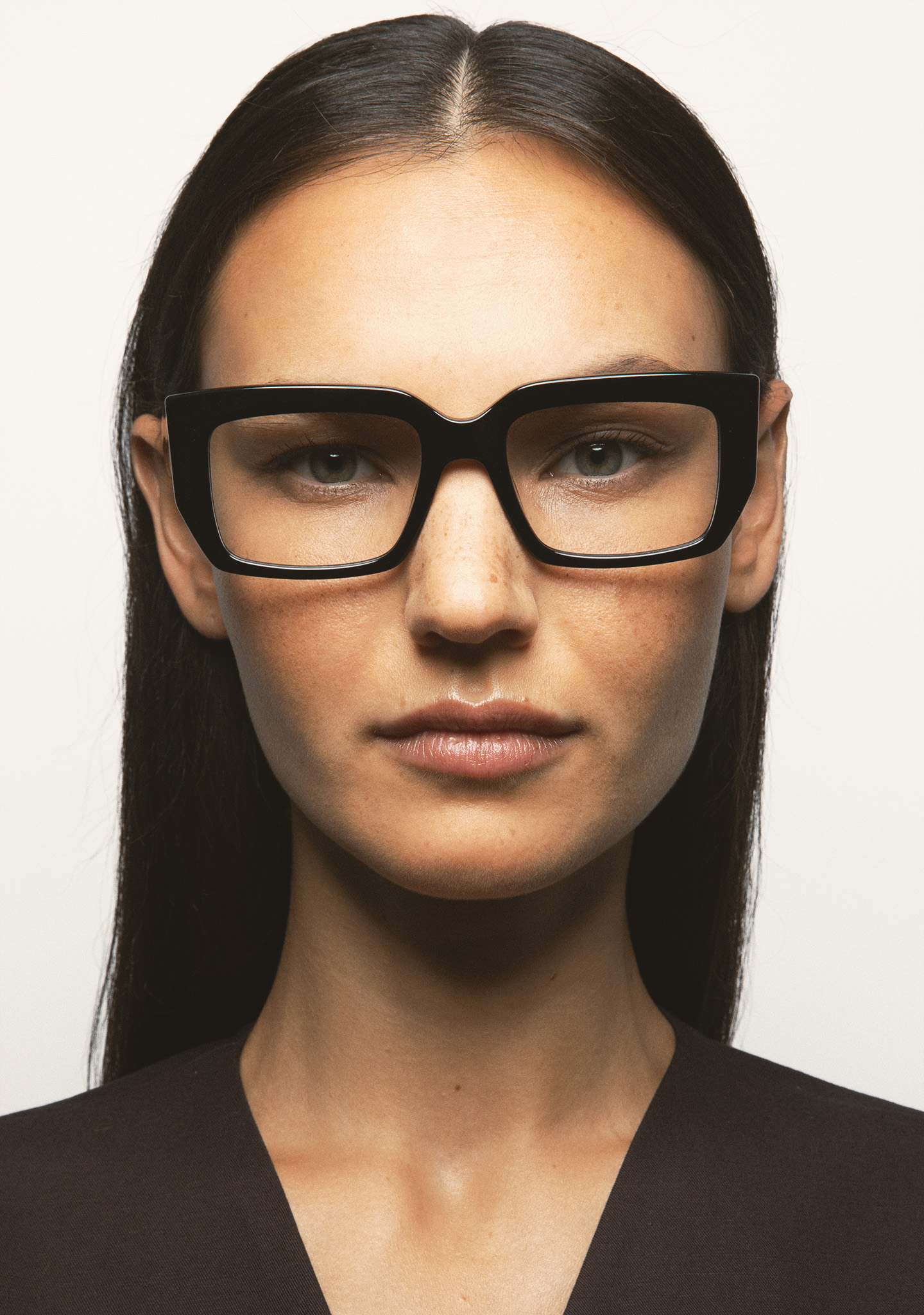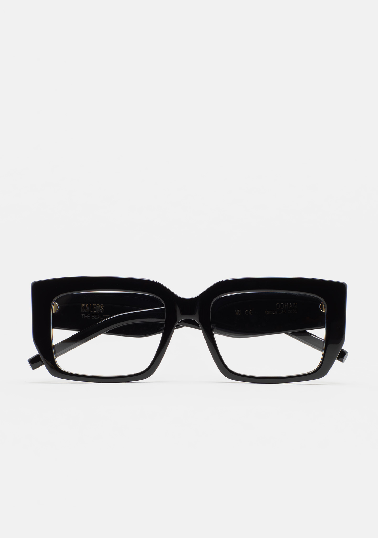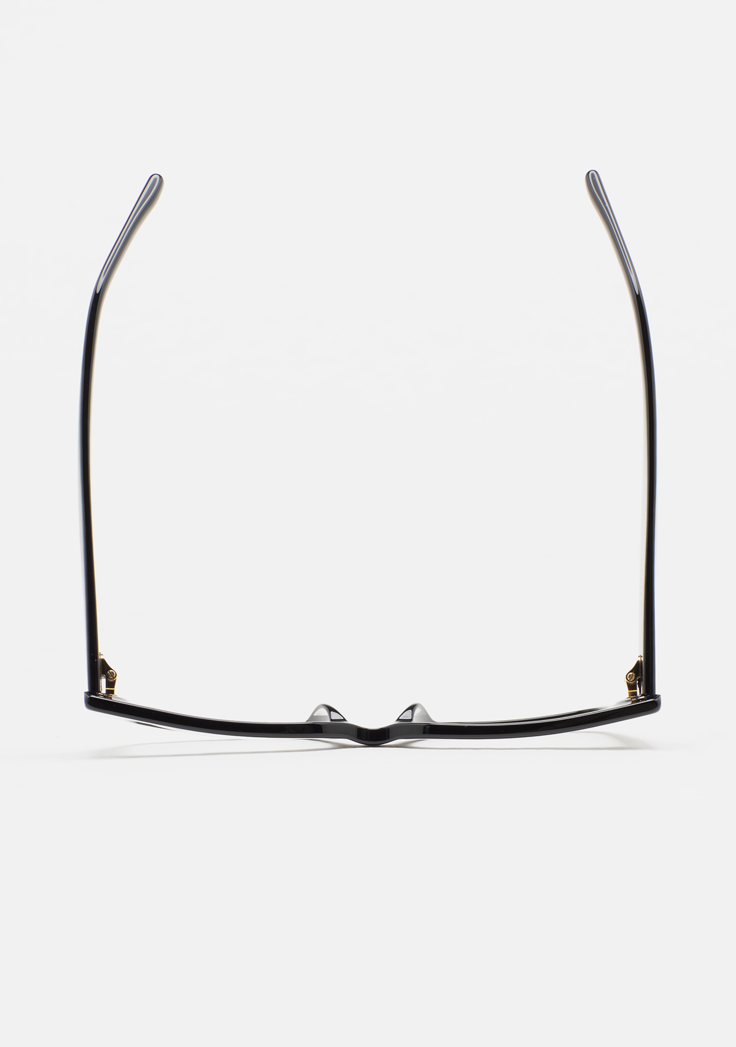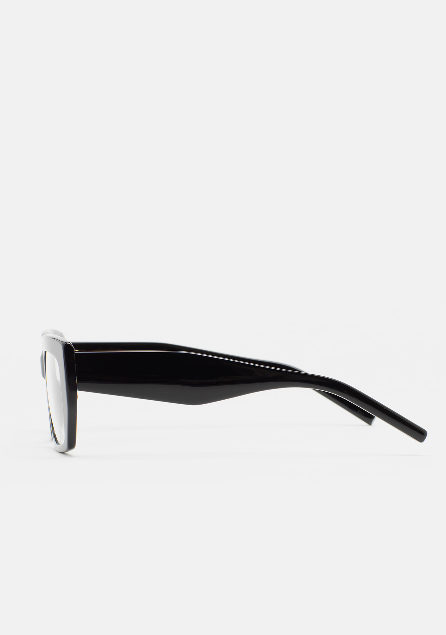 Lunettes de vue de forme rectangulaire. Monture et branches en acétate noir. Plaquettes en acétate intégrées. Fait main.