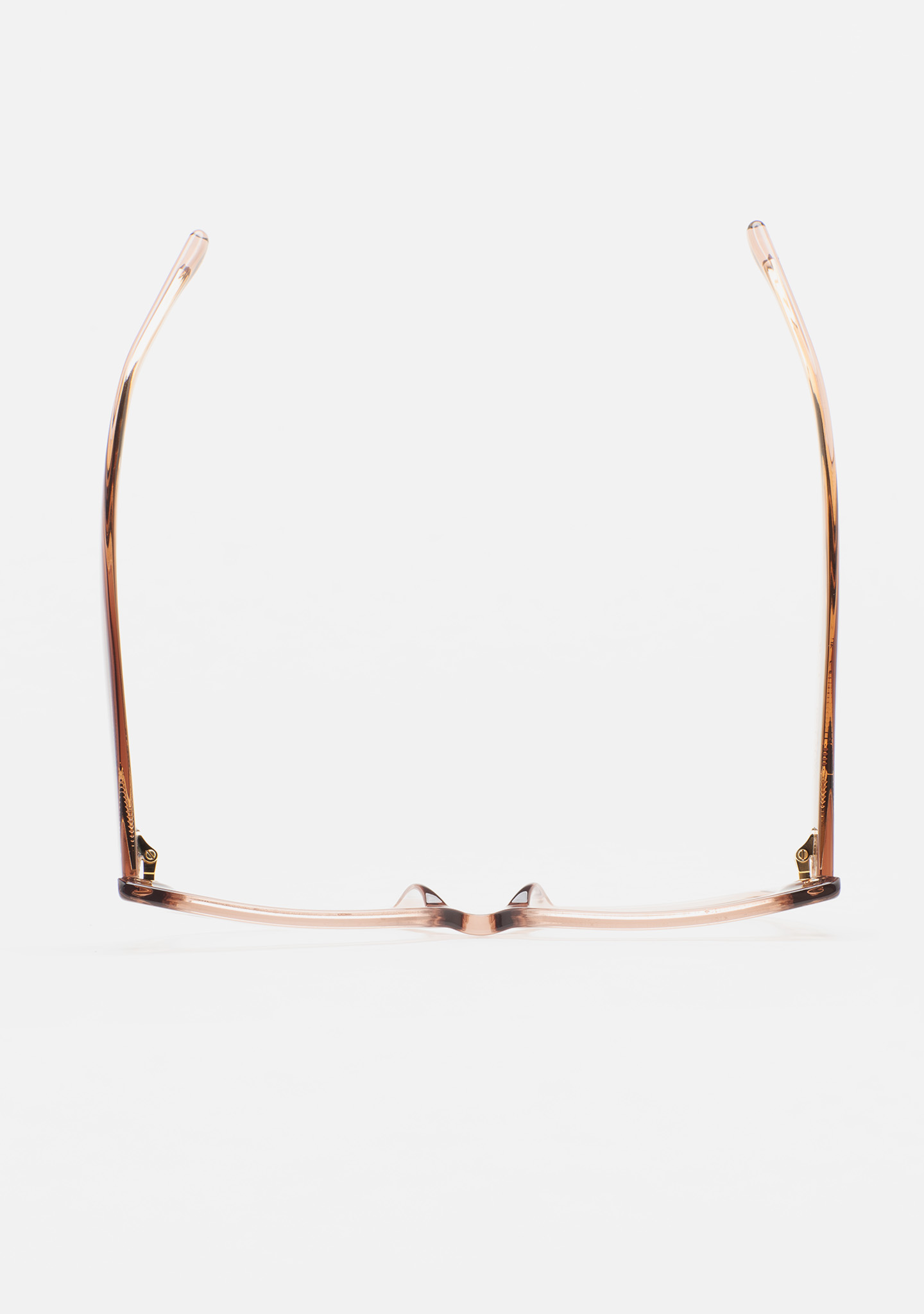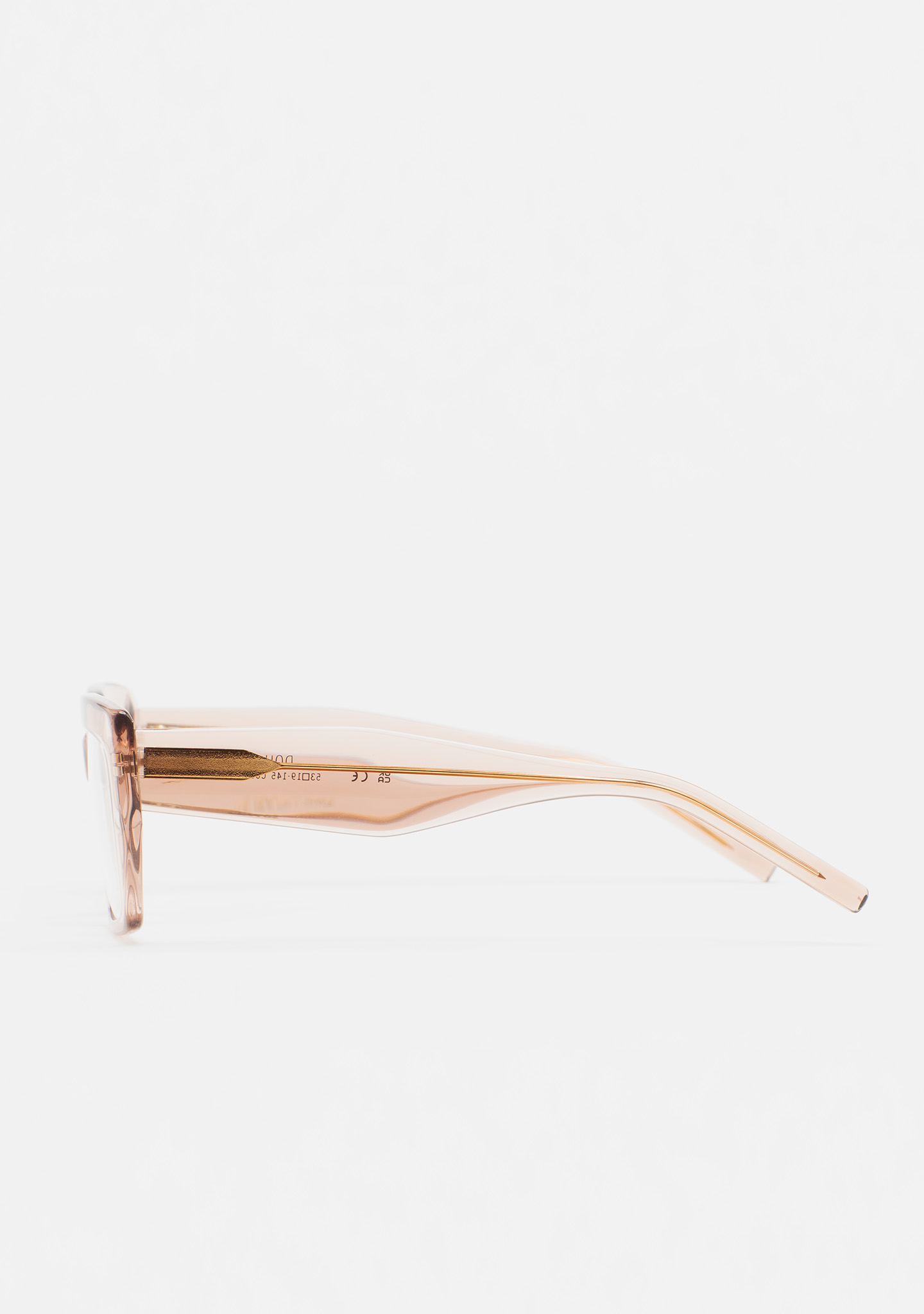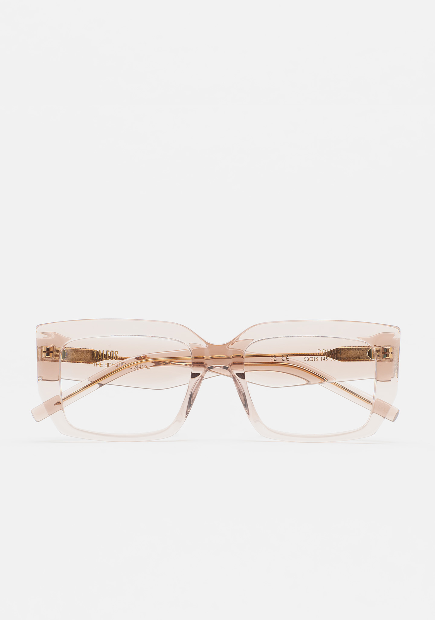 Lunettes de vue de forme rectangulaire. Monture et branches en acétate rose clair transparent. Plaquettes en acétate intégrées. Fait main.