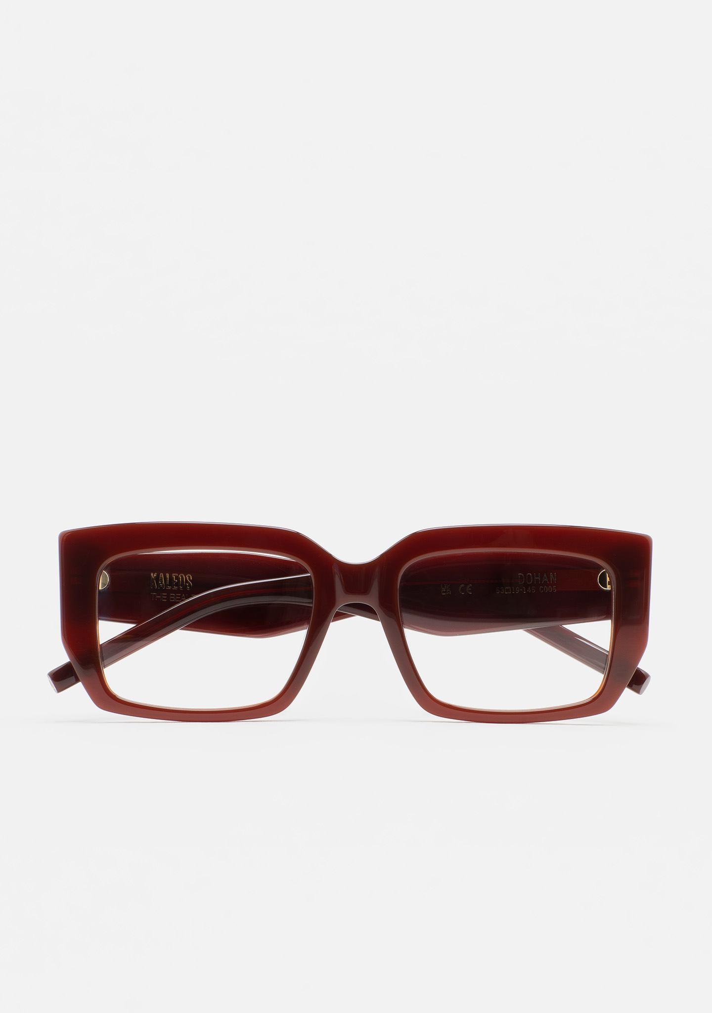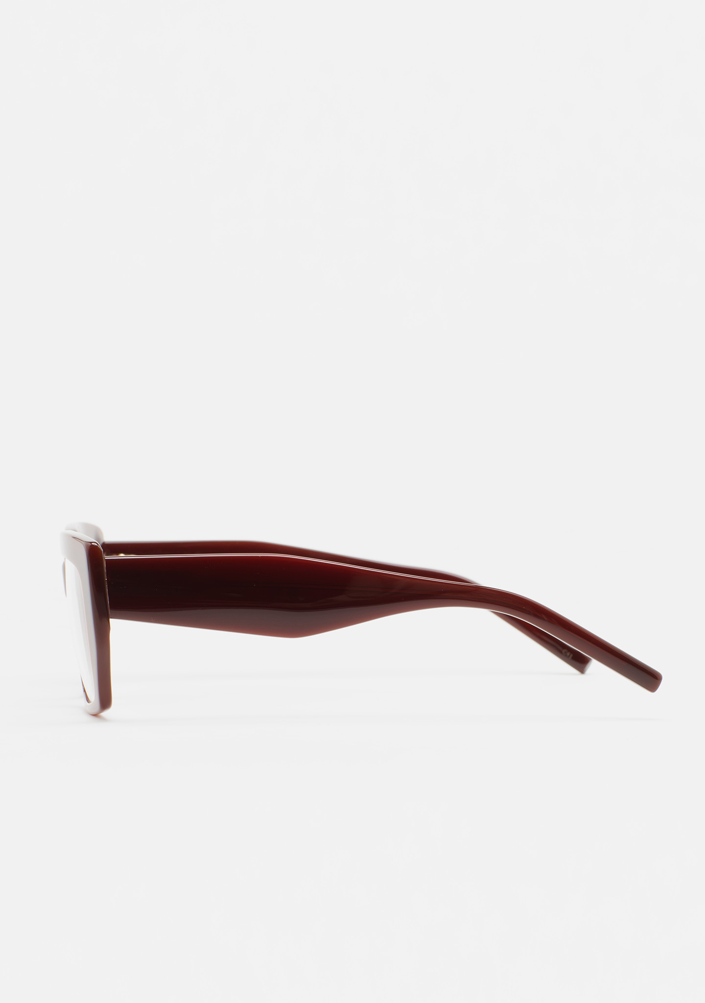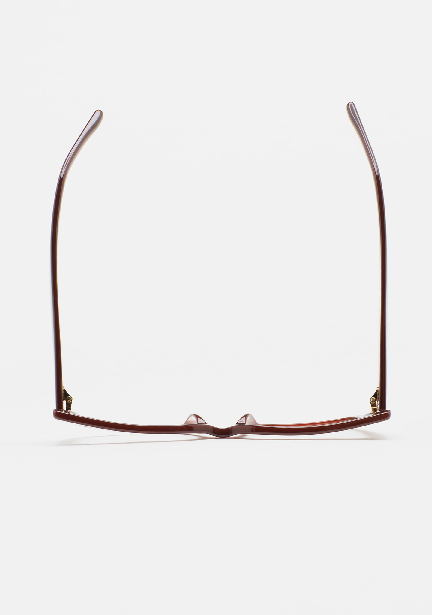 Lunettes de vue de forme rectangulaire. Monture et branches en acétate bordeaux translucide. Plaquettes en acétate intégrées. Fait main.