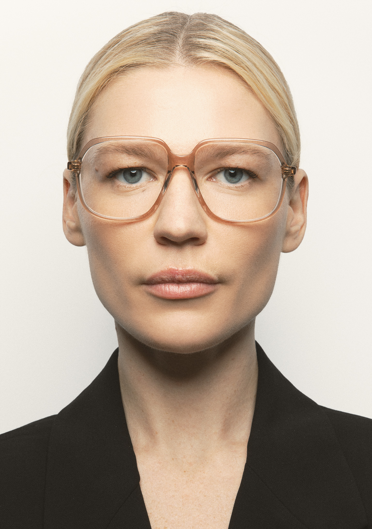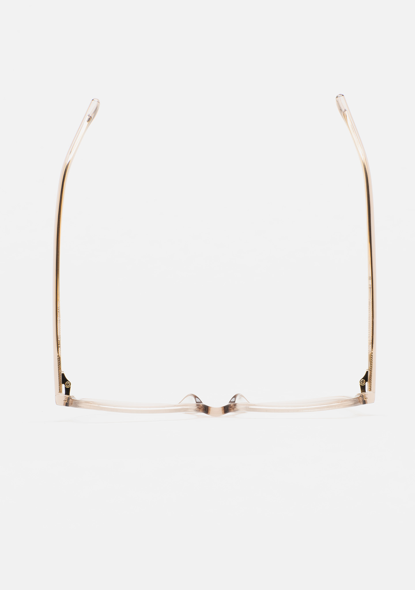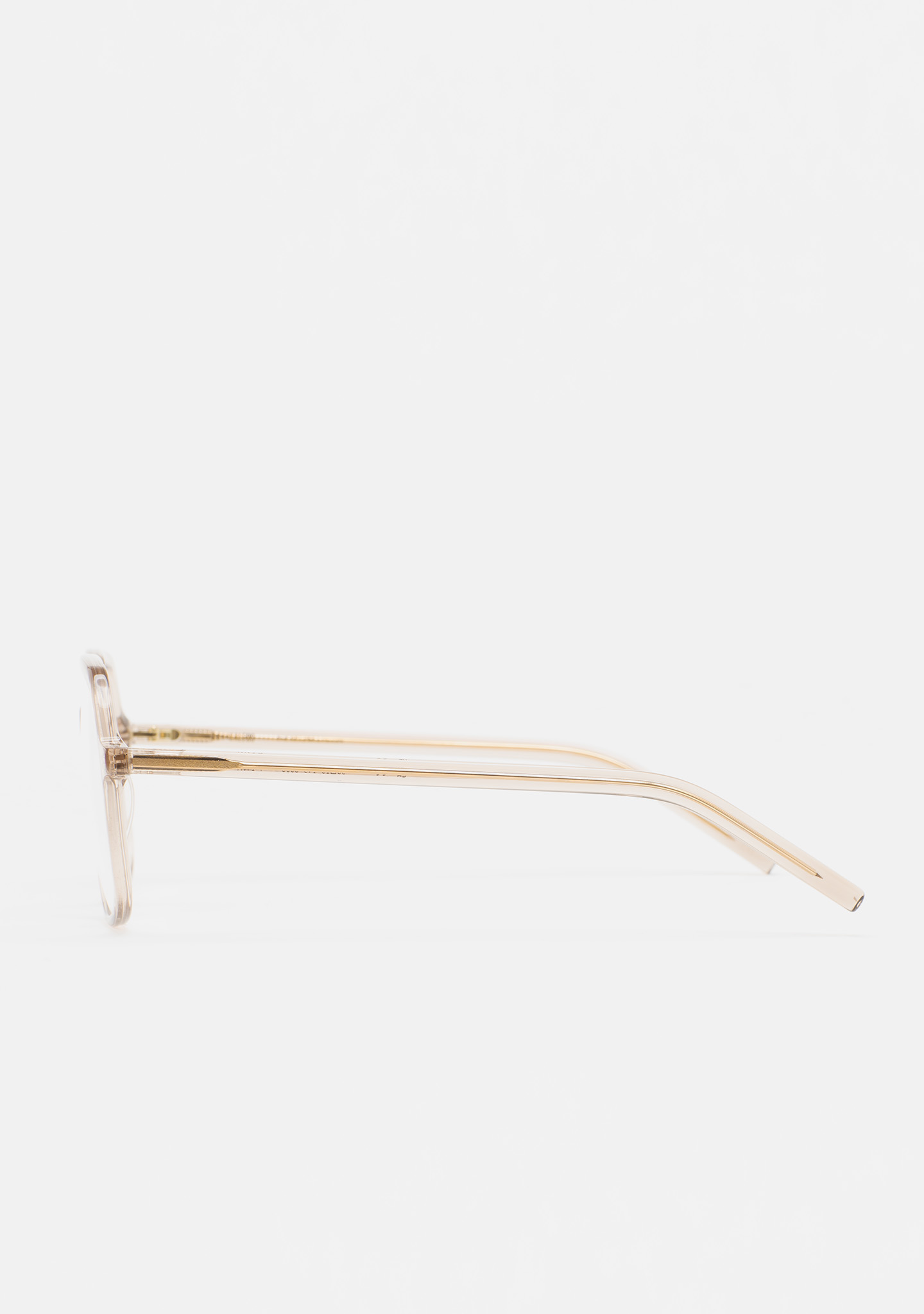 Lunettes de vue de forme carrée. Monture et branches en acétate haute densité rose clair transparent. Plaquettes en acétate intégrées. Fait main.