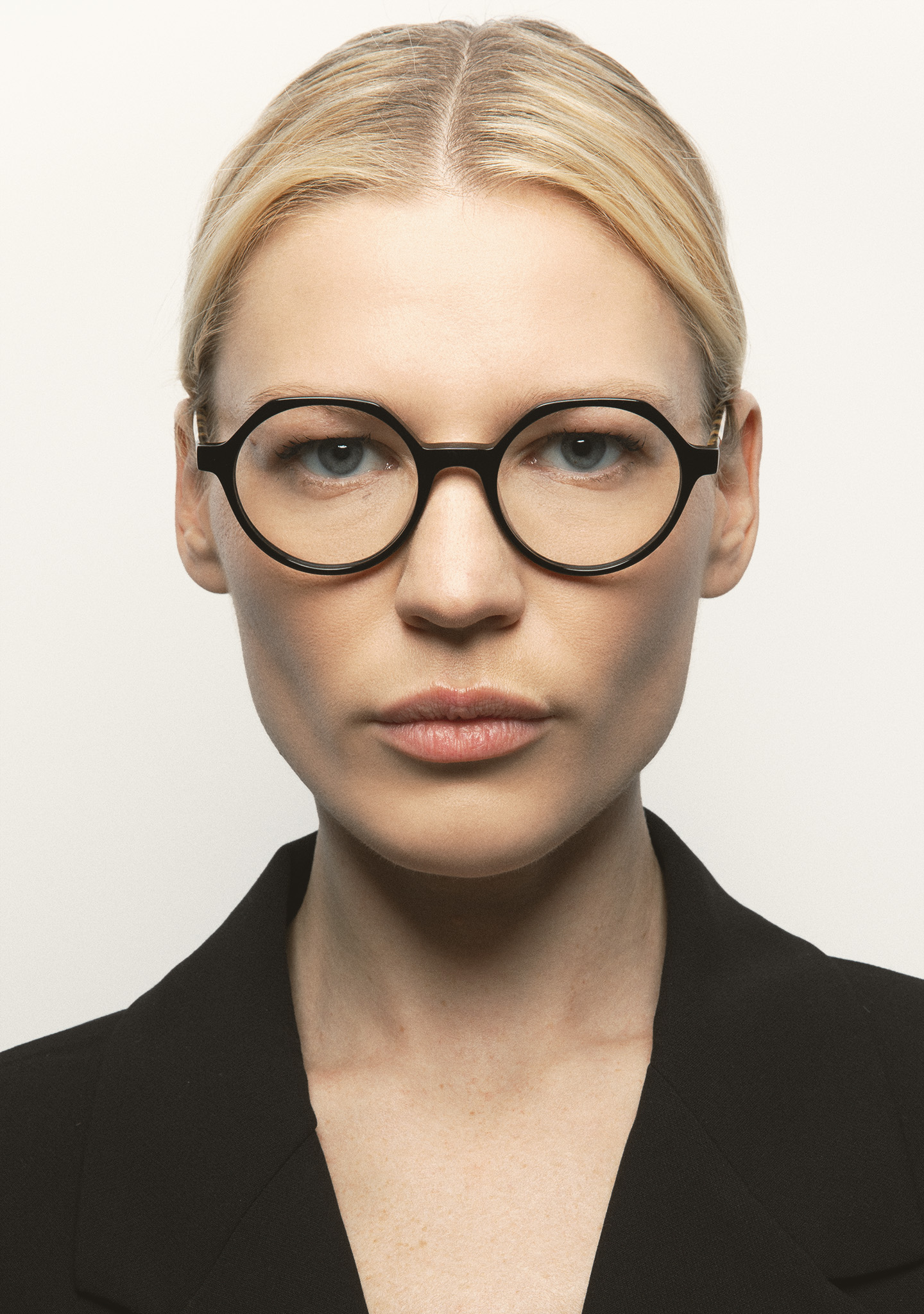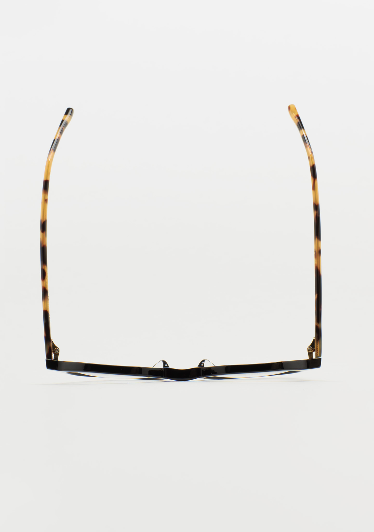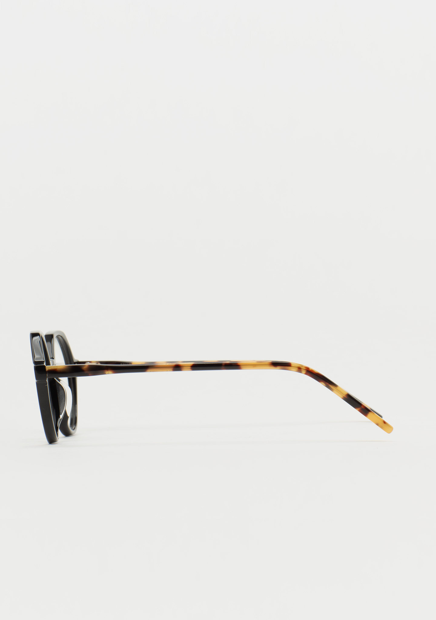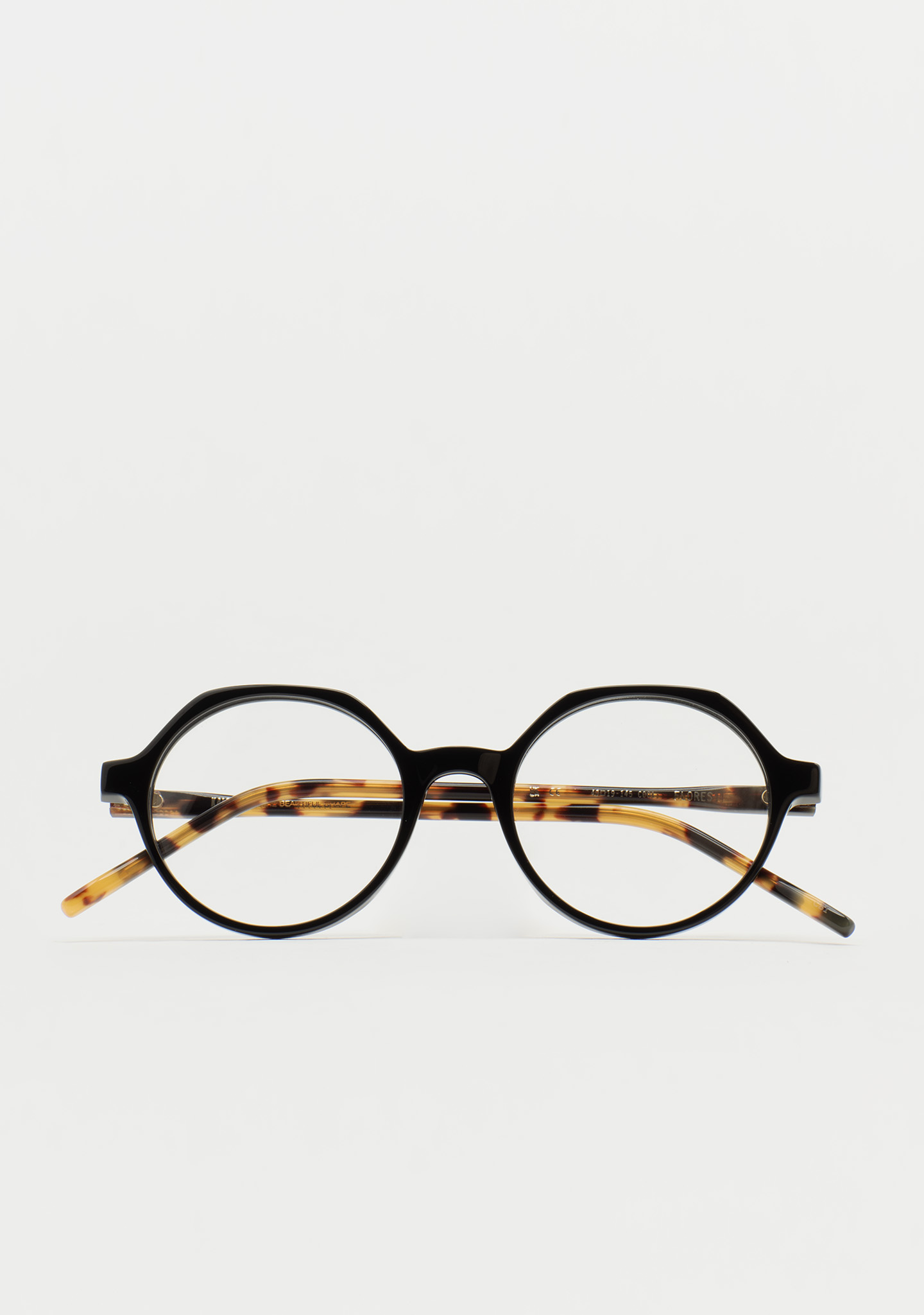 Lunettes de vue rondes avec sourcil plat. Subtilité avec un caractère propre. Face avant en acétate noir. Branches en acétate havane marron. Plaquettes de nez en acétate intégrées. Fabriquées à la main.