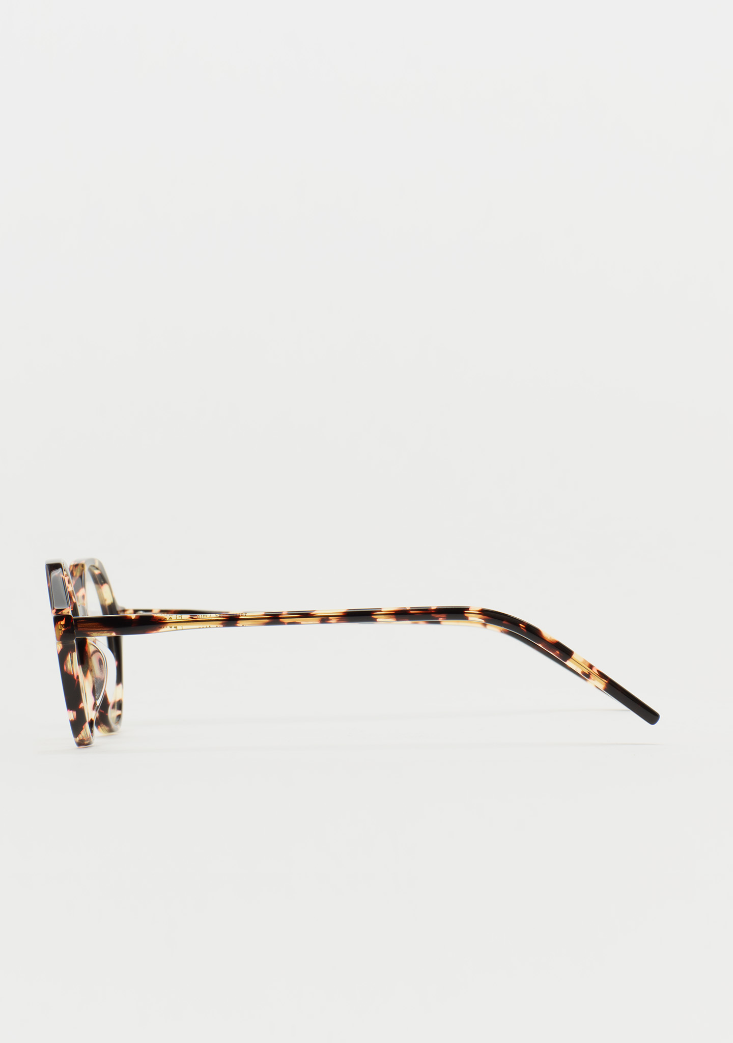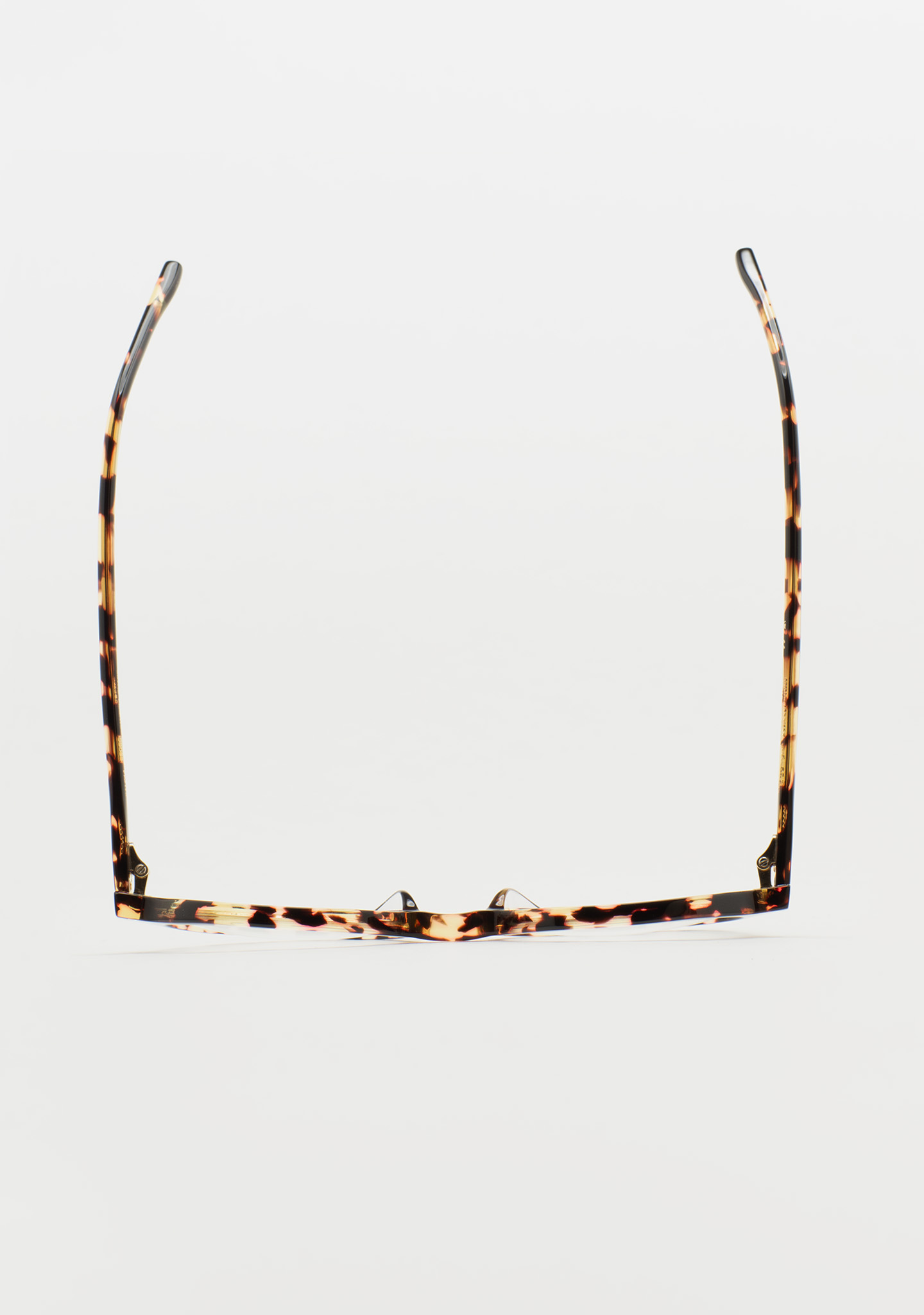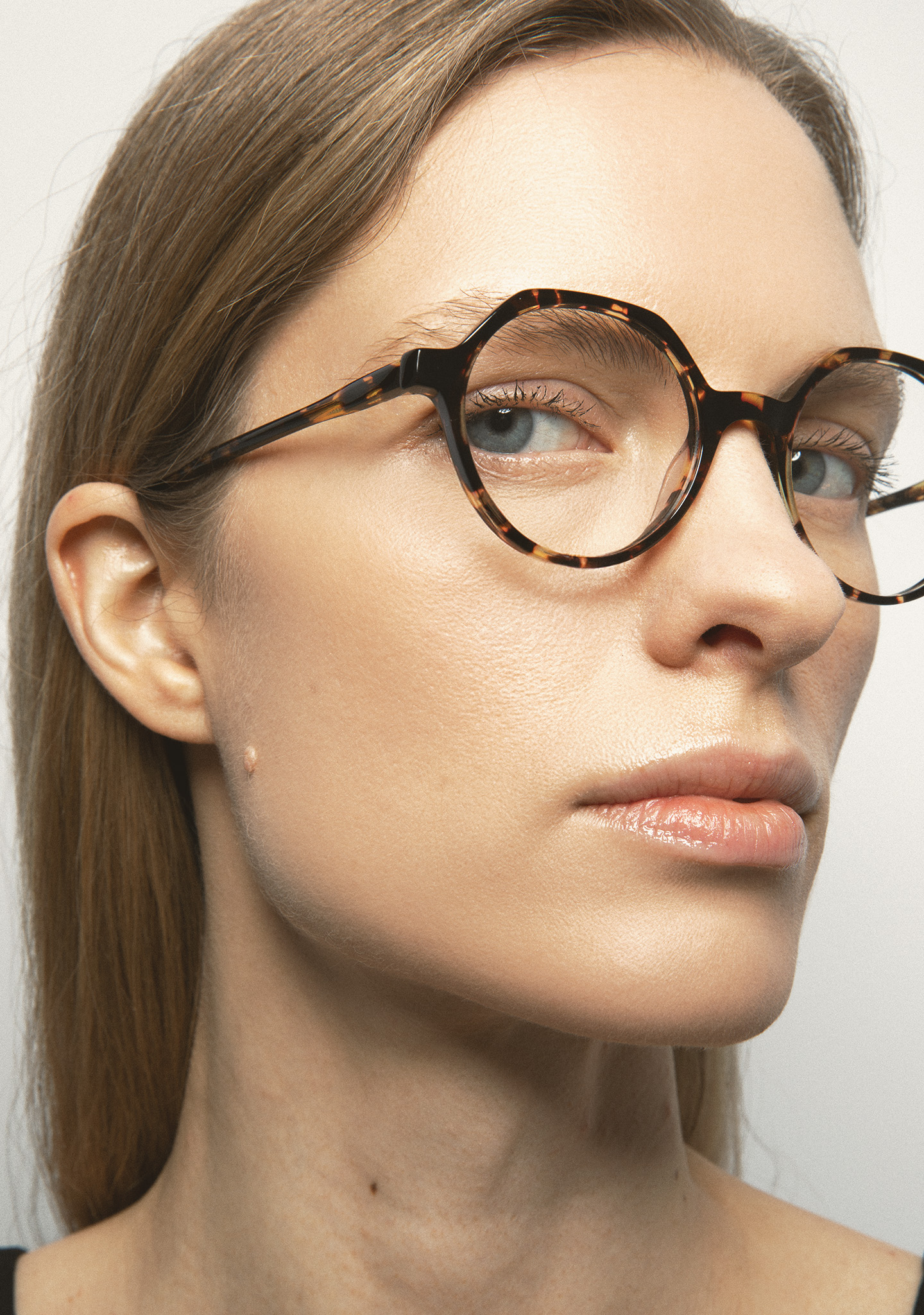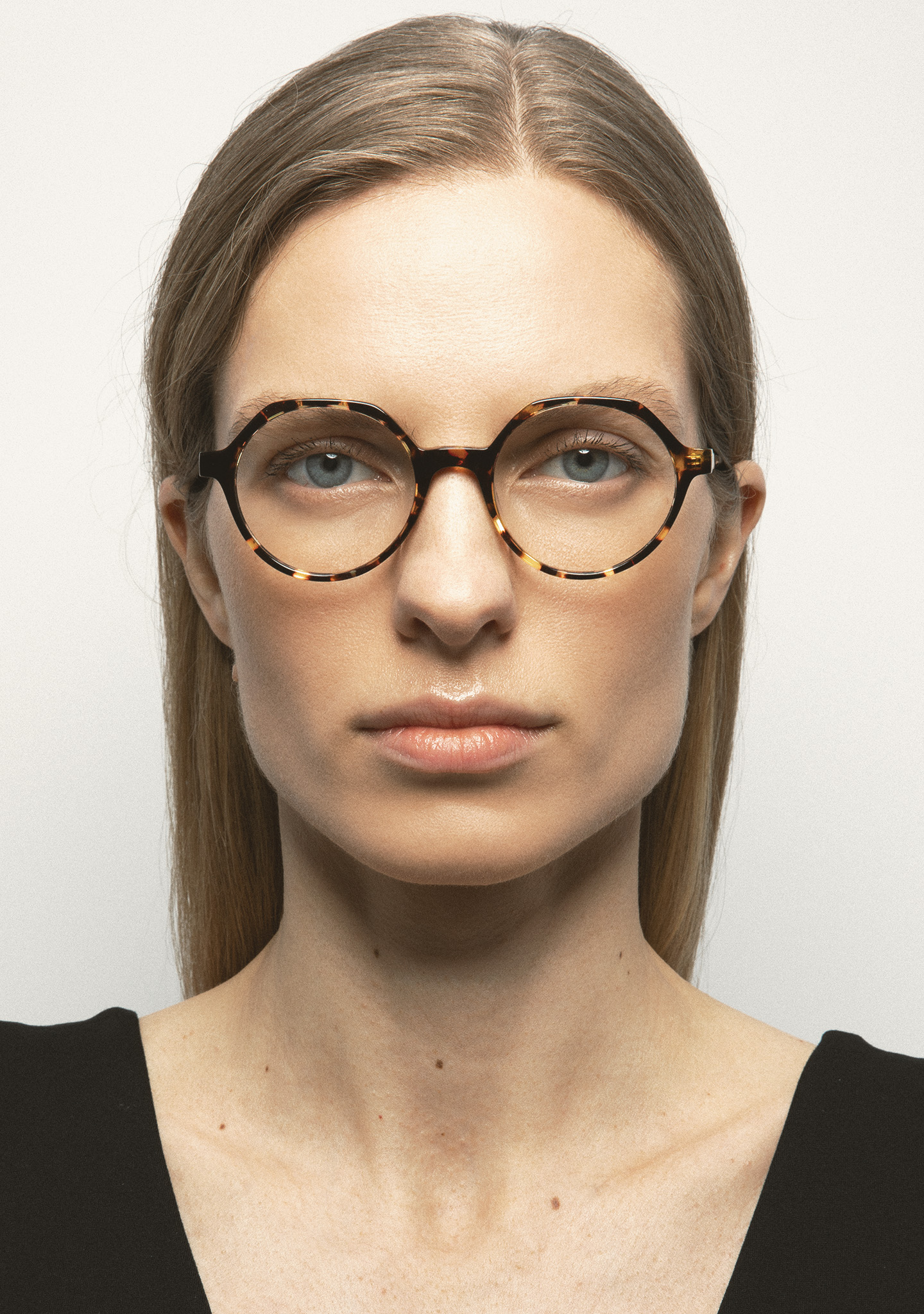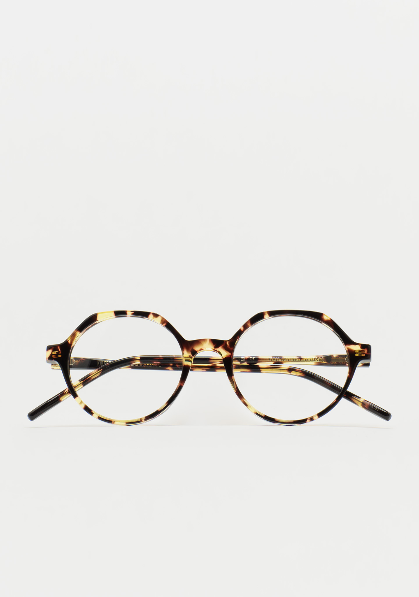 Lunettes de vue rondes avec sourcil plat. Subtilité avec un caractère propre. Face avant et branches en acétate havane marron vintage. Plaquettes de nez en acétate intégrées. Fabriquées à la main.