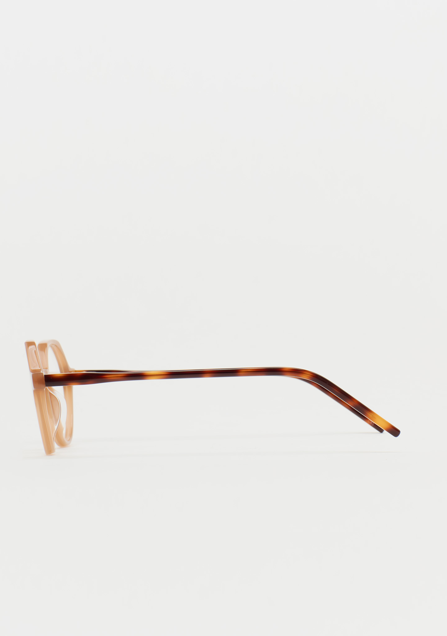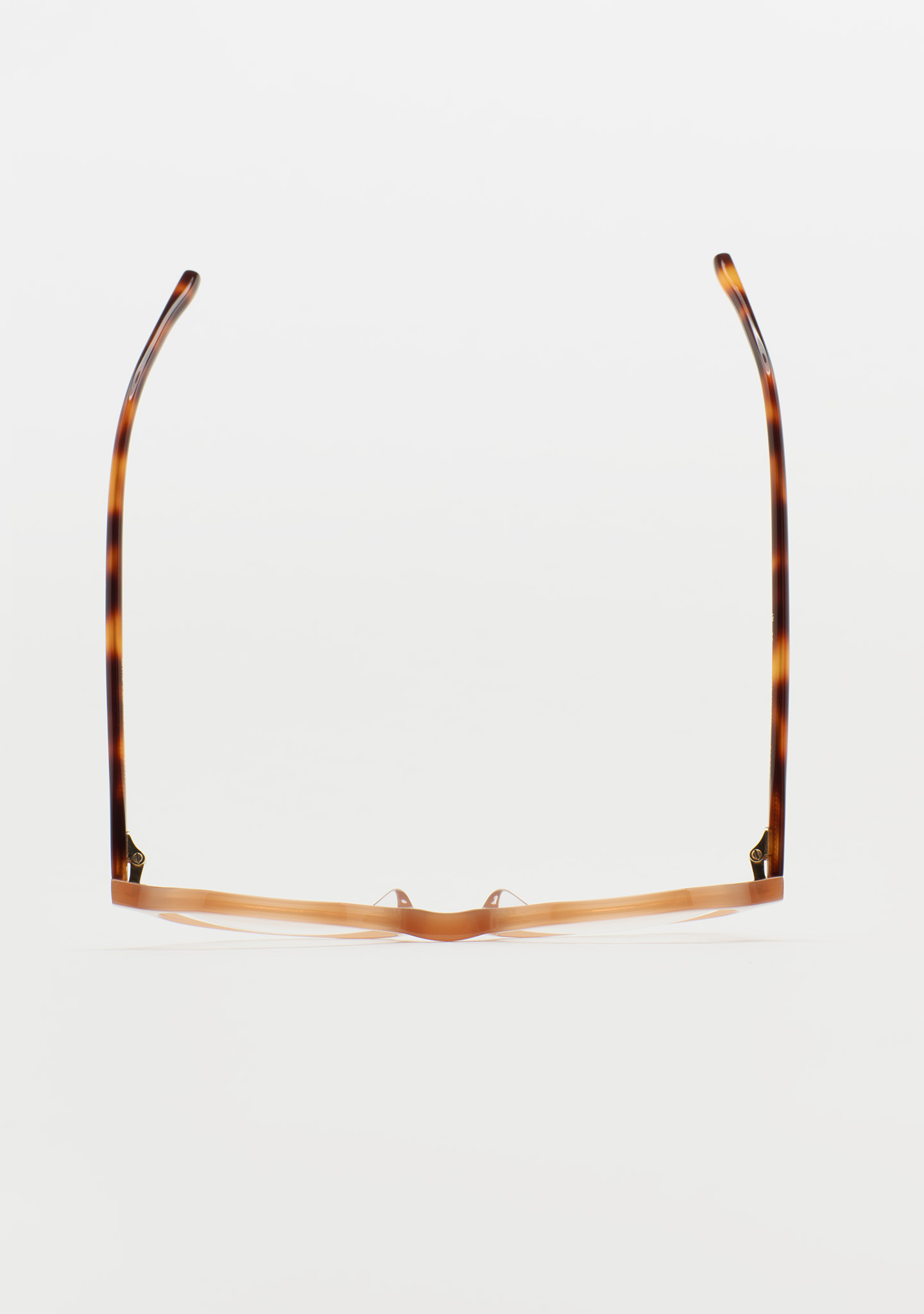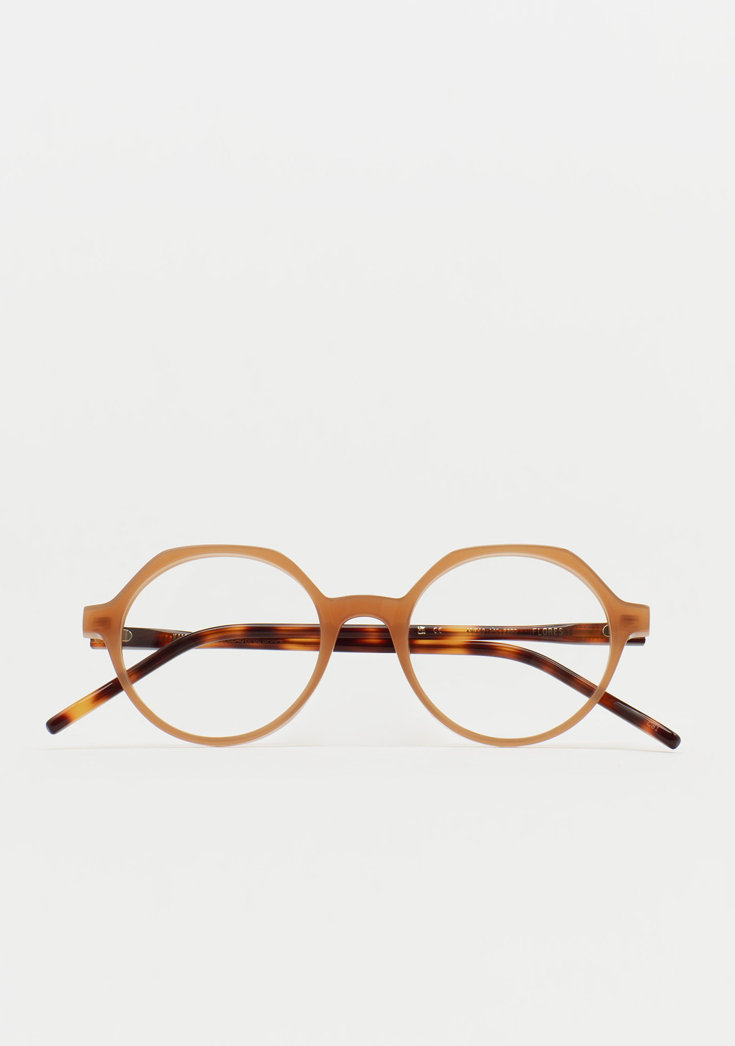 Lunettes de vue rondes avec sourcil plat. Subtilité avec un caractère propre. Face avant en acétate marron clair. Branches en acétate havane marron. Plaquettes de nez en acétate intégrées. Fabriquées à la main.