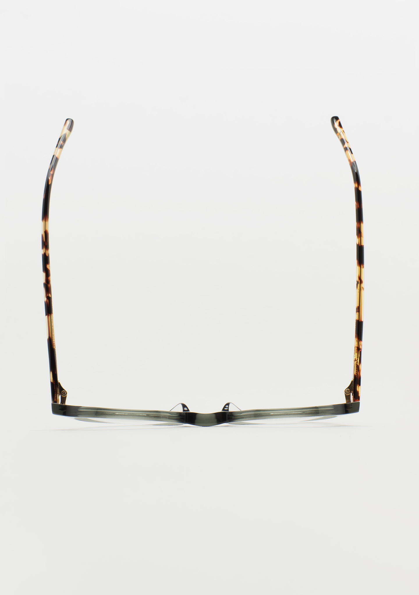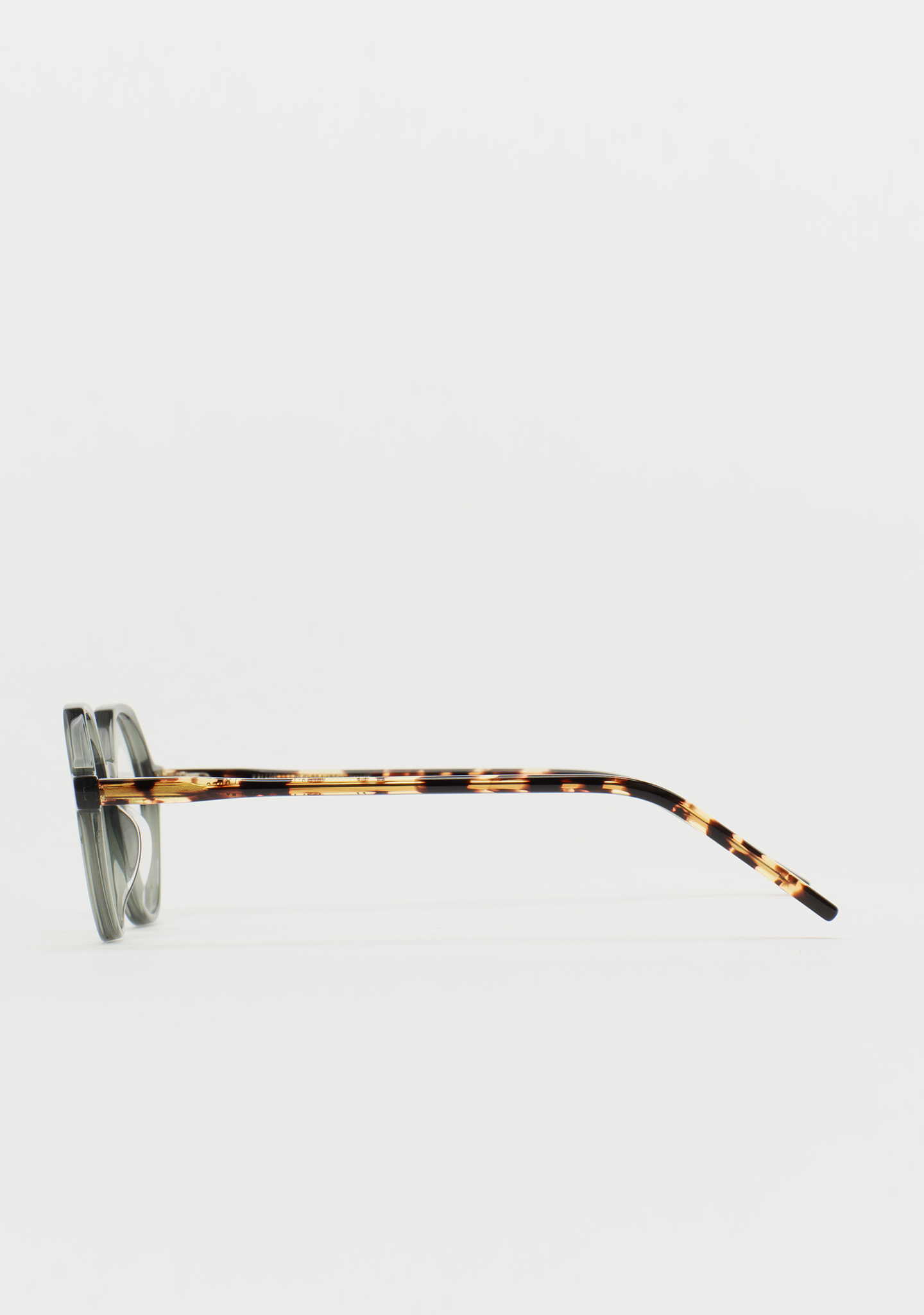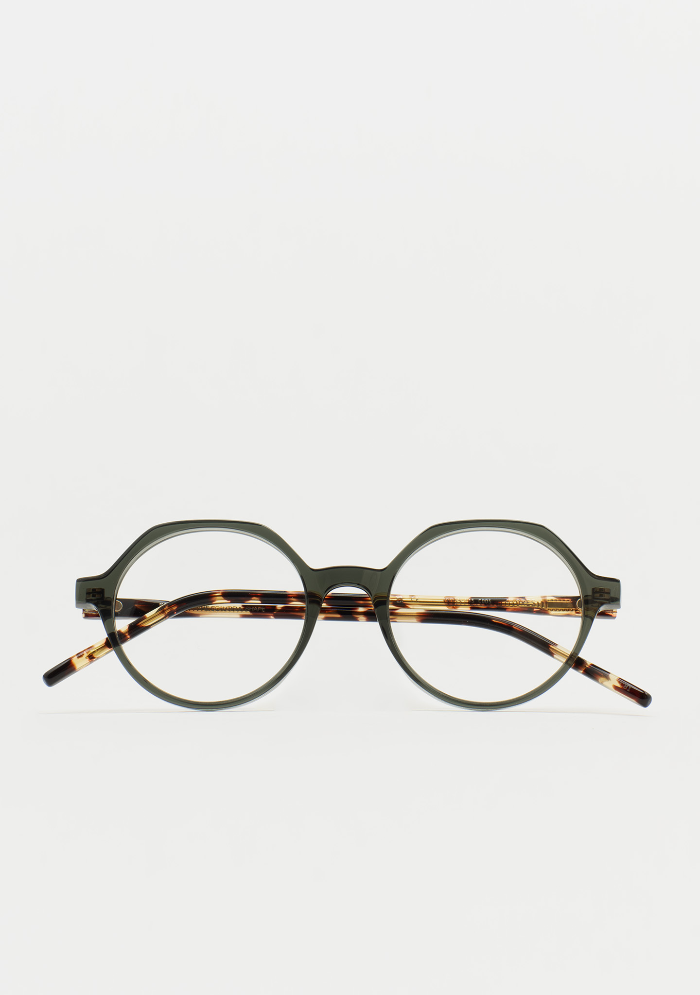 Lunettes de vue rondes avec sourcil plat. Subtilité avec un caractère propre. Face avant en acétate vert grisâtre transparent. Branches en acétate havane marron vintage. Plaquettes de nez en acétate intégrées. Fabriquées à la main.