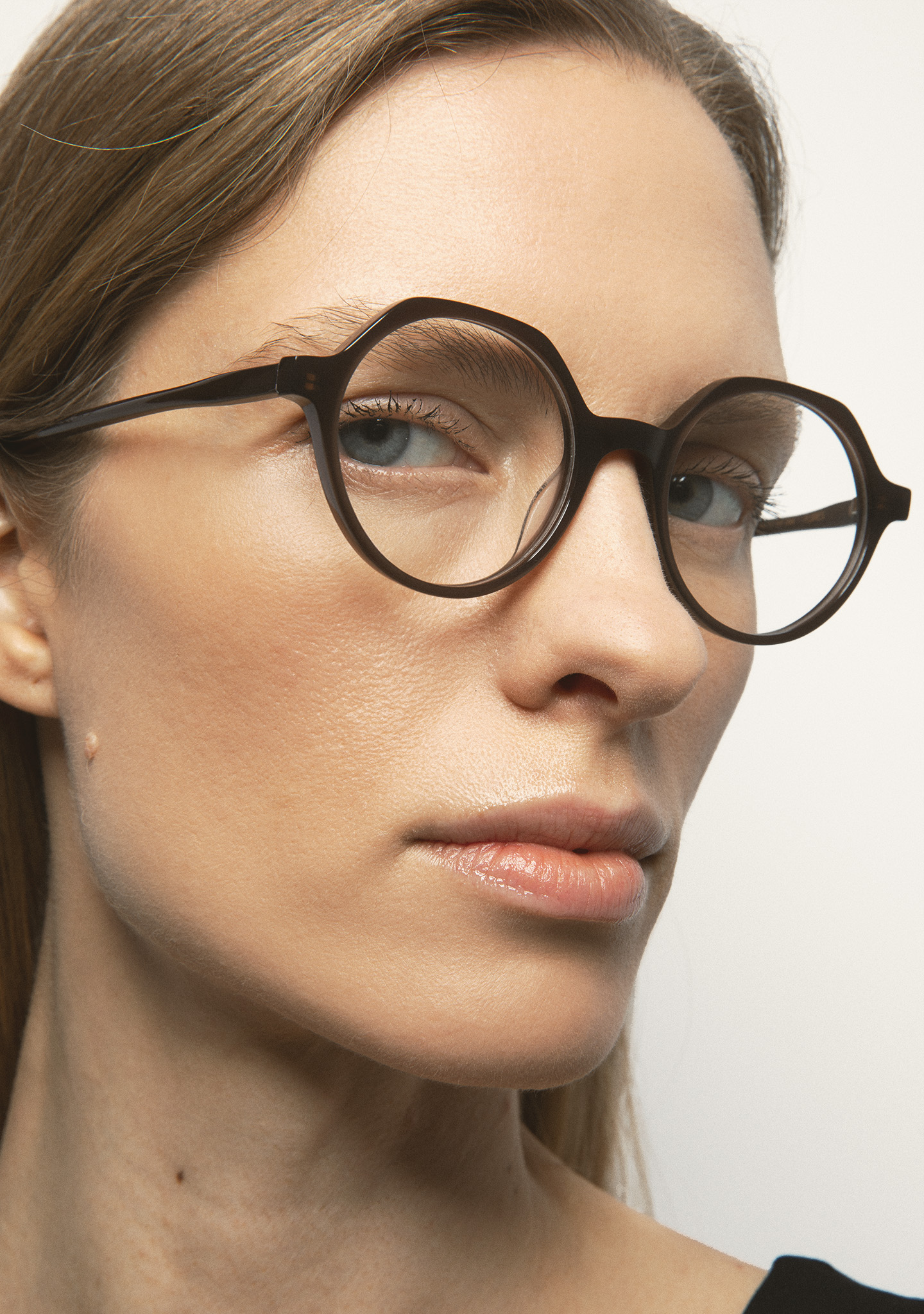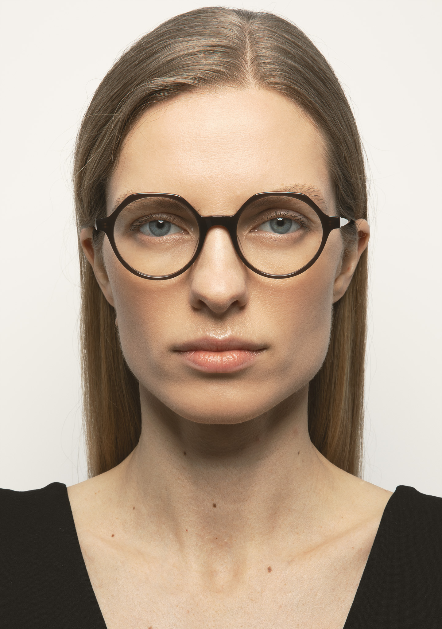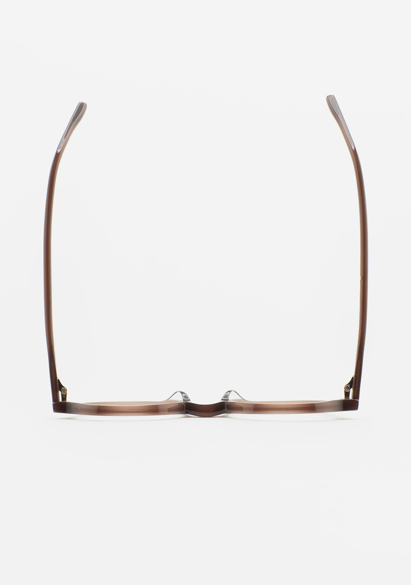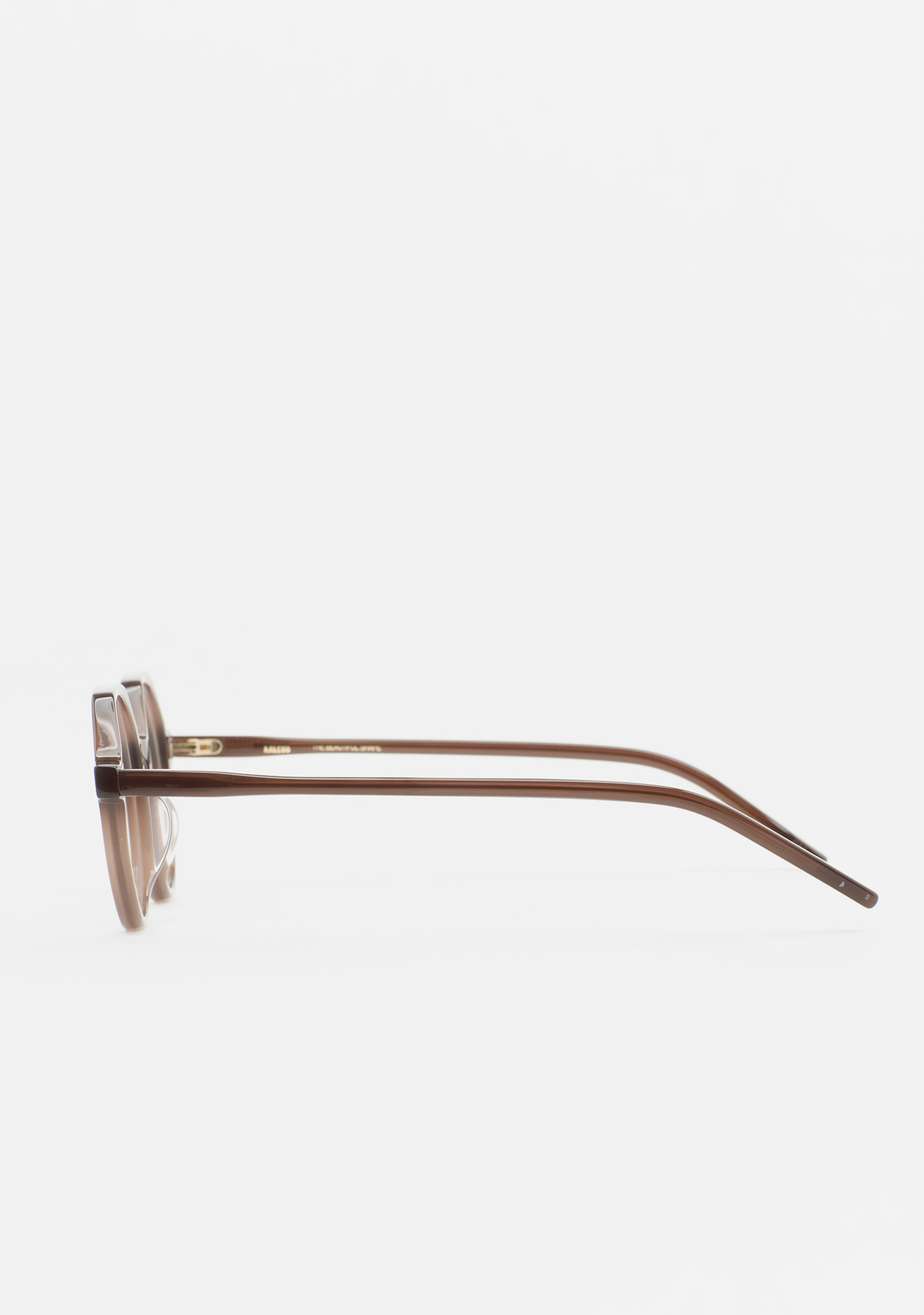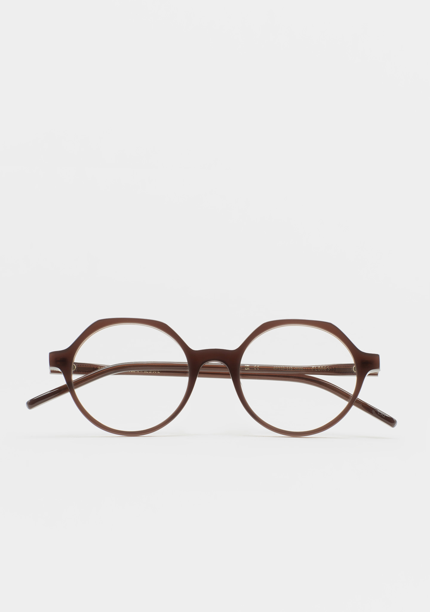Lunettes de vue rondes avec sourcil plat. Subtilité au caractère affirmé. Face et branches en acétate marron translucide. Plaquettes en acétate intégrées. Fabriquées à la main.