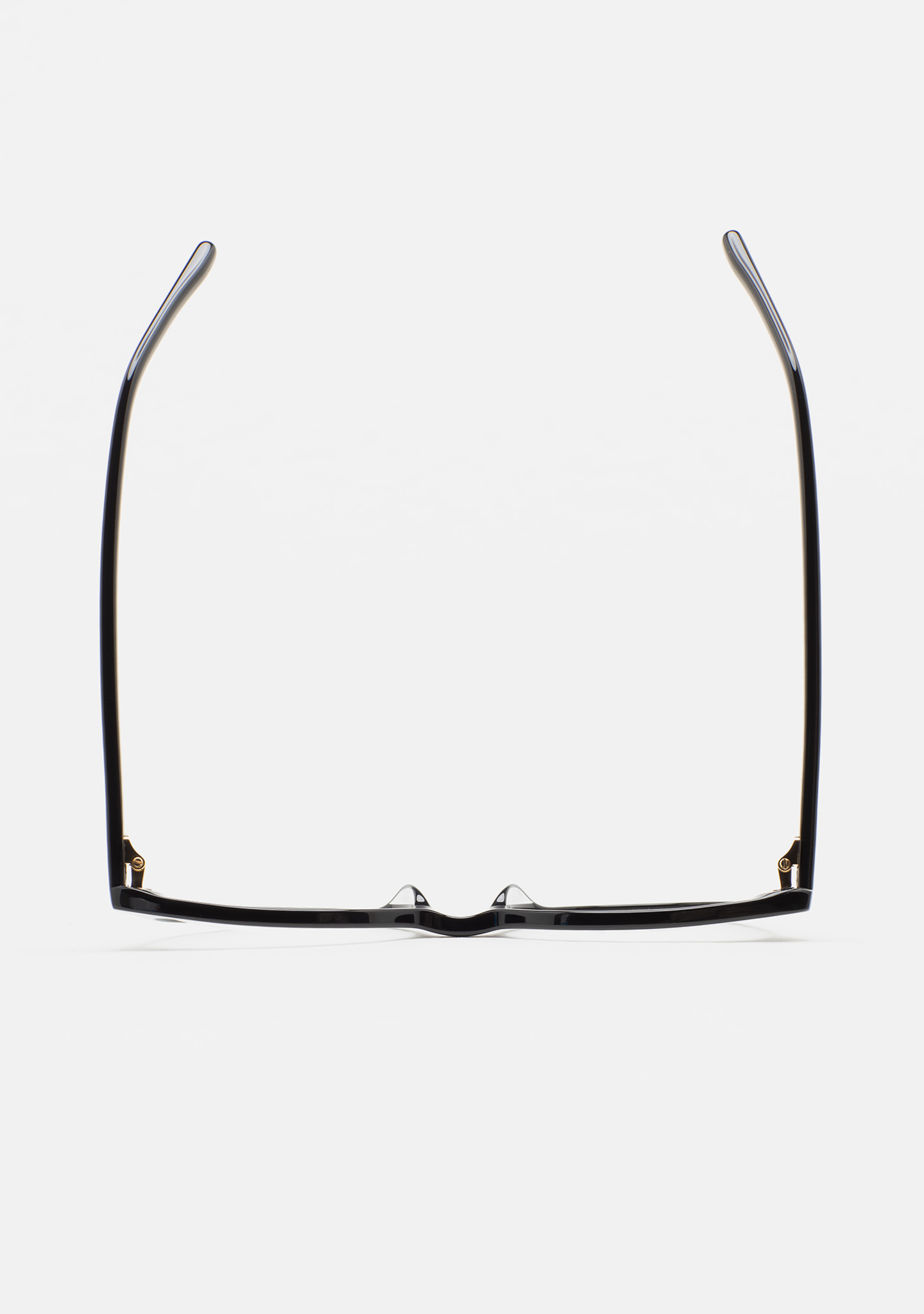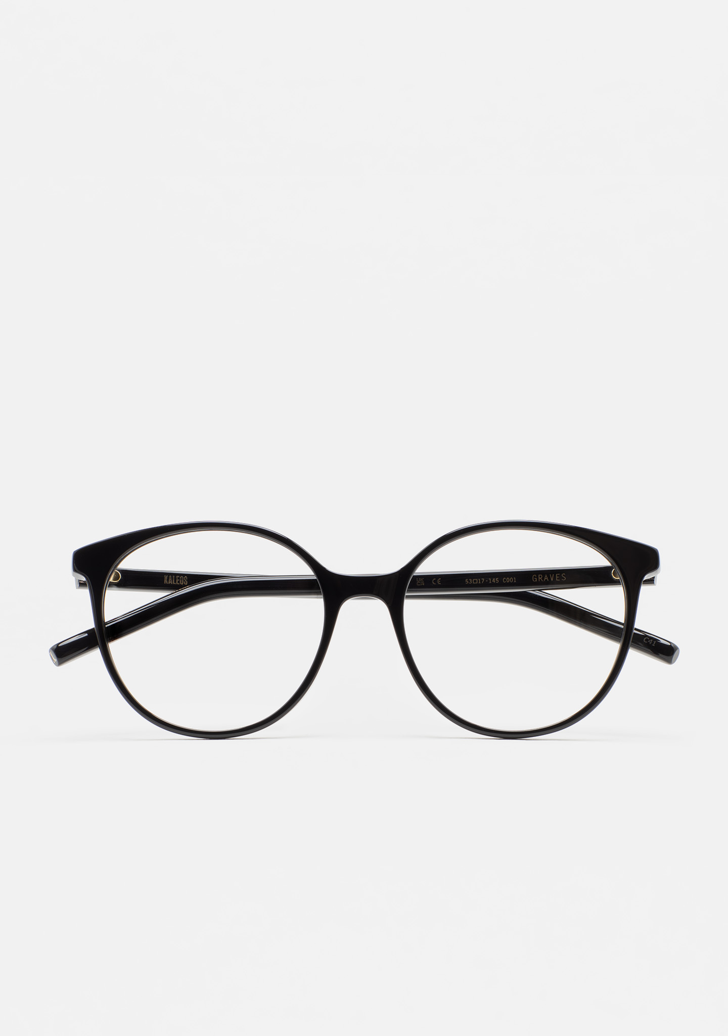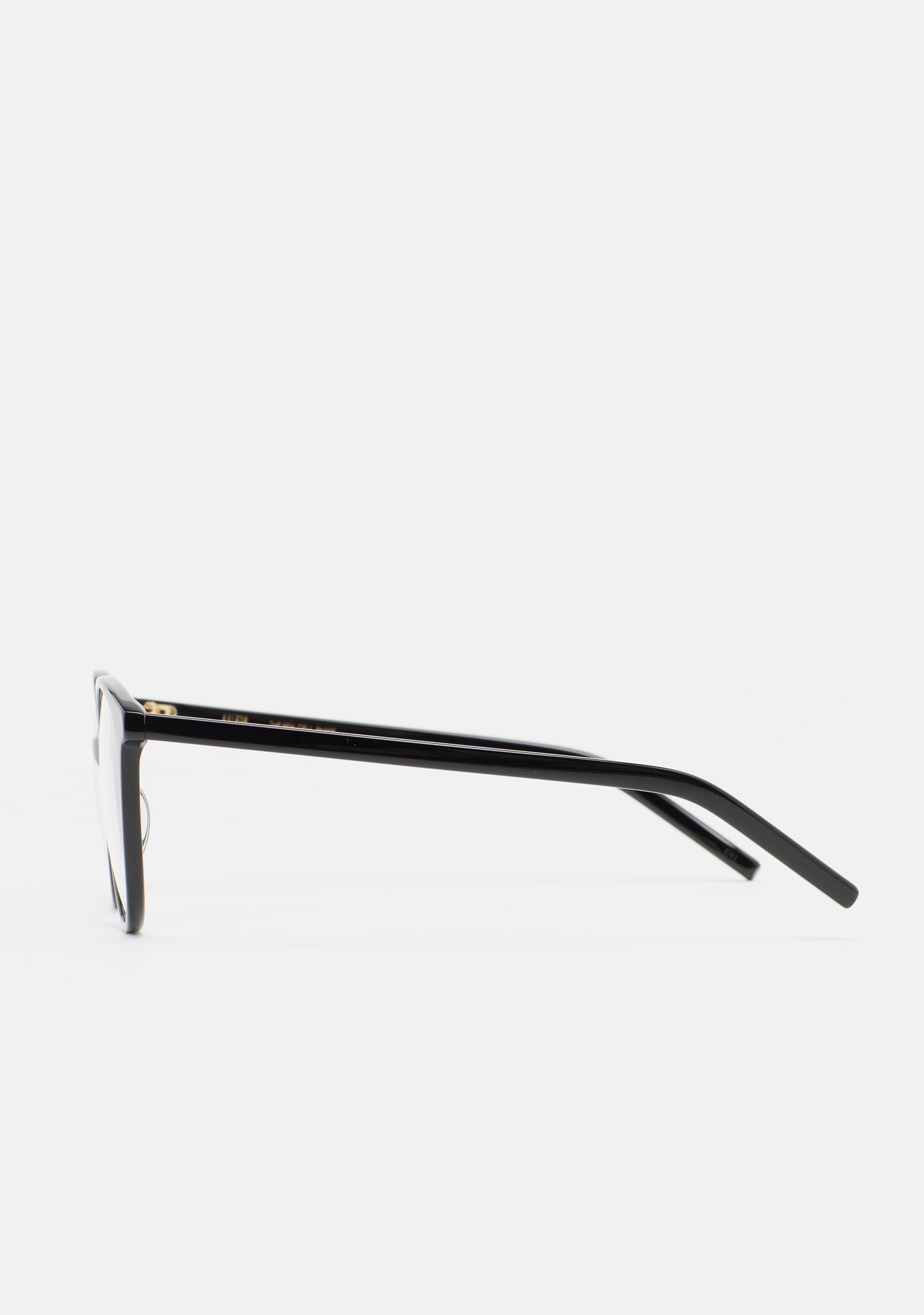 Lunettes de vue de forme arrondie. Monture et branches en acétate haute densité noir. Plaquettes en acétate intégrées. Fait main.