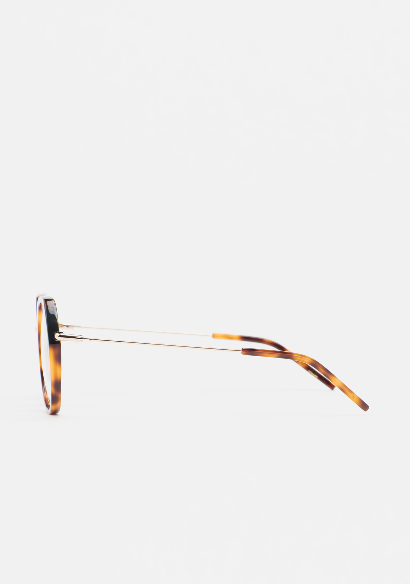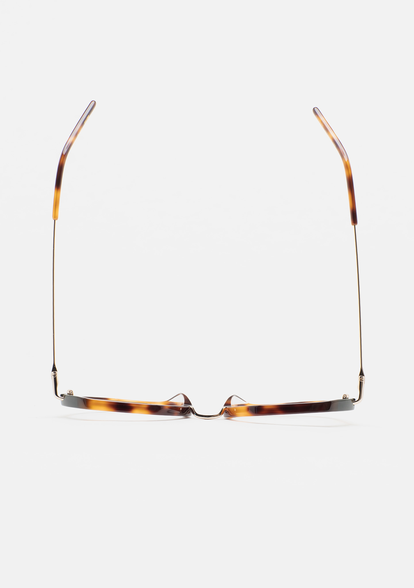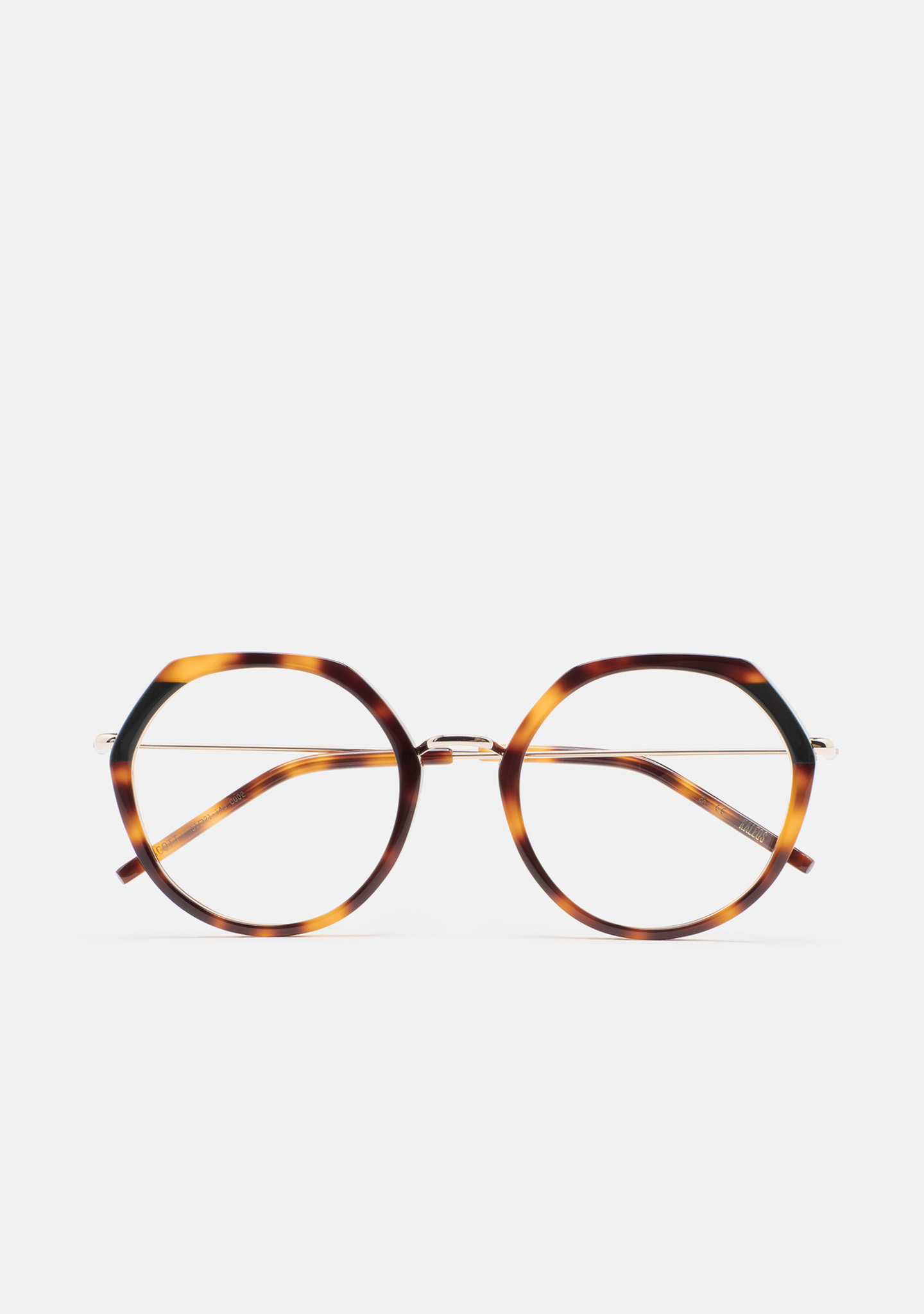 Lunettes de vue de forme ronde avec sourcil plat. Monture en acétate havane marron avec laminage vert foncé. Structure et pont en acier inoxydable doré. Branches en acier inoxydable avec embouts en acétate havane marron. Plaquettes en acétate intégrées. Fait main.
