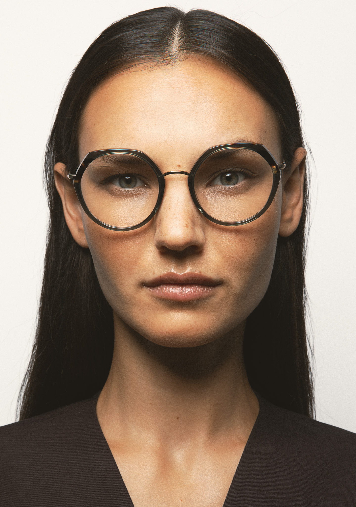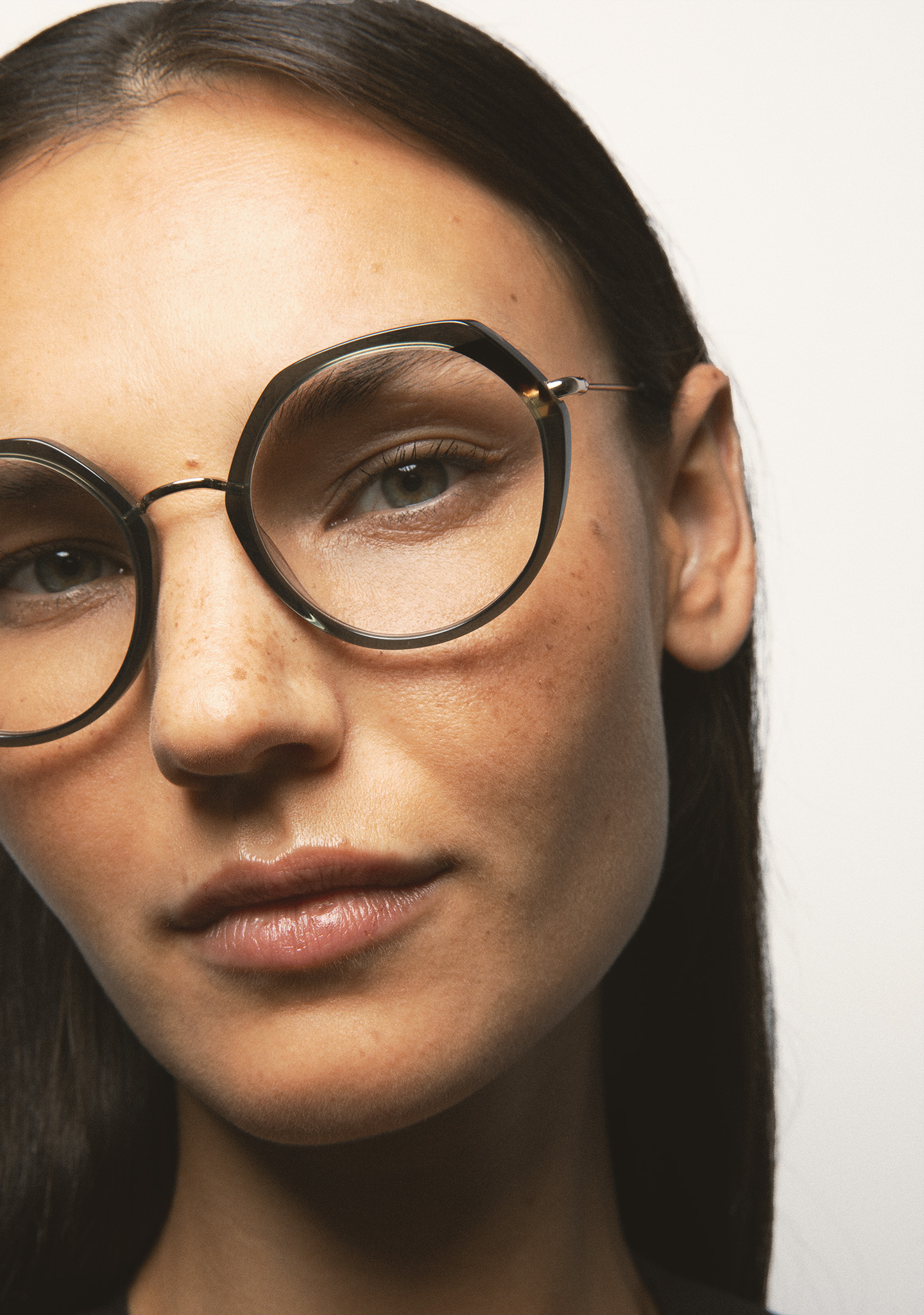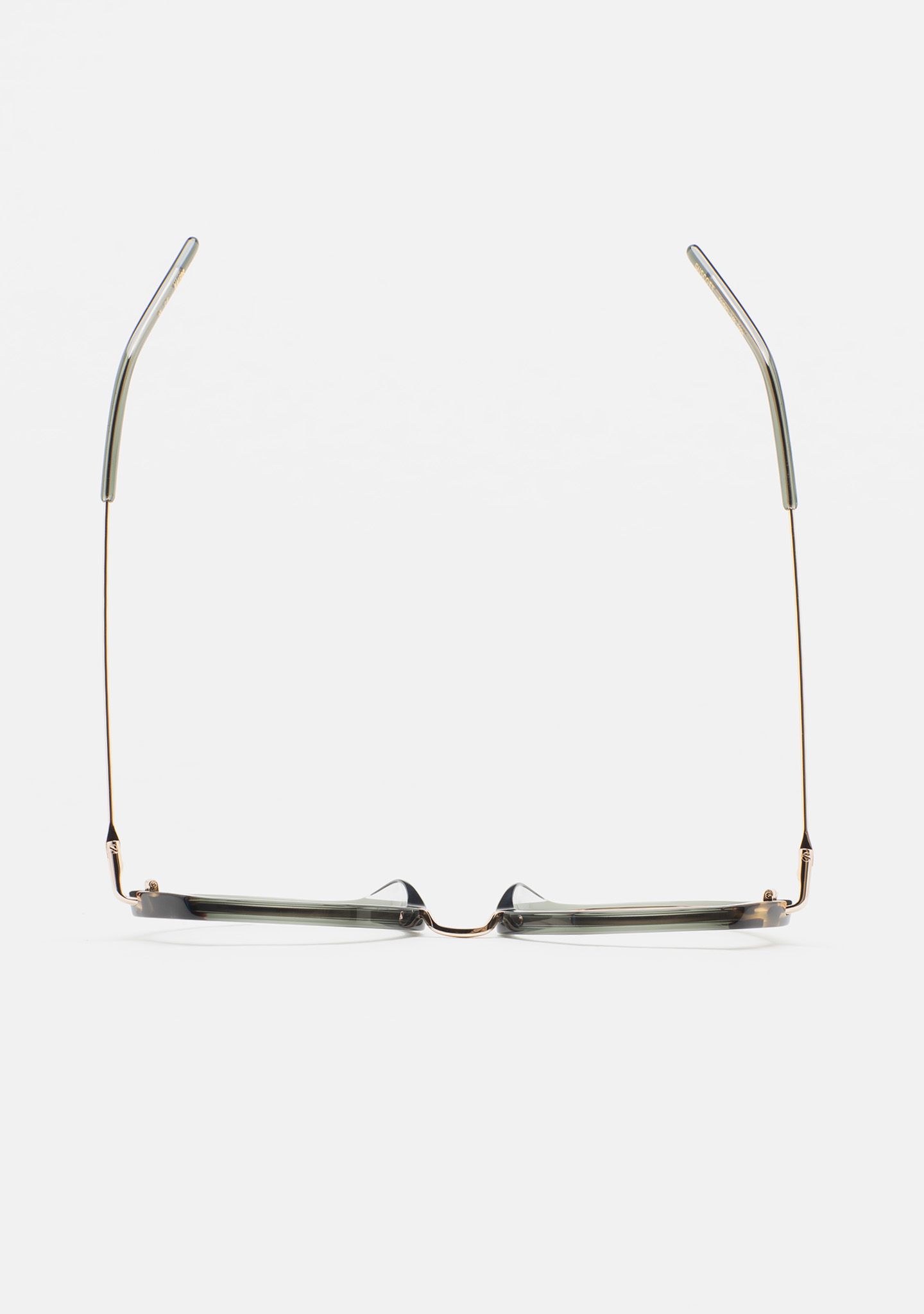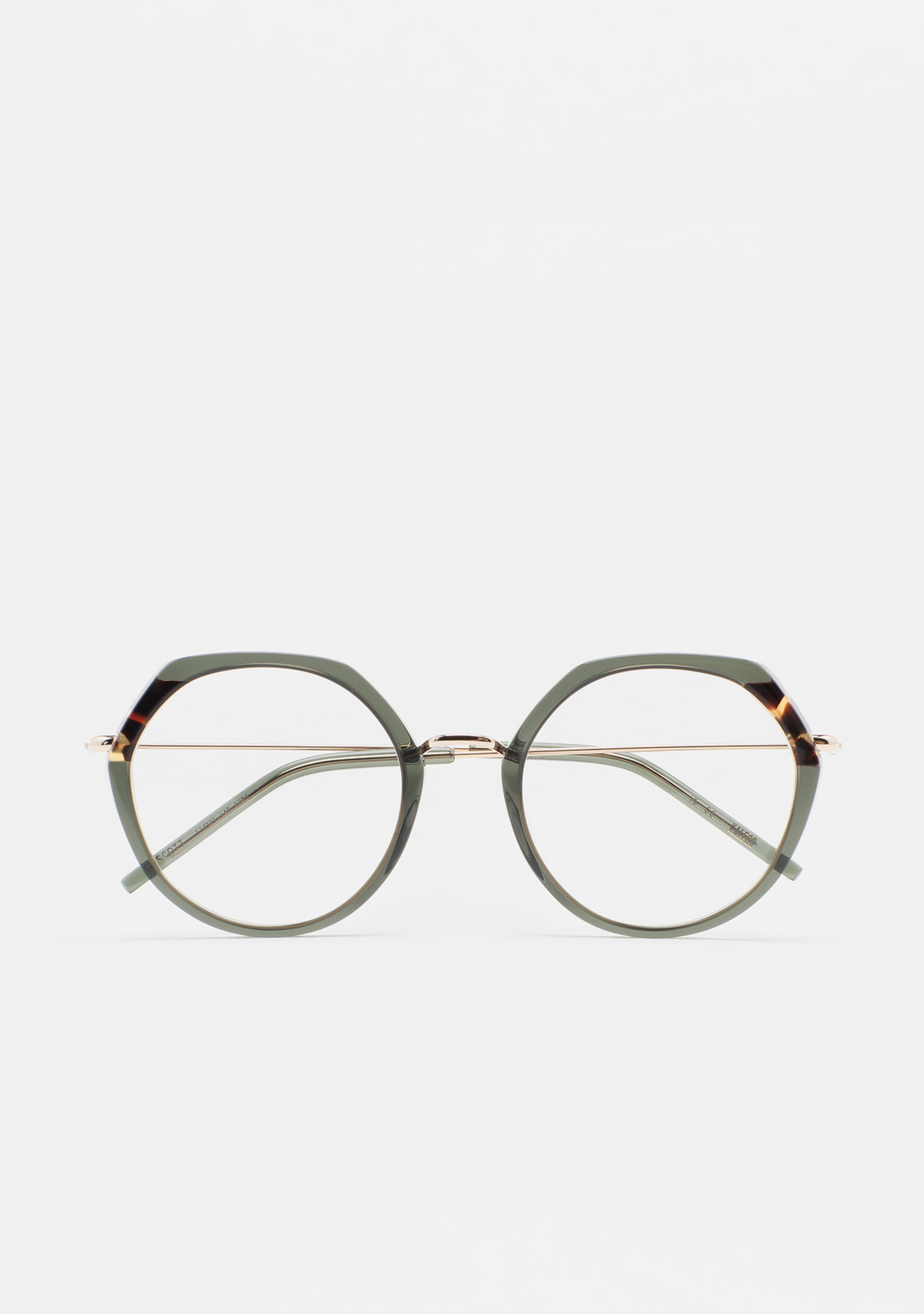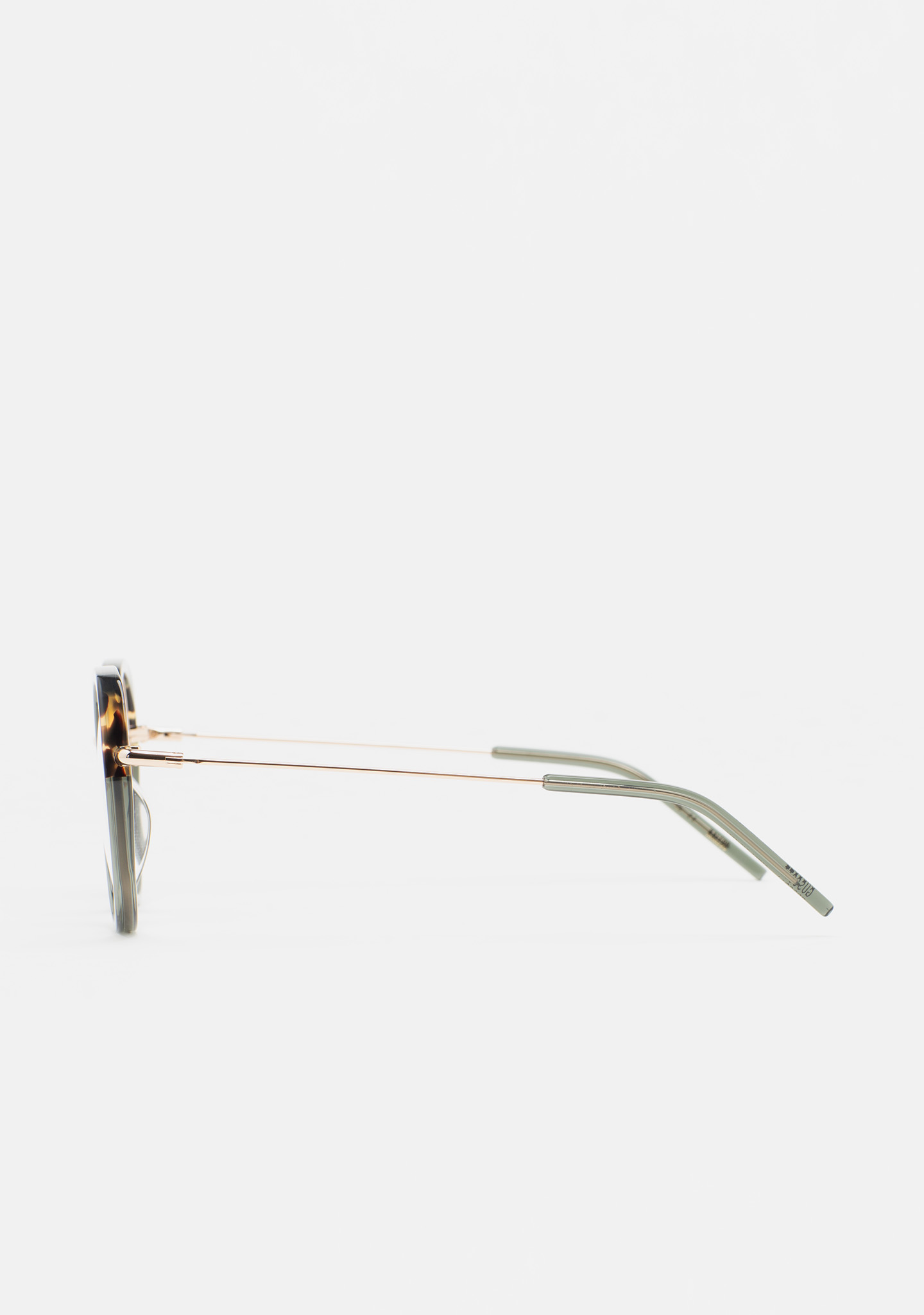 Lunettes de vue de forme ronde avec sourcil plat. Monture en acétate vert transparent avec laminage havane marron. Structure et pont en acier inoxydable doré. Branches en acier inoxydable avec embouts en acétate vert transparent. Plaquettes en acétate intégrées. Fait main.