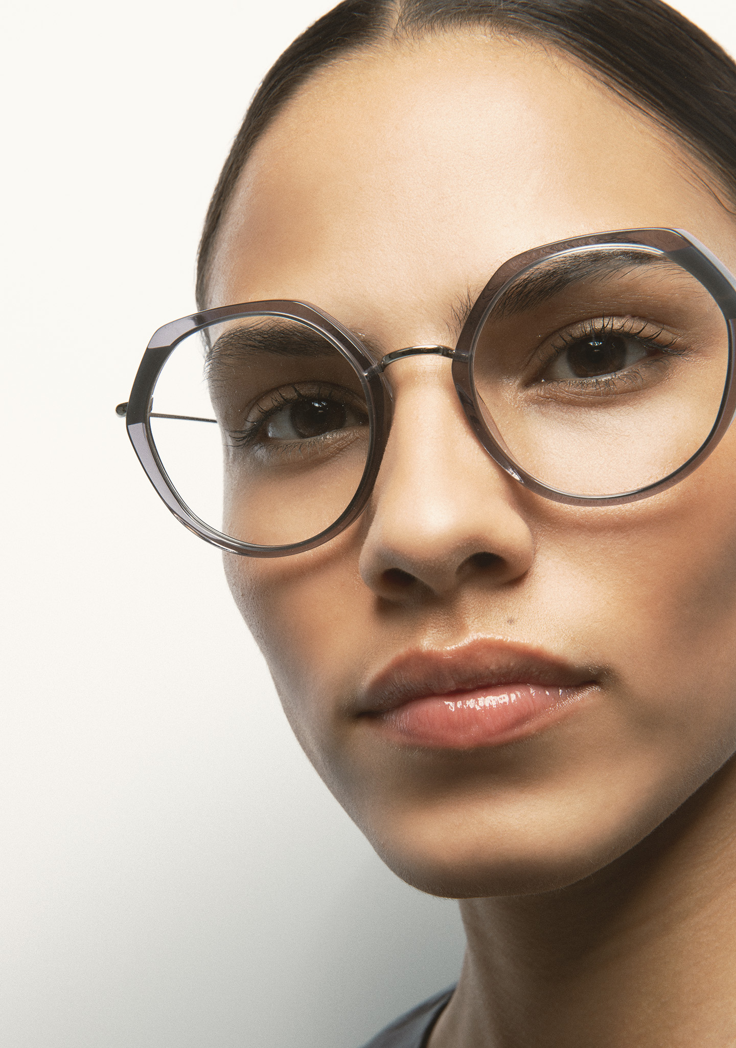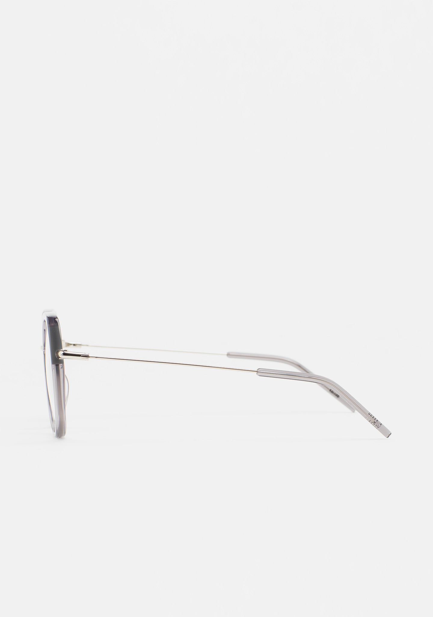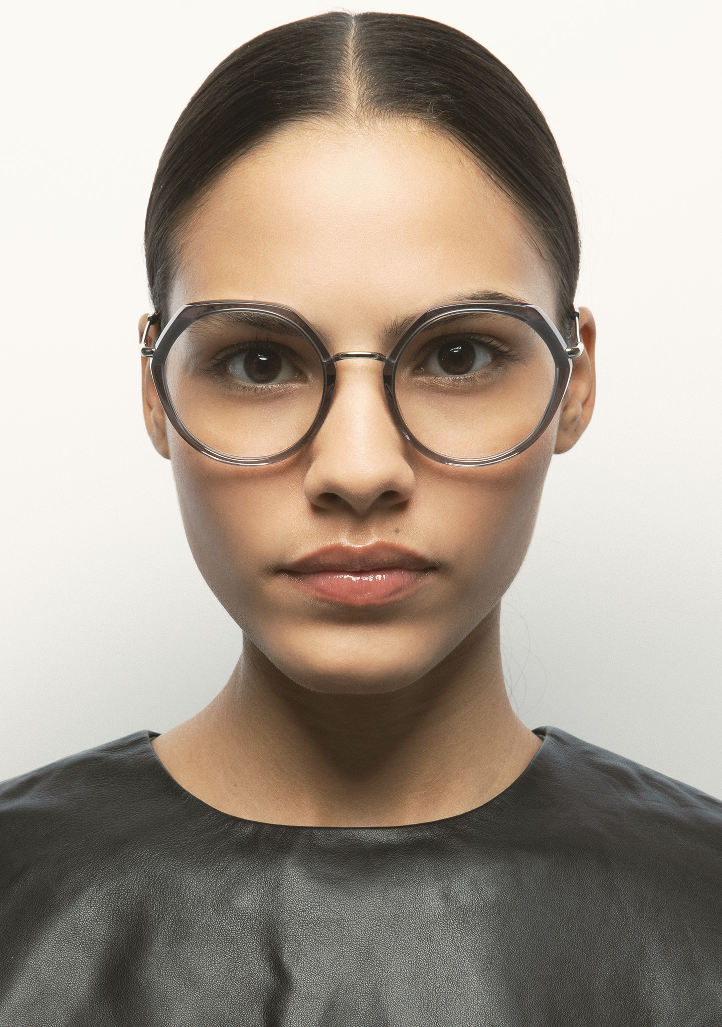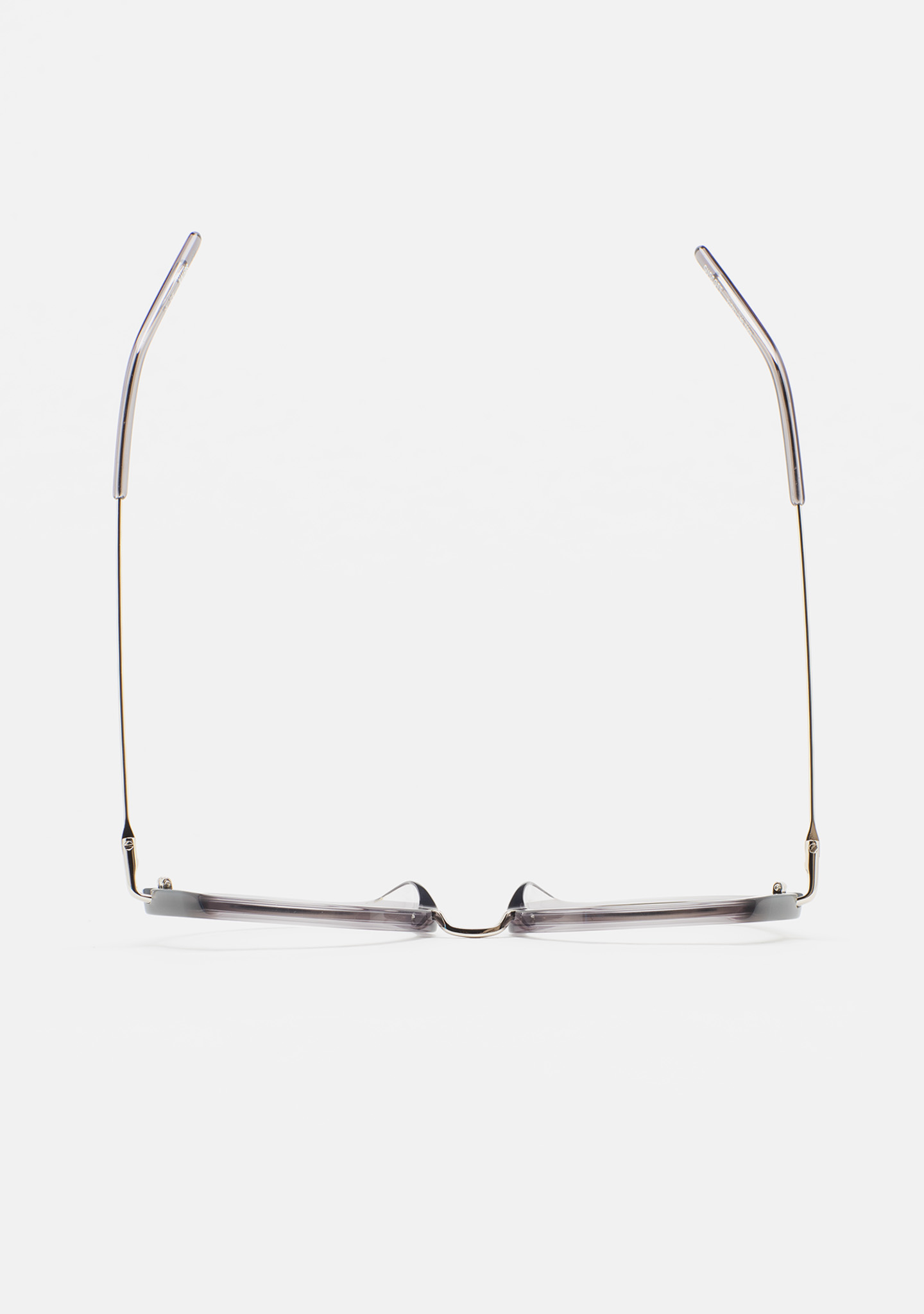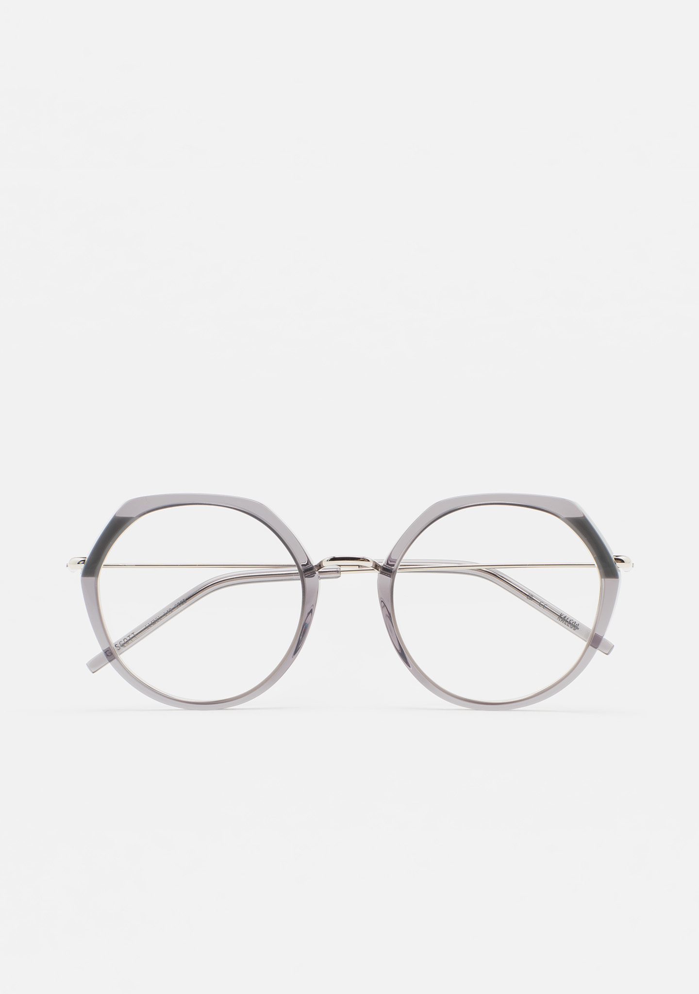 Lunettes de vue de forme ronde avec sourcil plat. Monture en acétate gris transparent avec laminage gris. Structure et pont en acier inoxydable argenté. Branches en acier inoxydable avec embouts en acétate gris transparent. Plaquettes en acétate intégrées. Fait main.