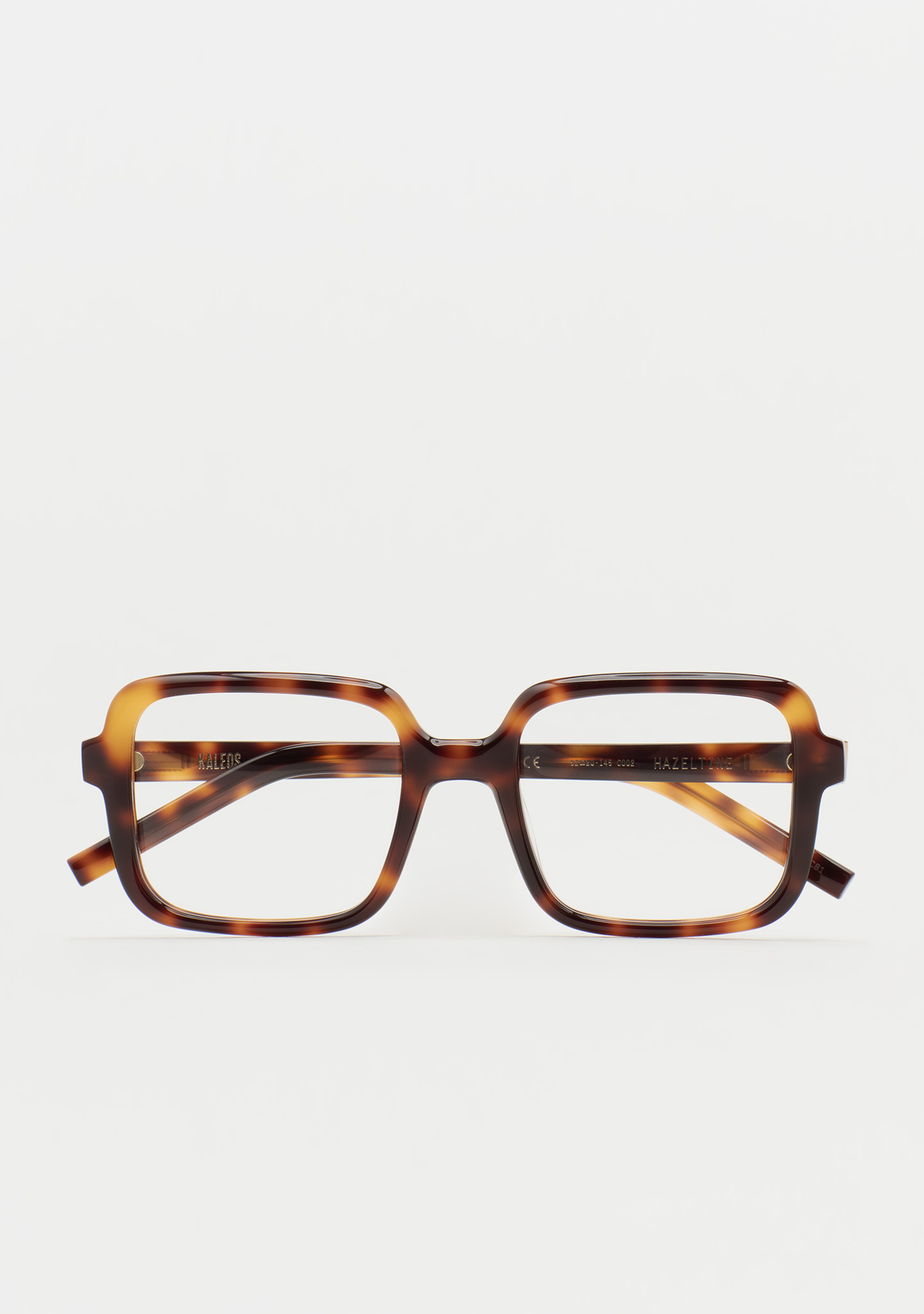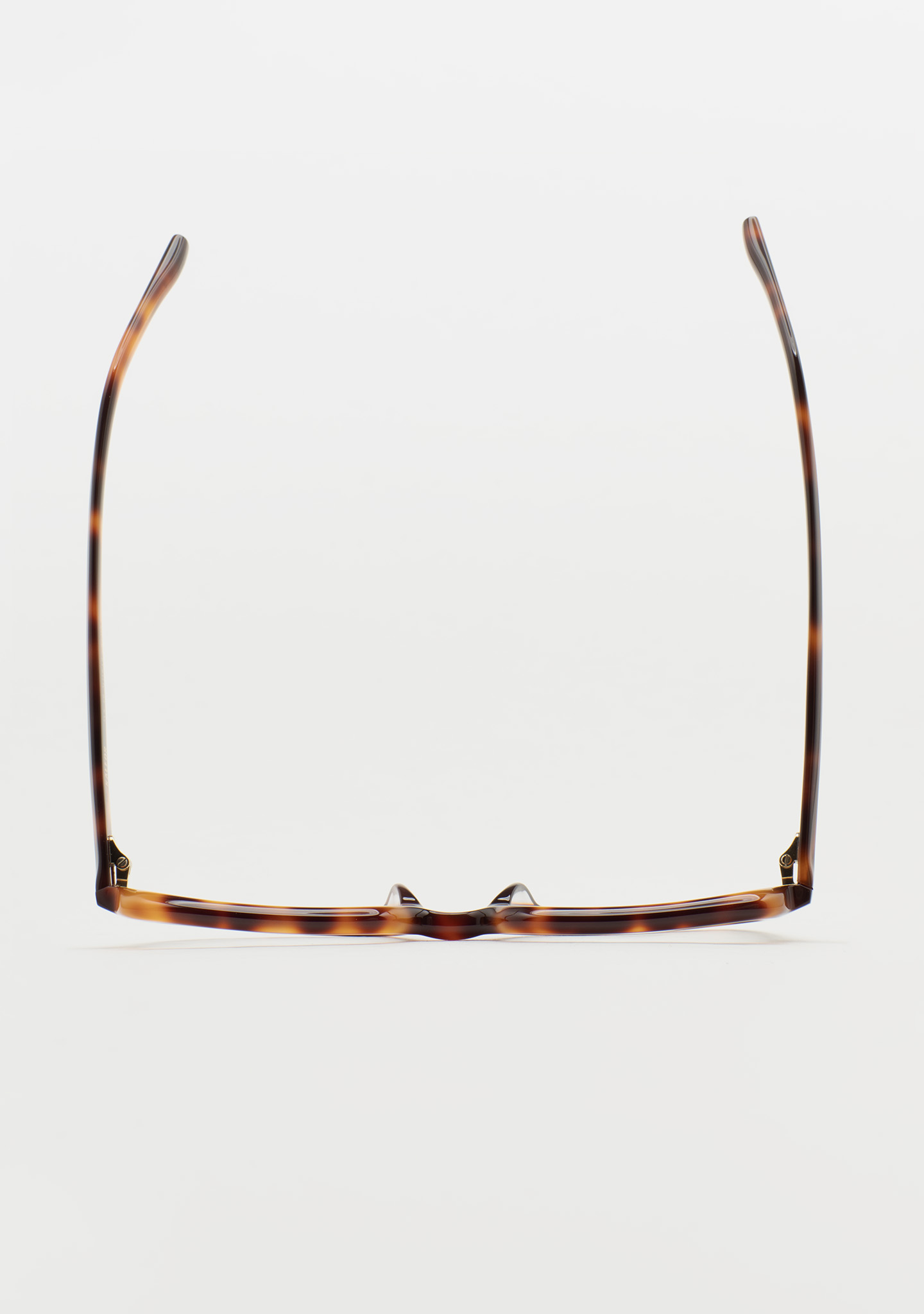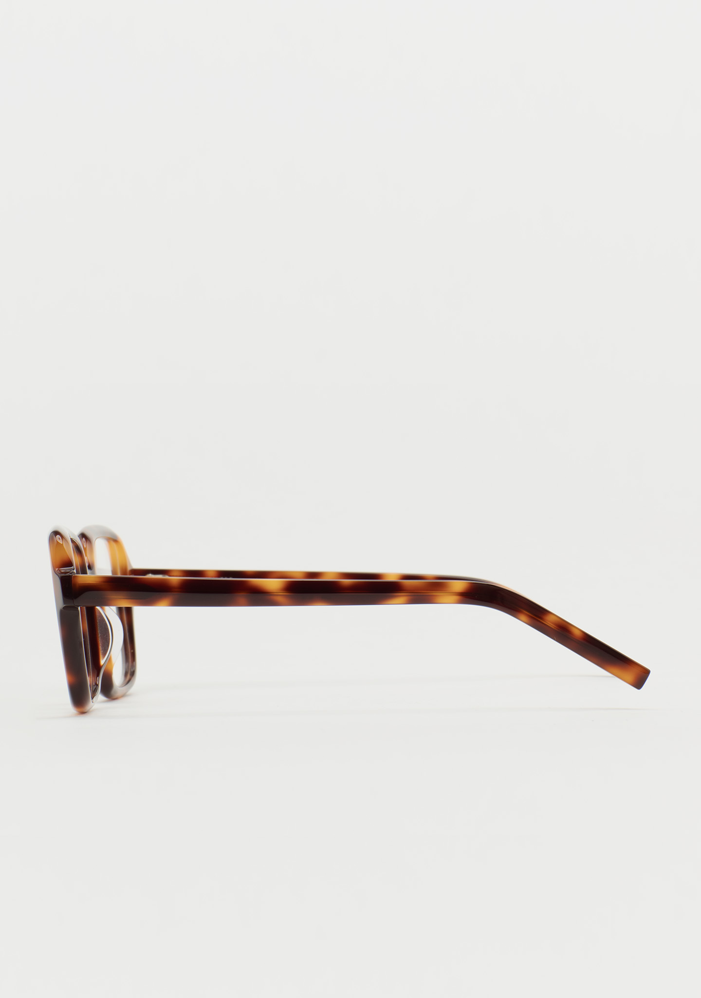 Lunettes de vue carrées. Présence qui se fait remarquer. Face avant et branches en acétate havane marron foncé. Usinage autour de la lentille. Plaquettes de nez en acétate intégrées. Fabriquées à la main.