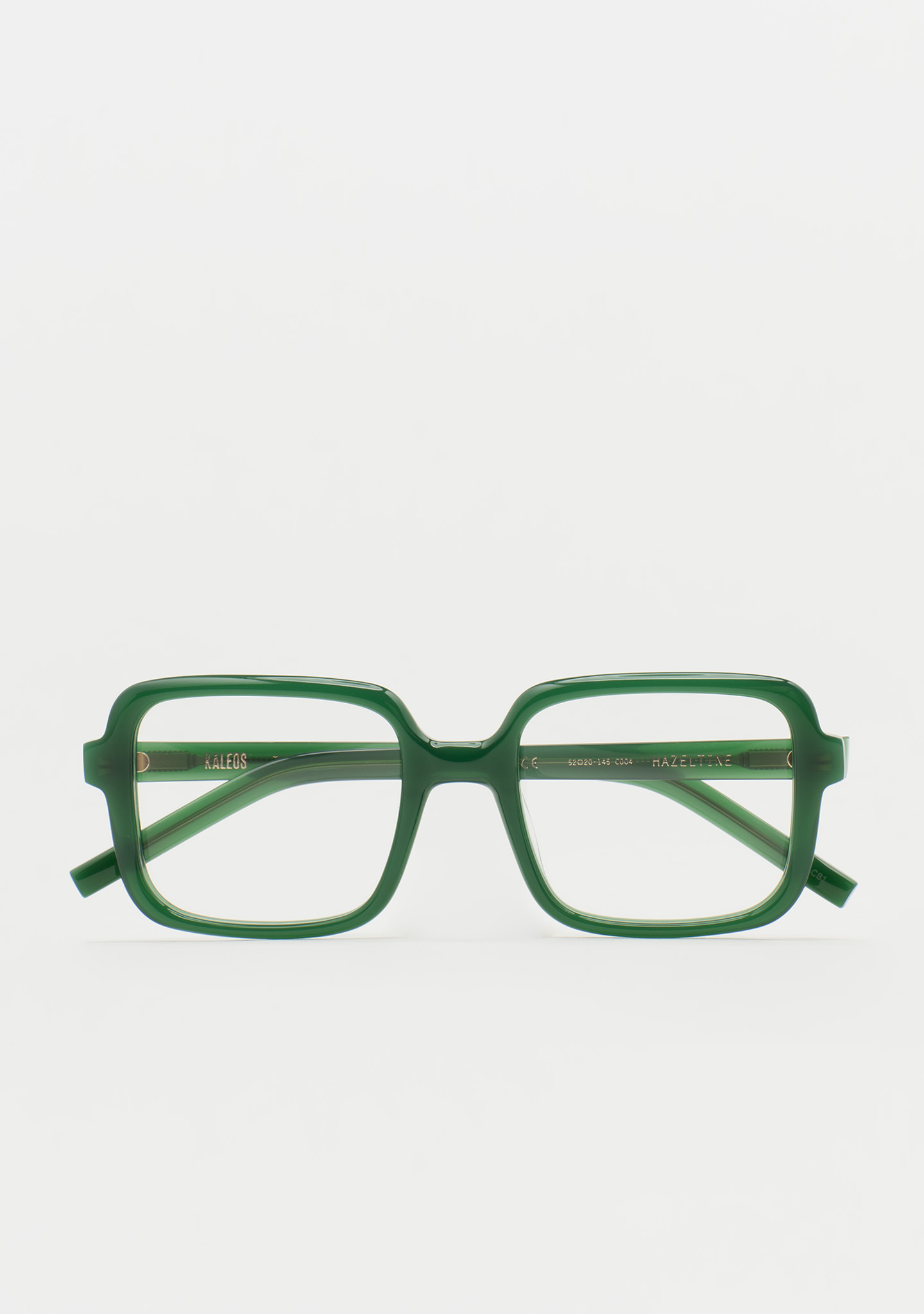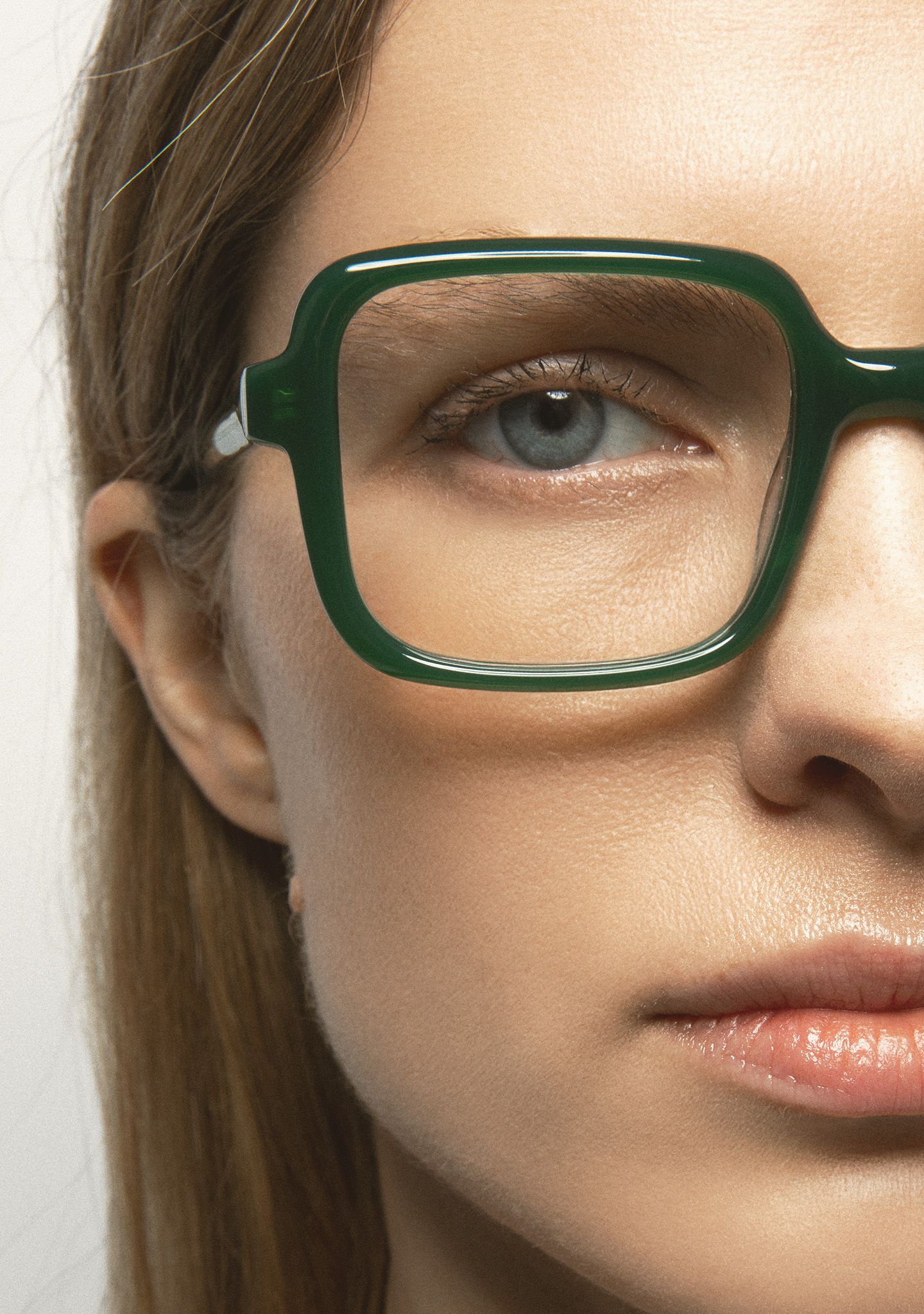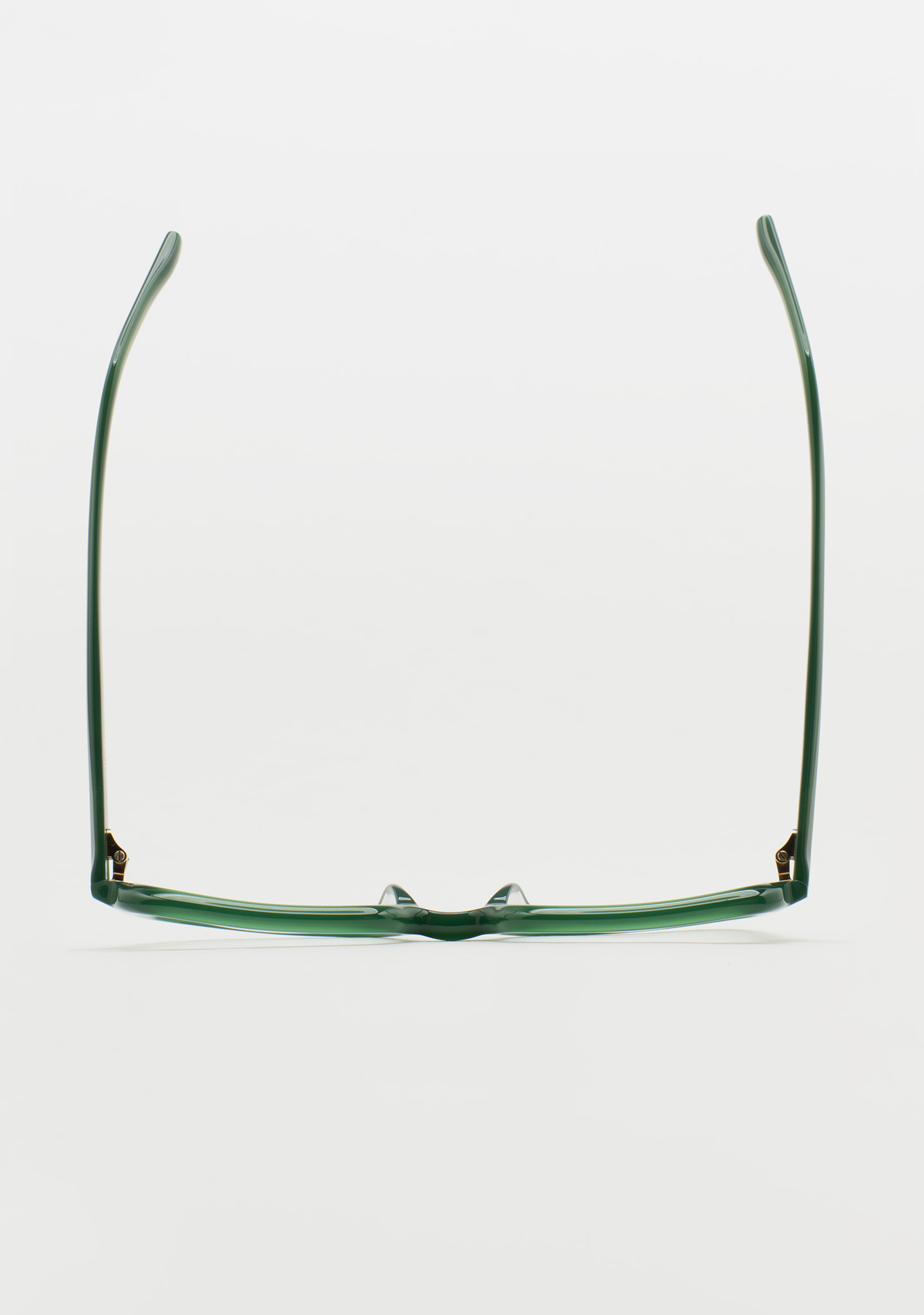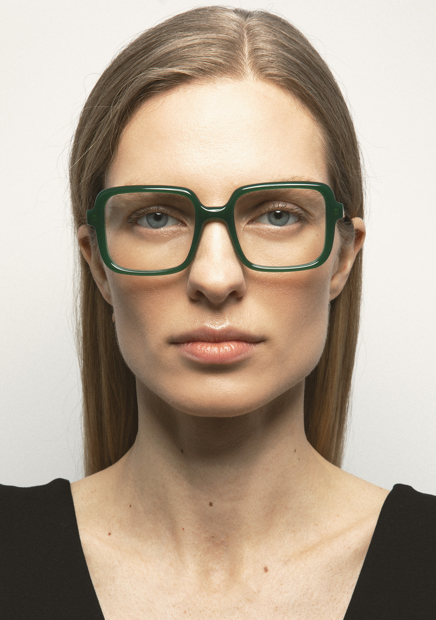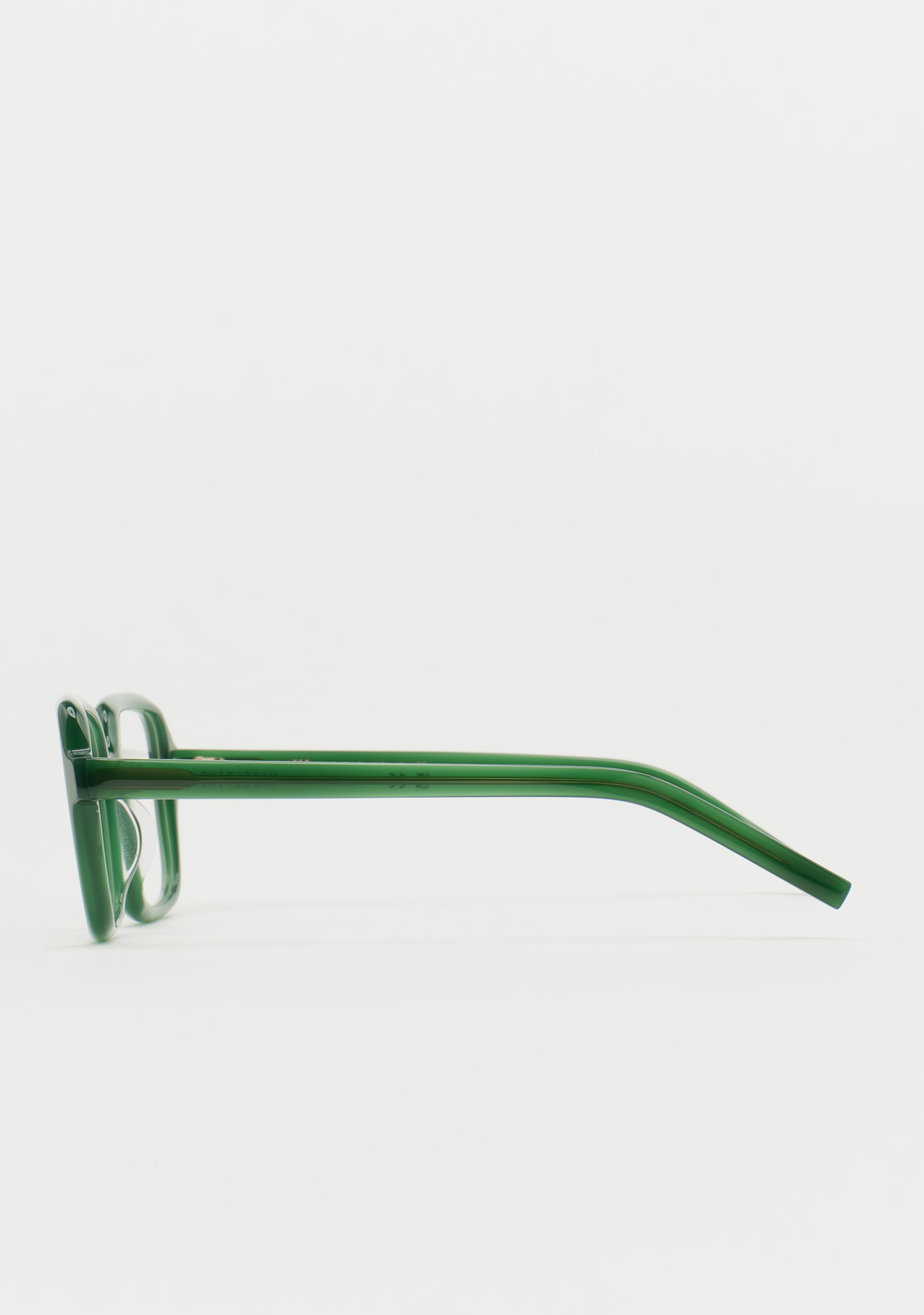 Lunettes de vue carrées. Présence qui se fait remarquer. Face avant et branches en acétate vert translucide. Usinage autour de la lentille. Plaquettes de nez en acétate intégrées. Fabriquées à la main.