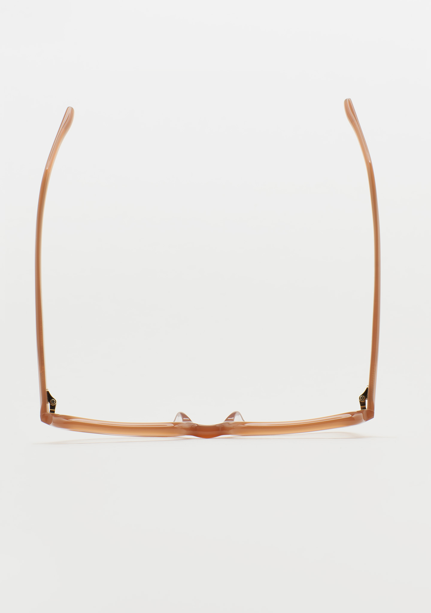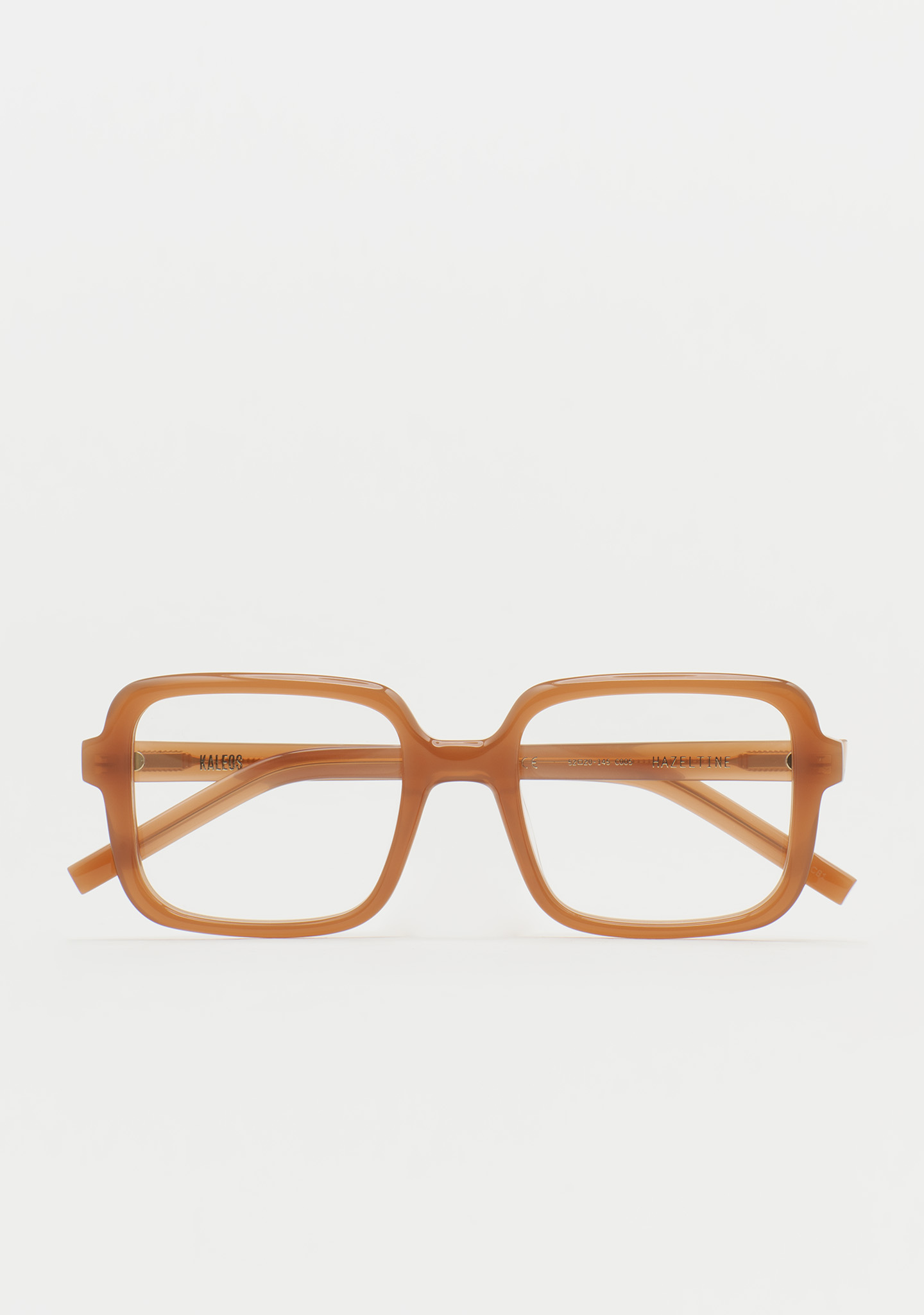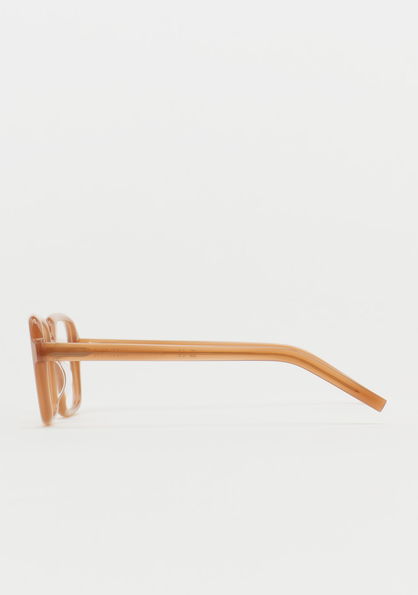 Lunettes de vue carrées. Présence qui se fait remarquer. Face avant et branches en acétate marron clair translucide. Usinage autour de la lentille. Plaquettes de nez en acétate intégrées. Fabriquées à la main.