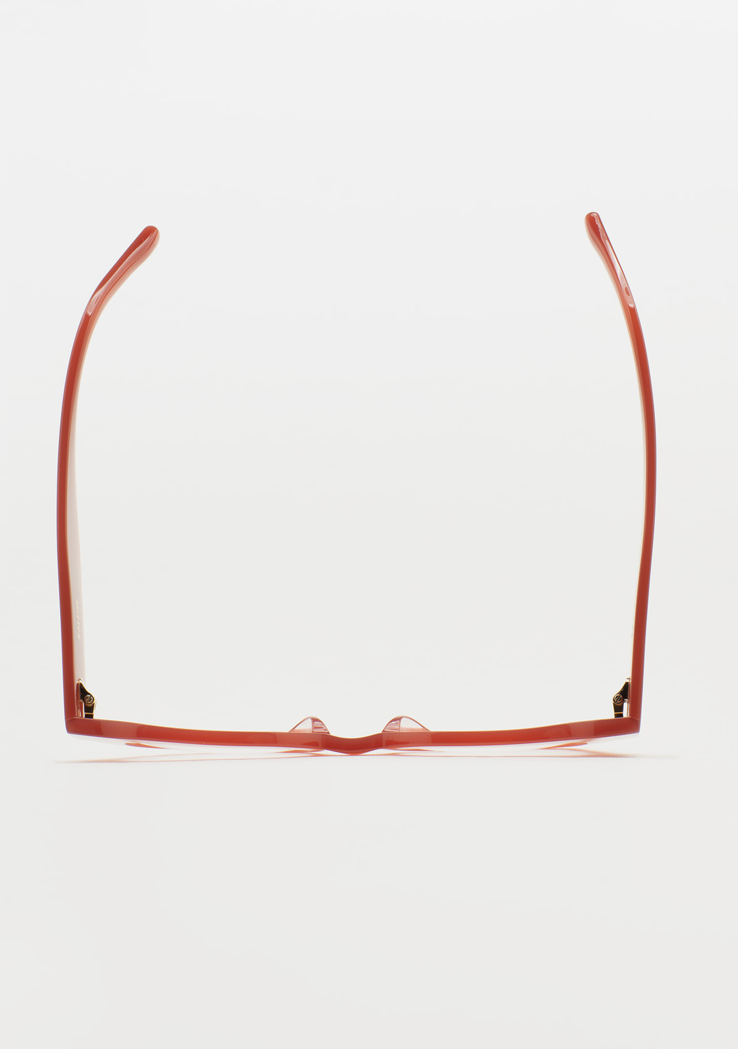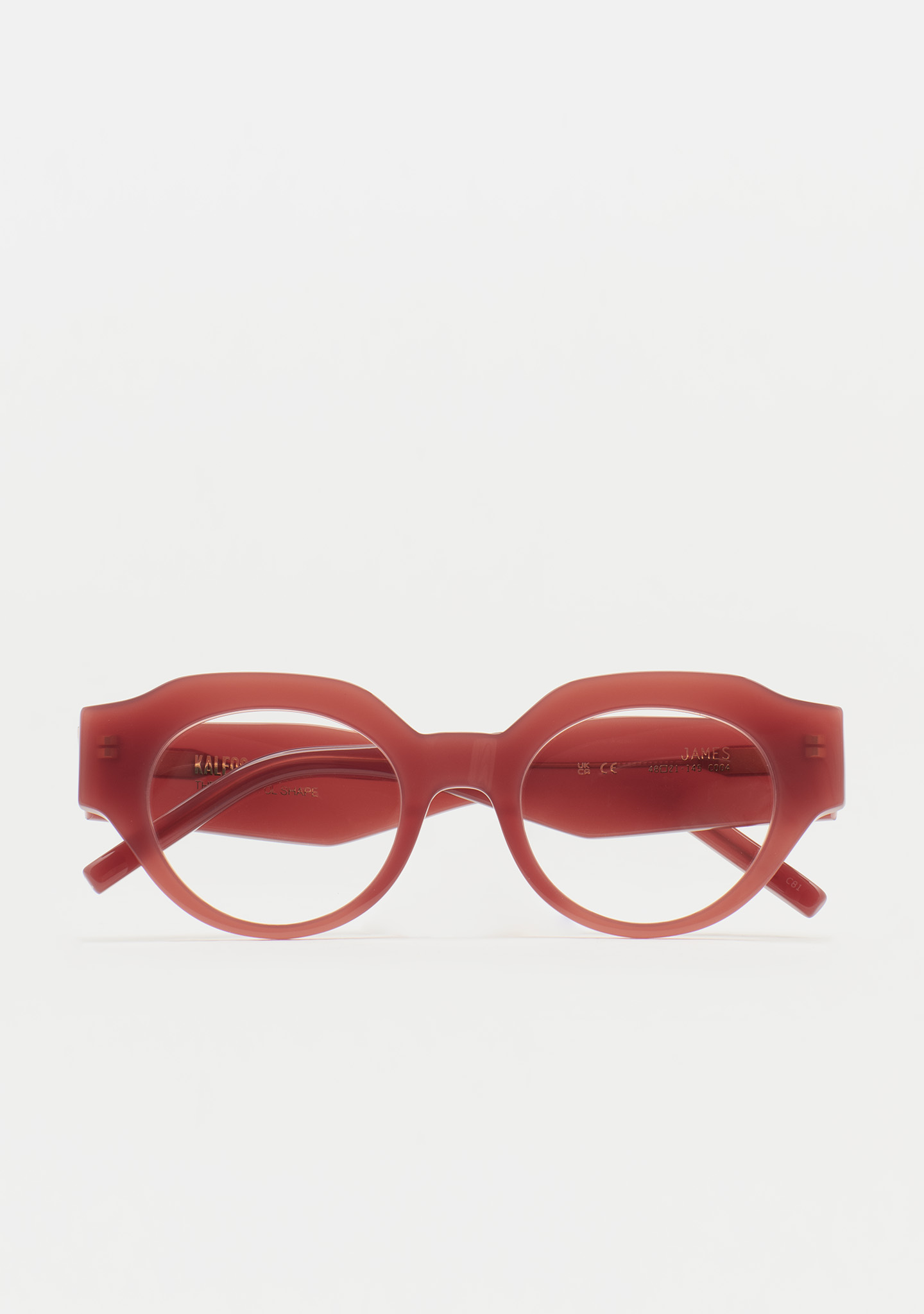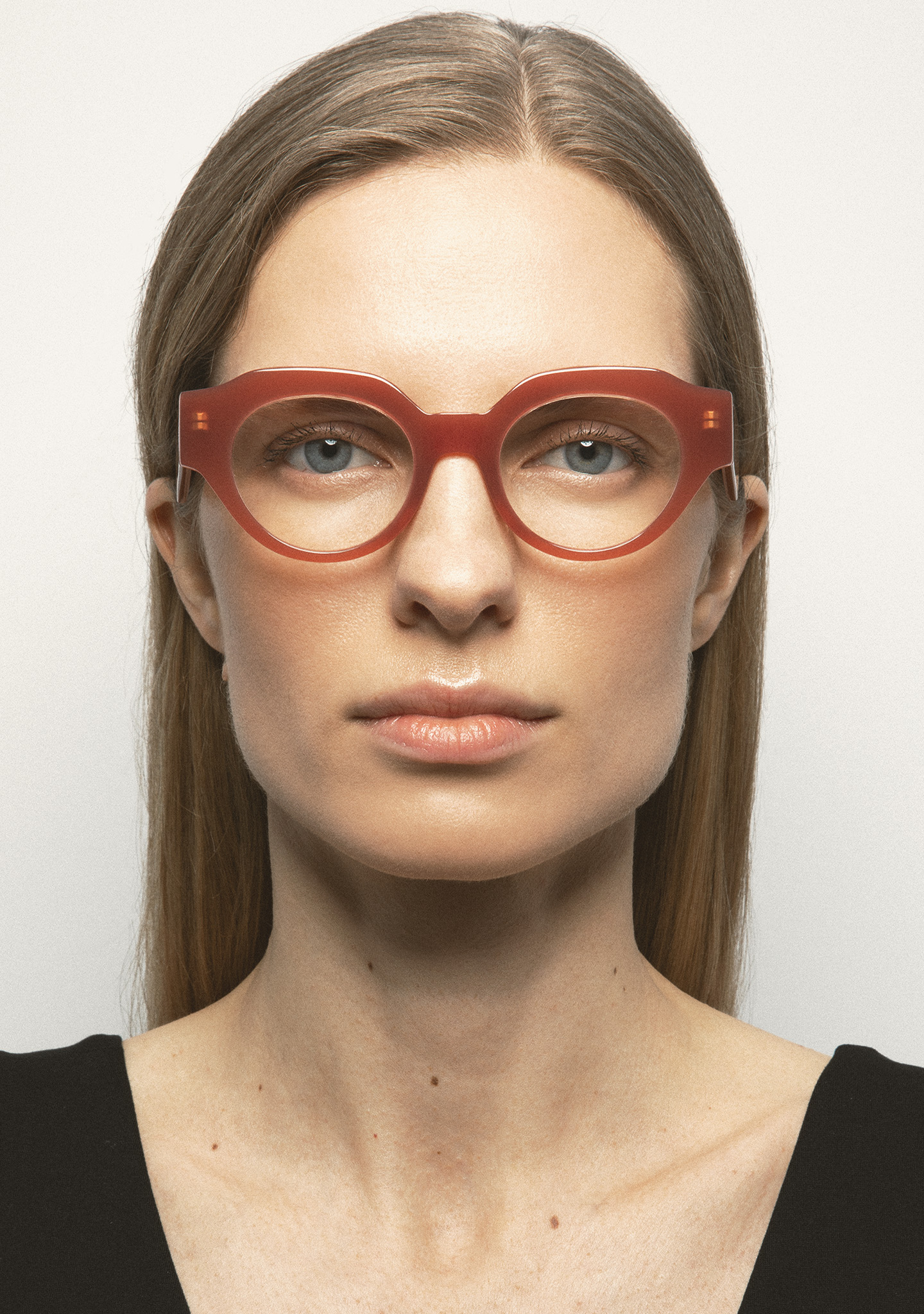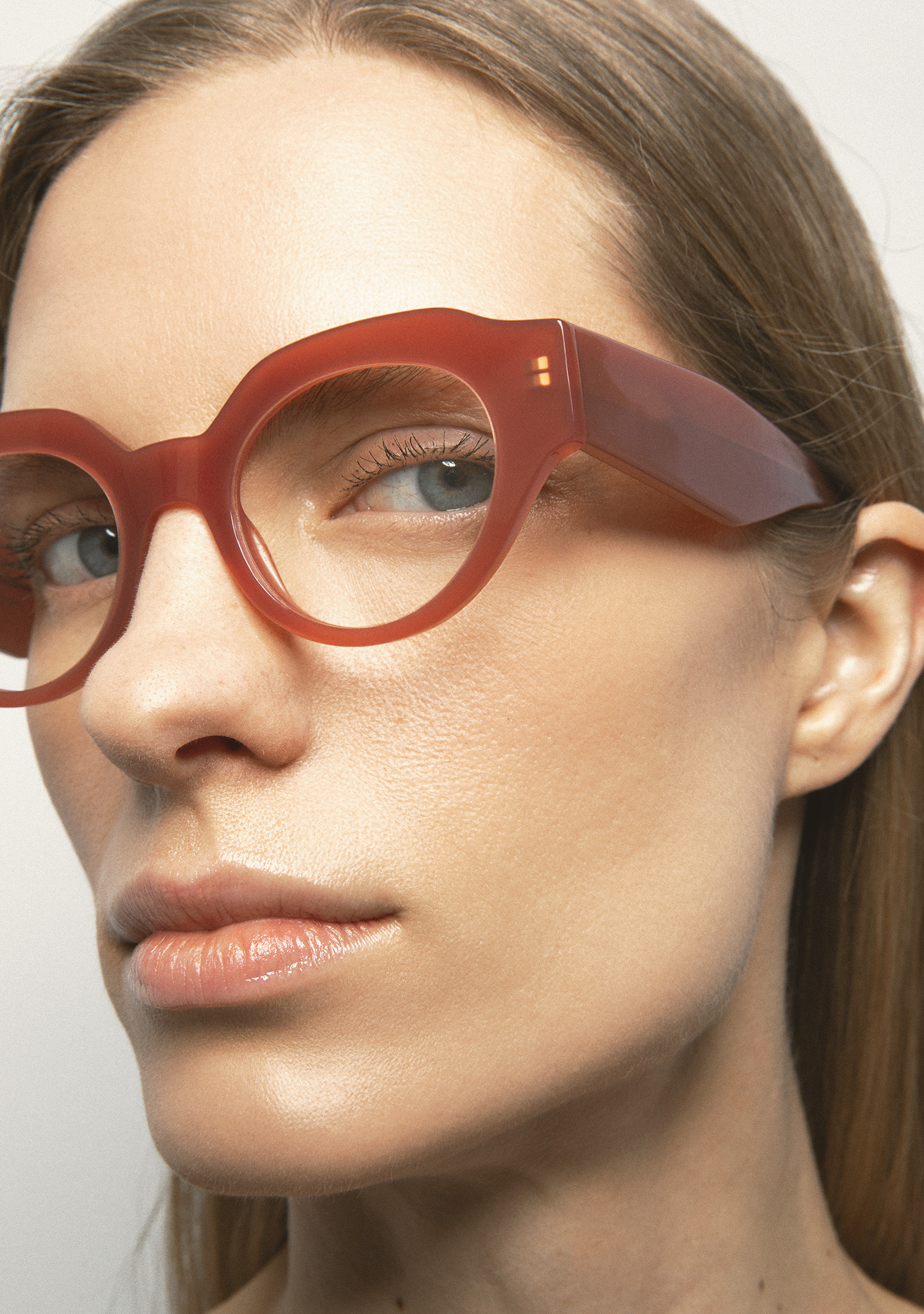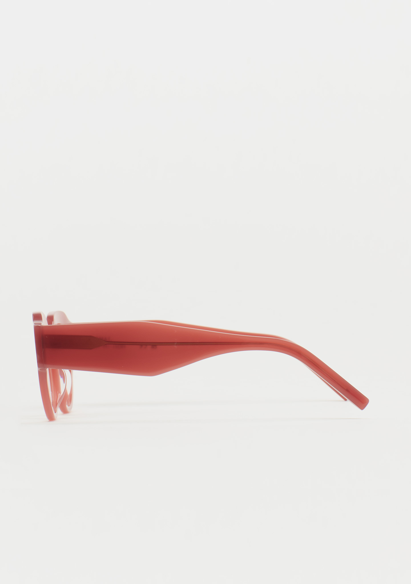 Lunettes ovales. Pleines de détails géométriques avec un fort impact visuel. Face avant et branches en acétate rose translucide. Plaquettes incorporées. Fait main.
