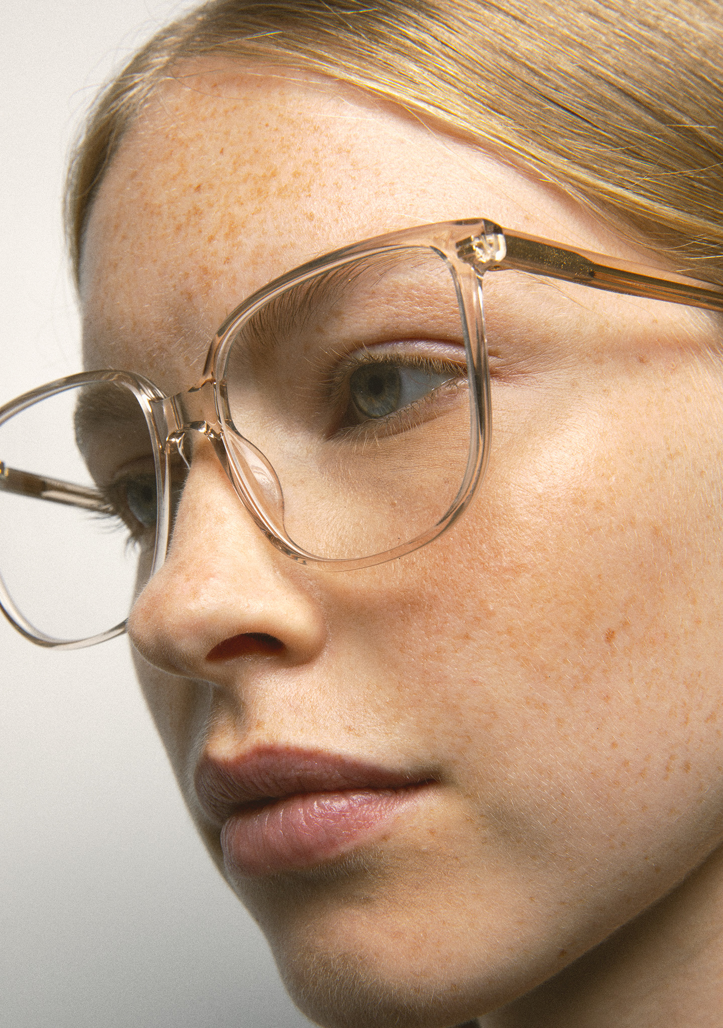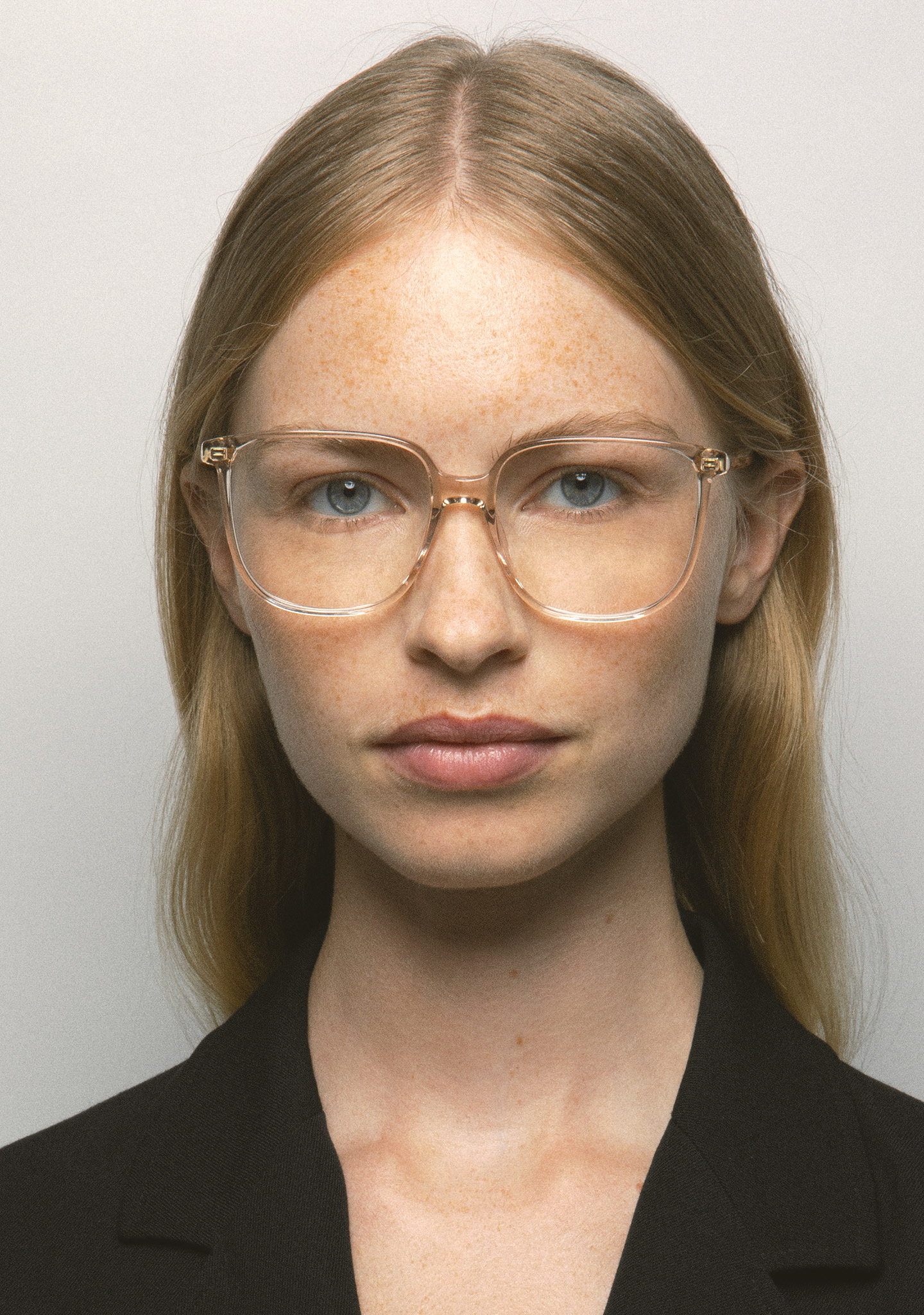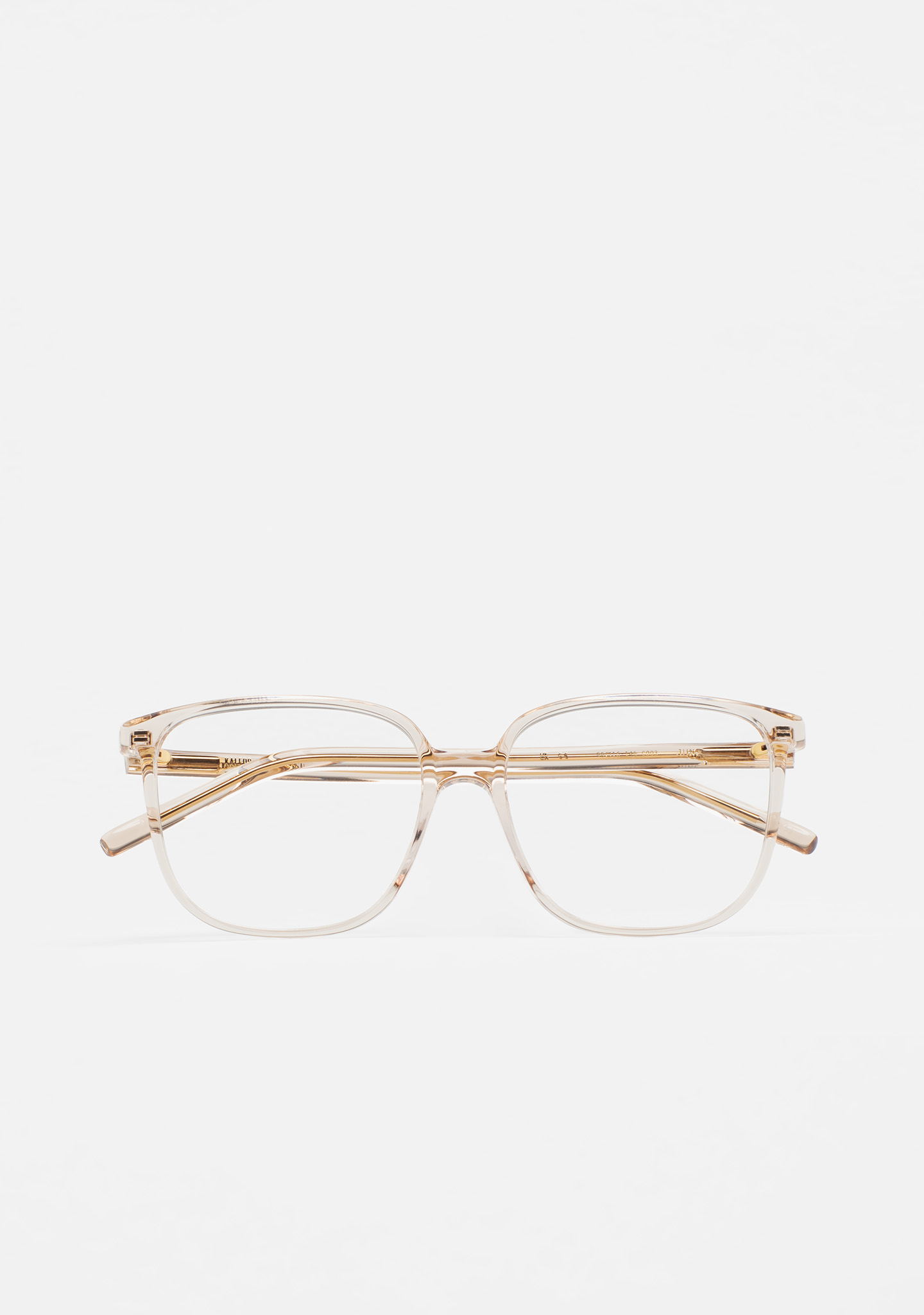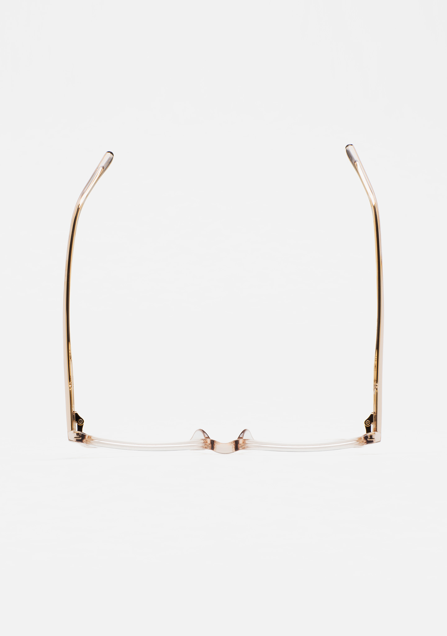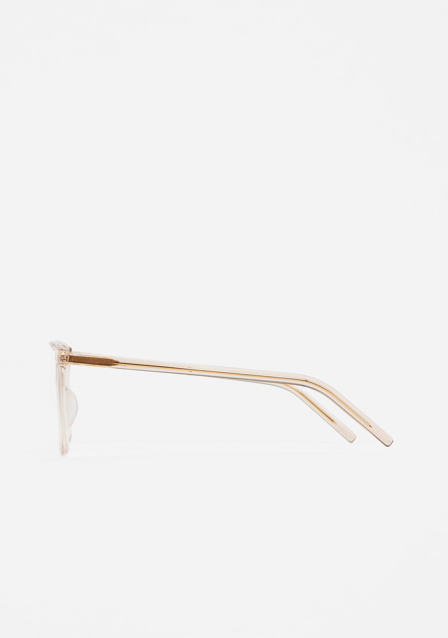 Lunettes de vue carrées. Frontal et branches en acétate haute densité beige cristal. Plaquettes en acétate fixes. Fait main.