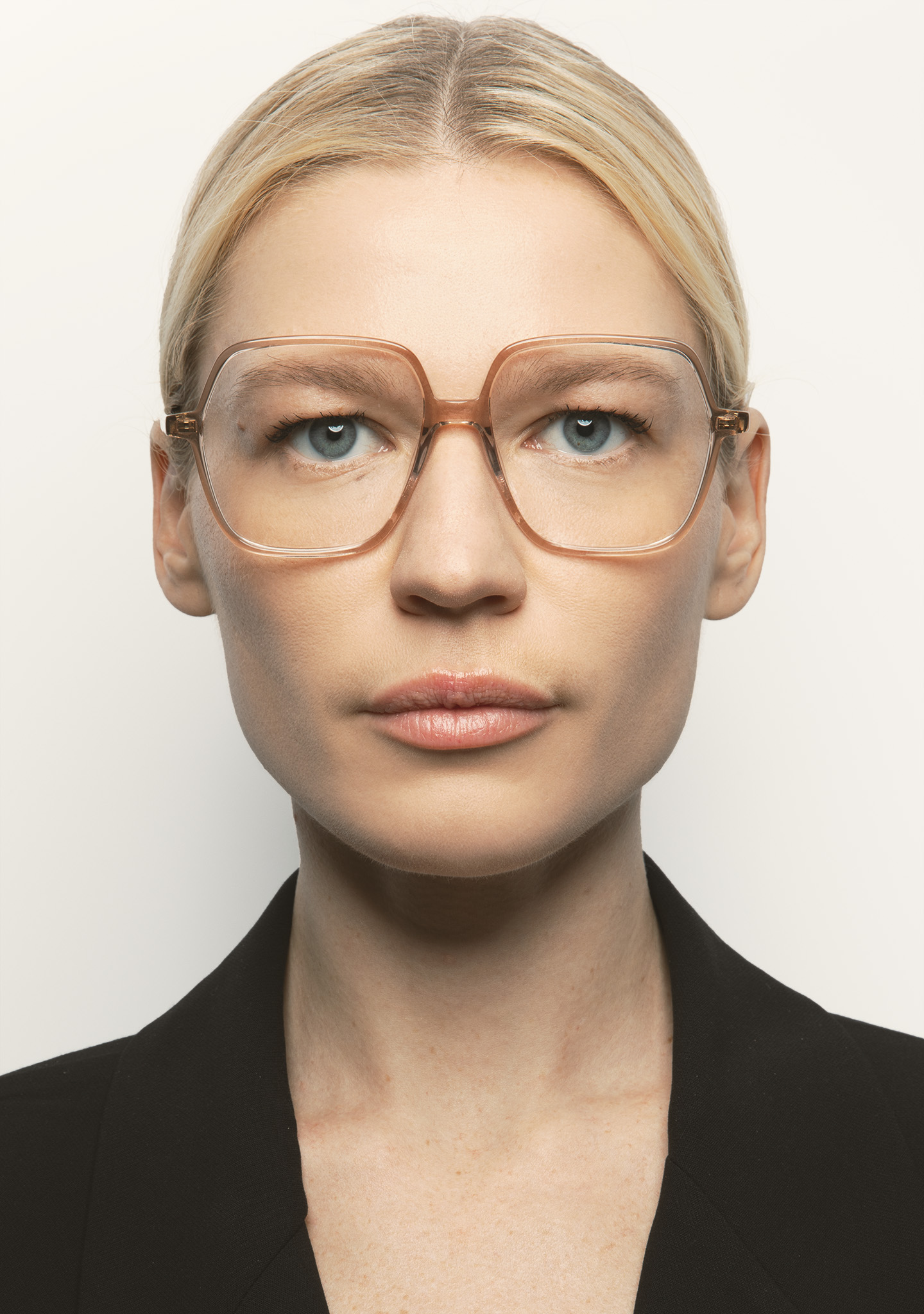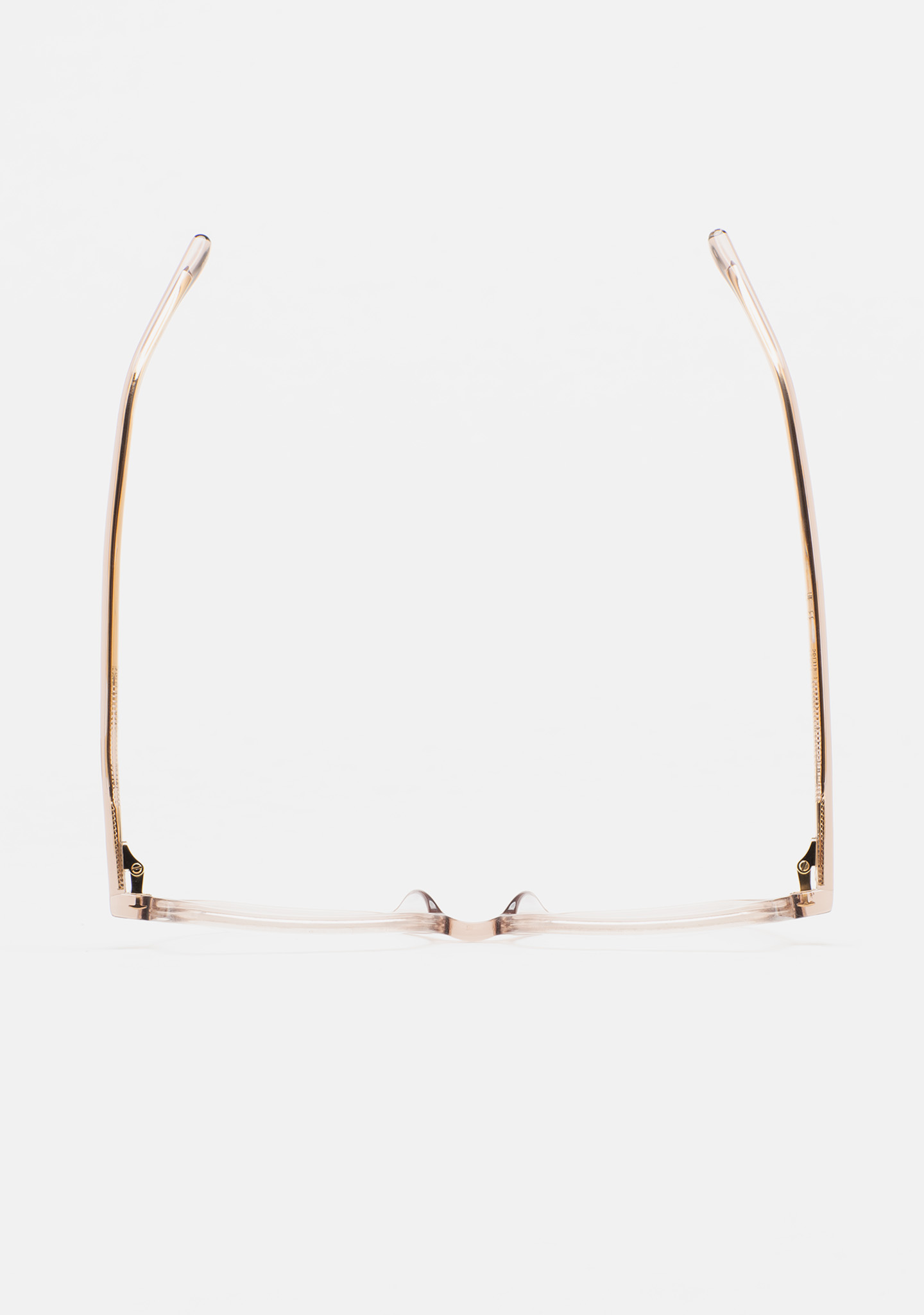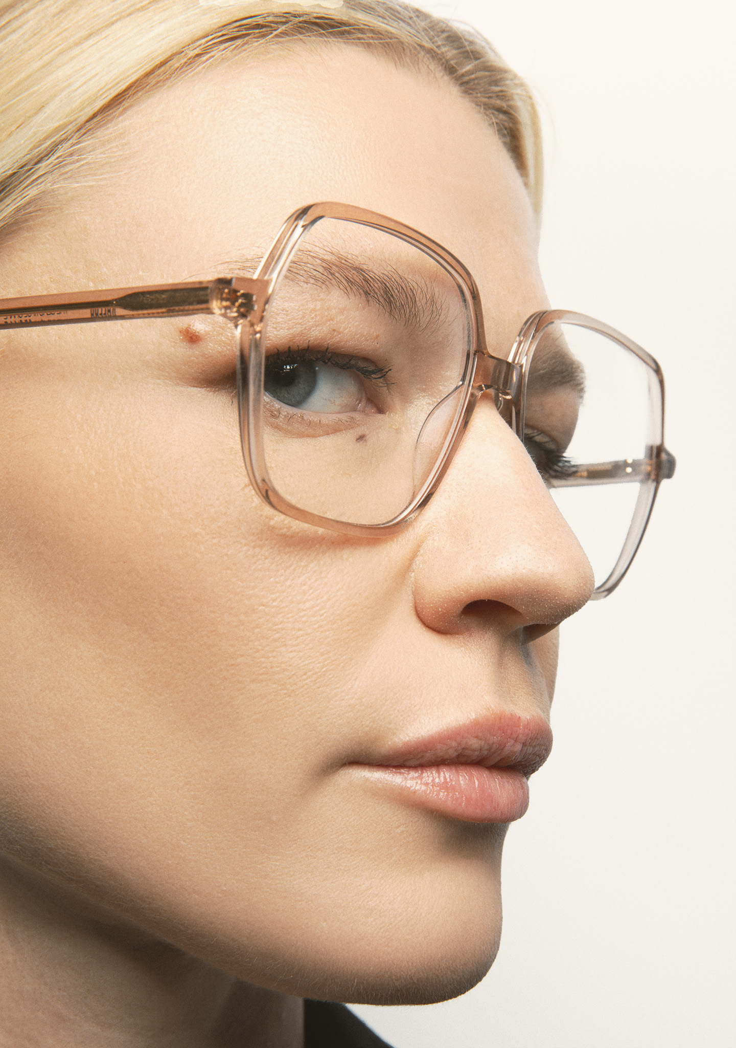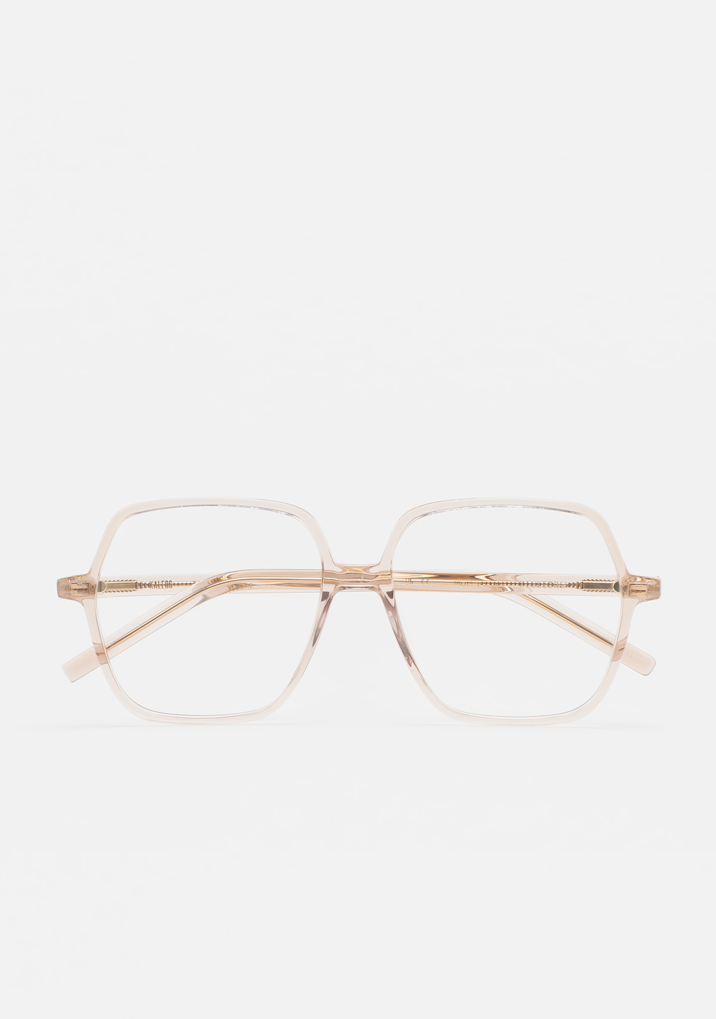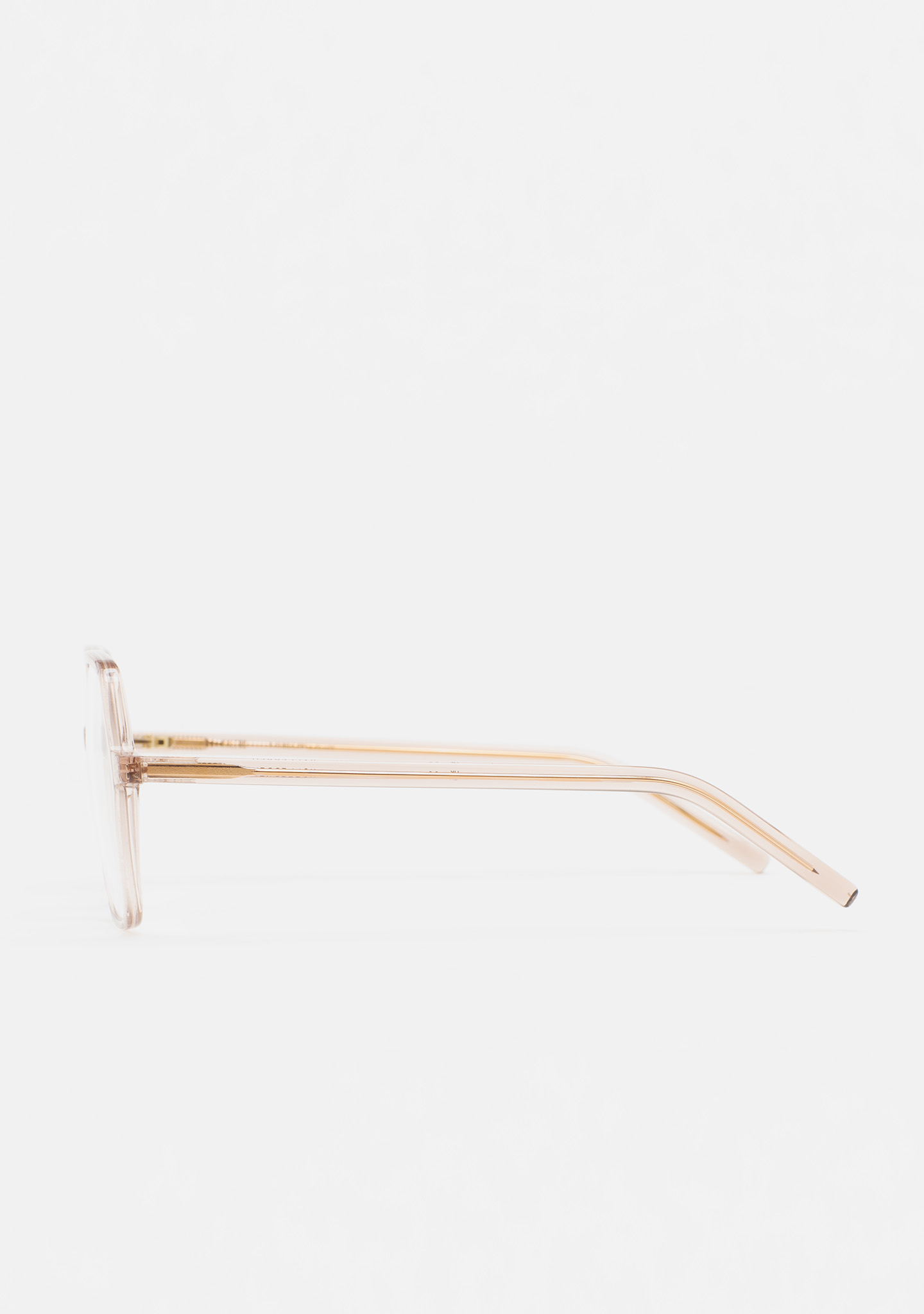 Lunettes de vue de forme carrée. Monture et branches en acétate haute densité rose clair transparent. Plaquettes en acétate intégrées. Fait main.