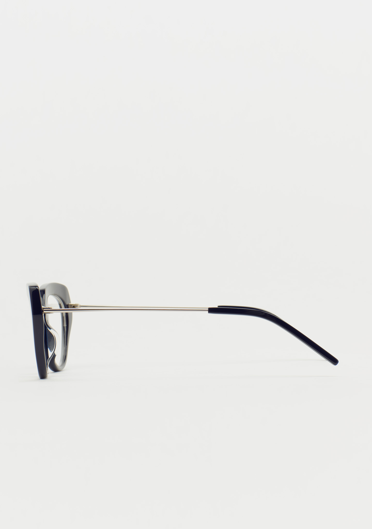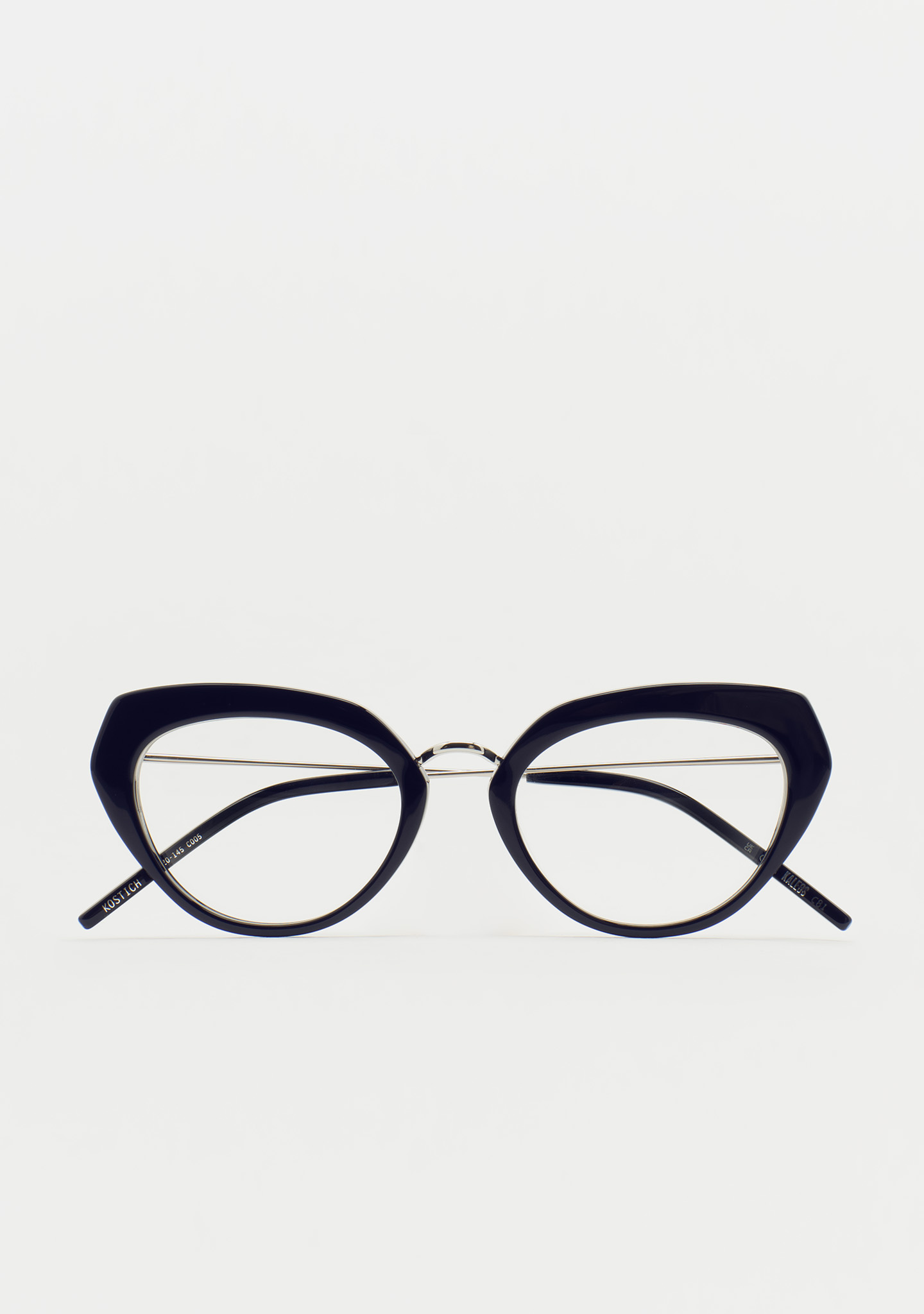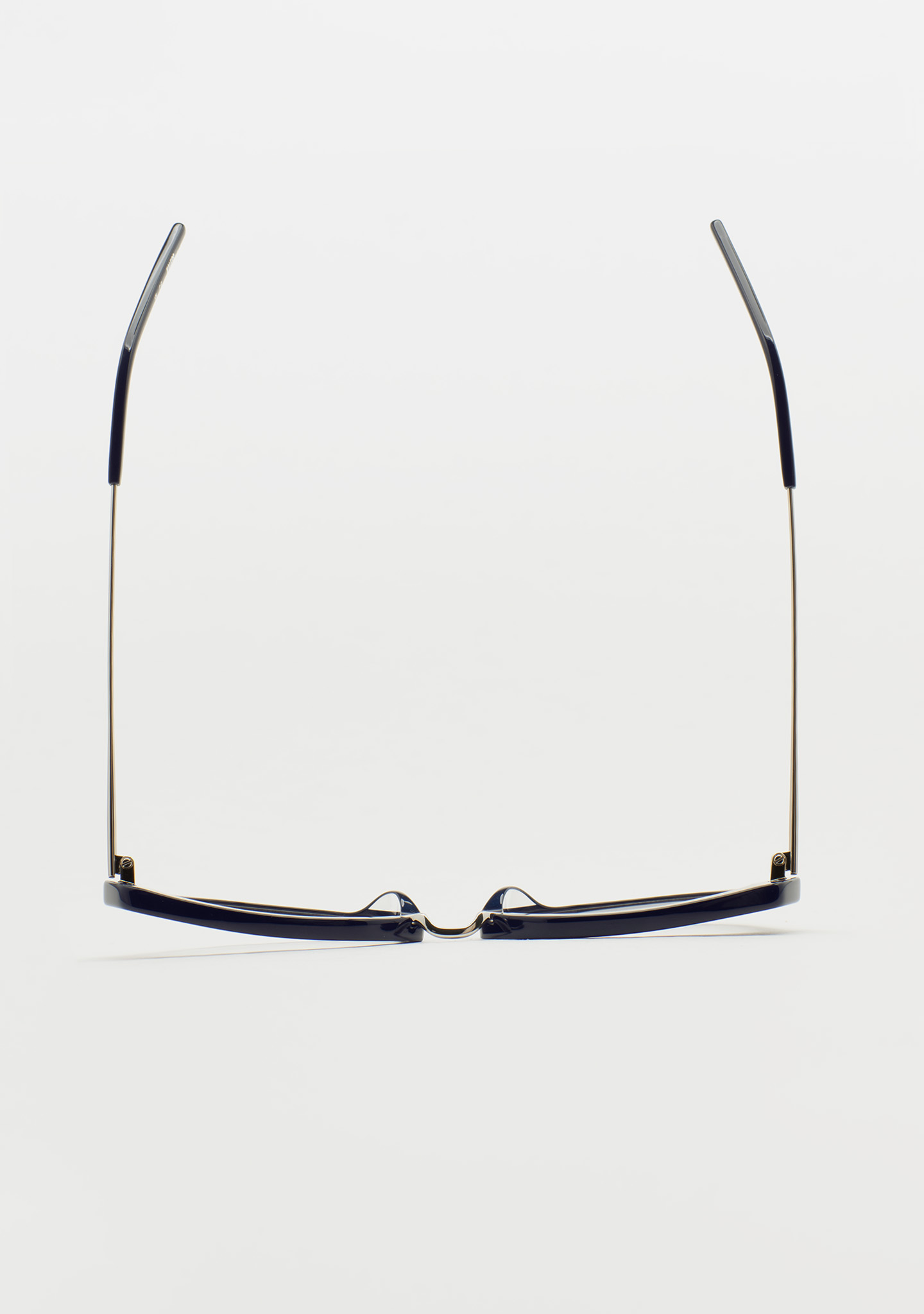 Lunettes de vue de forme Sil-de-chat. Une forme audacieuse qui fait la différence. Face en acétate bleu foncé. Structure et pont en acier inoxydable doré. Branches en acier inoxydable avec embouts en acétate bleu foncé. Plaquettes en acétate intégrées. Fabriquées à la main.